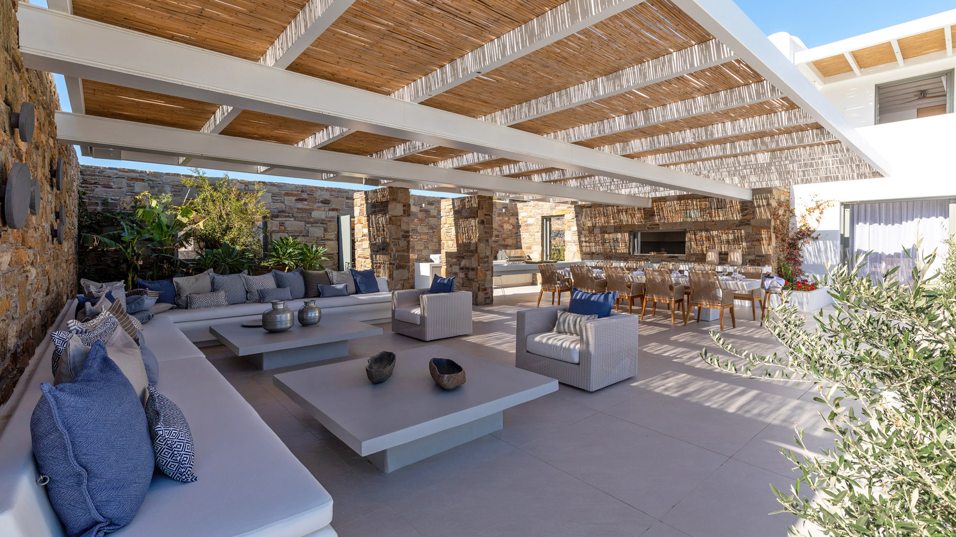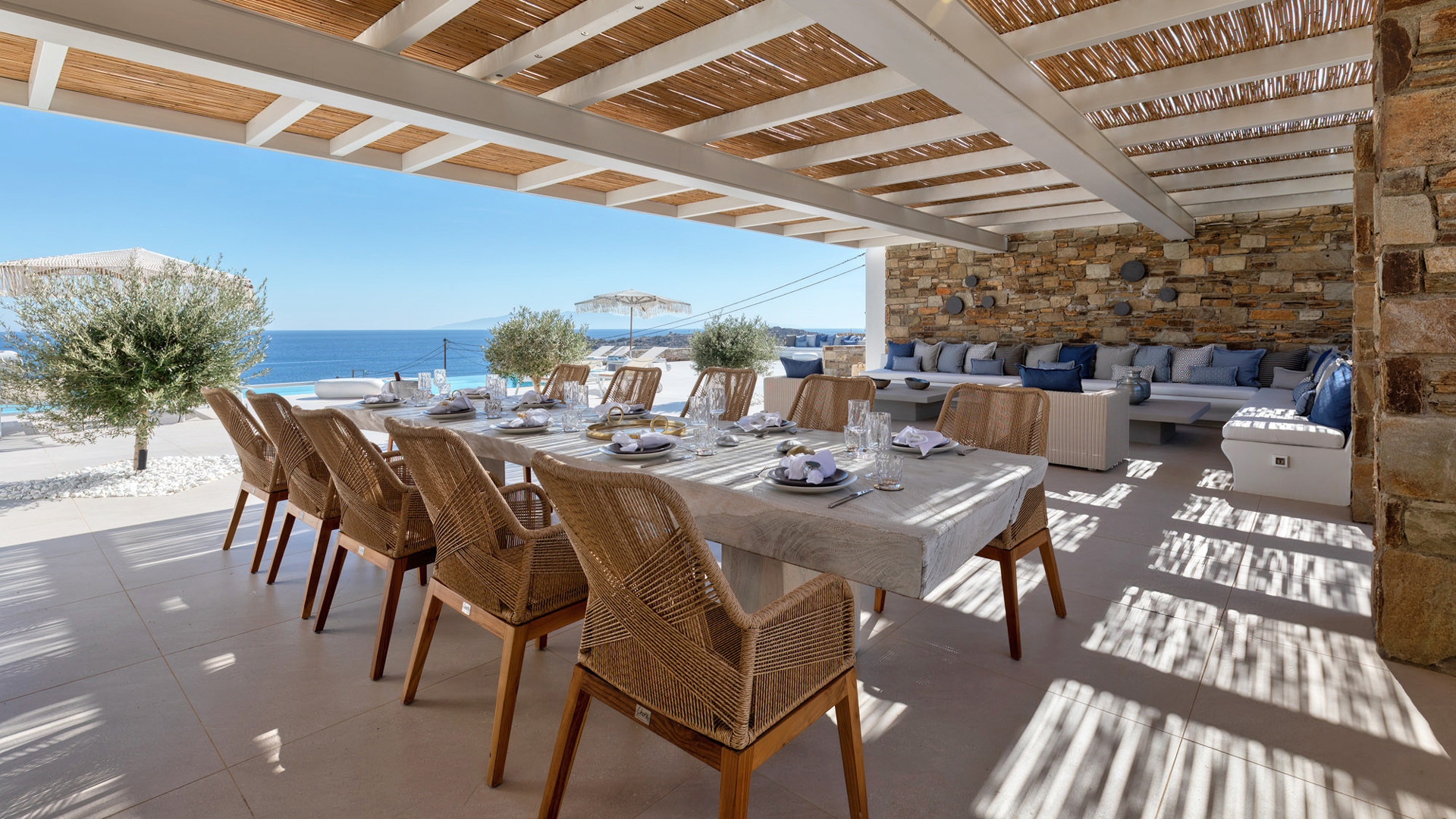 A quick look at the outdoor area immediately conveys the significance of the property, with the large infinity pool taking the spotlight and a multitude of perfectly crafted relaxation areas for the utmost comfort of guests. The dining area is very spacious and features a dedicated kitchen to optimize the work of the chefs.