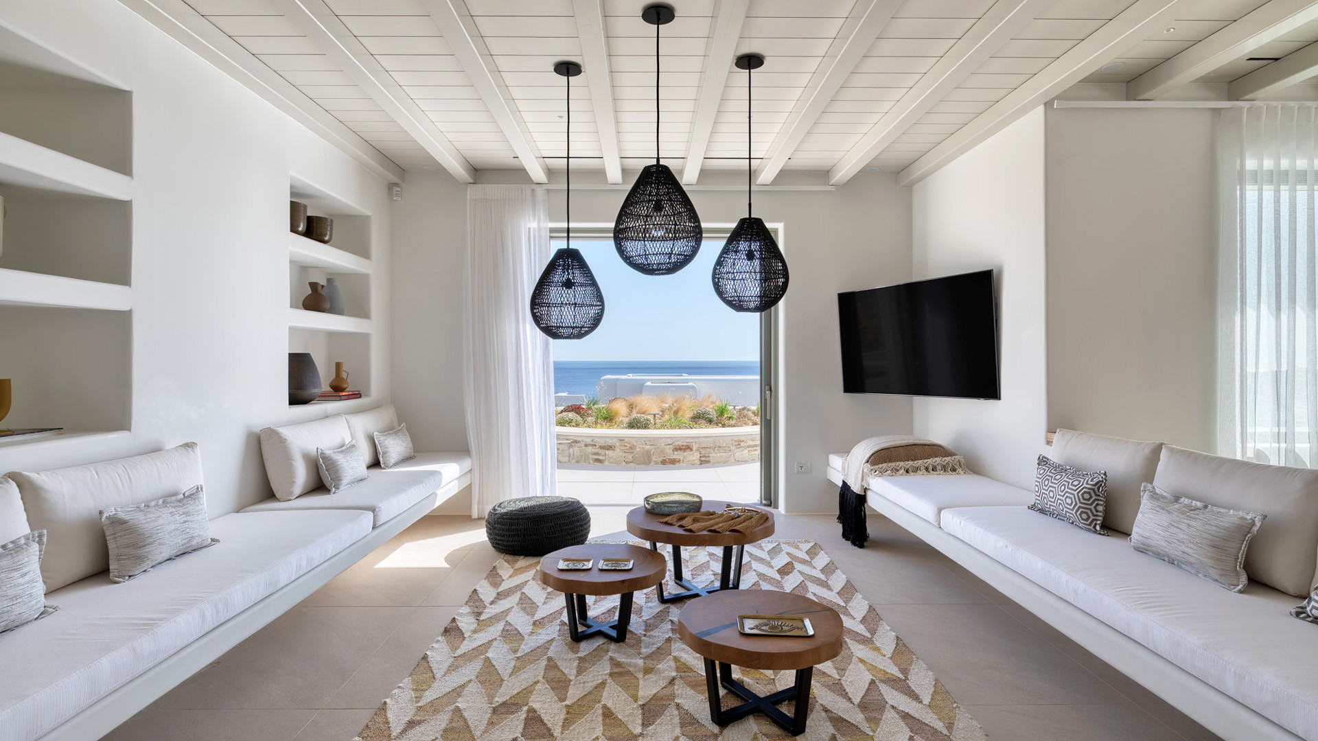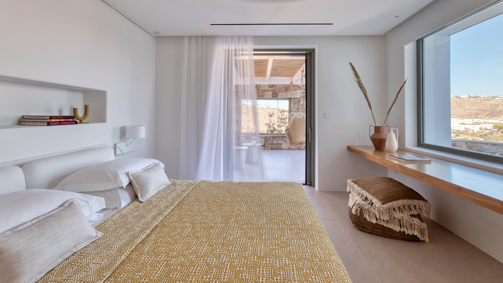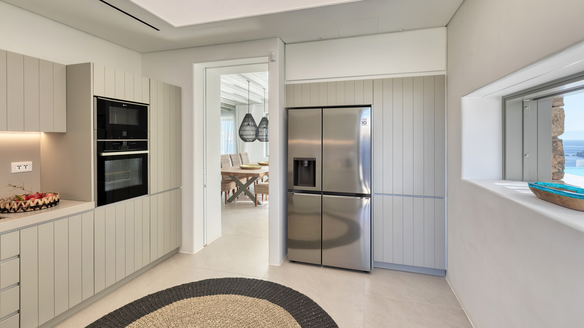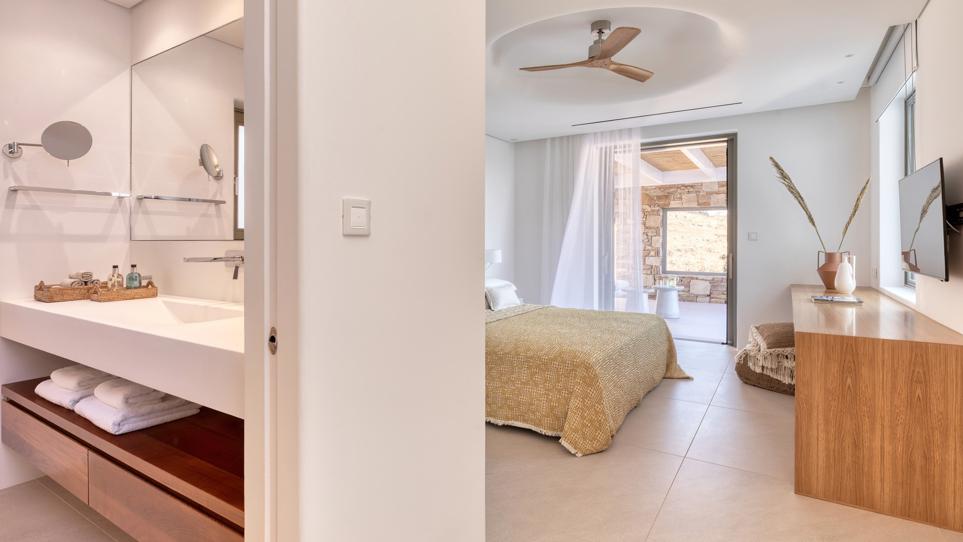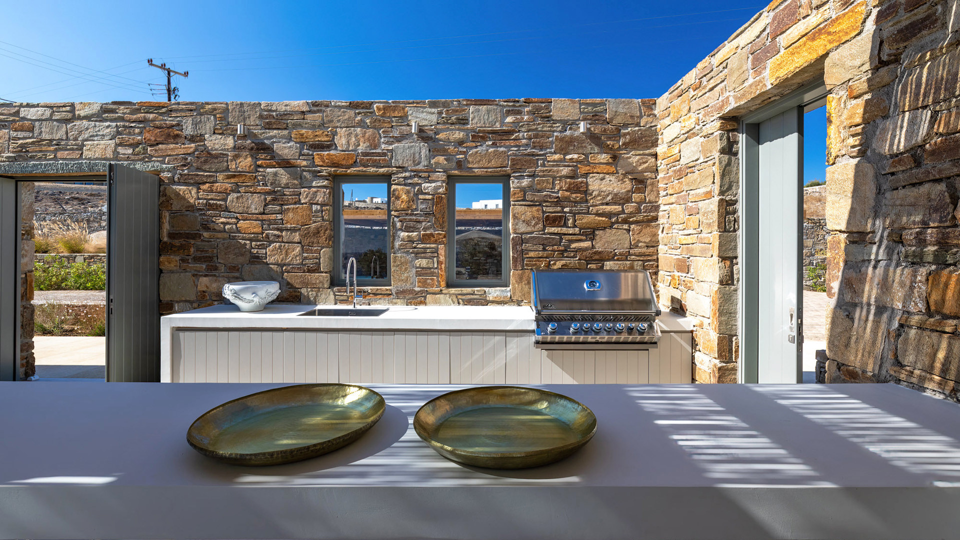 The Aleomandra area is one of the most sought-after on the island, conveniently located within easy reach of Mykonos Town. At the same time, some of the most popular beaches, such as Ornos and Agios Ioannis, are no more than a 5-minute drive away. In this context, we find the splendid Amaryllis, a villa of unquestionable quality designed for the most discerning travelers.