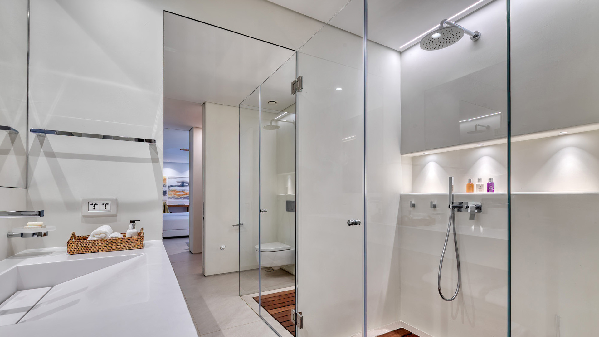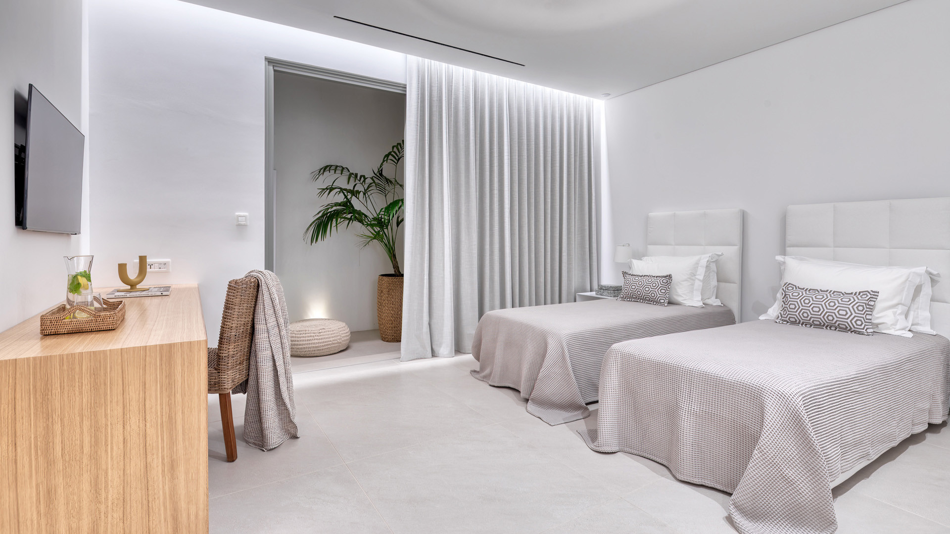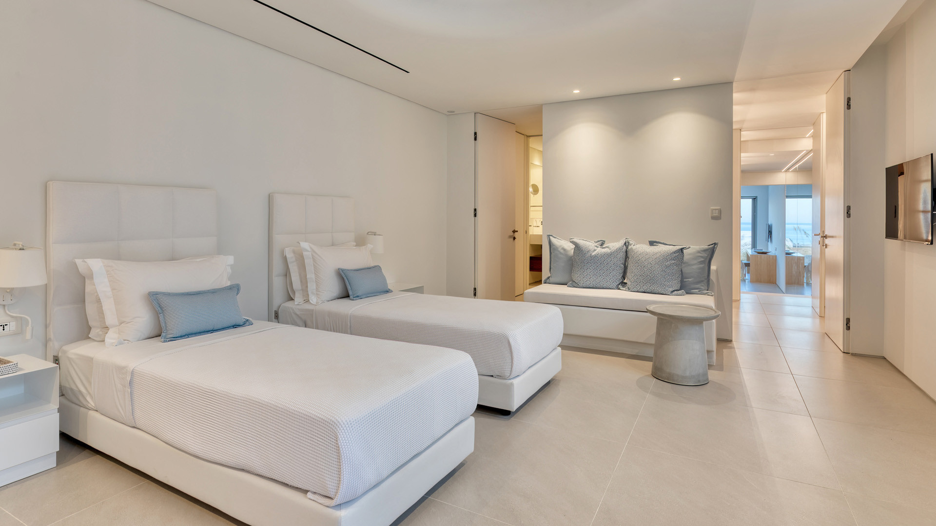2 Guest Bedrooms with twin beds, A/C, en-suite bathrooms with shower, each with independent access from outside, sea view