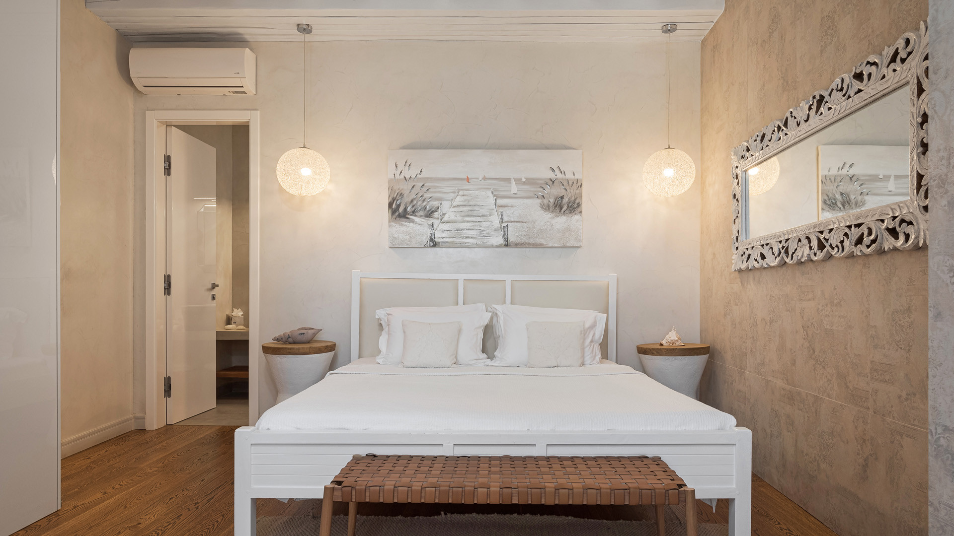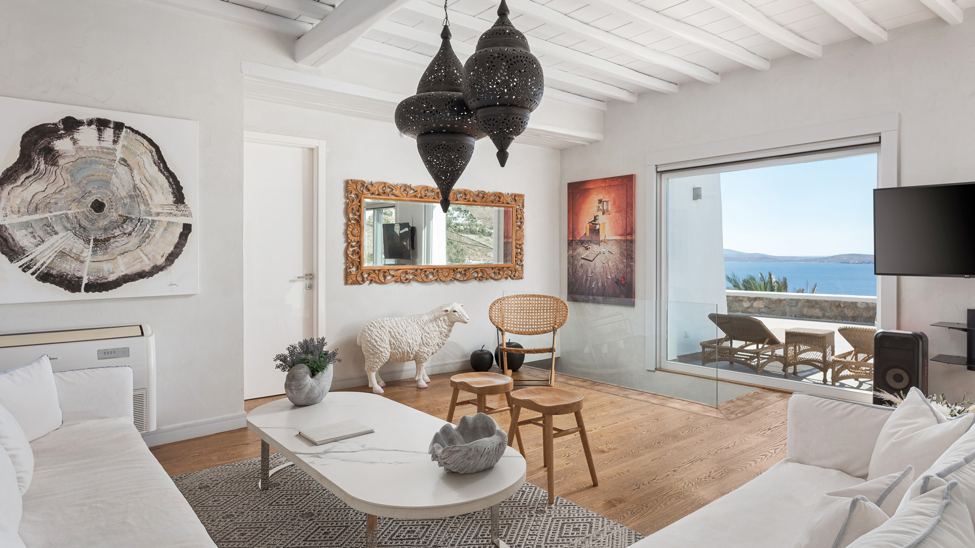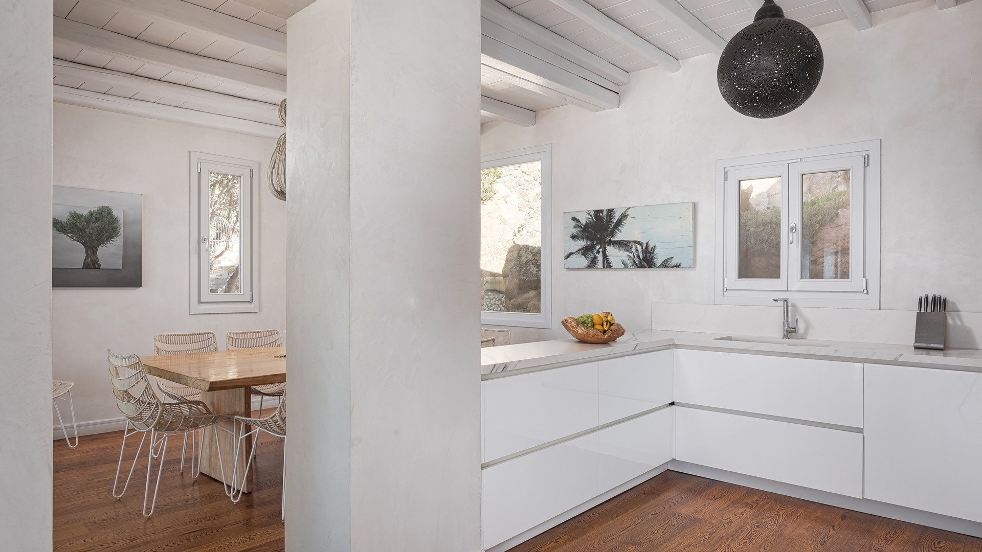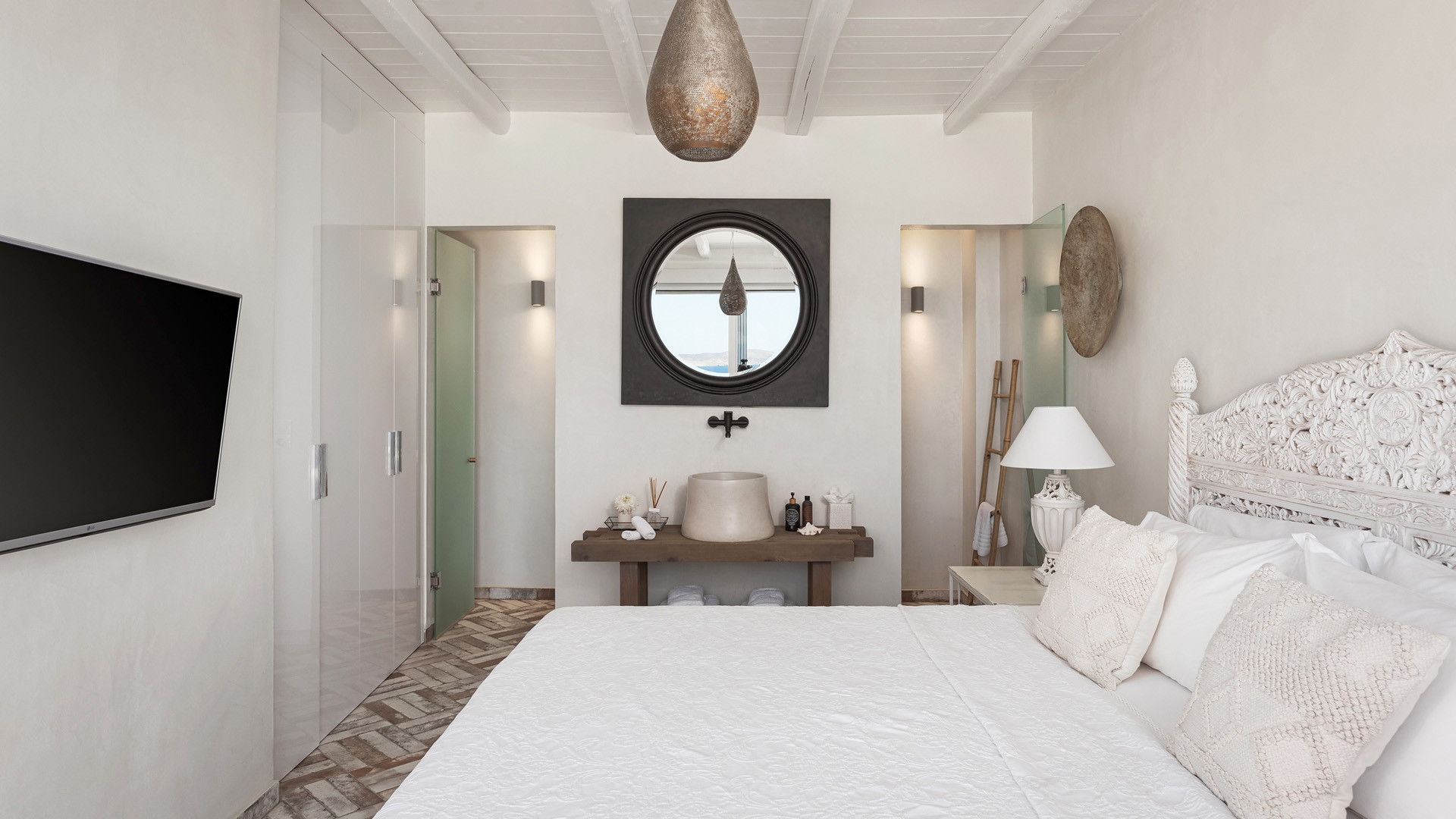 Just as witnessed outdoors, the interior spaces of Aura seemingly belong in interior design publications for their attention to detail and elegance. A unique style breaks away from the typical Cycladic fashion in an elegant manner be it the parquet floors, attractive artwork or the array of carefully chosen fittings and details.
