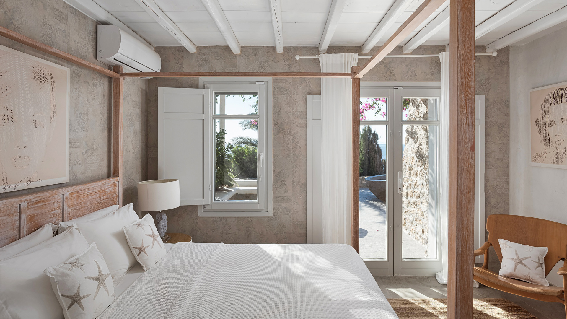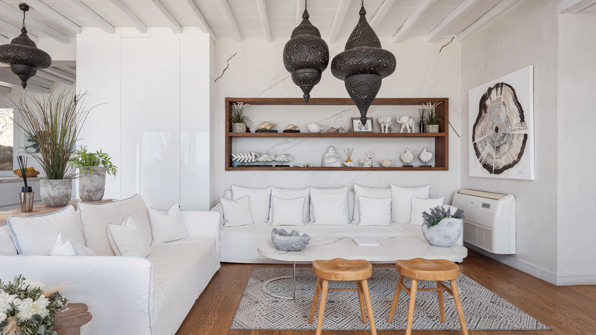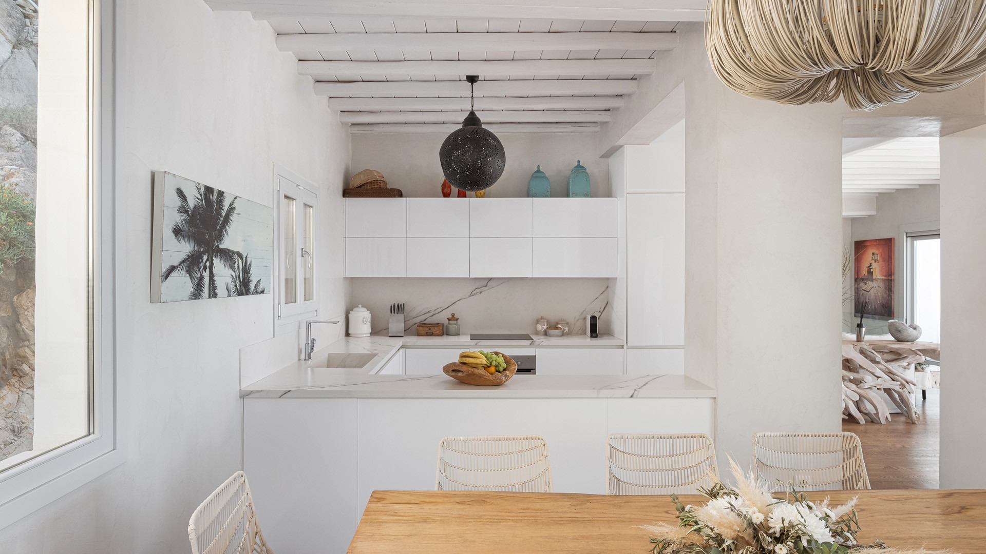 Just as witnessed outdoors, the interior spaces of Aura seemingly belong in interior design publications for their attention to detail and elegance. A unique style breaks away from the typical Cycladic fashion in an elegant manner be it the parquet floors, attractive artwork or the array of carefully chosen fittings and details.