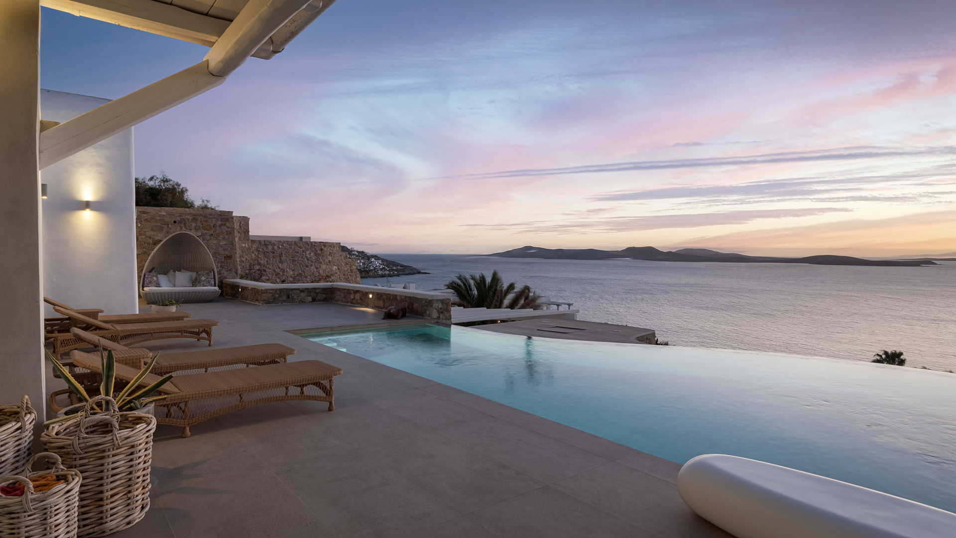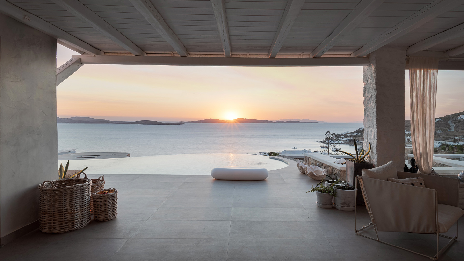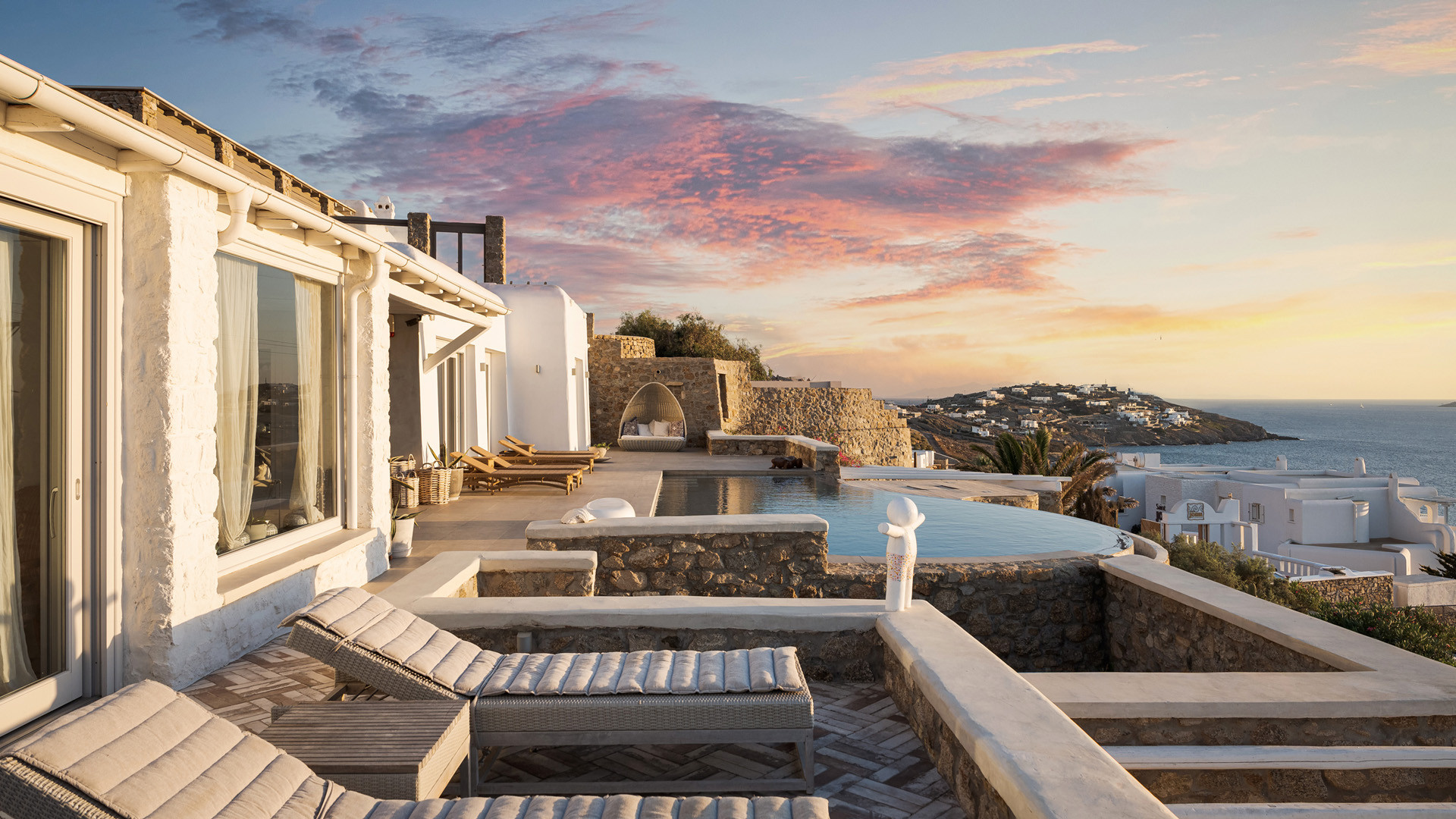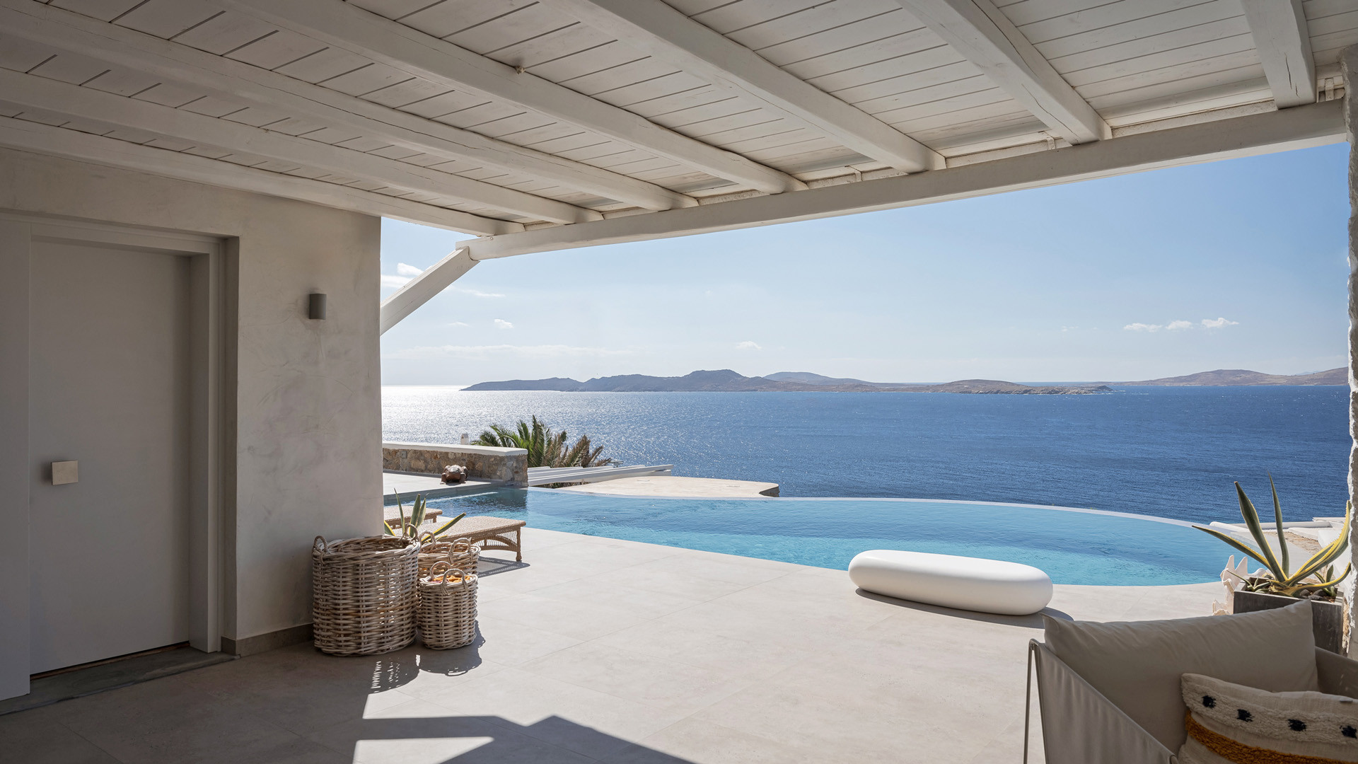 The sunset terrace is perfect for entertainment and relaxation all day around, even more so at sun-down with direct views of the picturesque Mykonos dusk. The main living areas revolve around the infinity pool with stylish poufs lined up pool side and a sheltered lounge area just a few steps back. Further lounge spots were designed on the private terraces of the some of the bedrooms as well.