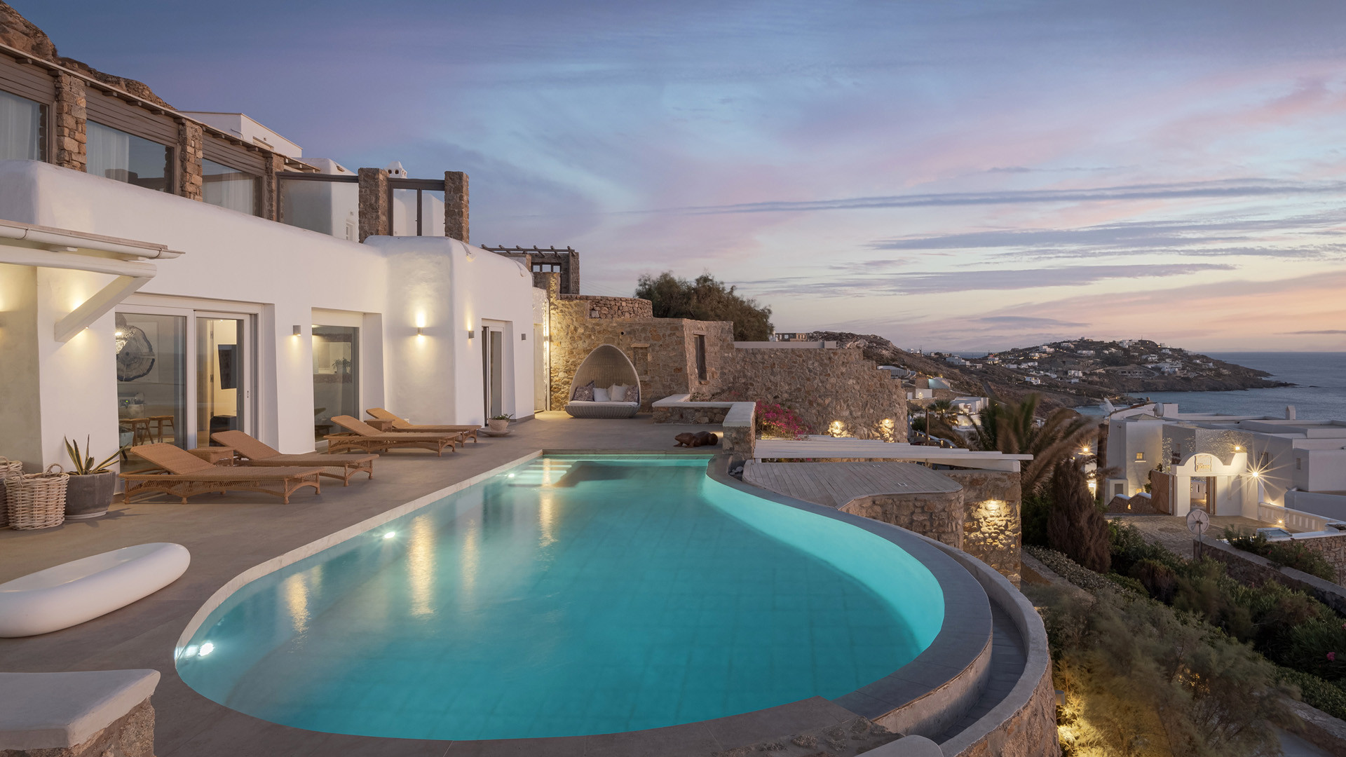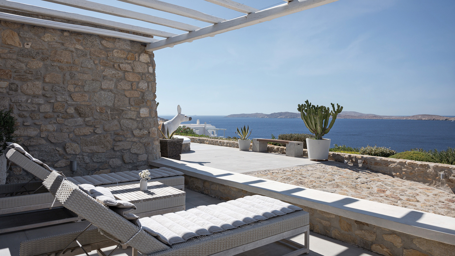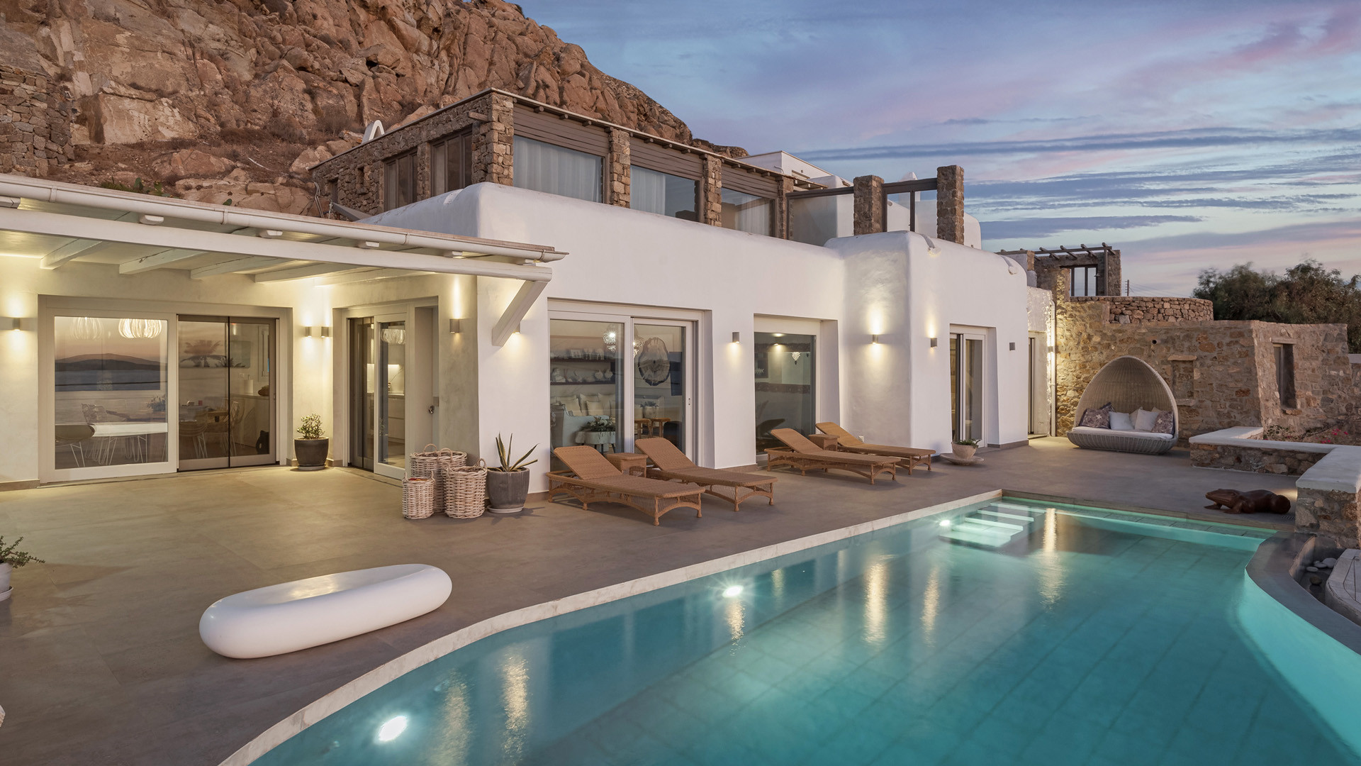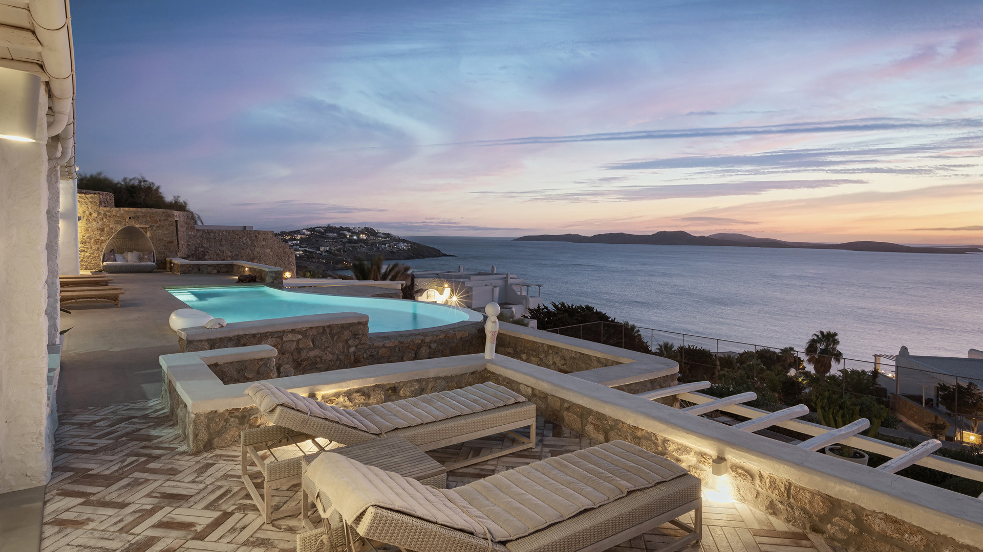 The sunset terrace is perfect for entertainment and relaxation all day around, even more so at sun-down with direct views of the picturesque Mykonos dusk. The main living areas revolve around the infinity pool with stylish poufs lined up pool side and a sheltered lounge area just a few steps back. Further lounge spots were designed on the private terraces of the some of the bedrooms as well.