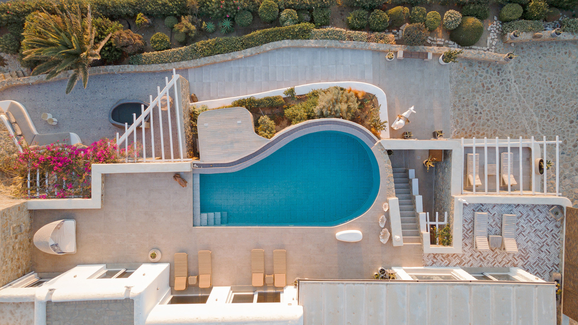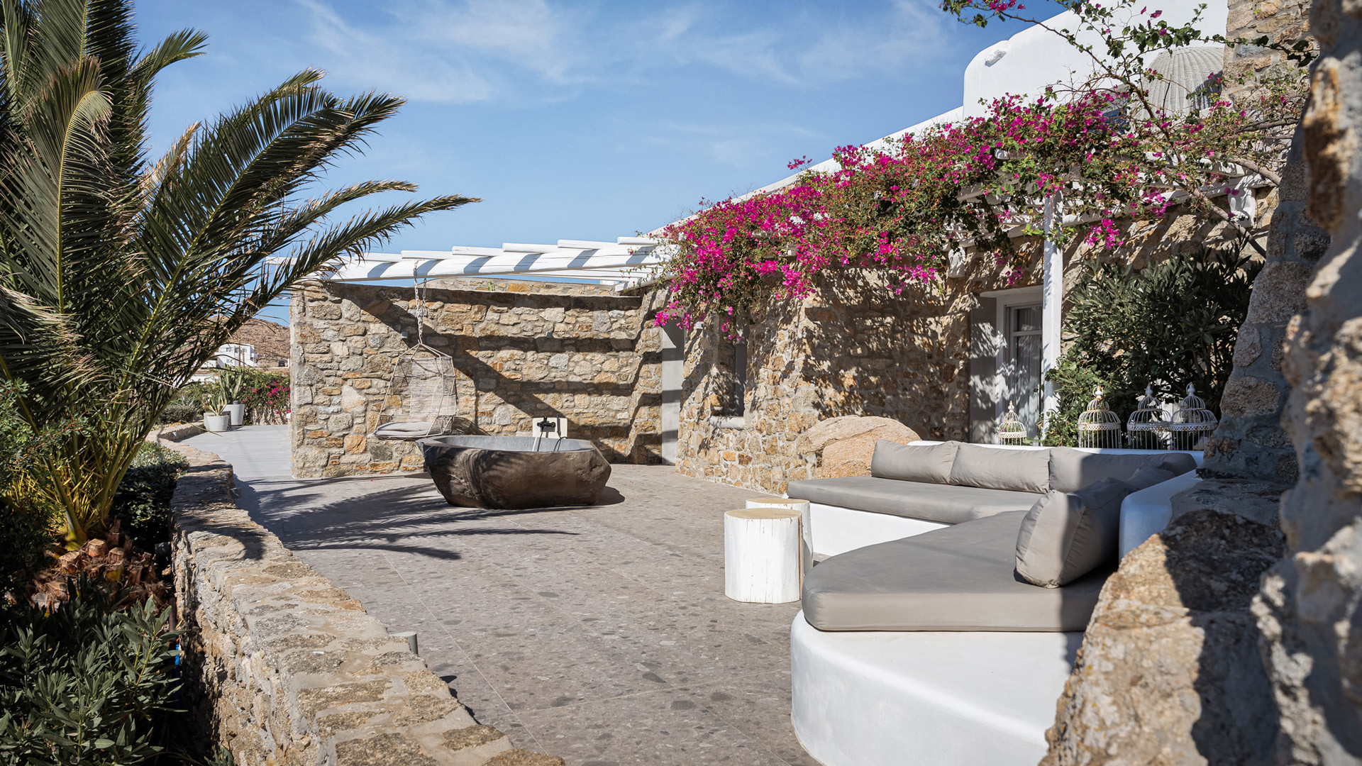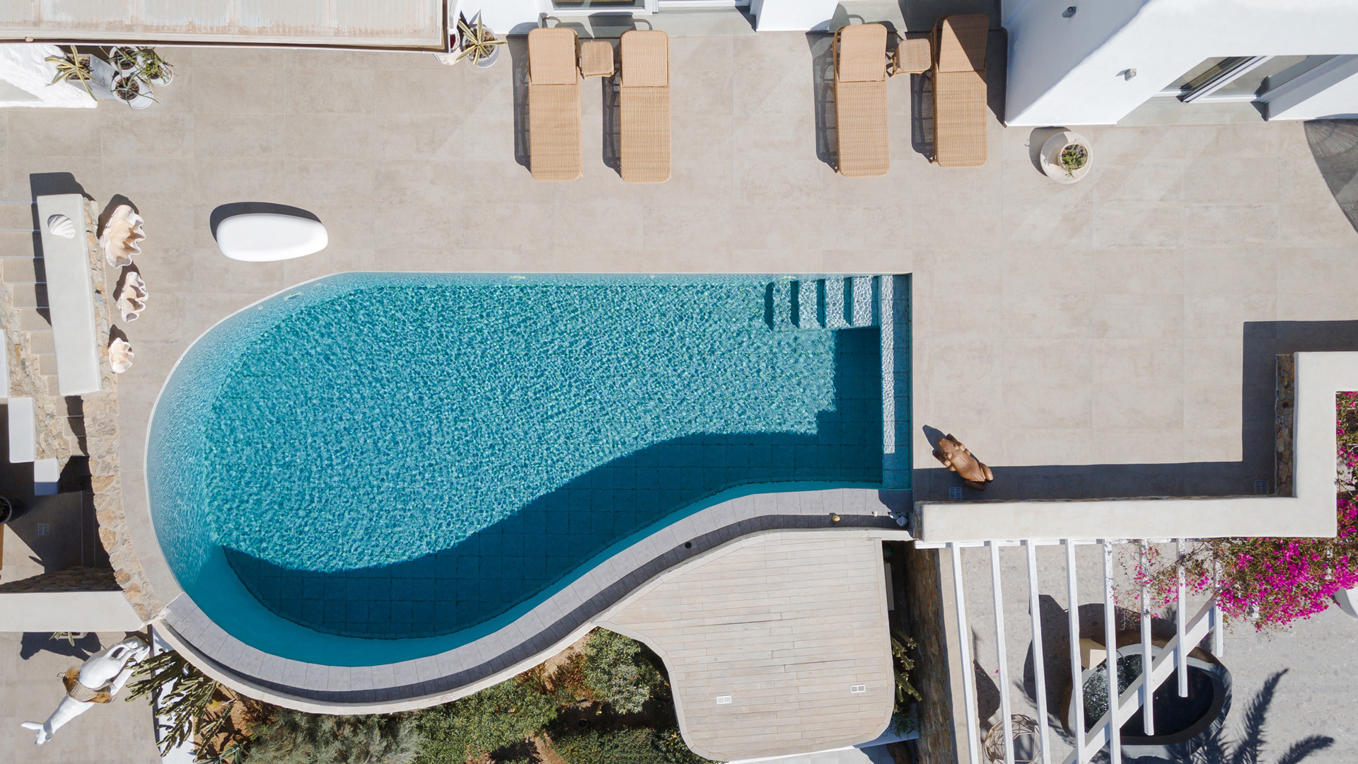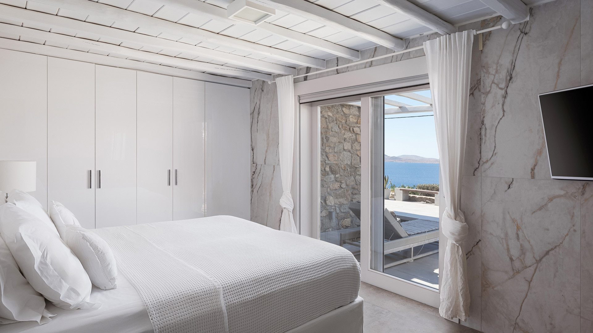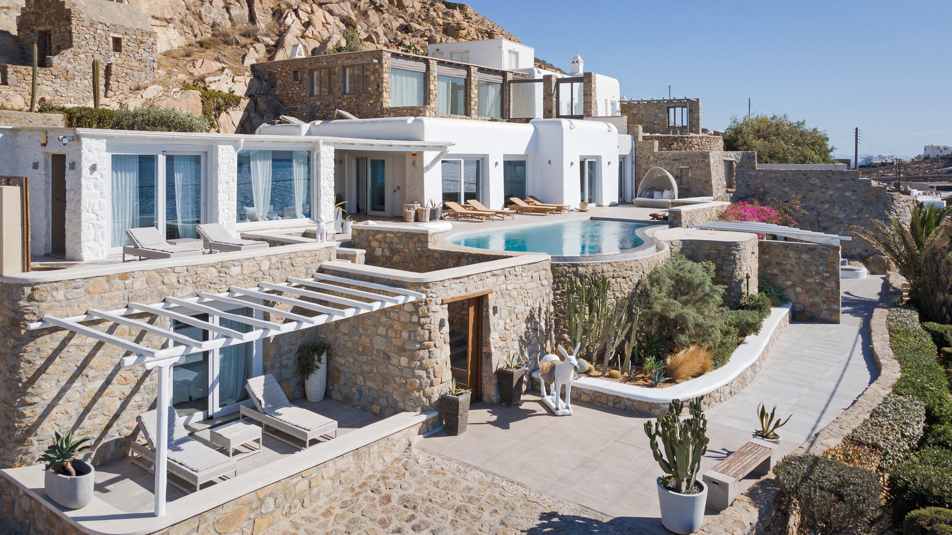 The sunset terrace is perfect for entertainment and relaxation all day around, even more so at sun-down with direct views of the picturesque Mykonos dusk. The main living areas revolve around the infinity pool with stylish poufs lined up pool side and a sheltered lounge area just a few steps back. Further lounge spots were designed on the private terraces of the some of the bedrooms as well.