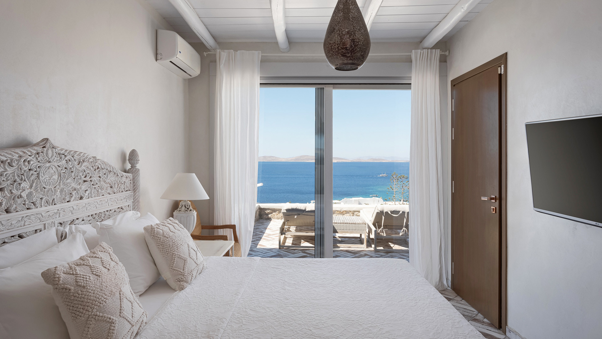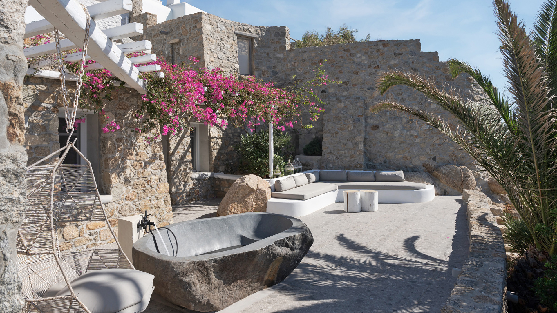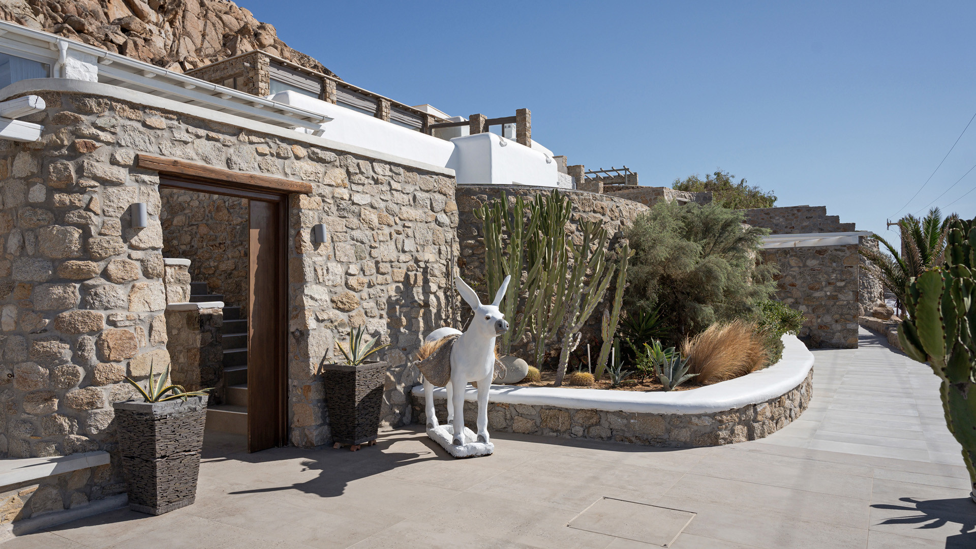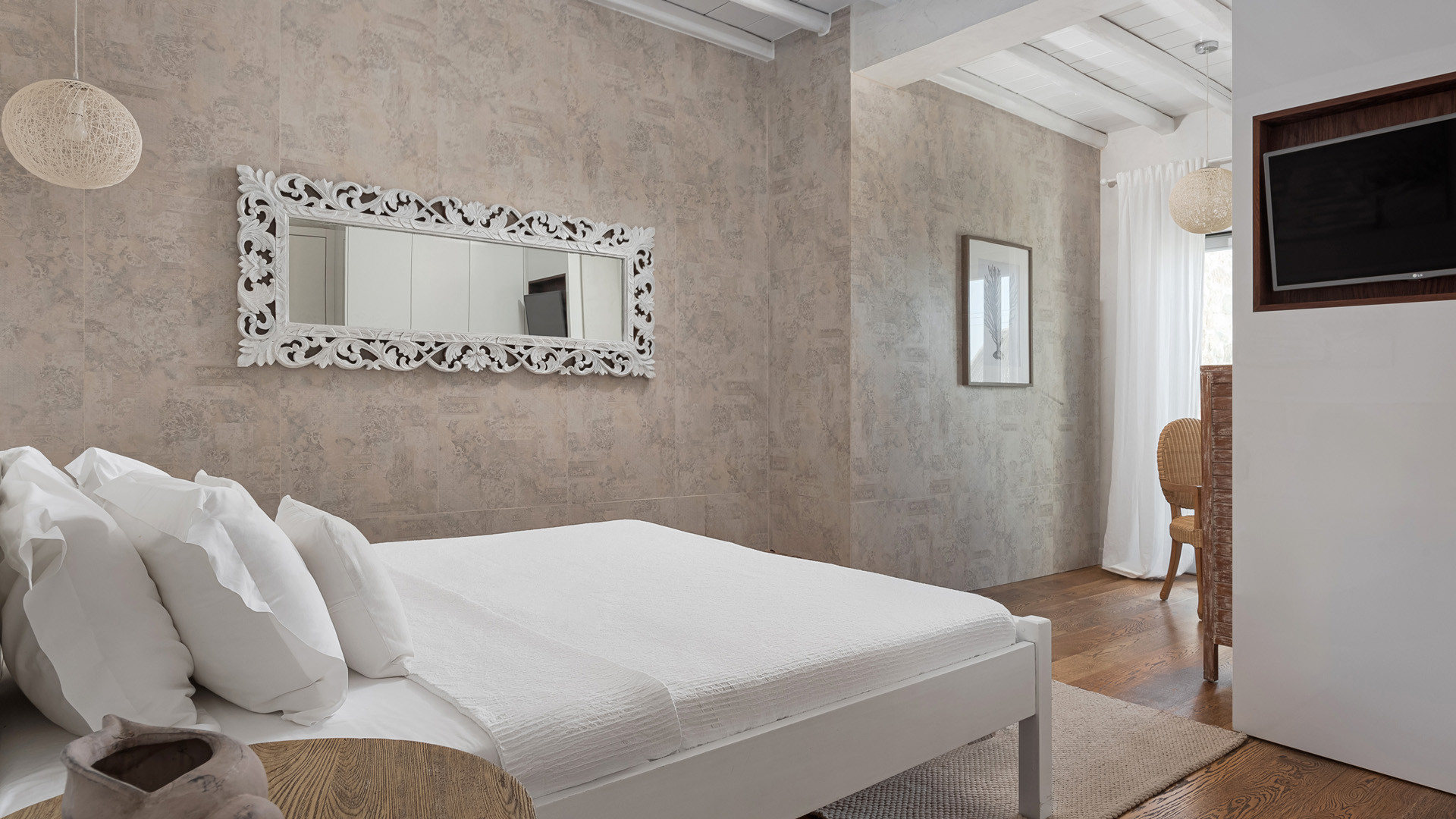 The sunset terrace is perfect for entertainment and relaxation all day around, even more so at sun-down with direct views of the picturesque Mykonos dusk. The main living areas revolve around the infinity pool with stylish poufs lined up pool side and a sheltered lounge area just a few steps back. Further lounge spots were designed on the private terraces of the some of the bedrooms as well.