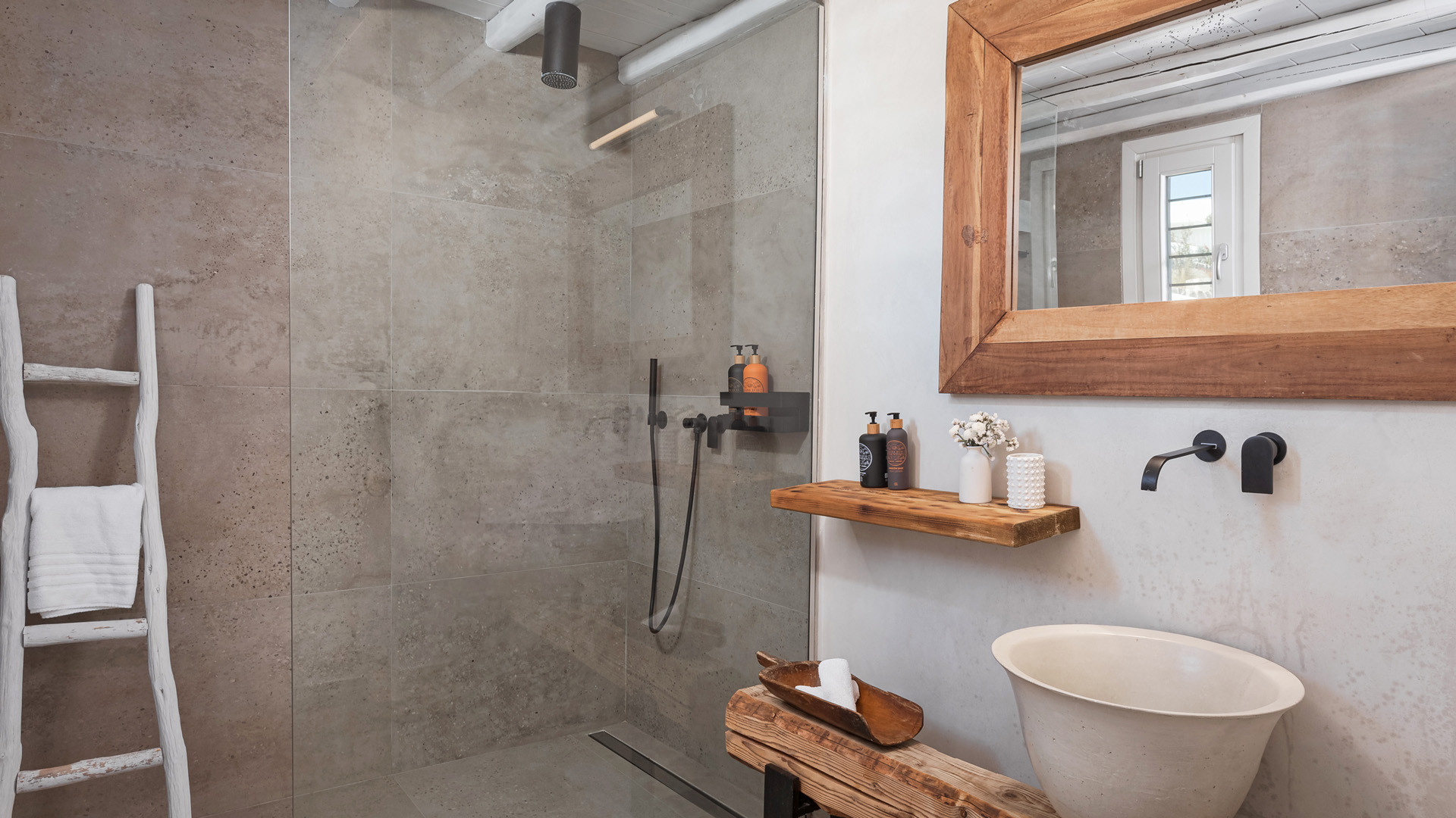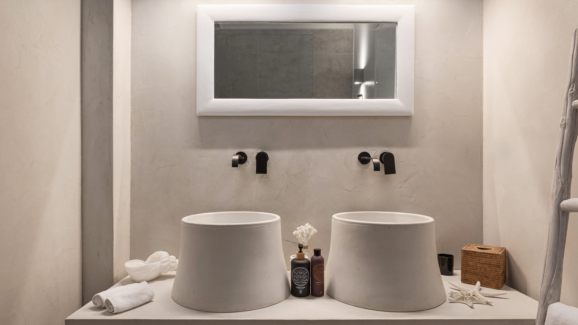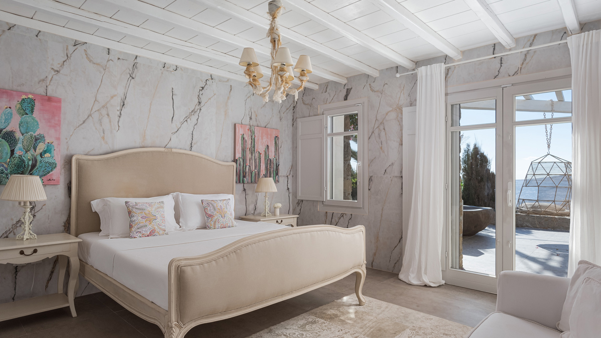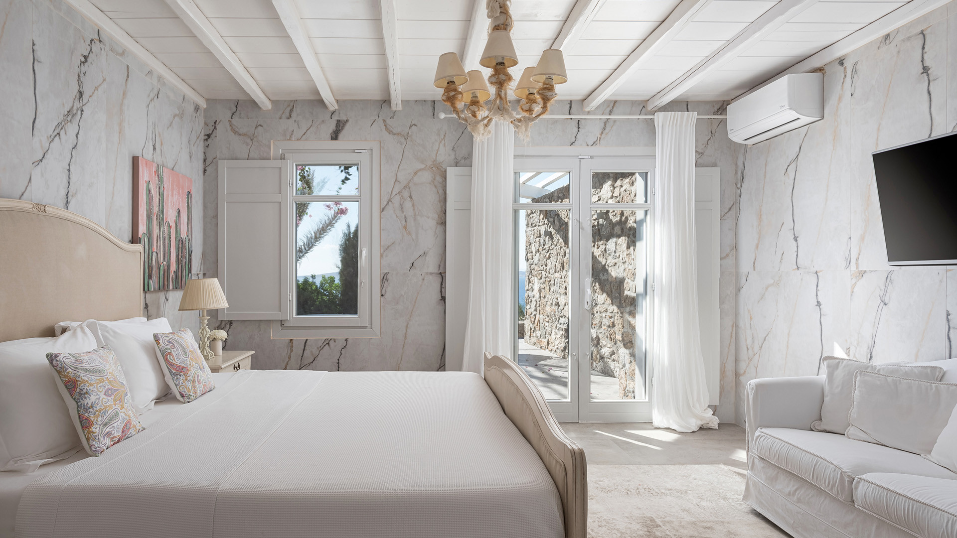 The sunset terrace is perfect for entertainment and relaxation all day around, even more so at sun-down with direct views of the picturesque Mykonos dusk. The main living areas revolve around the infinity pool with stylish poufs lined up pool side and a sheltered lounge area just a few steps back. Further lounge spots were designed on the private terraces of the some of the bedrooms as well.
