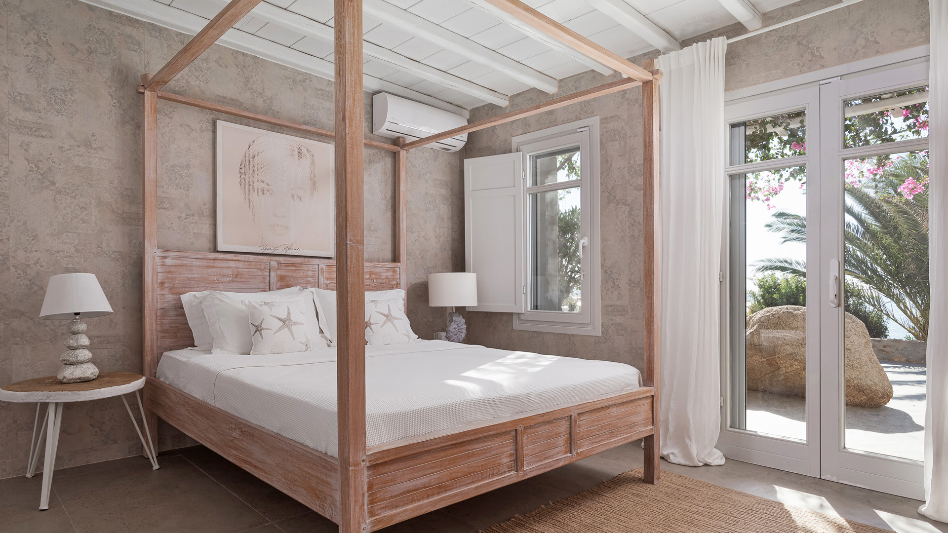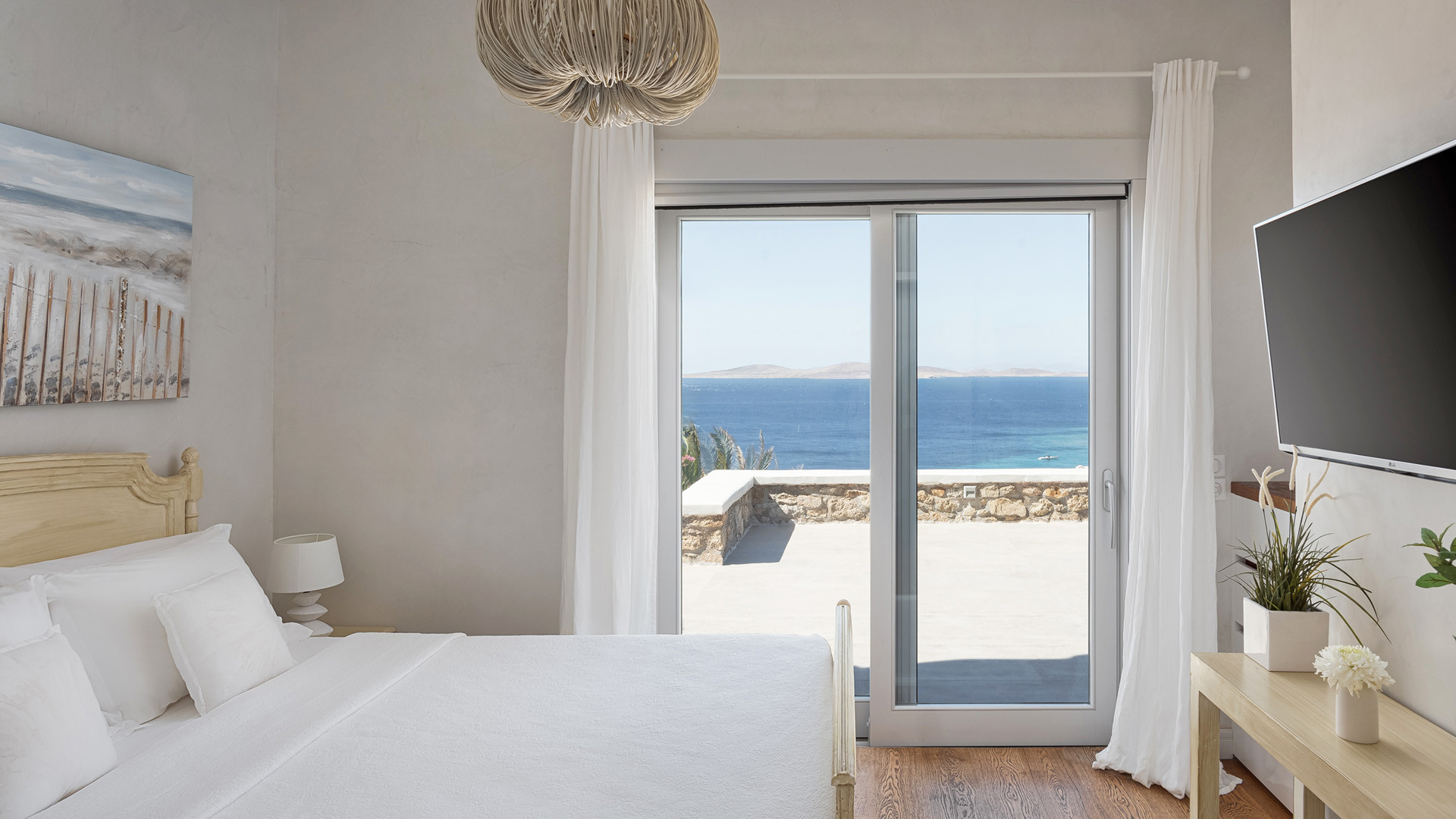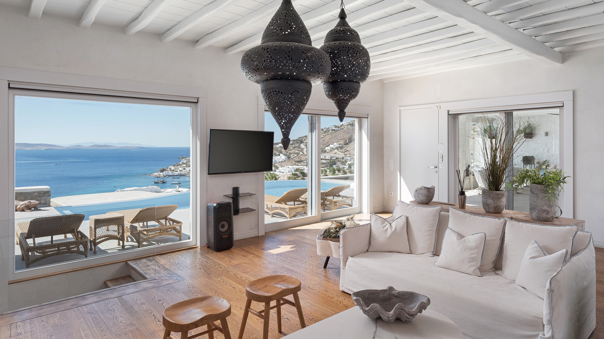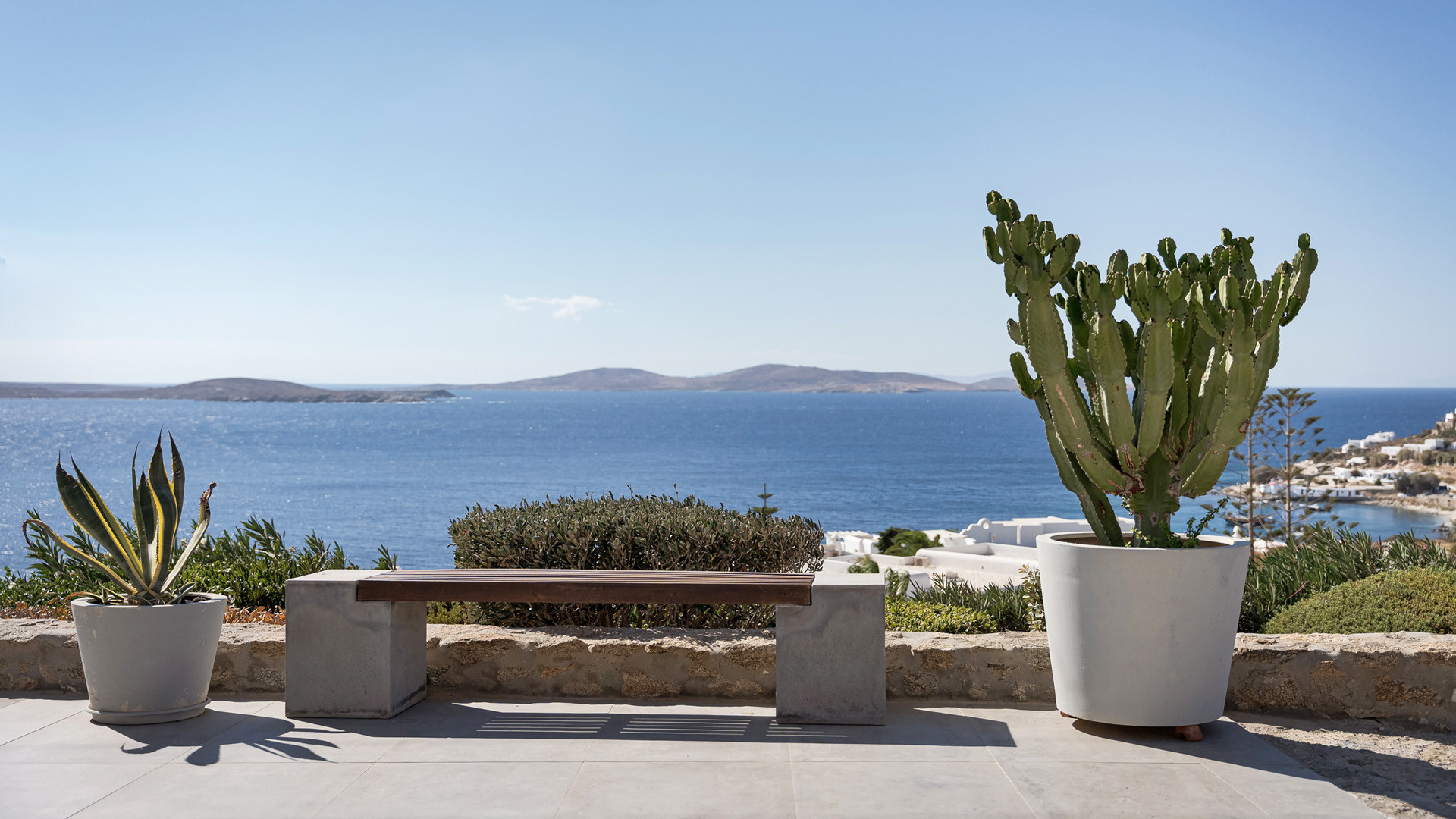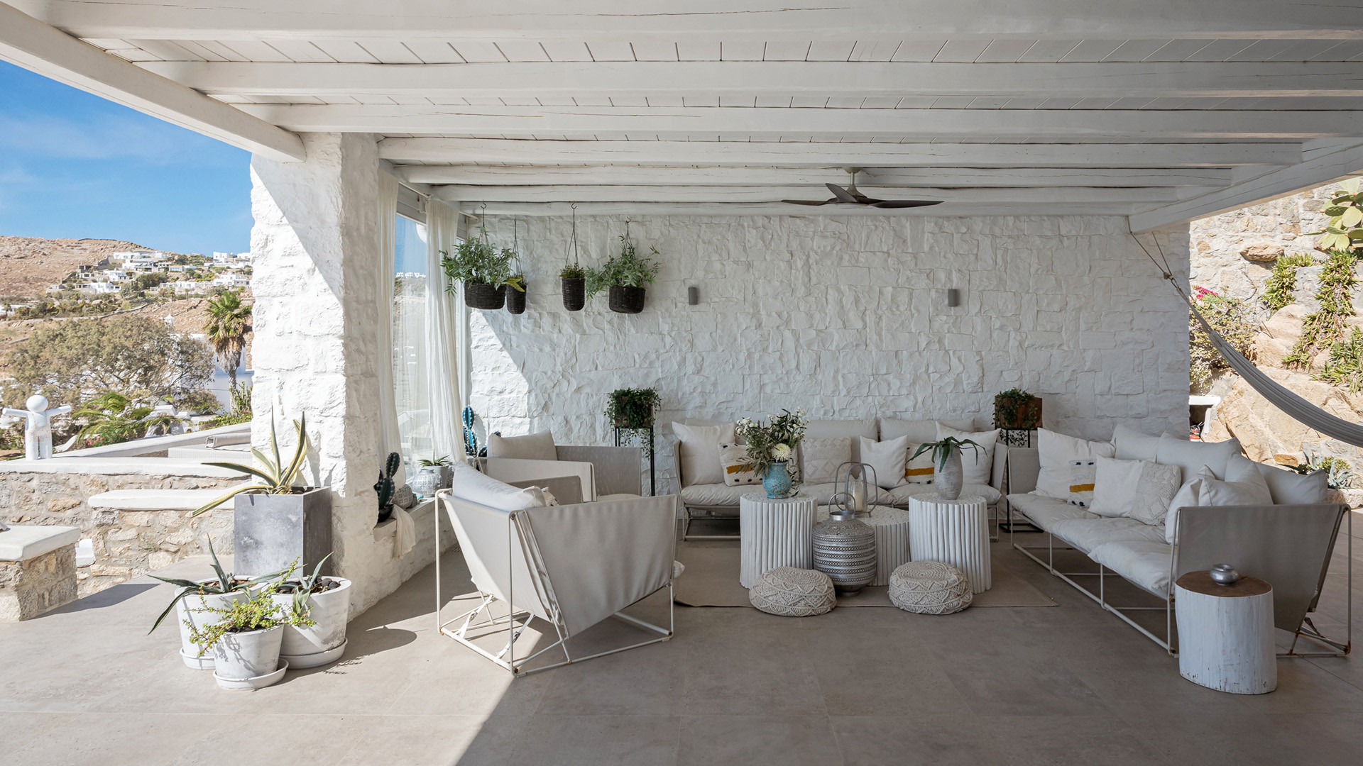 Perched on the hills above Agios Ioannis beach this private property has the best of both worlds thank to a panoramic location and easy access to the most popular spots on the island, including the nearby beaches of Agios Ioannis and Ornos.