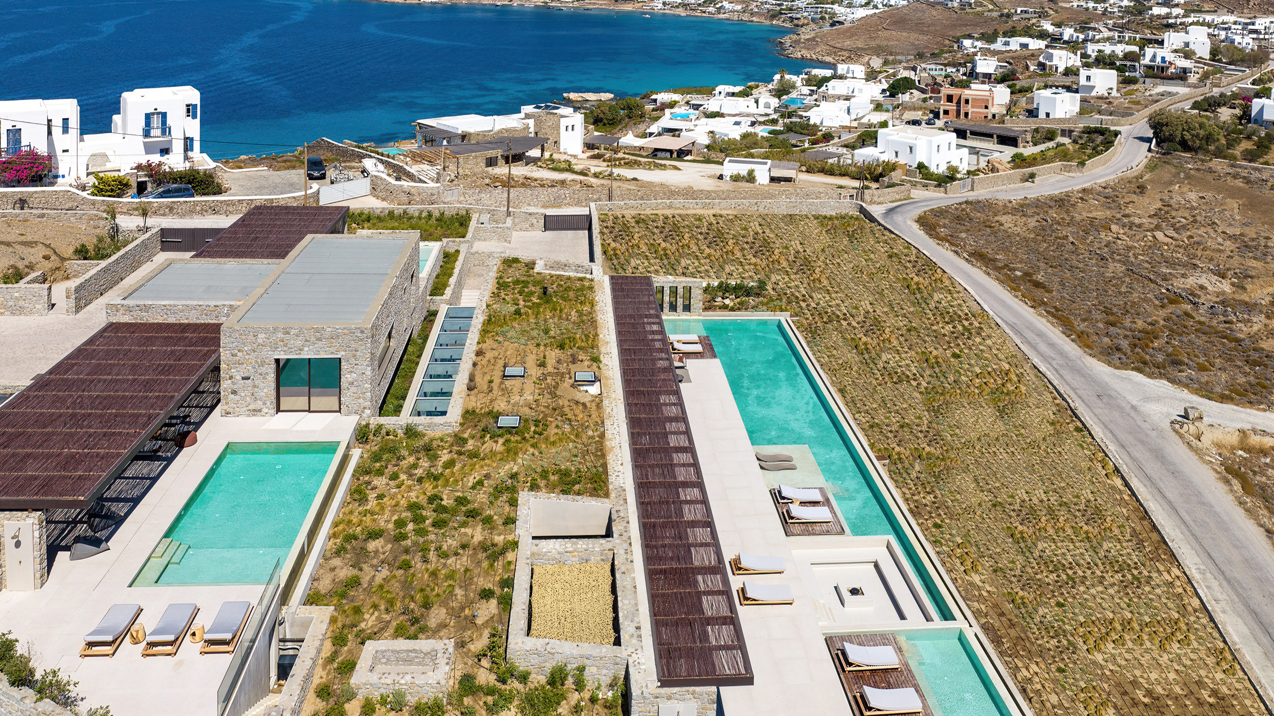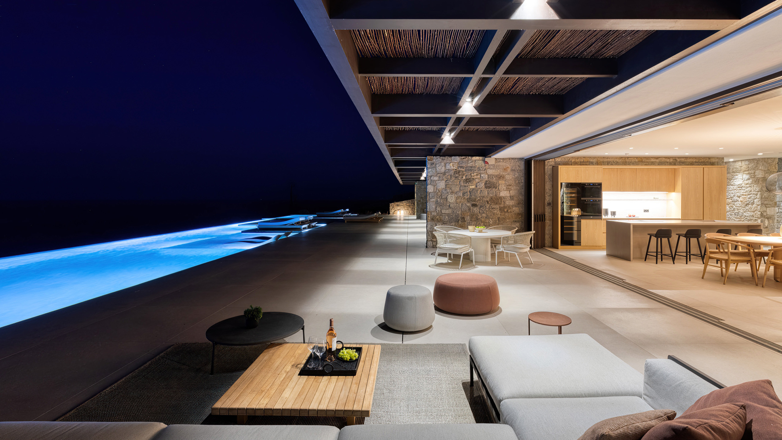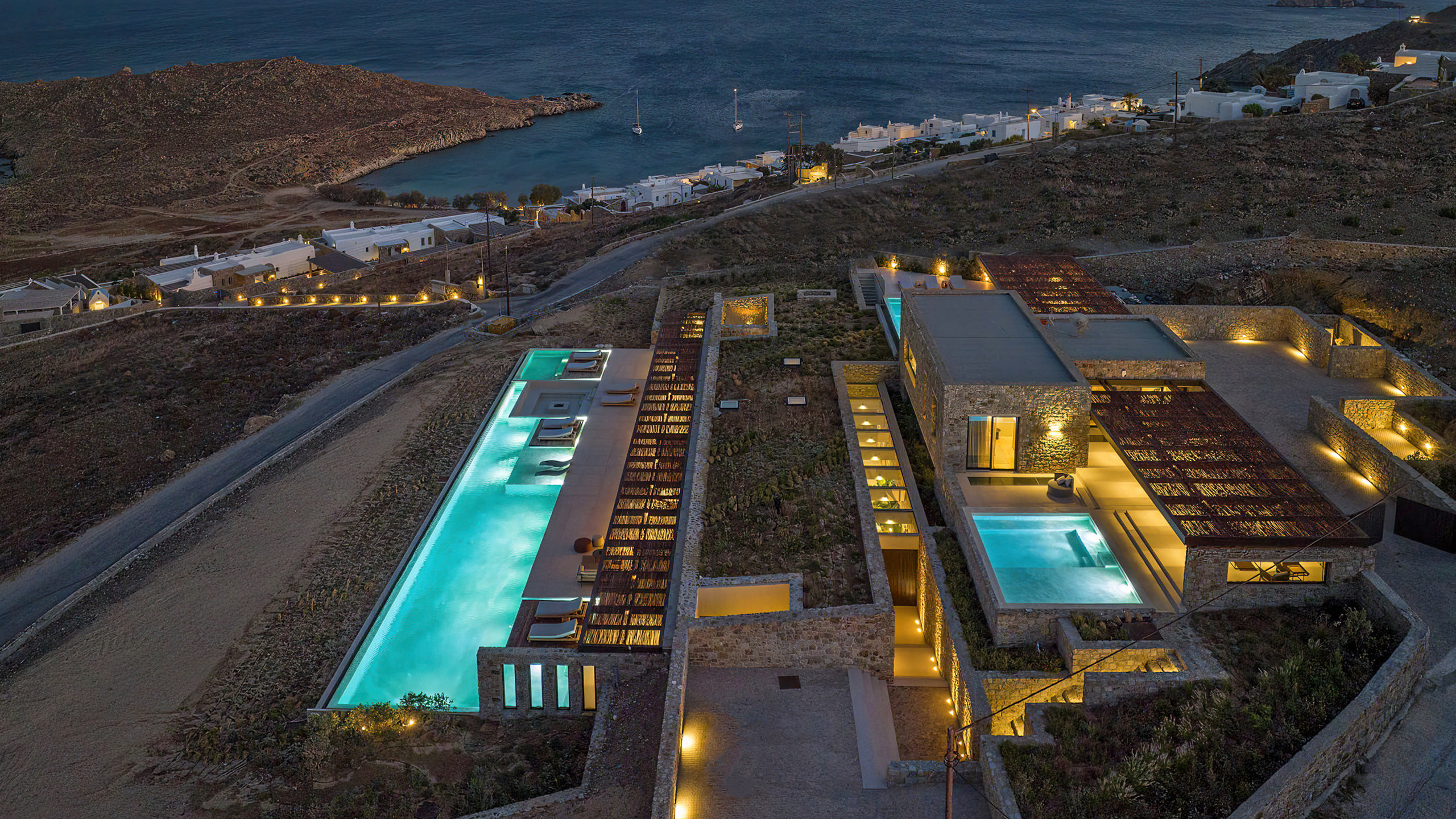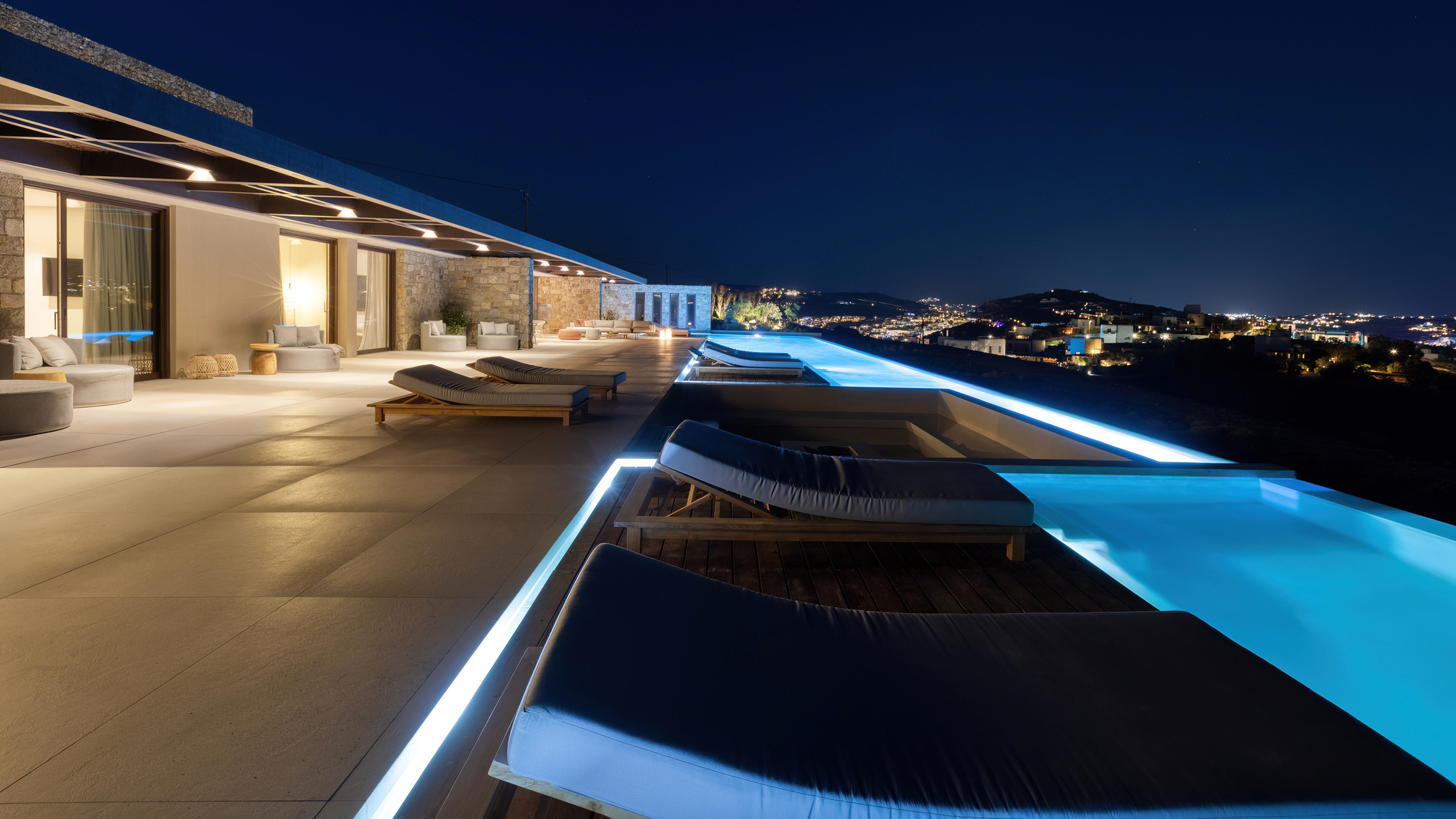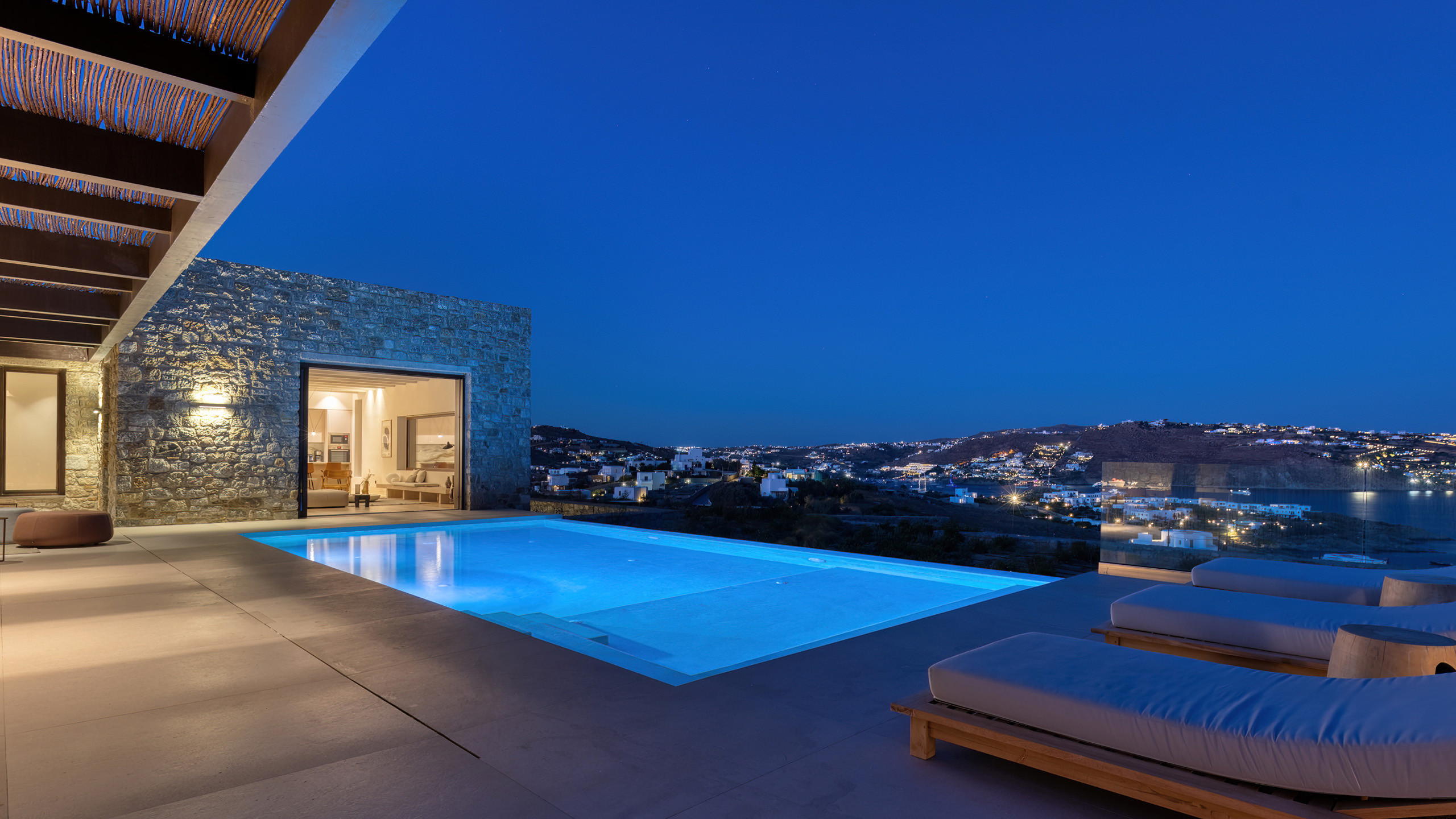 Experience unmatched luxury in Mykonos at Avalon. Escape to serenity and enjoy complete privacy in our brand-new bioclimatic stone property in Mykonos. Enjoy stunning views of the Aegean Sea and unique, contemporary furnishings at this ultimate luxury vacation destination. Indulge in panoramic views of the Aegean Sea from the spacious open-plan design and natural light-filled spaces. Located just a short drive from beautiful beaches and exciting activities, Avalon offers the best of both worlds.