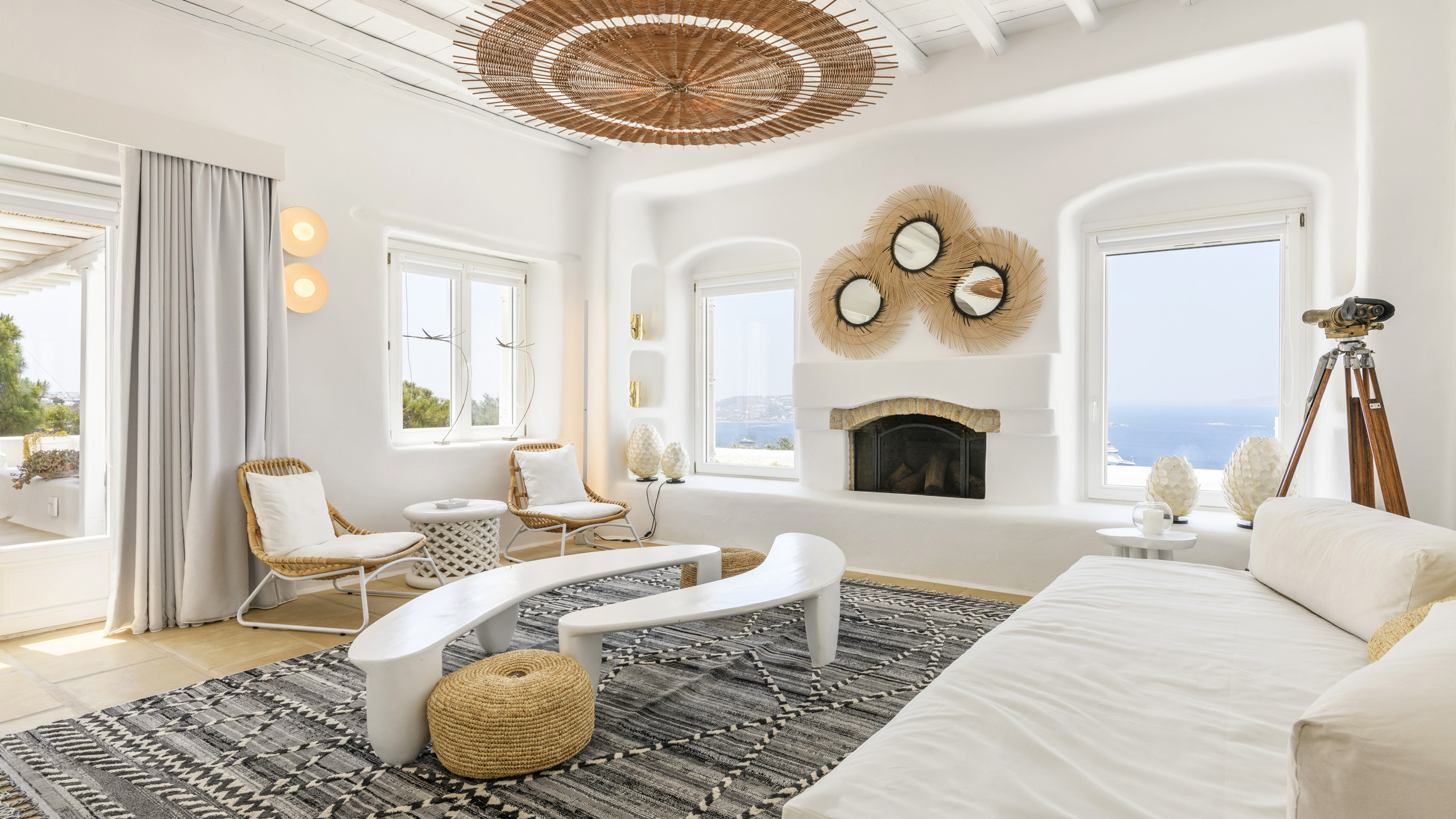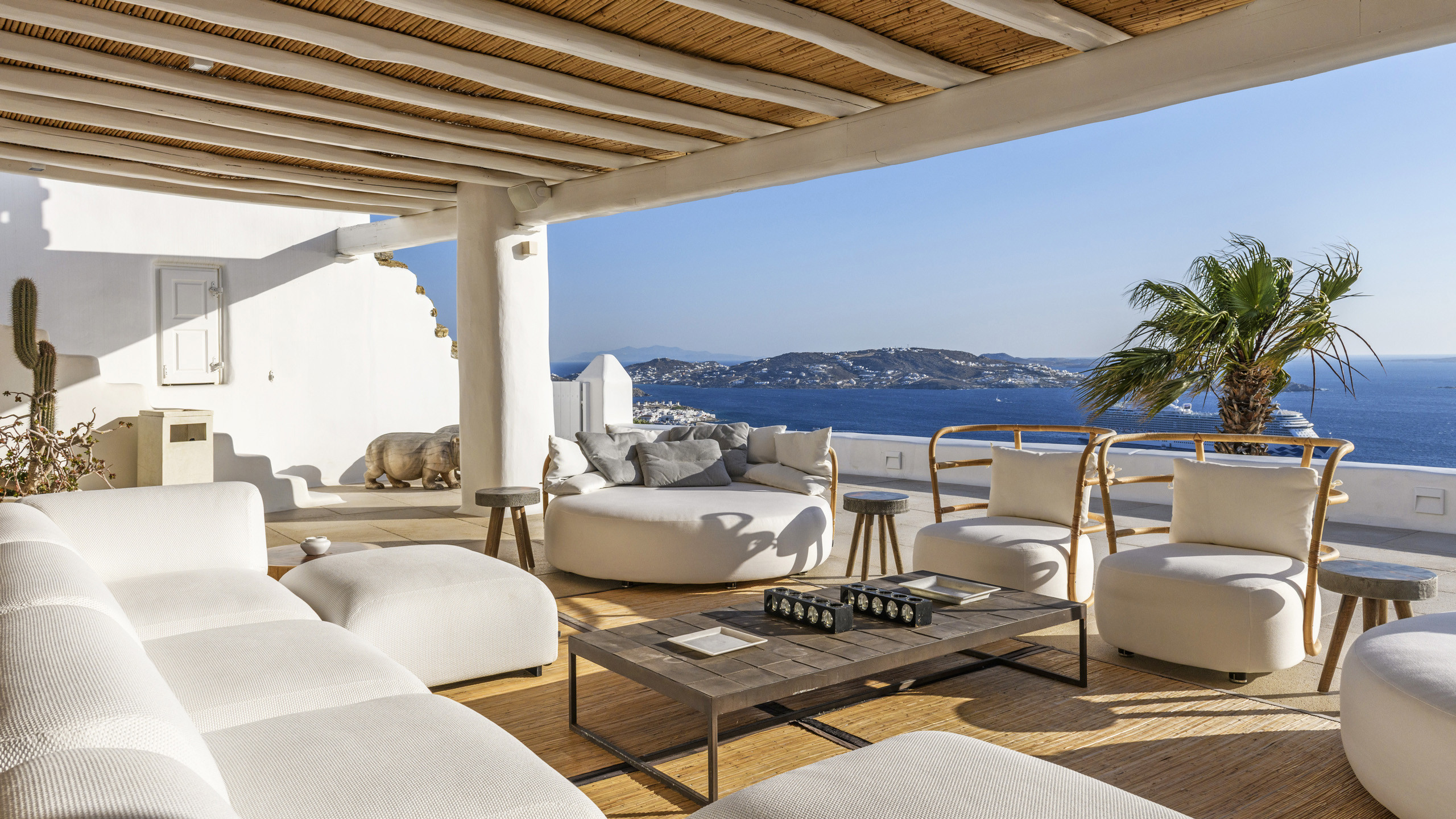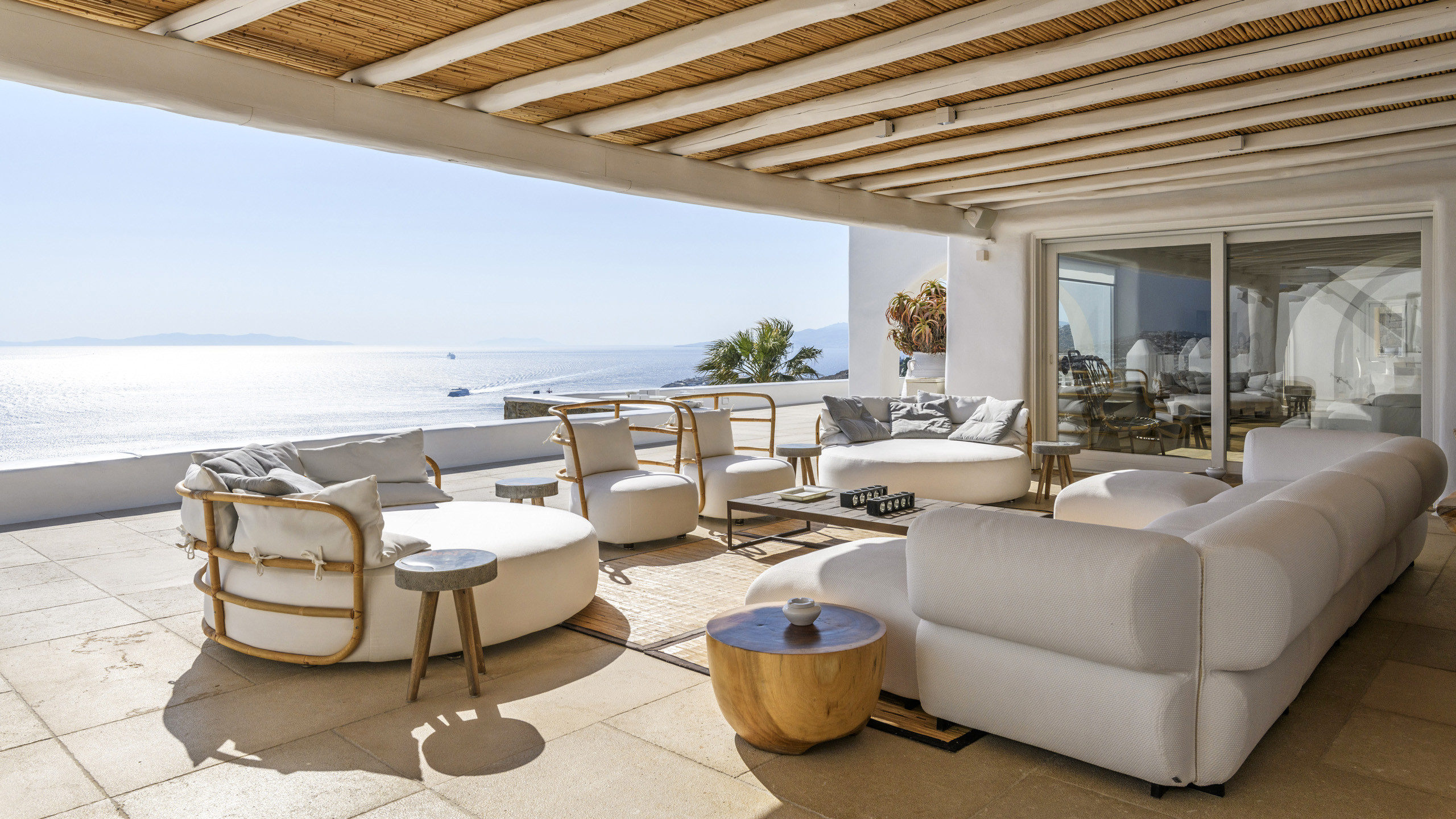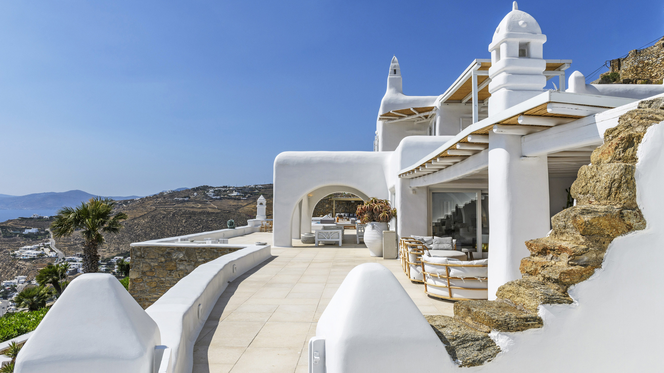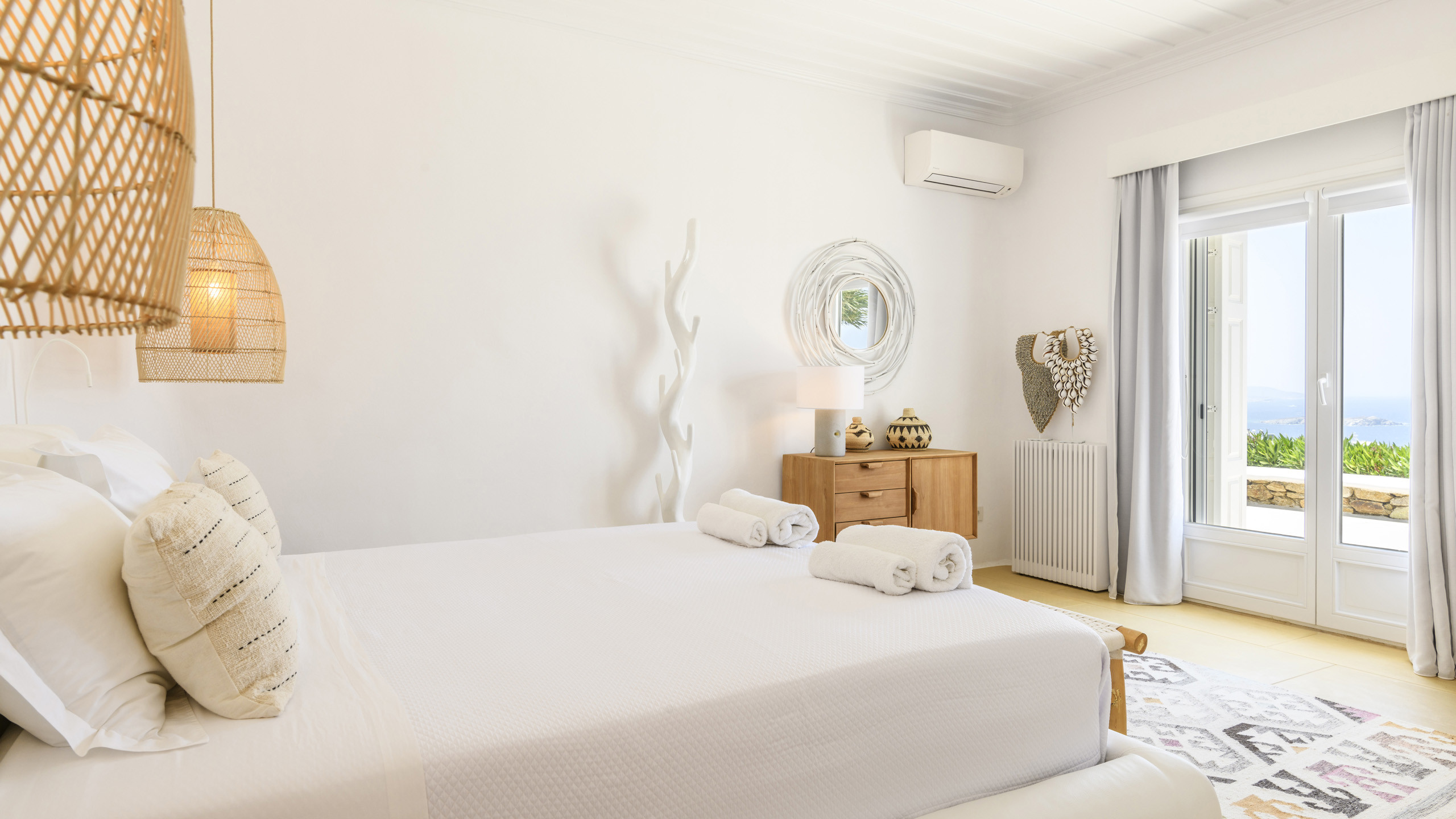The Tourlos area is characterized by the presence of numerous super-exclusive properties, and the magnificent Breeze naturally fits among them. Situated on a spacious 4000 sqm plot, this villa, with its traditional Cycladic architecture, stands prominently in an elevated position, enjoying a breathtaking panoramic view of the sea and the white houses of Mykonos Town in the distance. From here, excellent beaches and the cosmopolitan city itself, with all its entertainment possibilities, are easily accessible.