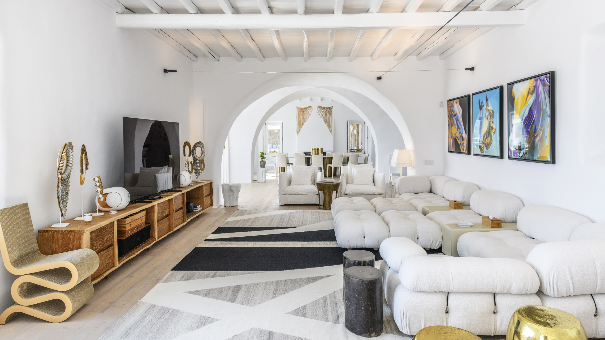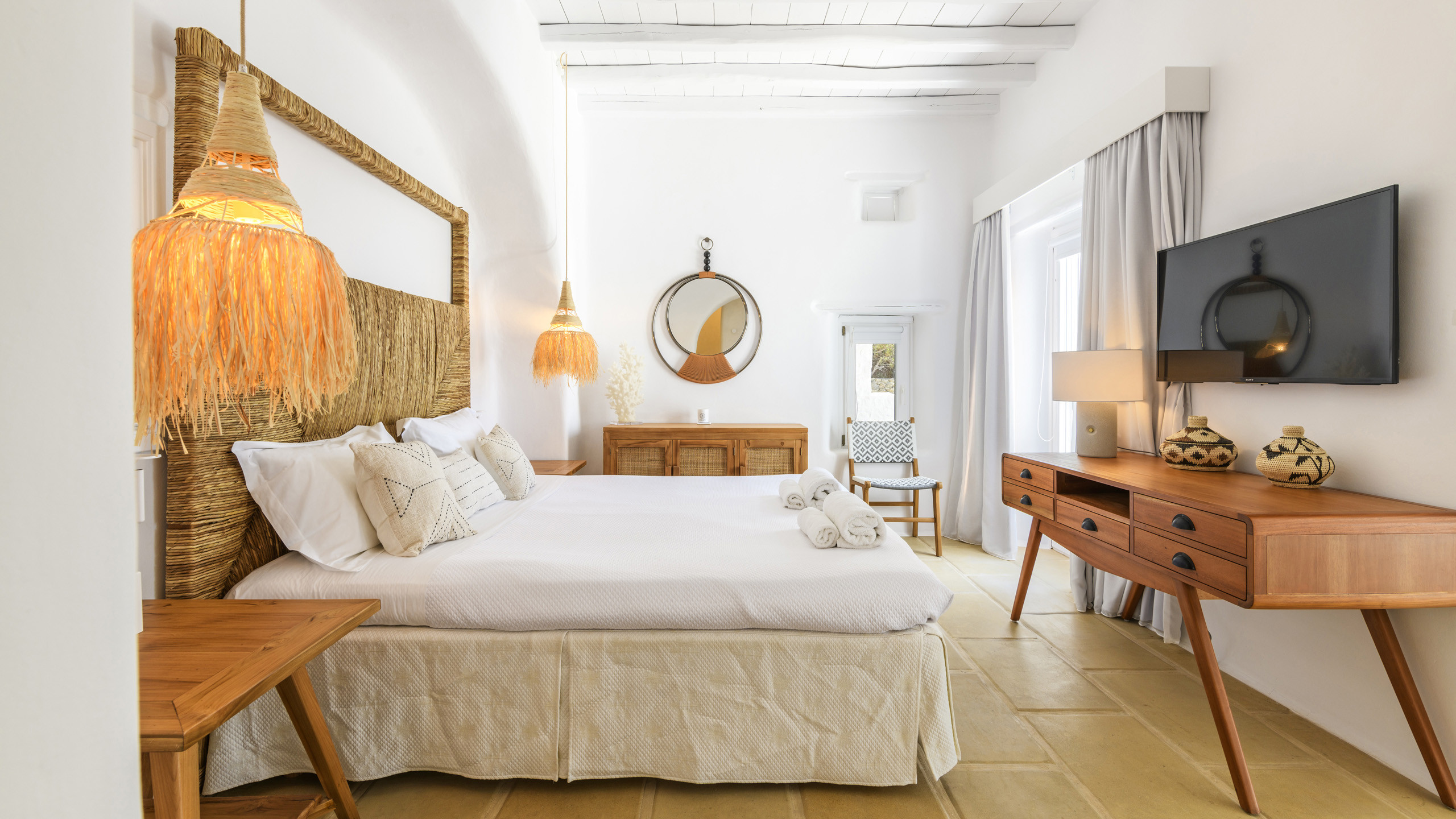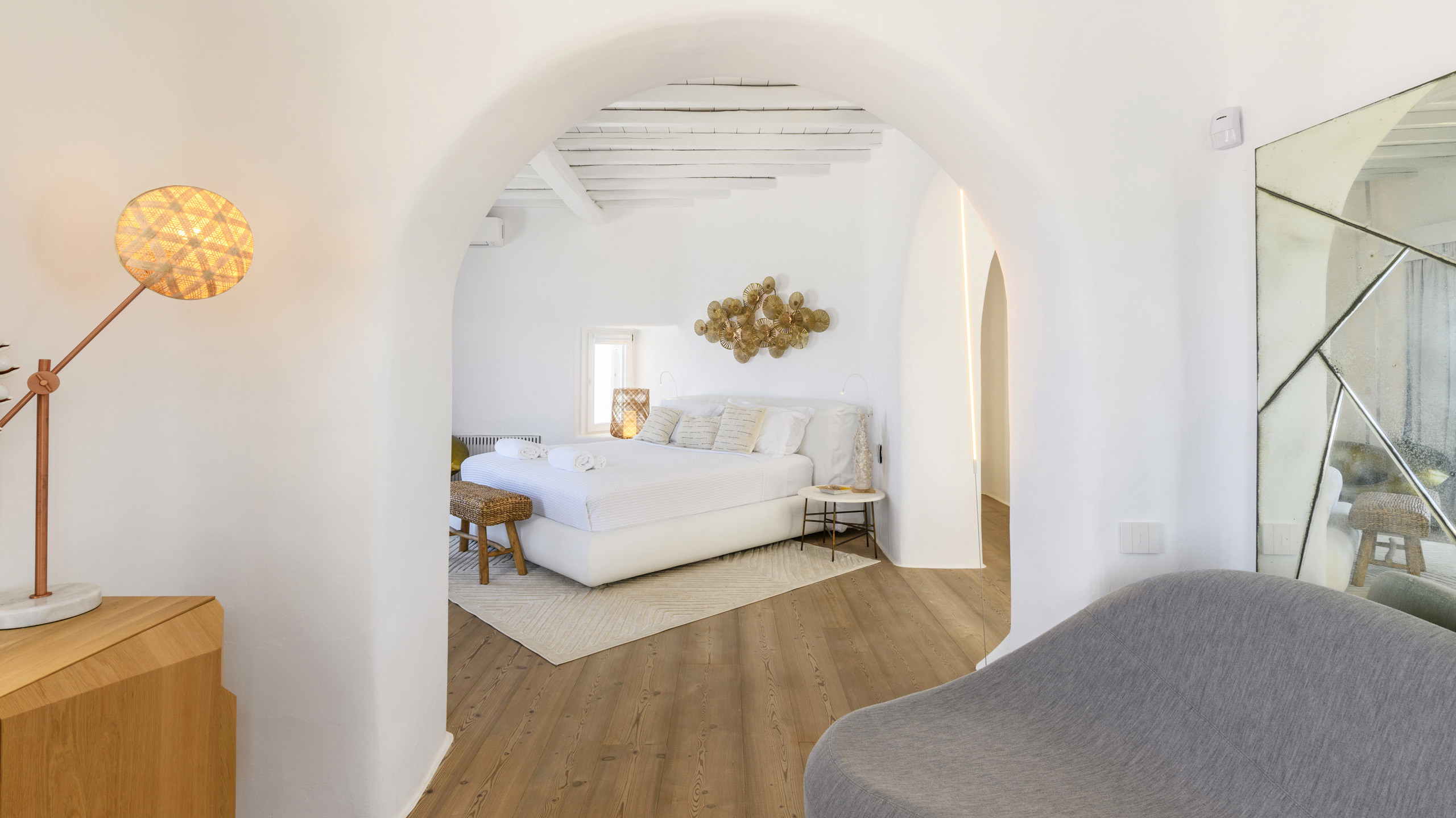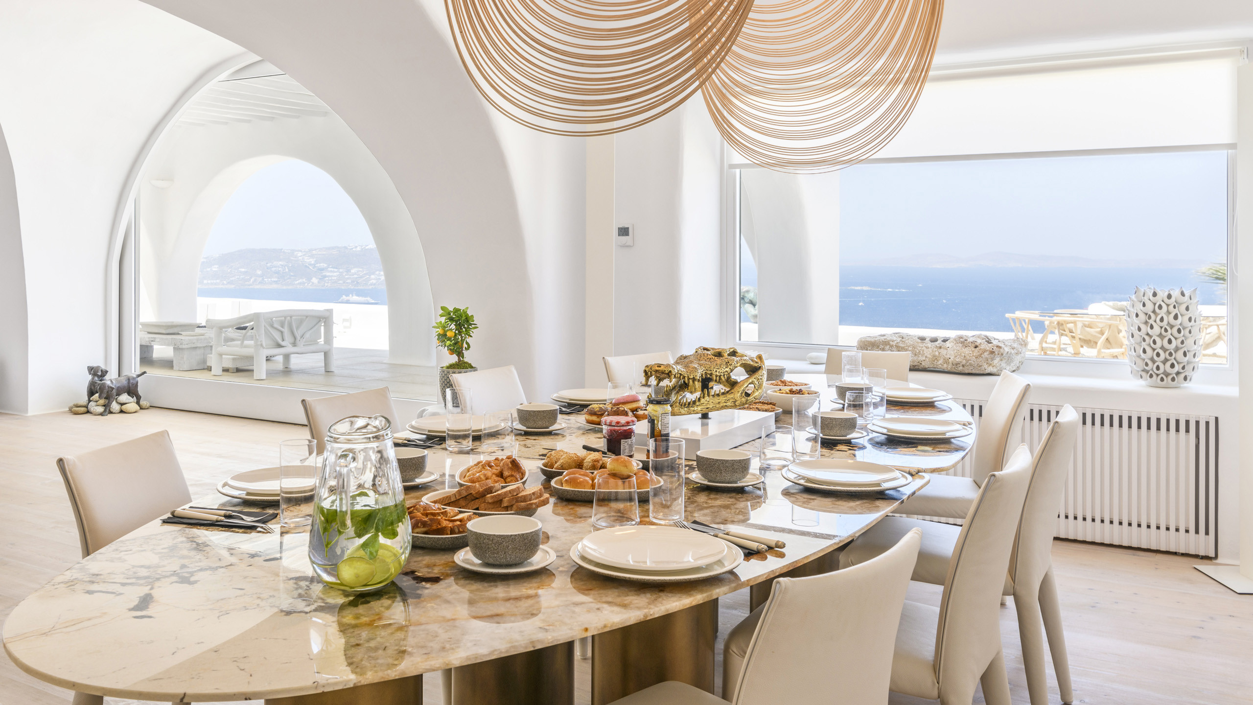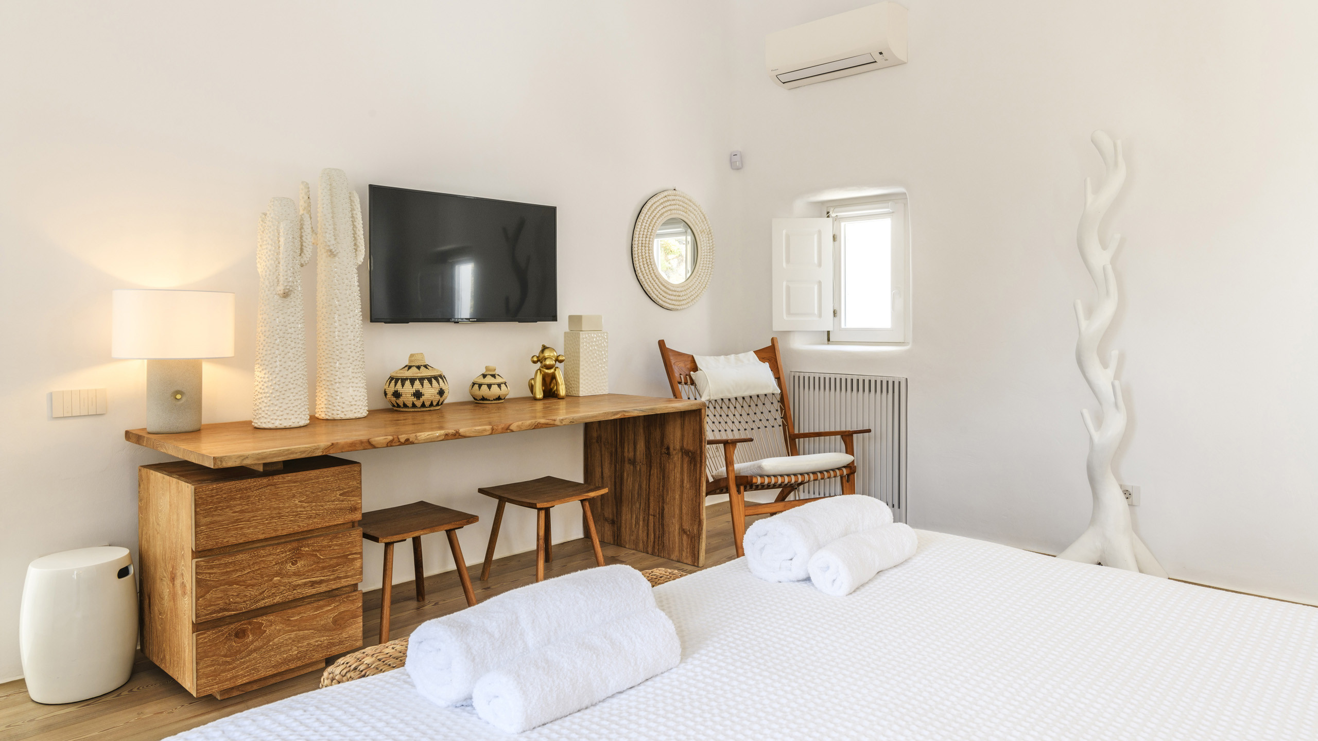 The Tourlos area is characterized by the presence of numerous super-exclusive properties, and the magnificent Breeze naturally fits among them. Situated on a spacious 4000 sqm plot, this villa, with its traditional Cycladic architecture, stands prominently in an elevated position, enjoying a breathtaking panoramic view of the sea and the white houses of Mykonos Town in the distance. From here, excellent beaches and the cosmopolitan city itself, with all its entertainment possibilities, are easily accessible.