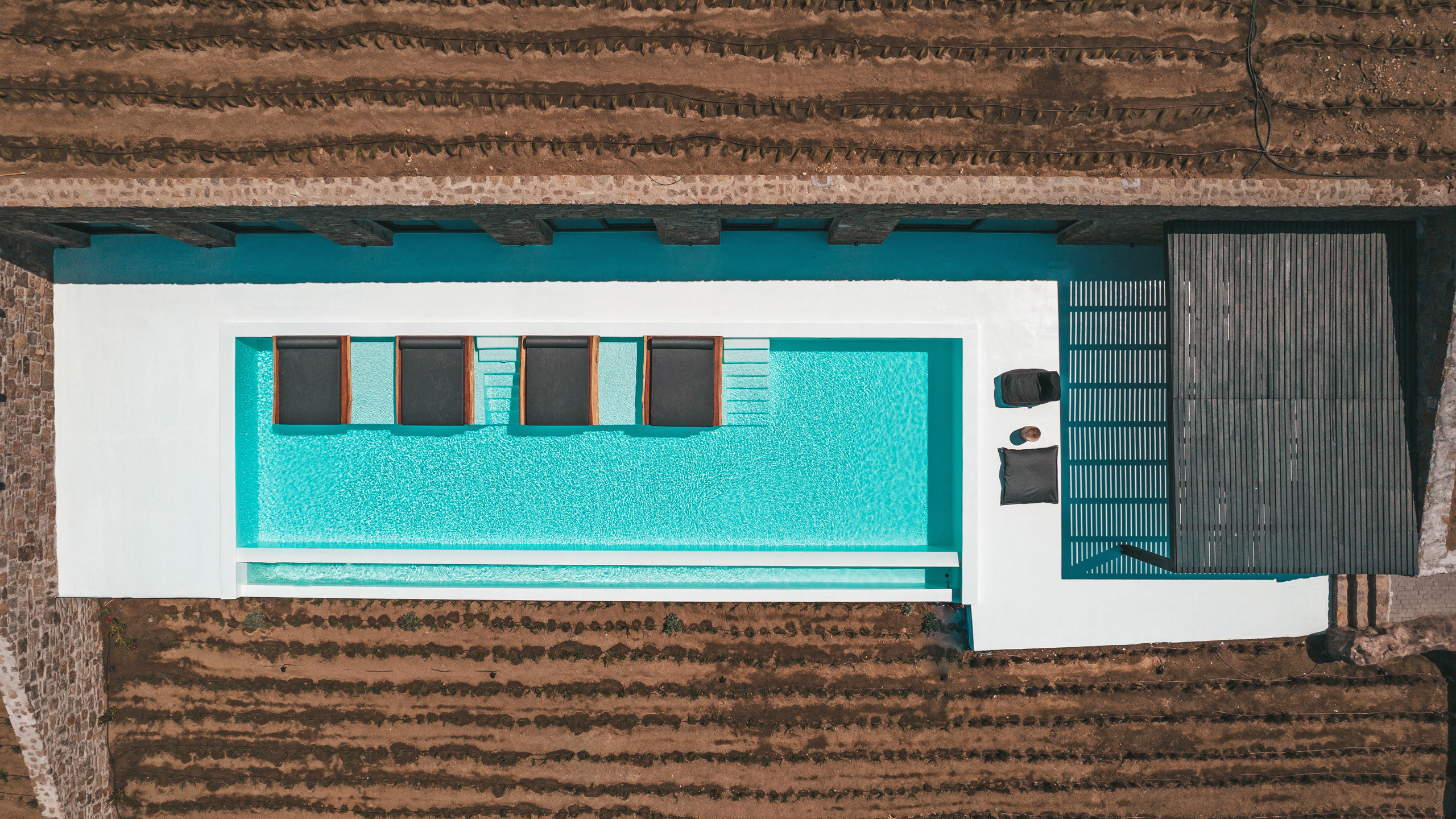 A long stone-clad building runs parallel to the pool, with all the rooms overlooking the sea and providing direct access to this attractive terrace. At one end, there is a pergola with a dedicated dining area.