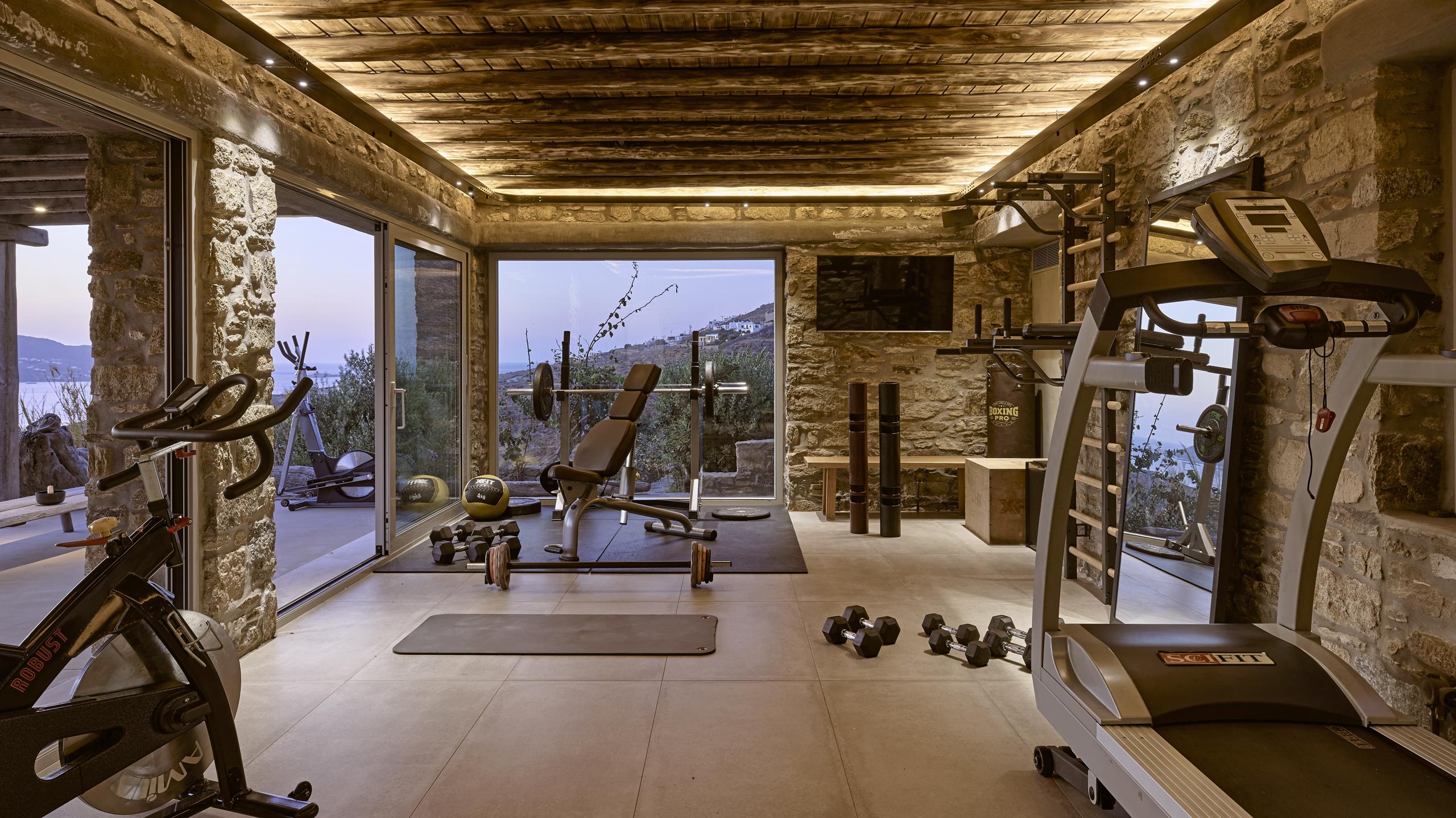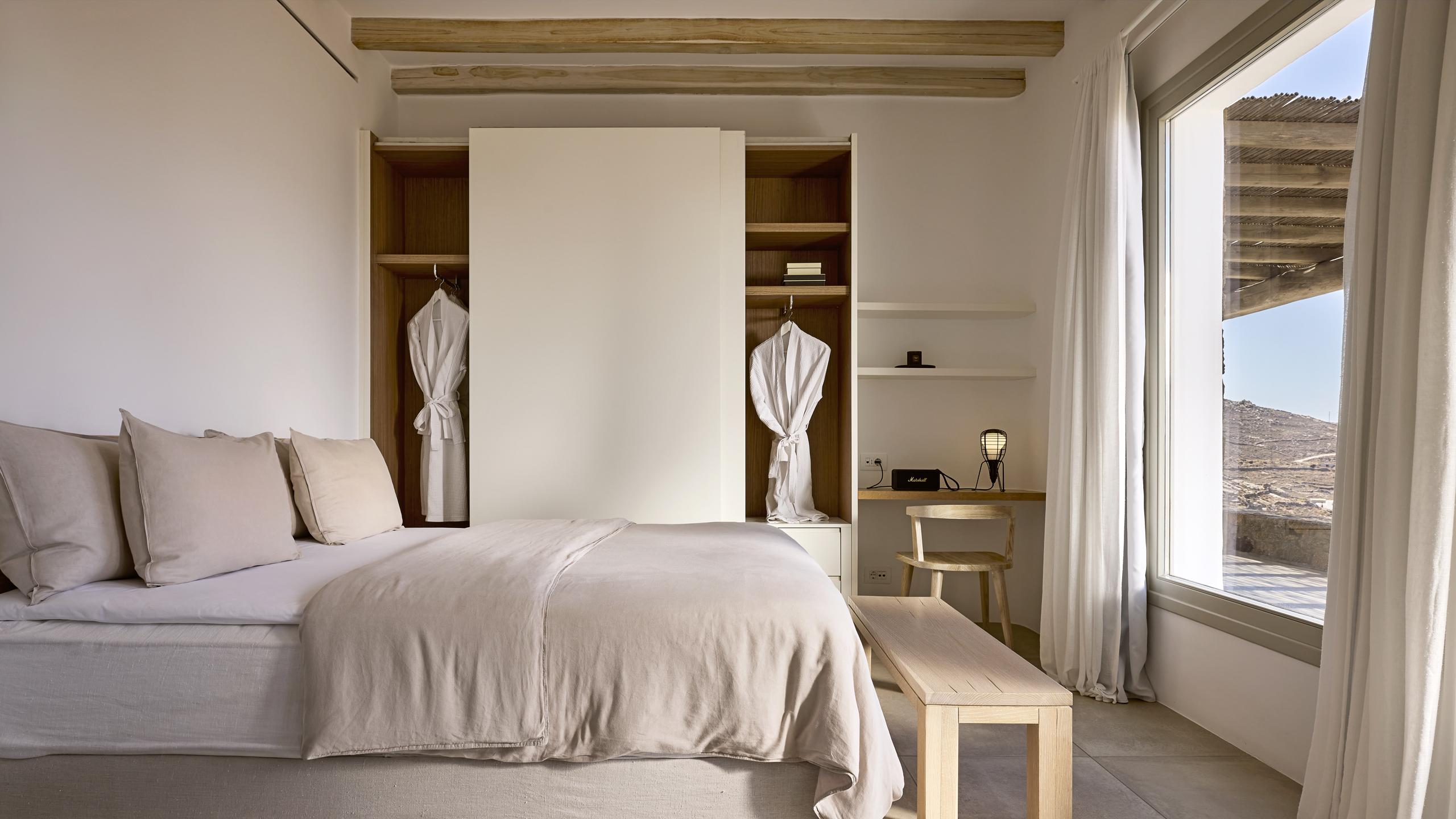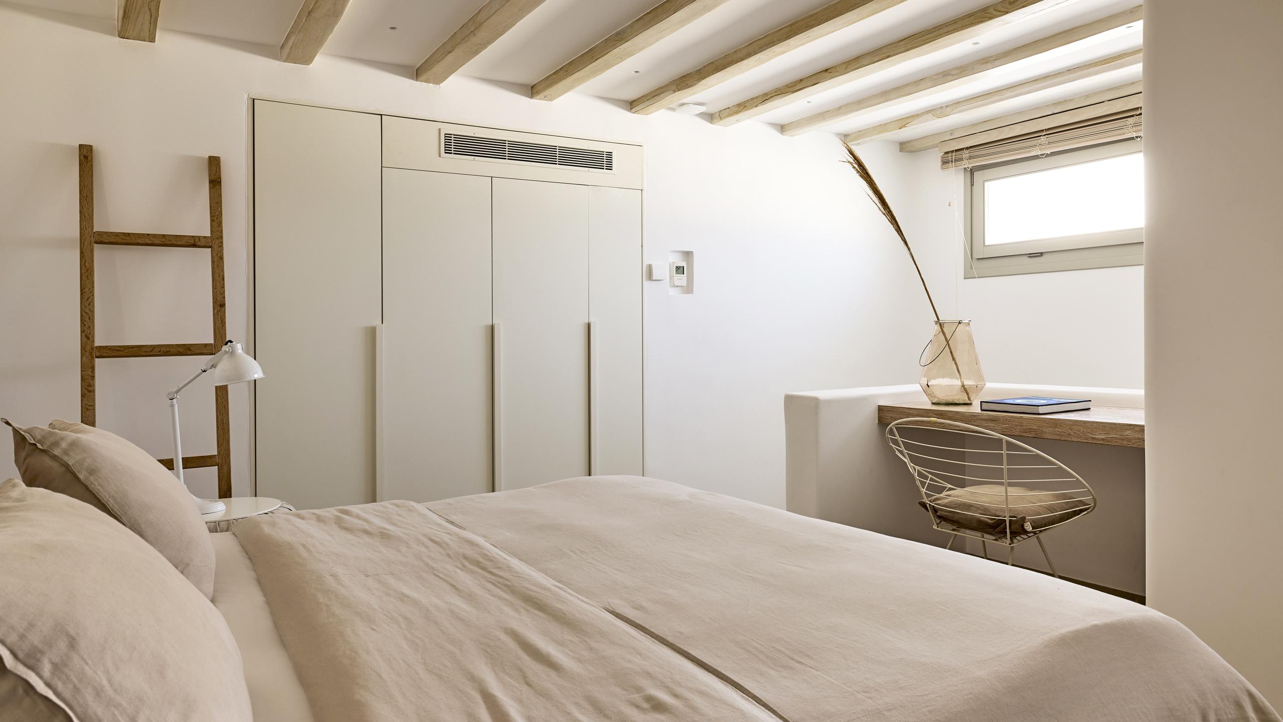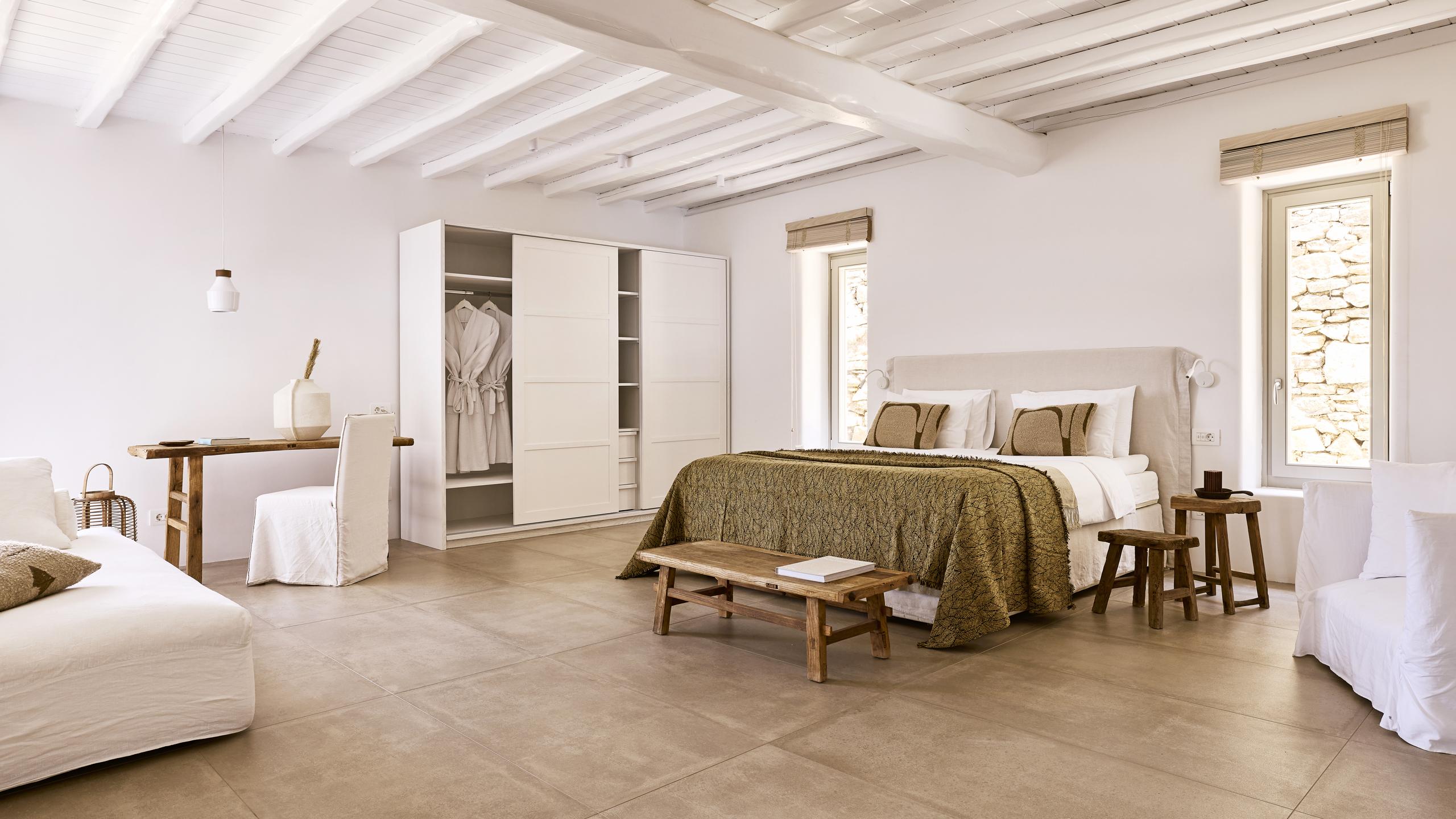 A remarkable attention to details is evident throughout the indoor spaces of Ftelia Hideaway. Each room is appointed with style, each piece of furniture was carefully chosen to contribute to an airy, elegant atmosphere. Modern amenities and domotics complete the picture, ensuring guests feel both pampered and entertained. For the ultimate relaxation experience a new hammam, massage room and small private gym were added to the property near the lower guest suite. True to Cycladic style the property was built in units, with some bedrooms having independent access for added privacy.
