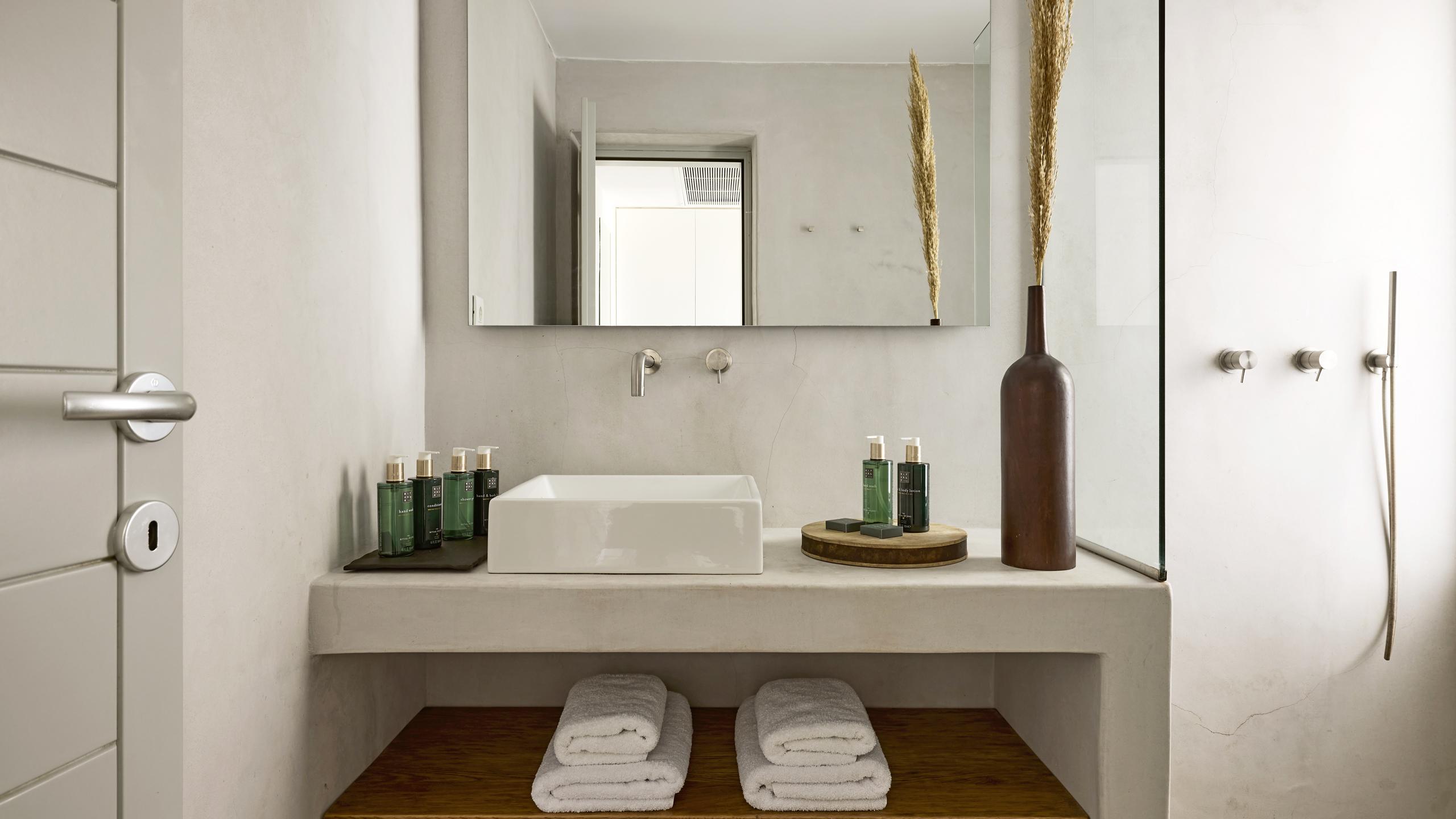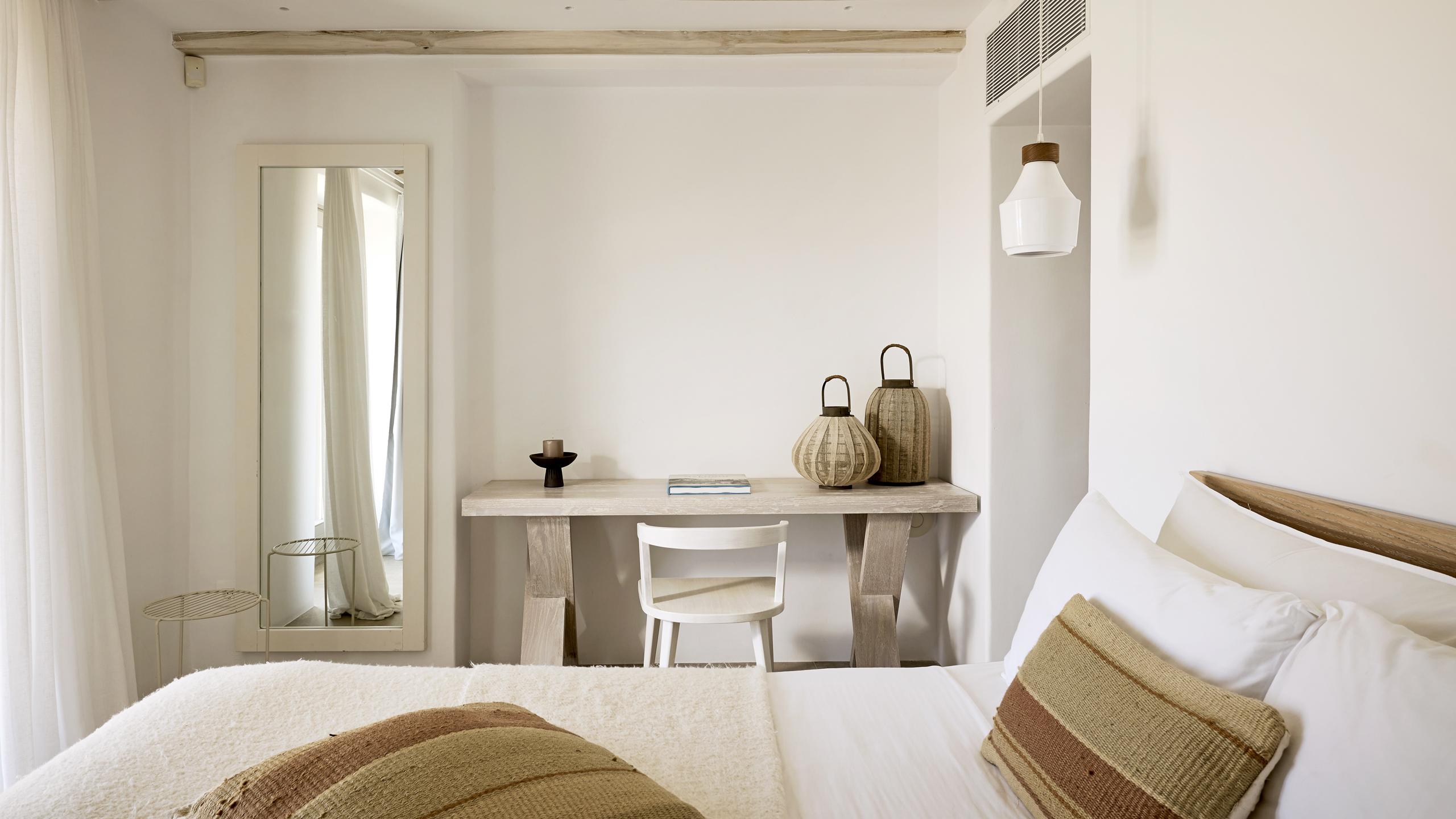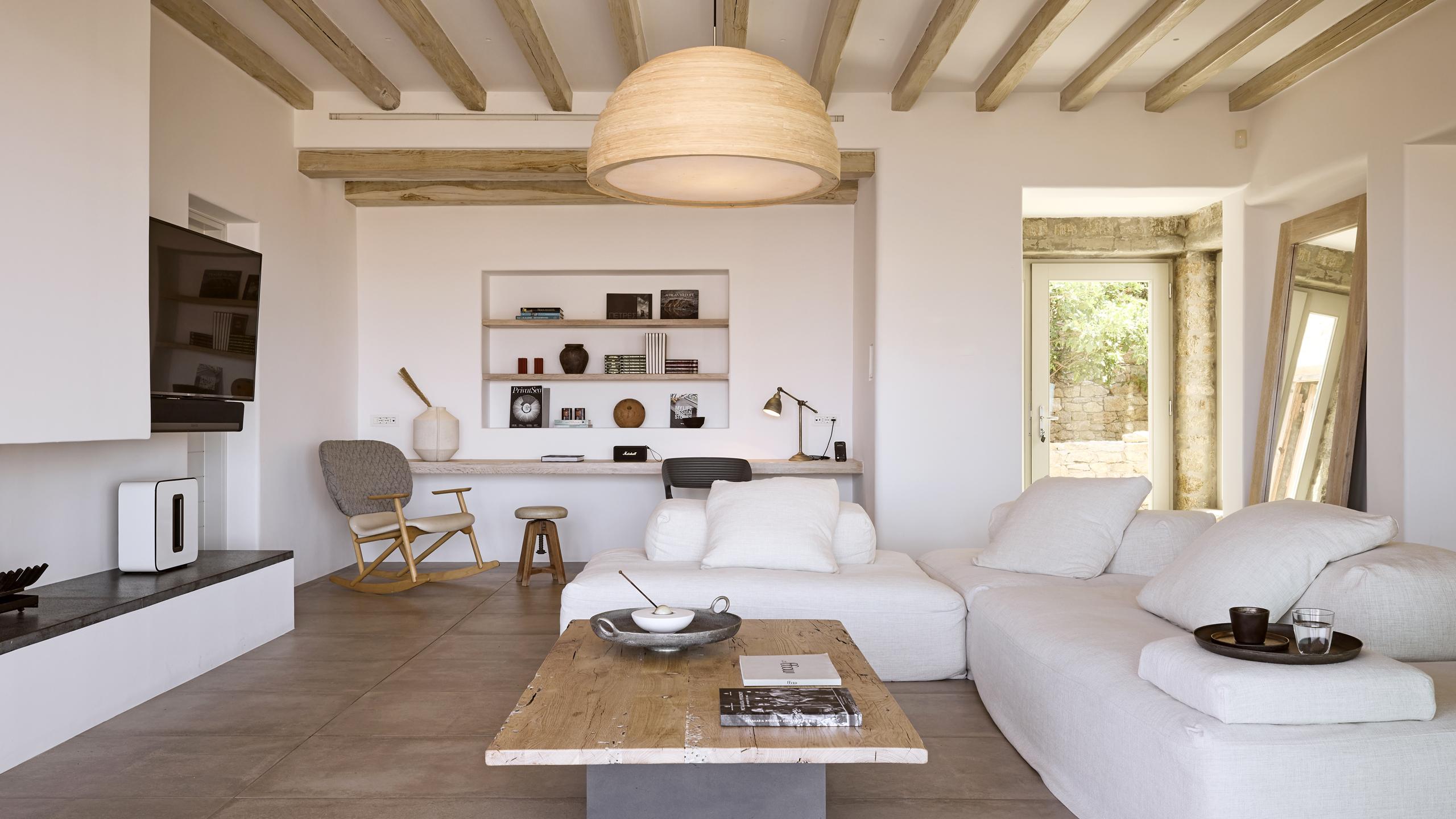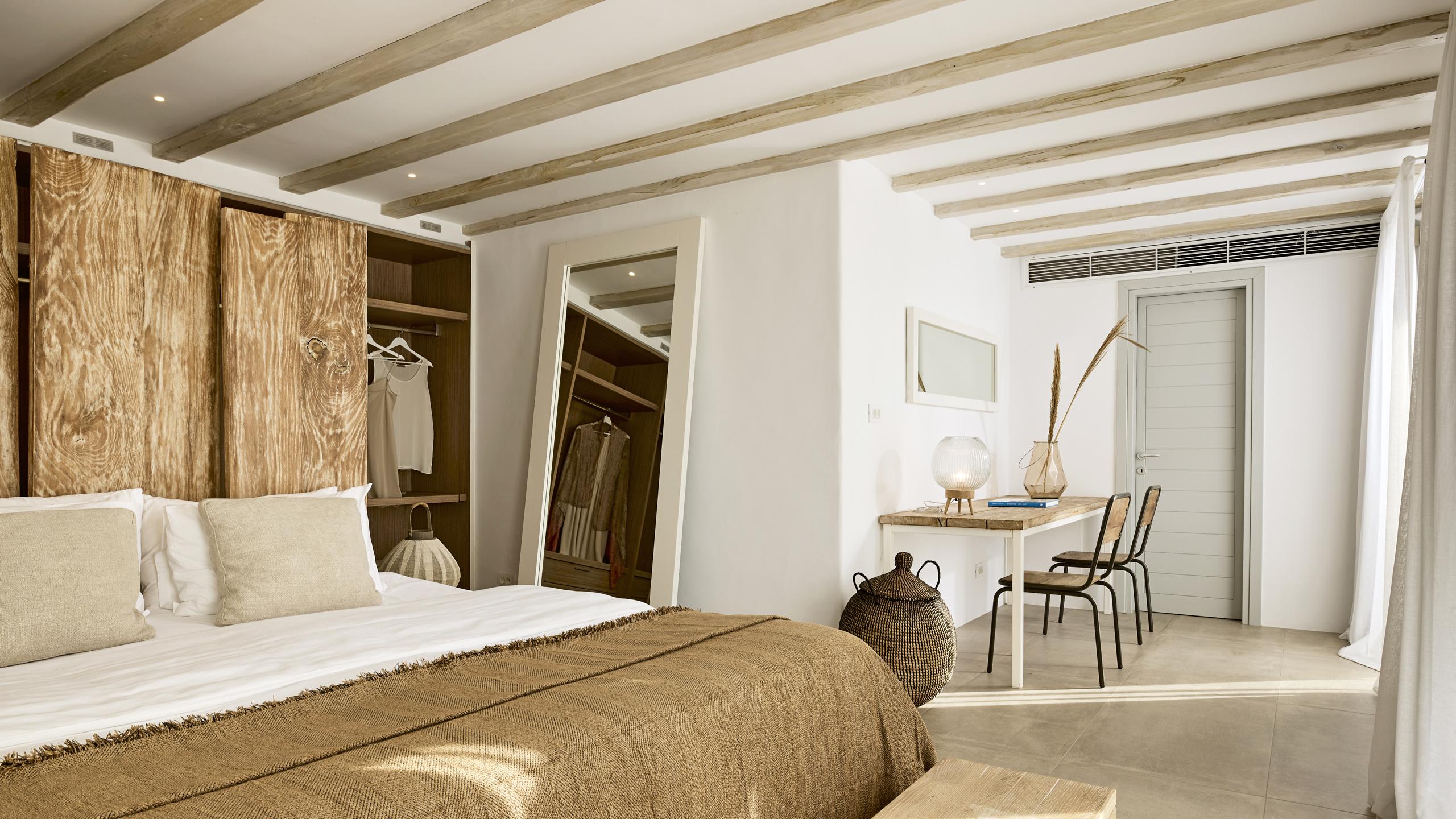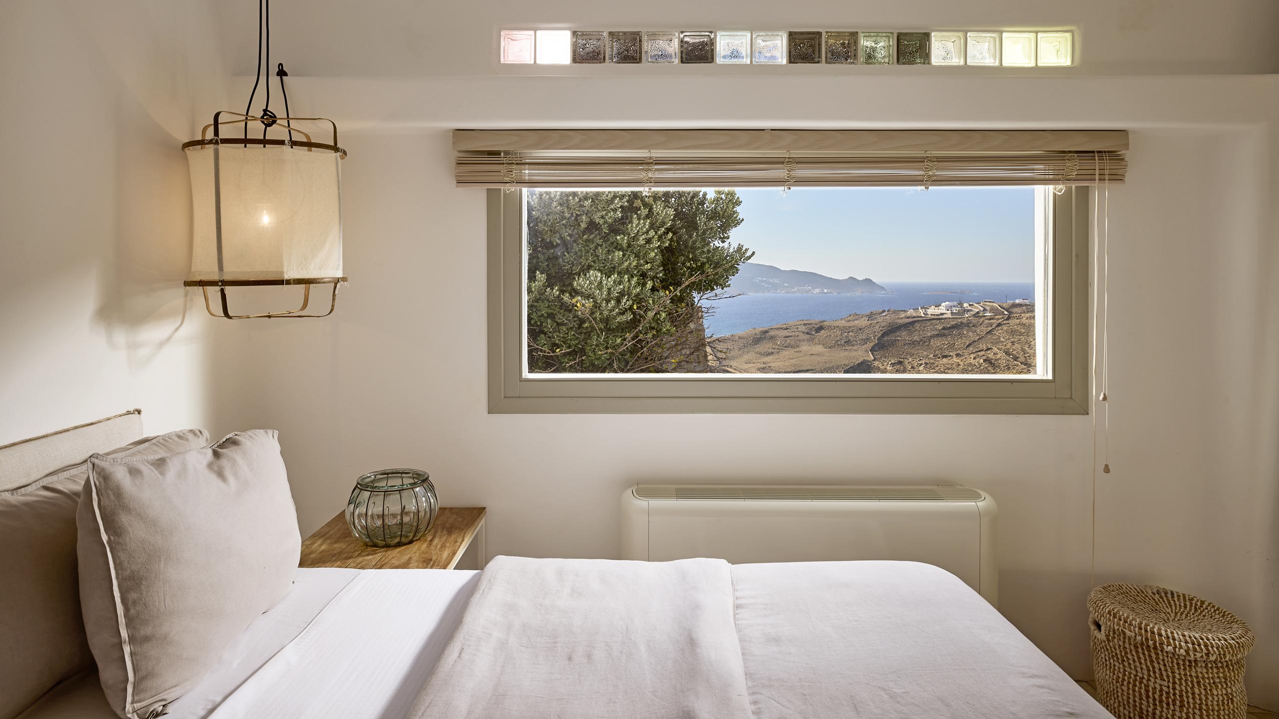 A remarkable attention to details is evident throughout the indoor spaces of Ftelia Hideaway. Each room is appointed with style, each piece of furniture was carefully chosen to contribute to an airy, elegant atmosphere. Modern amenities and domotics complete the picture, ensuring guests feel both pampered and entertained. For the ultimate relaxation experience a new hammam, massage room and small private gym were added to the property near the lower guest suite. True to Cycladic style the property was built in units, with some bedrooms having independent access for added privacy.
