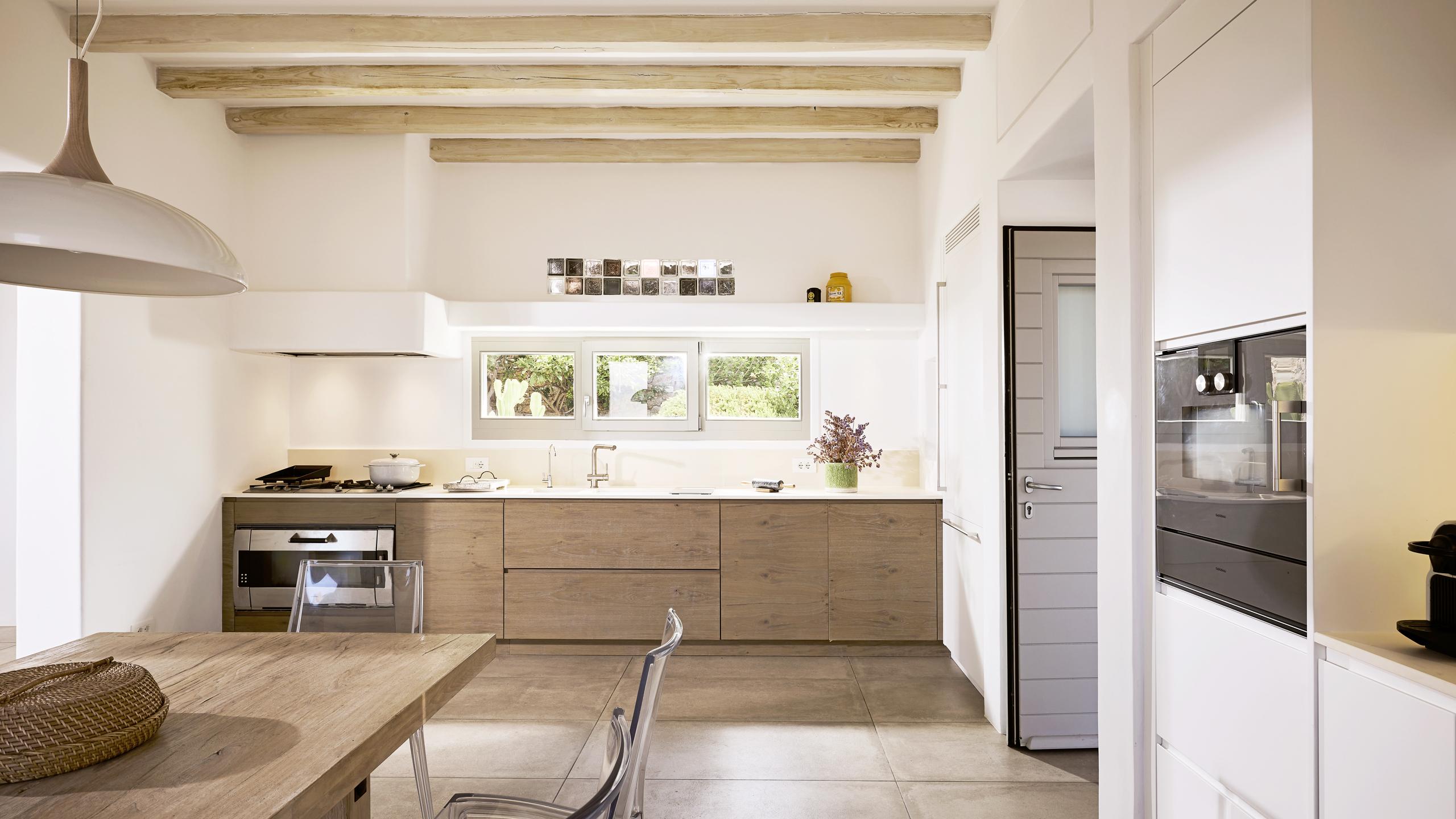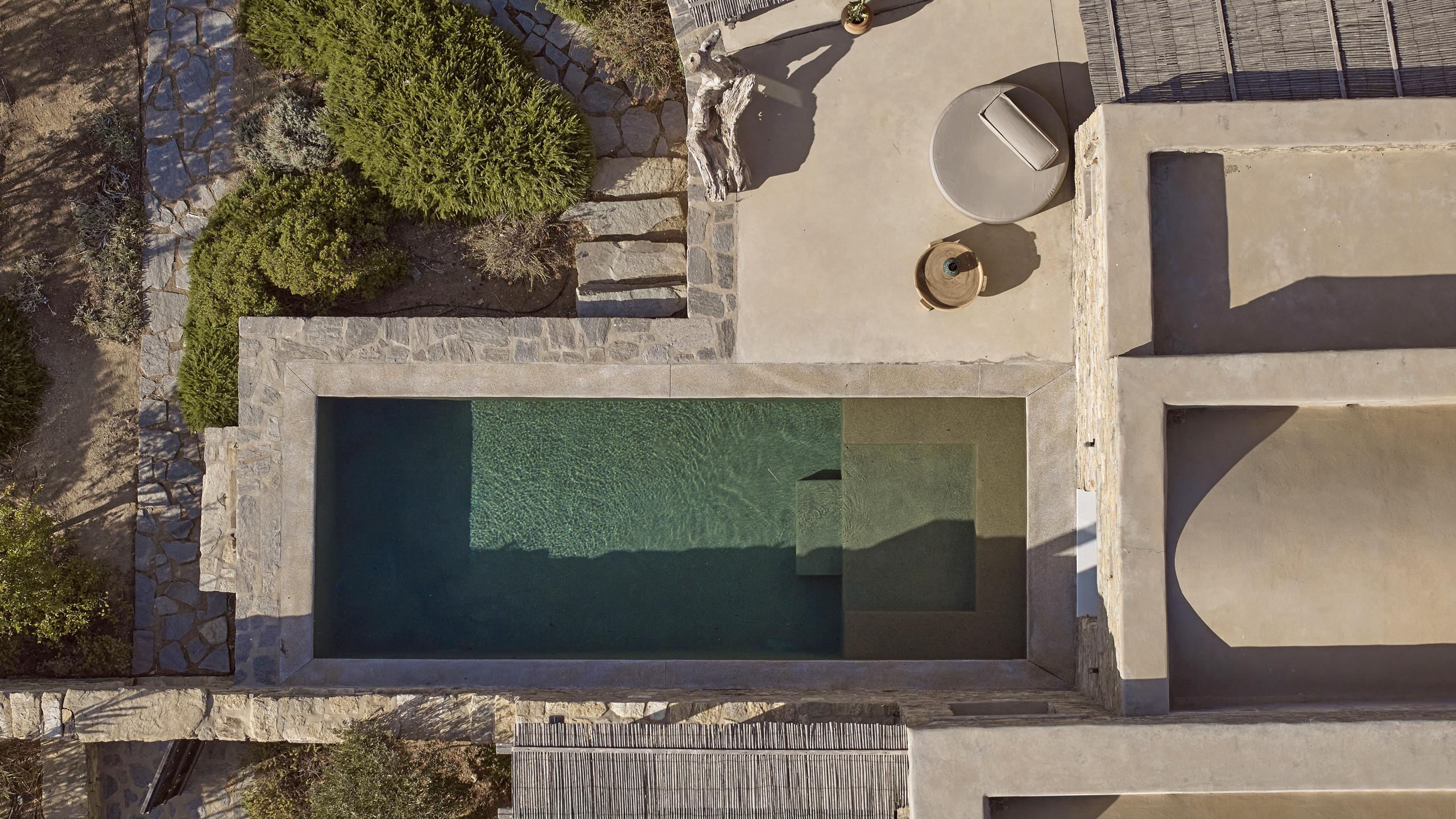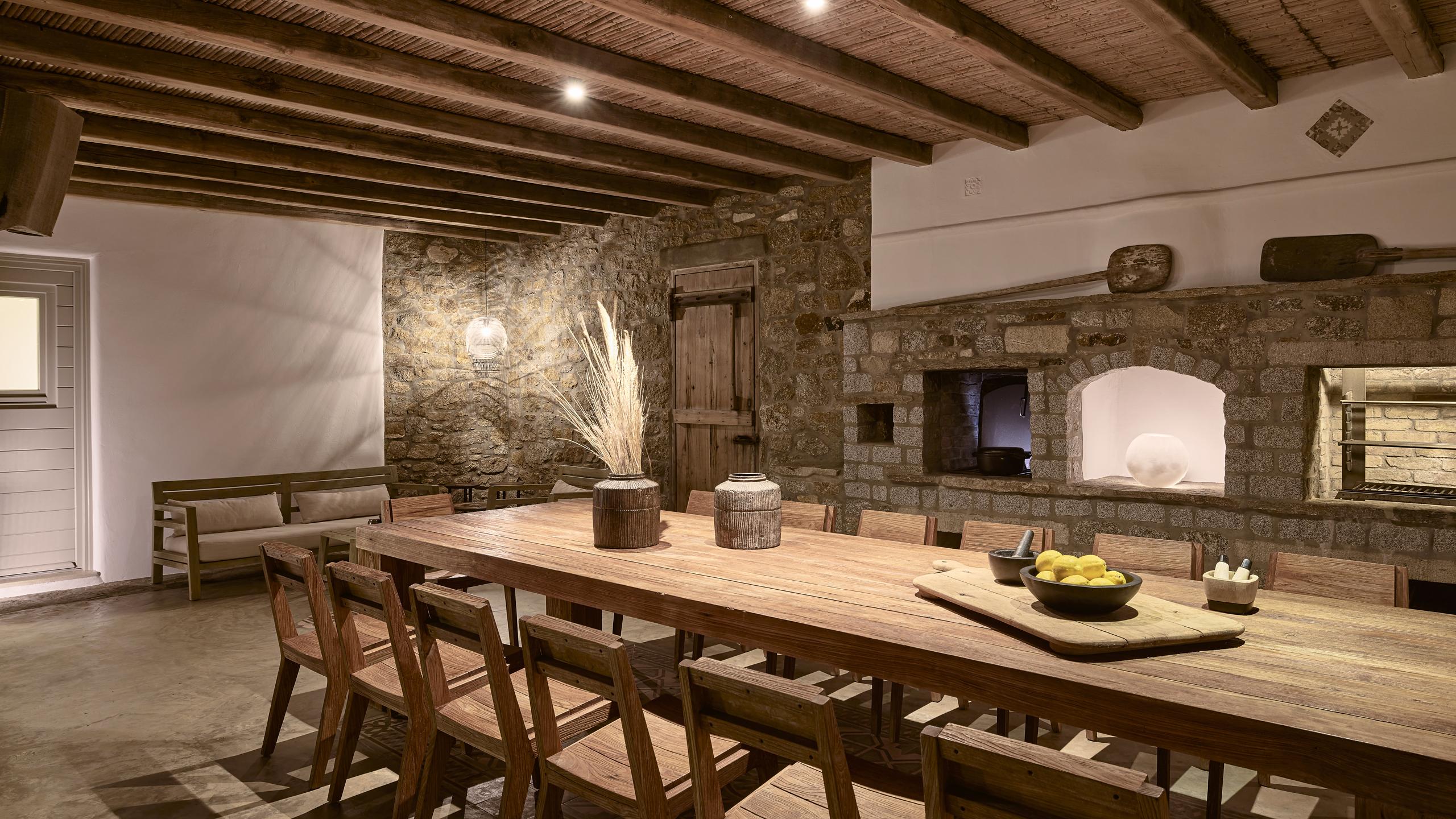 The outdoor areas all face towards the scenery allowing for views that stretch out over the countryside and the turquoise waters of Ftelia bay. A grand pergola covers the outdoor dining area equipped with a wood-fire oven and large BBQ in order to cater to any culinary taste. The main pool is located a few steps down and makes the most of the view. The contact with the element of water is a redundant theme of the outdoor spaces as, in addition to the main pool, a built-in Jacuzzi tub was conceived on the lower terrace and a plunge pool was just recently built adjacent to the lower guest suite.
