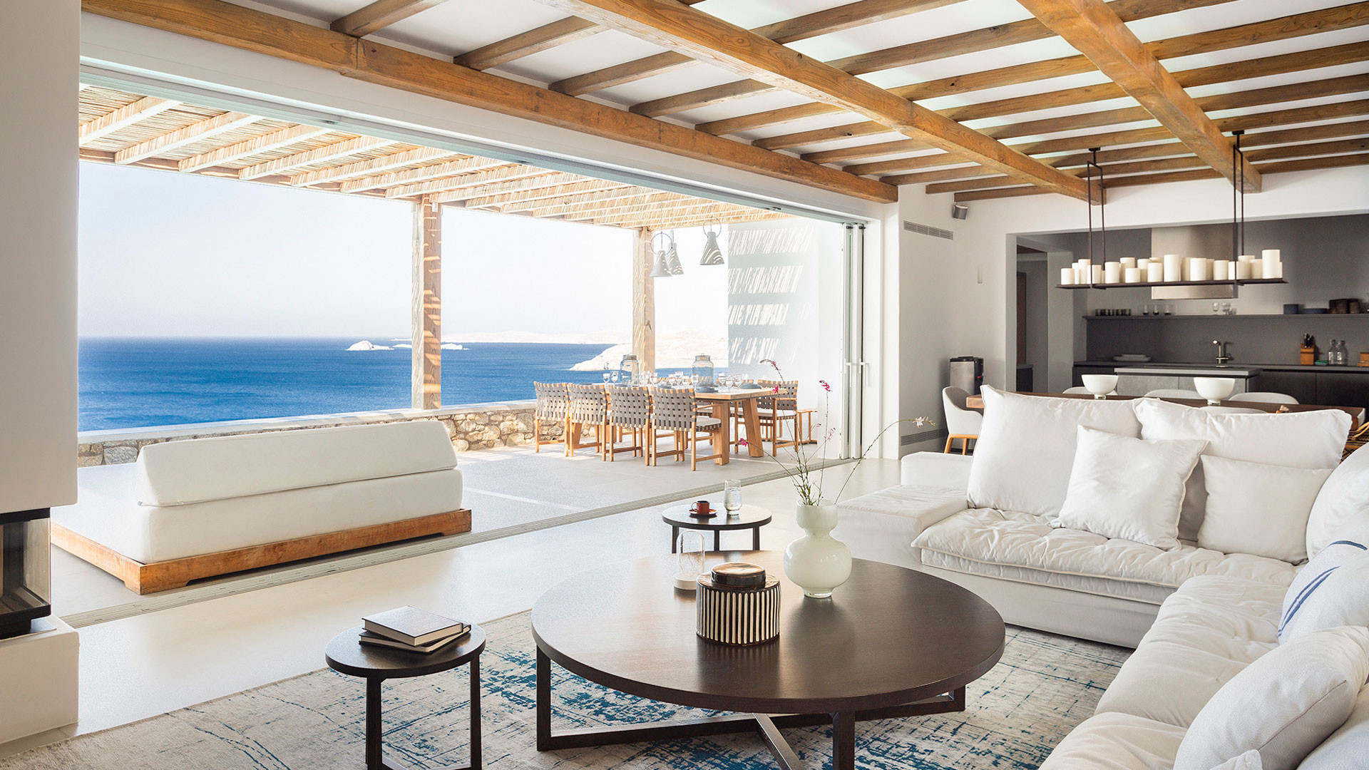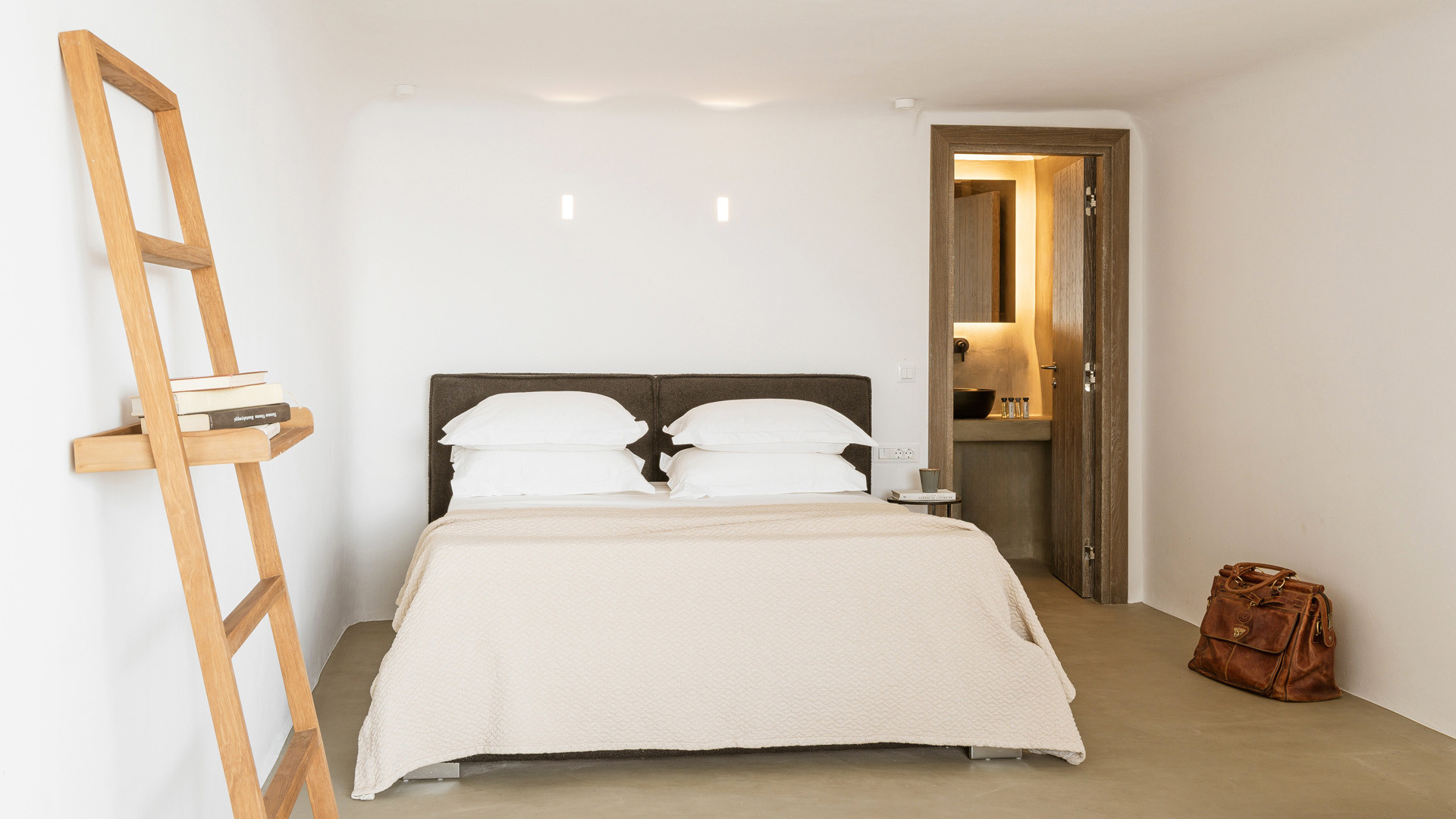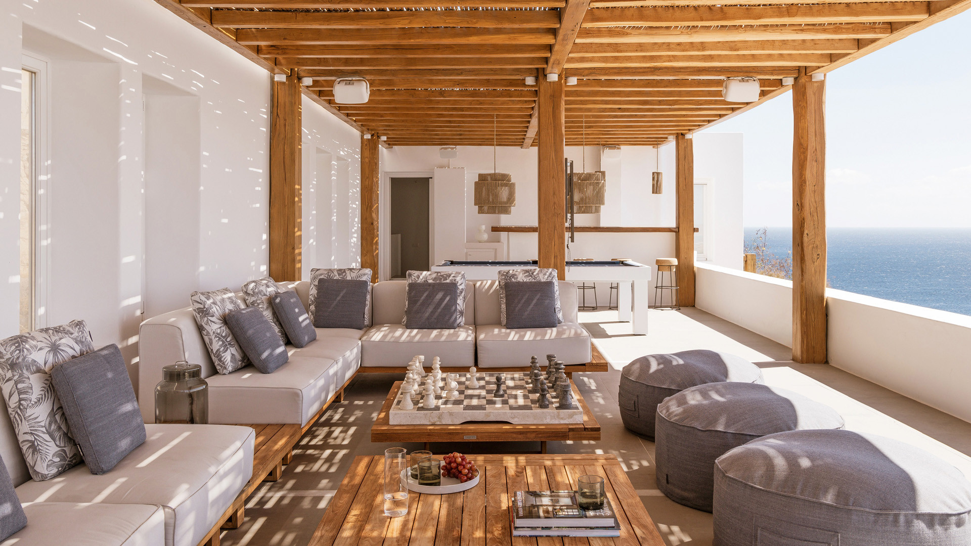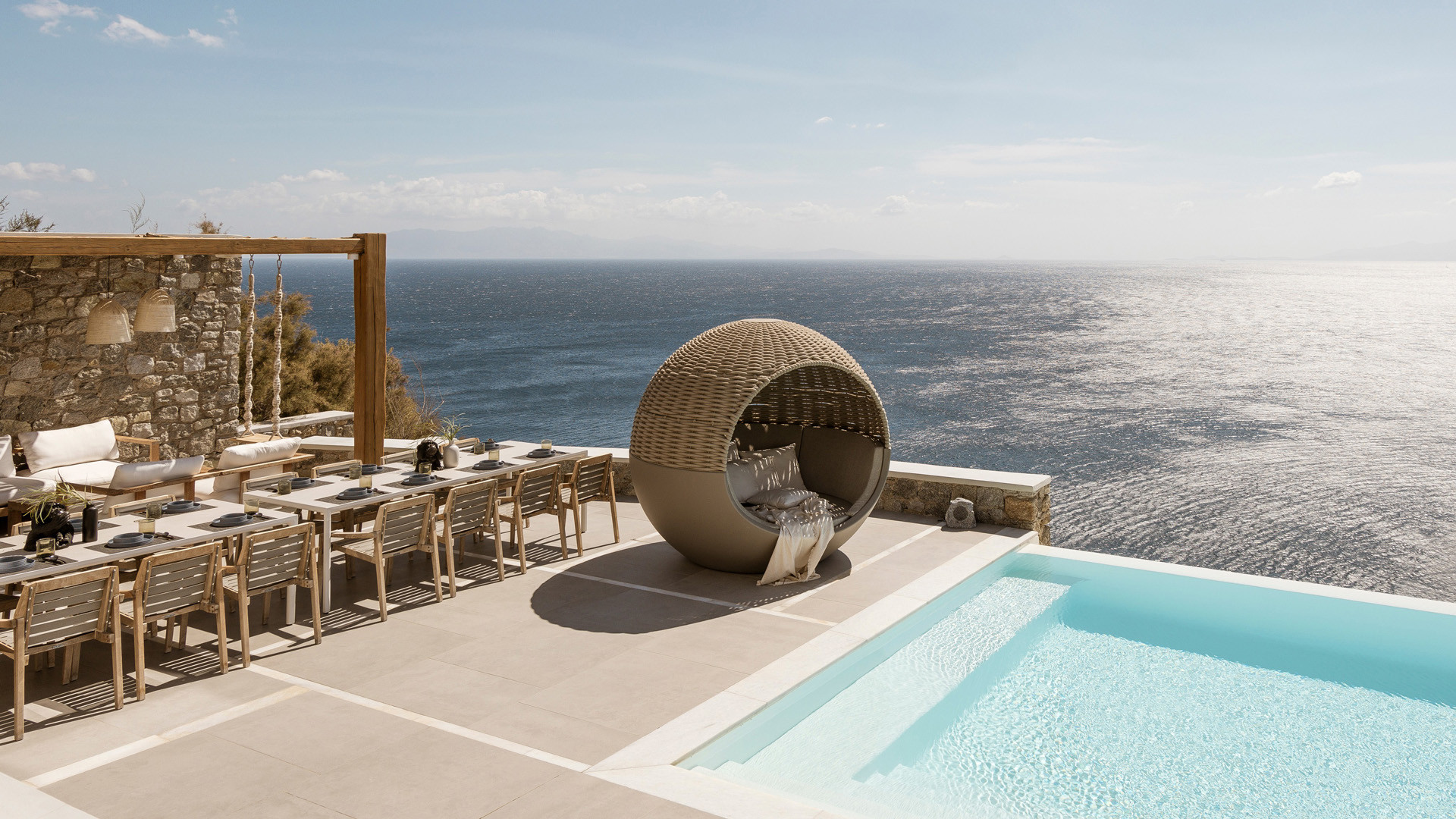 The architecture is in a Cycladic style revisited with a contemporary eye. The building, with its classic white walls, is spread over three distinct levels. The upper level hosts a pleasant covered dining area connected to the interior, while the lower level features the inviting infinity pool.