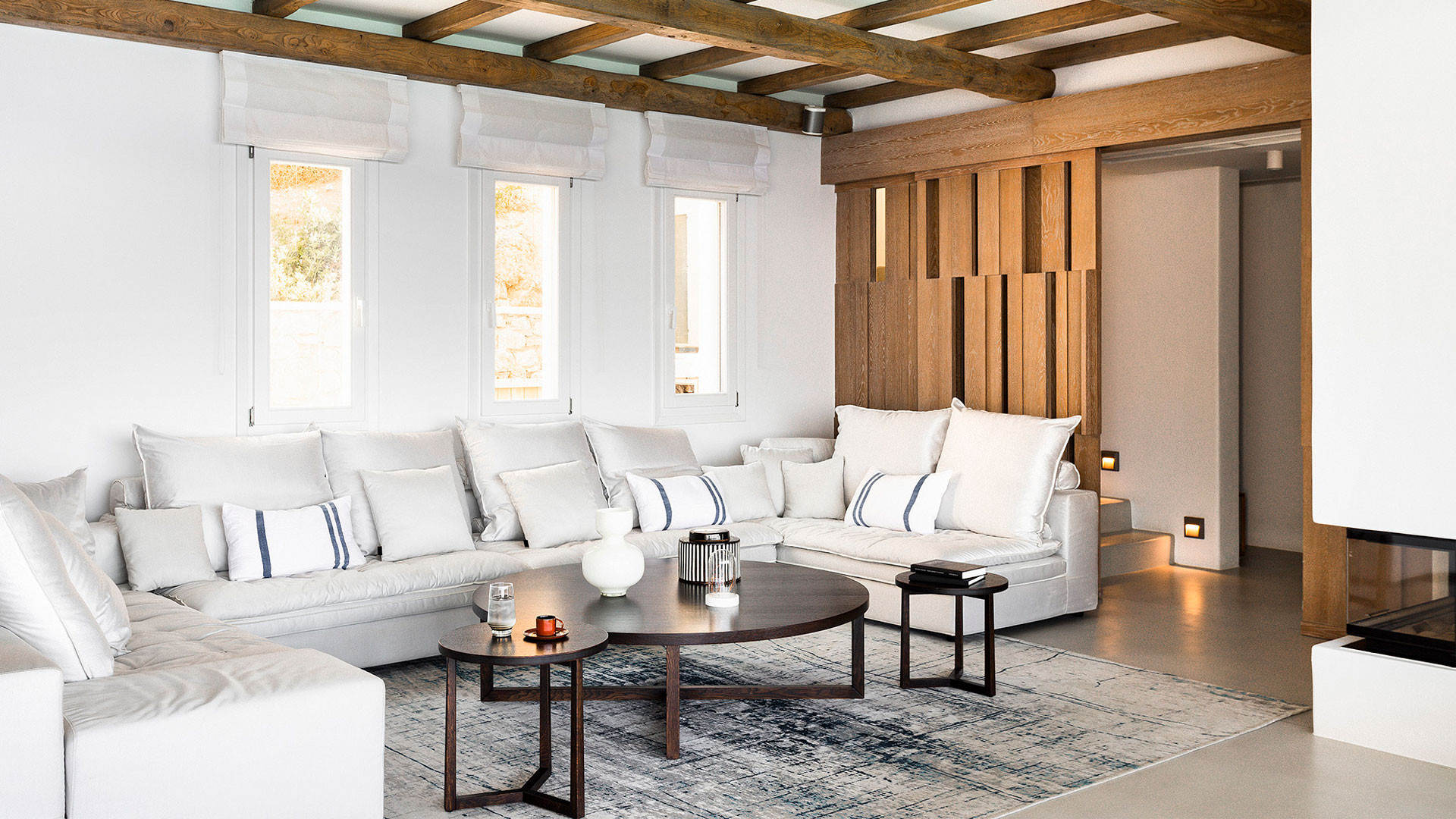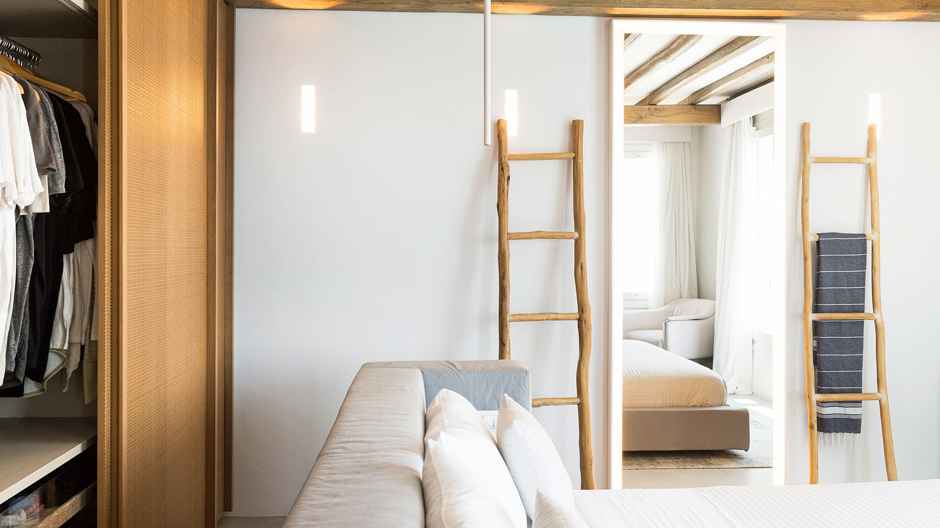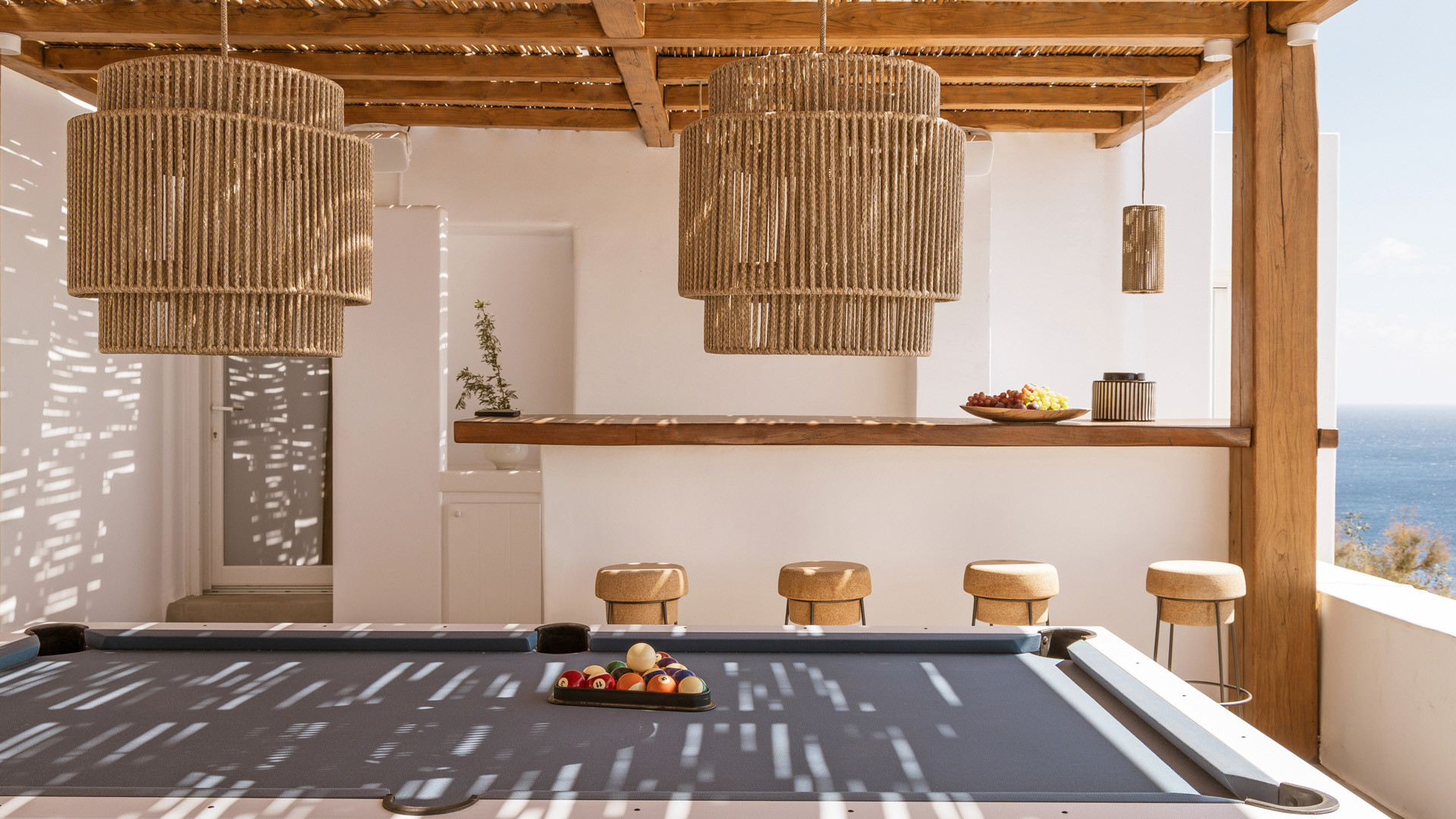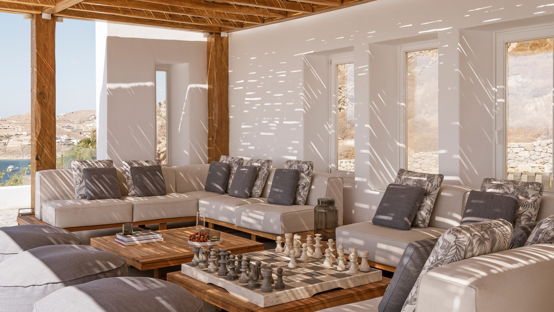 The architecture is in a Cycladic style revisited with a contemporary eye. The building, with its classic white walls, is spread over three distinct levels. The upper level hosts a pleasant covered dining area connected to the interior, while the lower level features the inviting infinity pool.