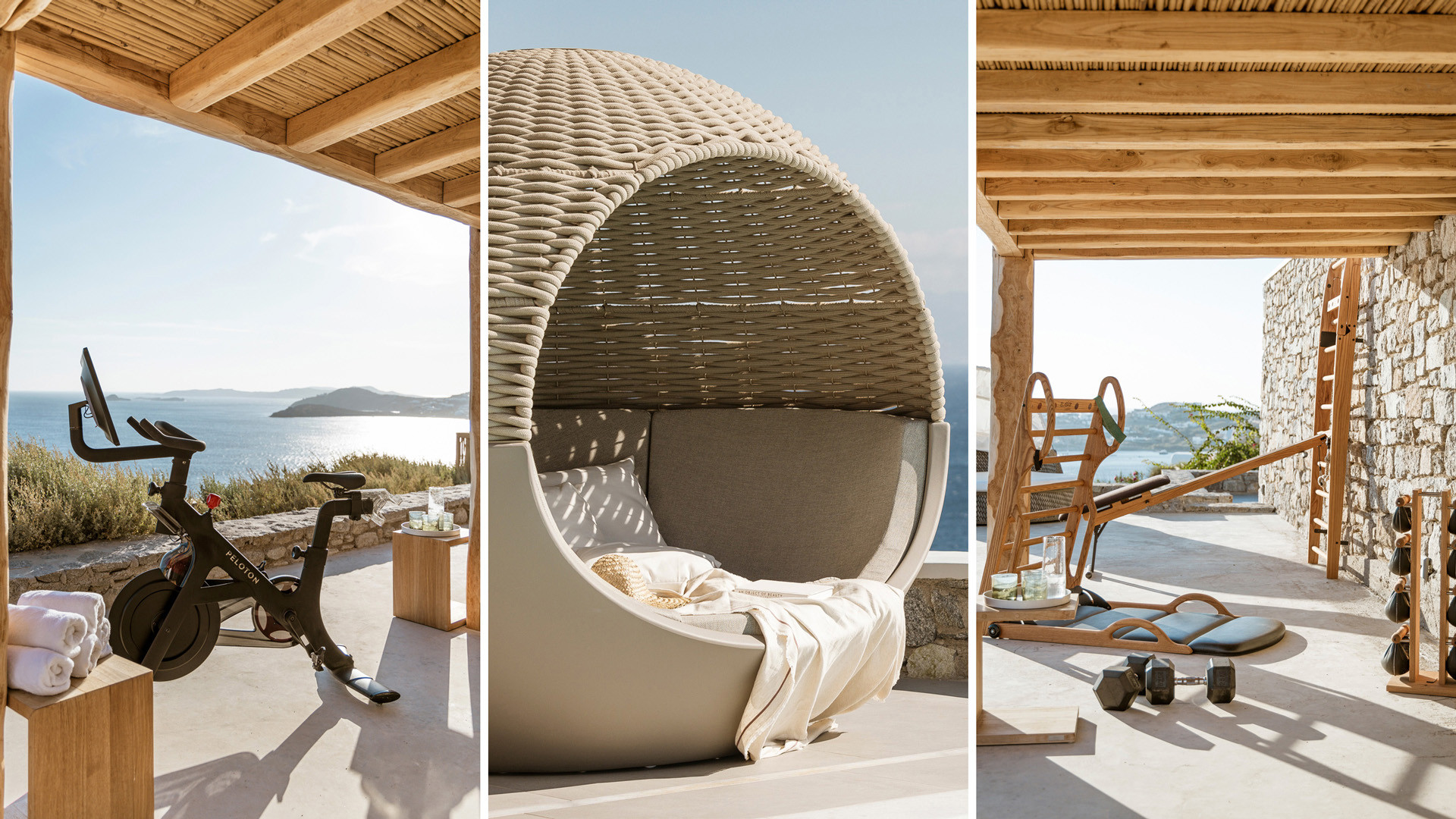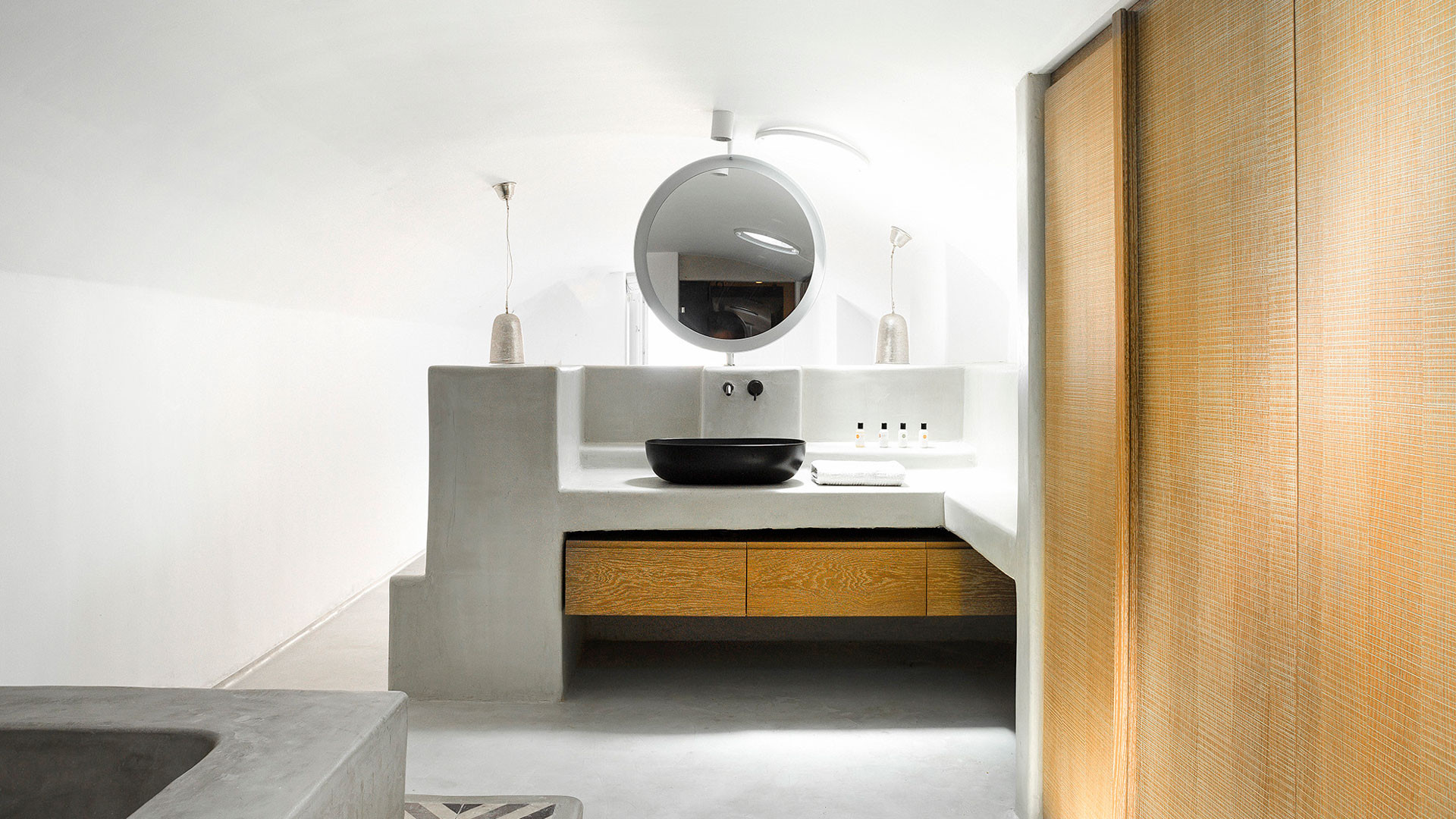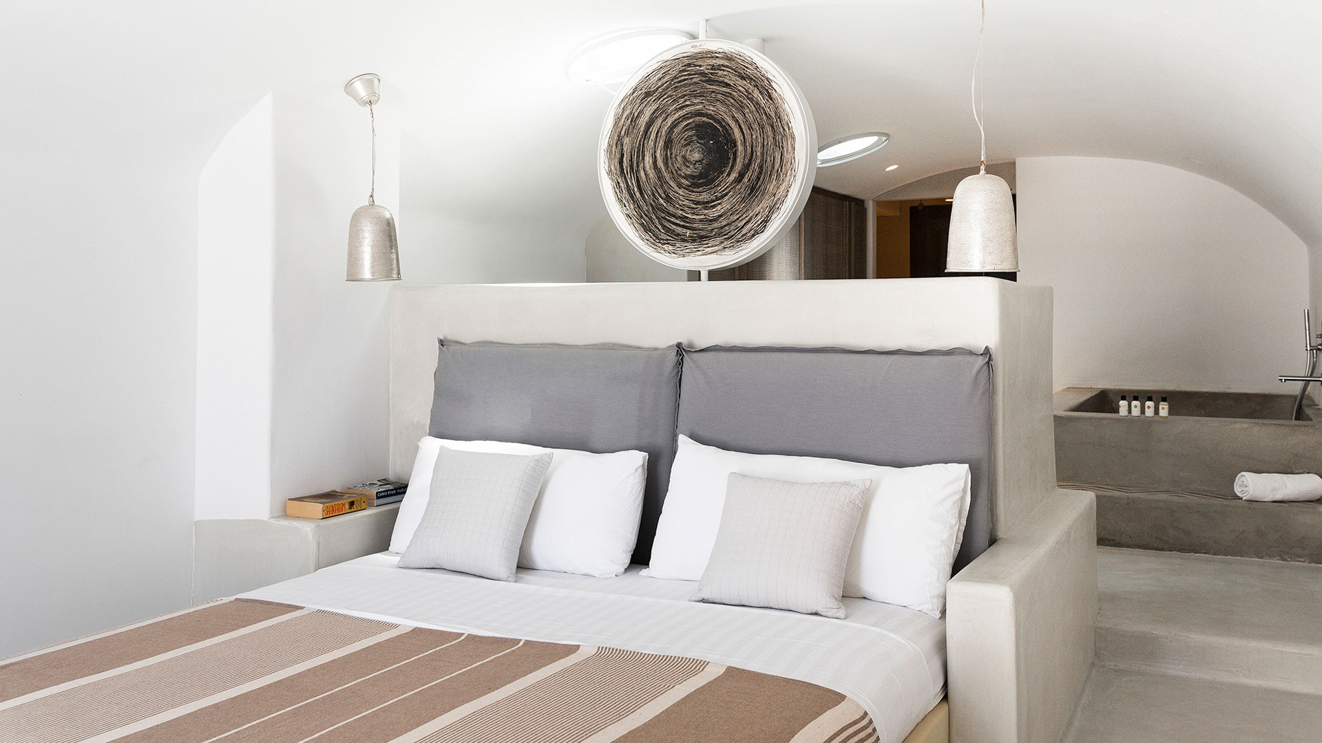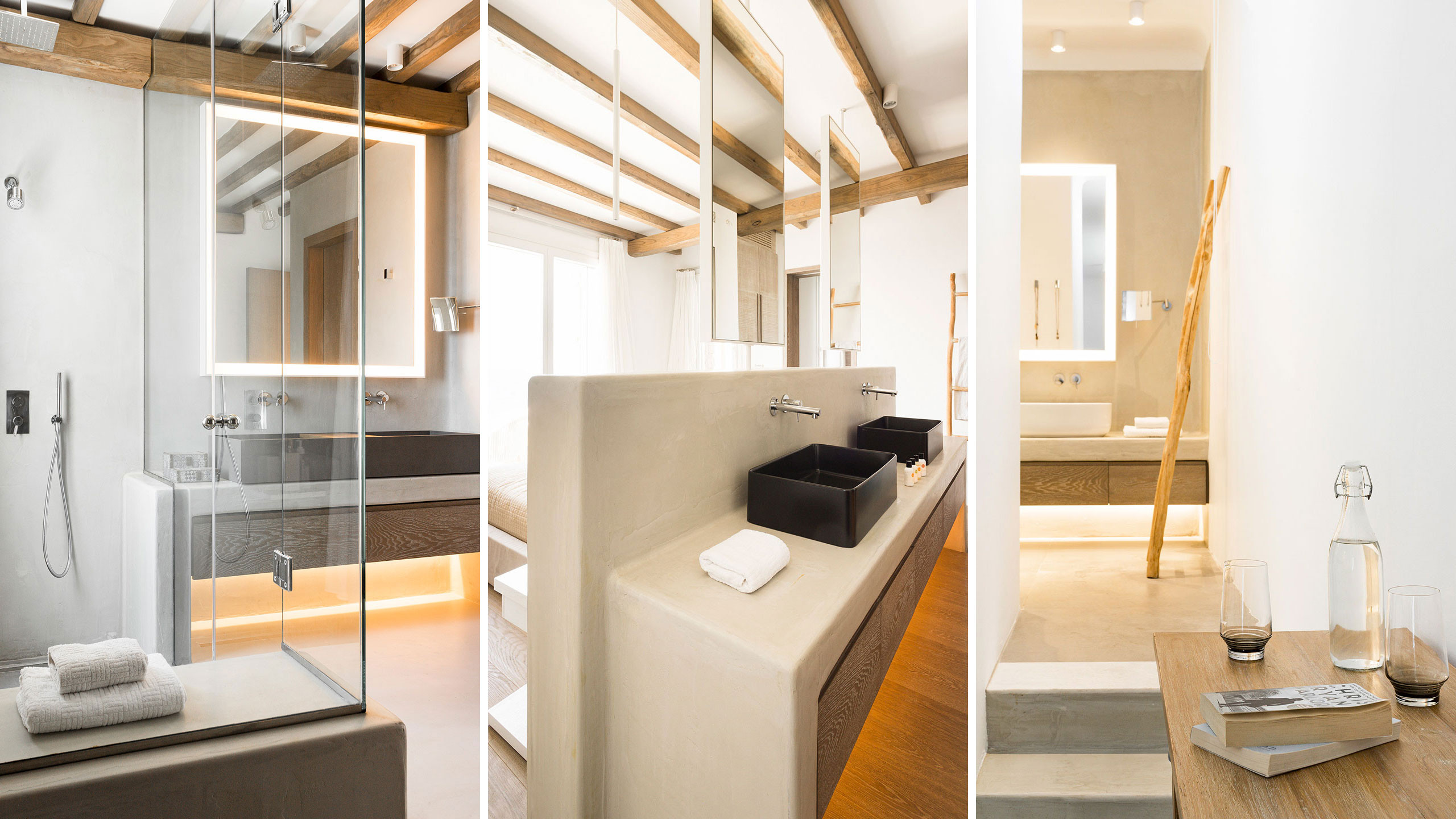 The architecture is in a Cycladic style revisited with a contemporary eye. The building, with its classic white walls, is spread over three distinct levels. The upper level hosts a pleasant covered dining area connected to the interior, while the lower level features the inviting infinity pool.