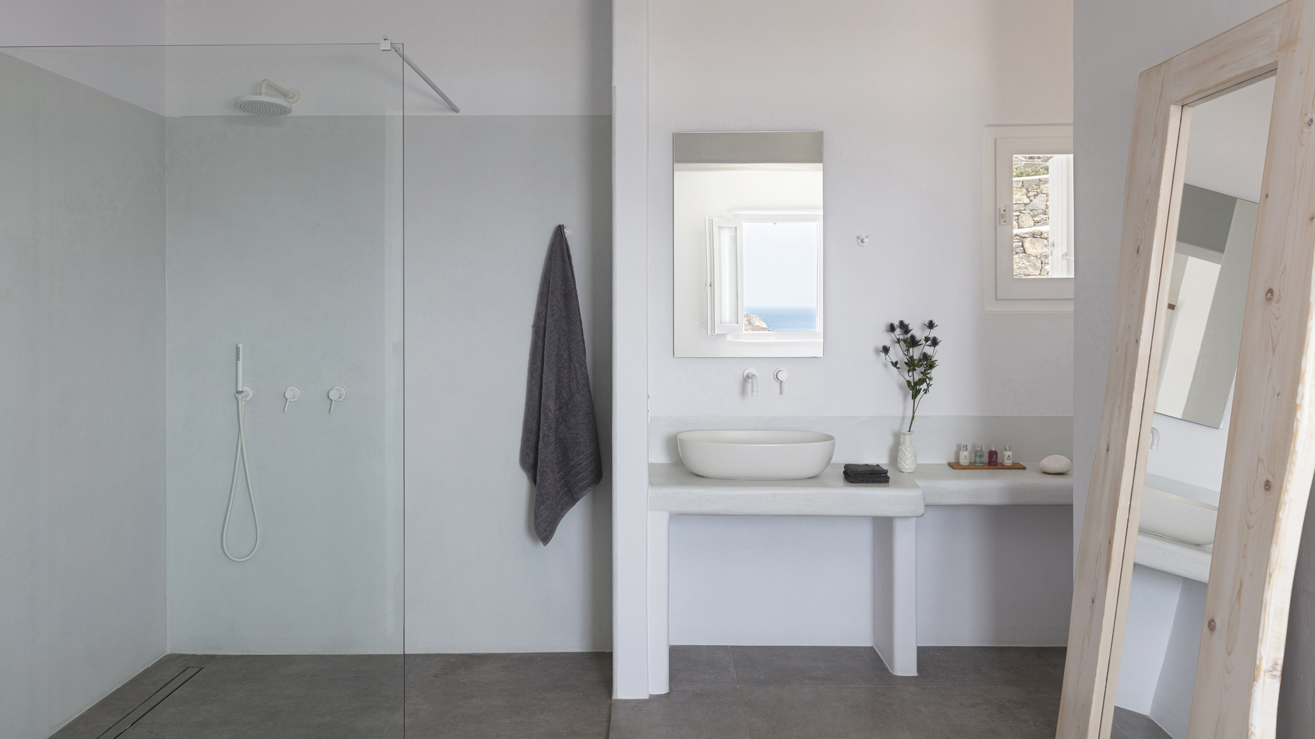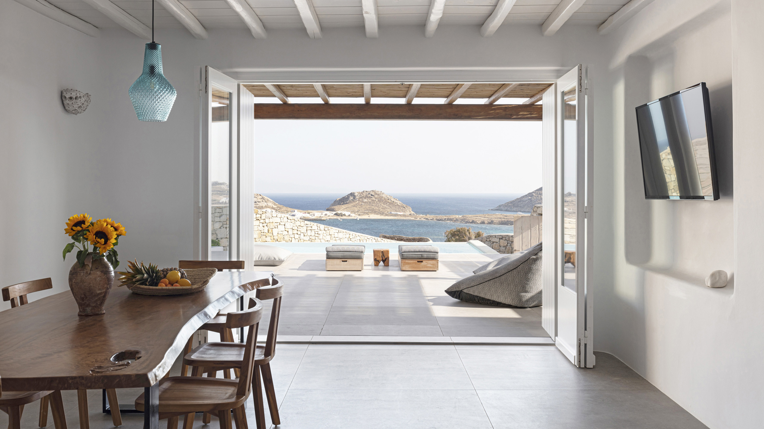 The outdoor area is simple and functional, with the ever-present infinity pool in the front and a pleasant dining area at the rear, all in favor of a magnificent view of the sea and the beach below.