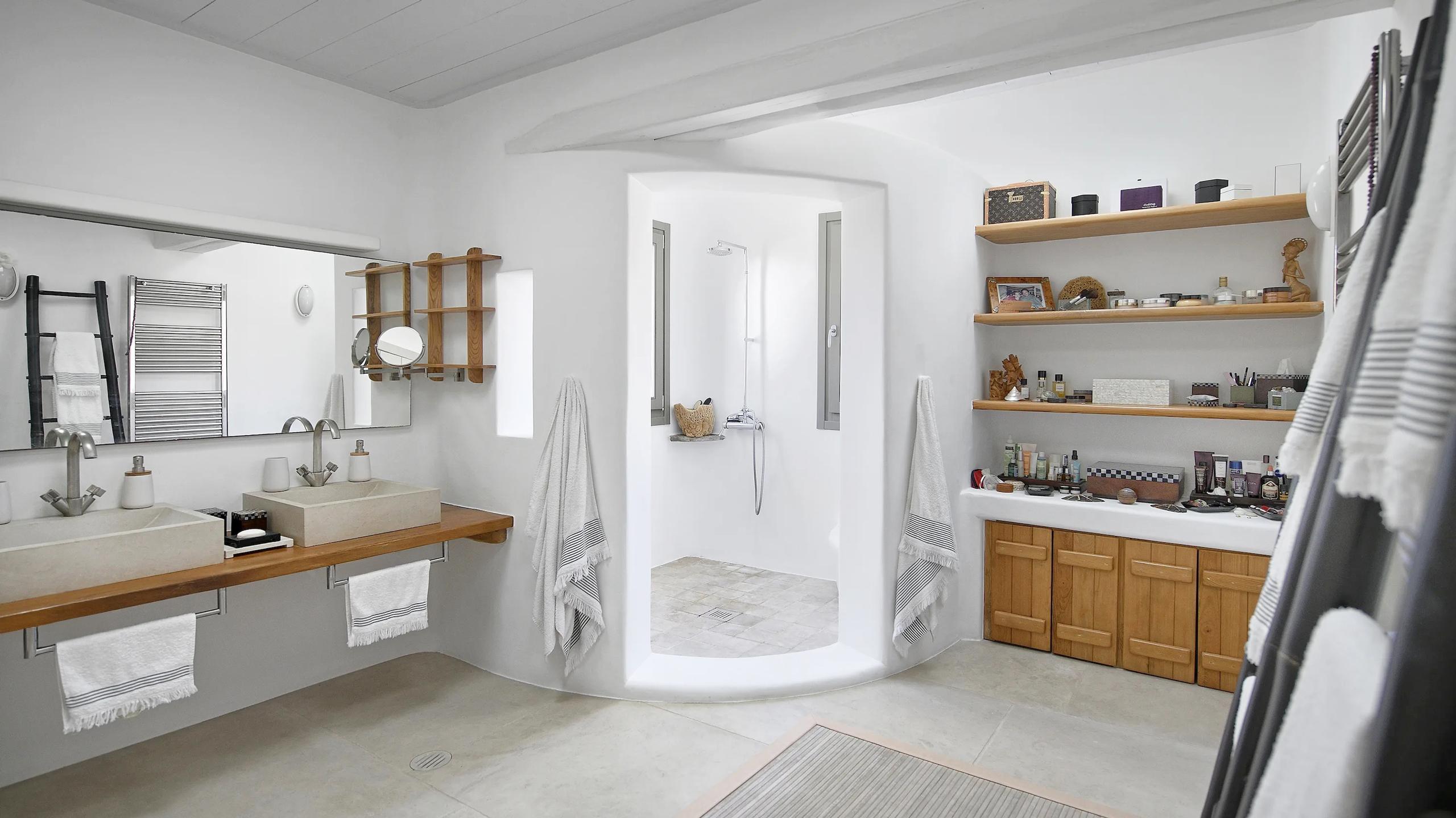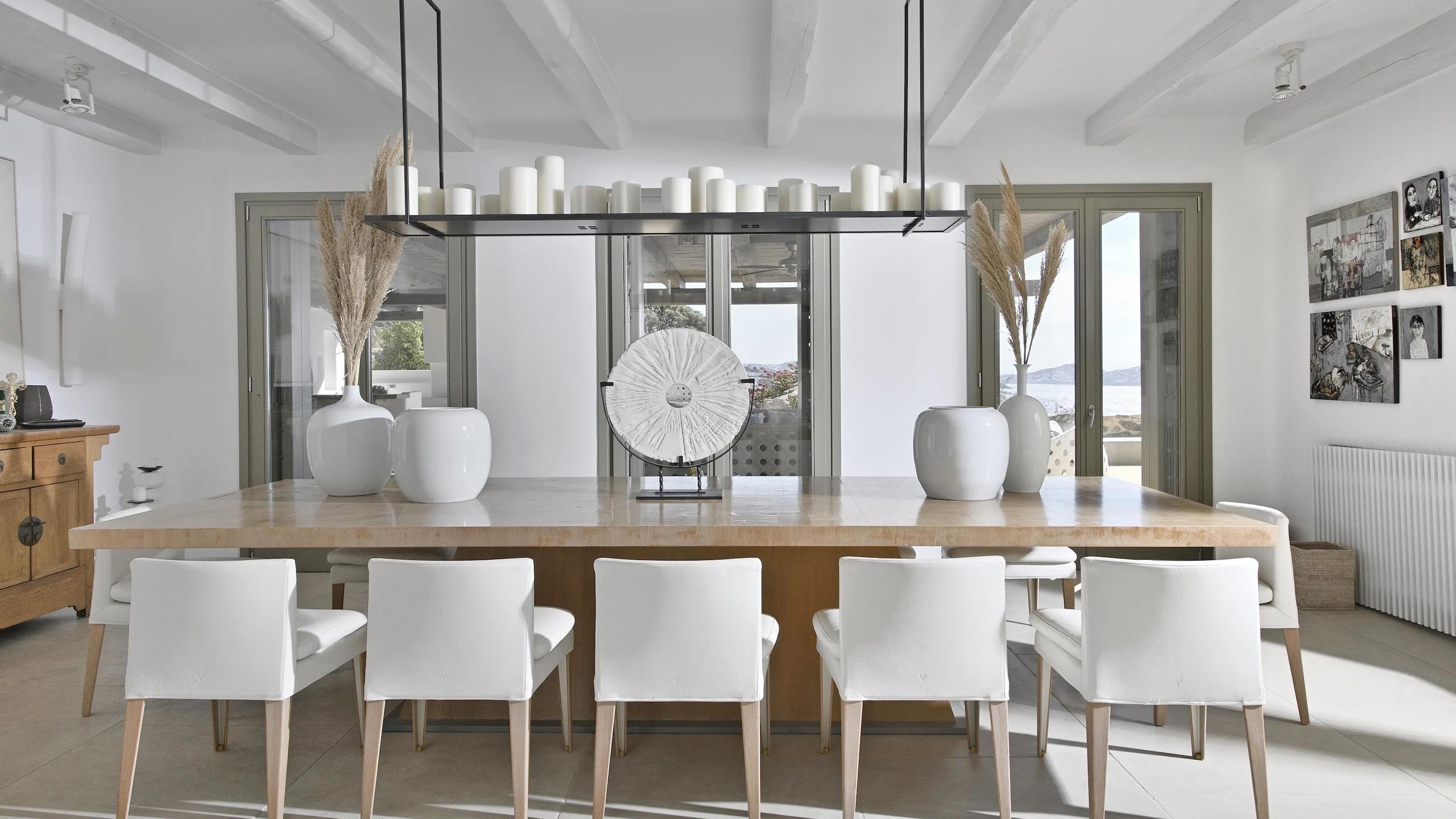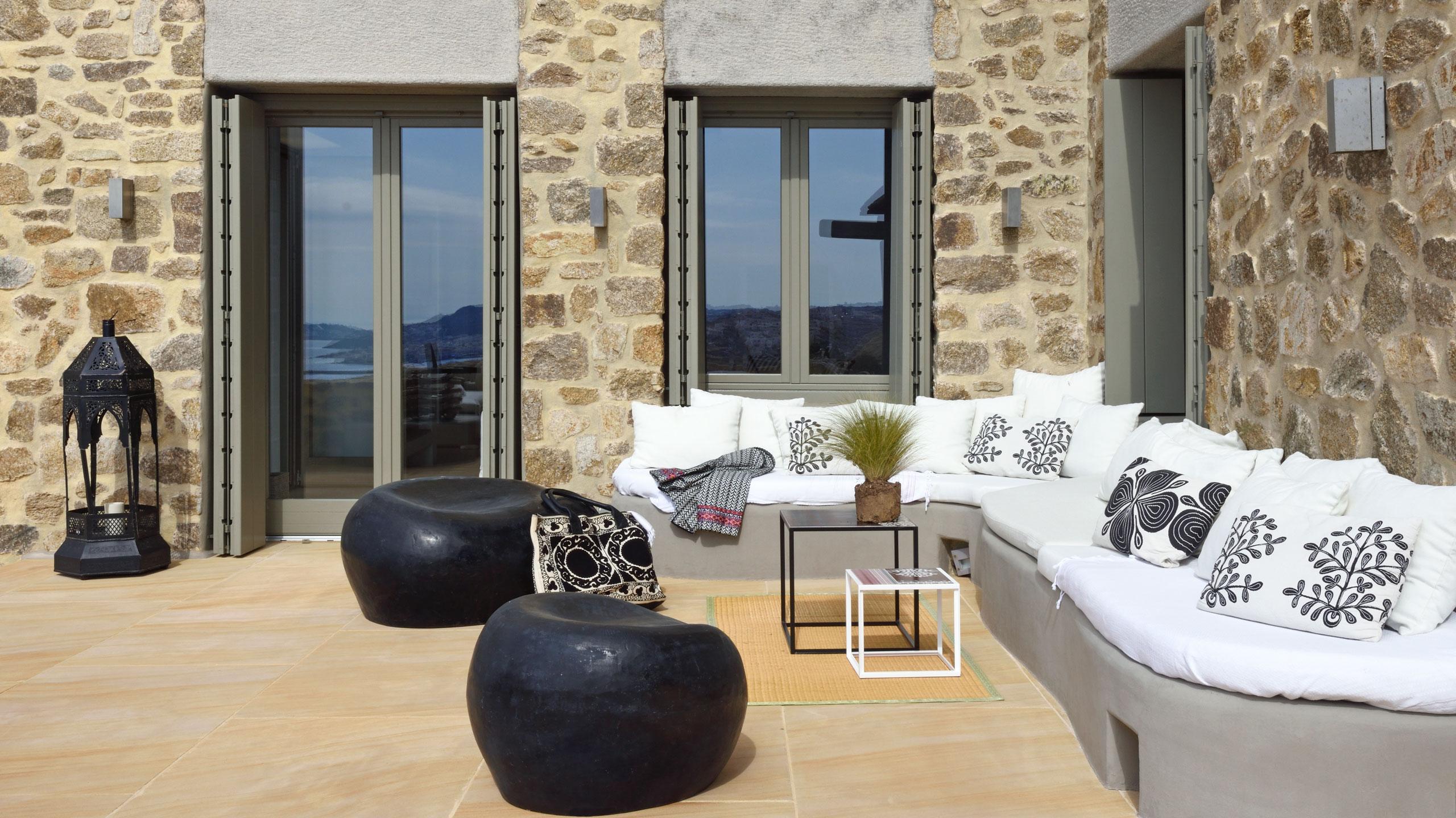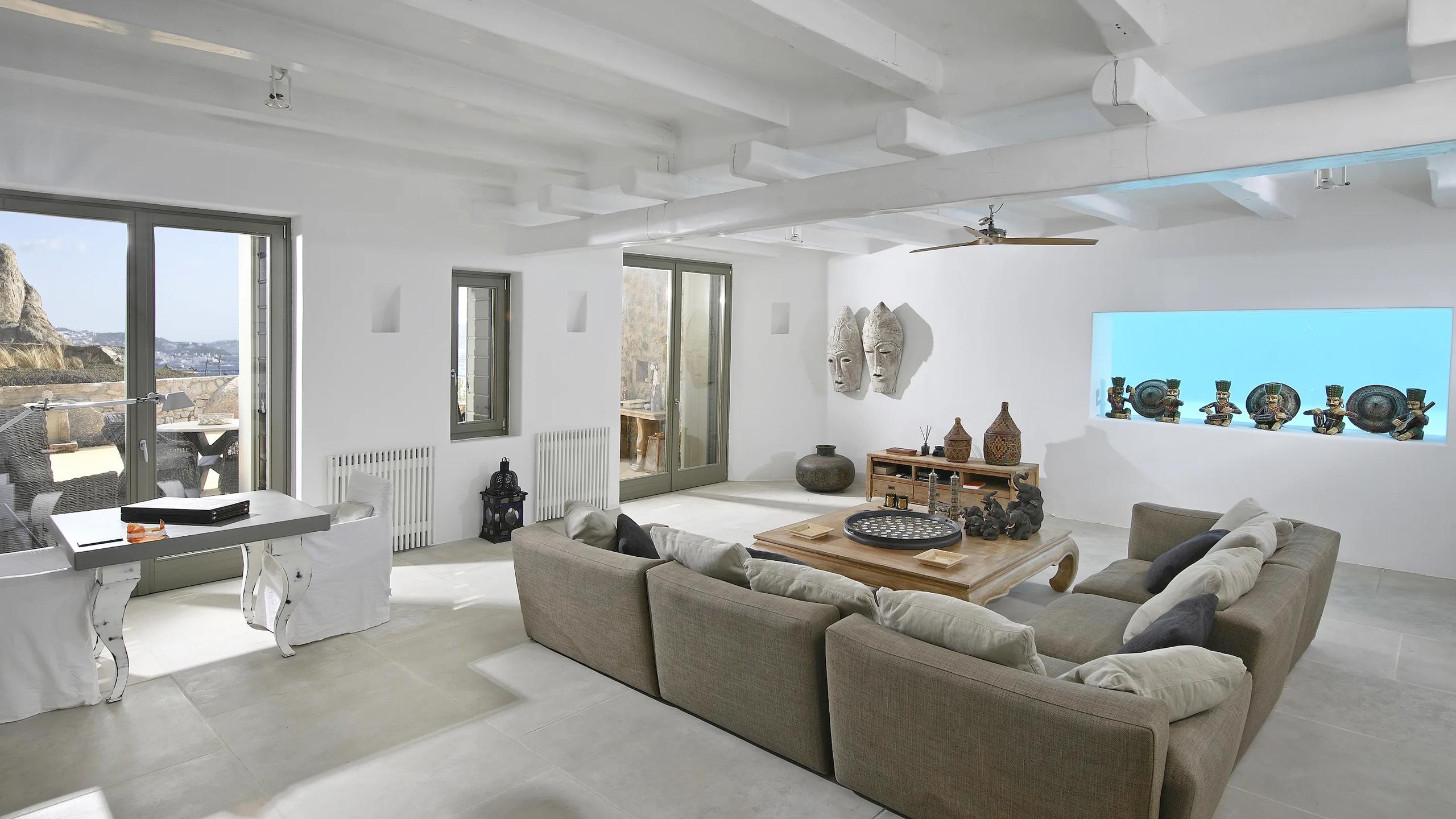 The overall decor is a classic tribute to Myconian style, with a dominance of white surfaces, stone inserts, and white-washed wooden beam ceilings. This concept is perfectly balanced with a refined taste for signature design furniture and for artefacts or ideas (see the fountain on the lower level) deriving from the owners’ love for travel. The end result is a unique blend of style and tradition that gives a chic vibe to all the indoor spaces.