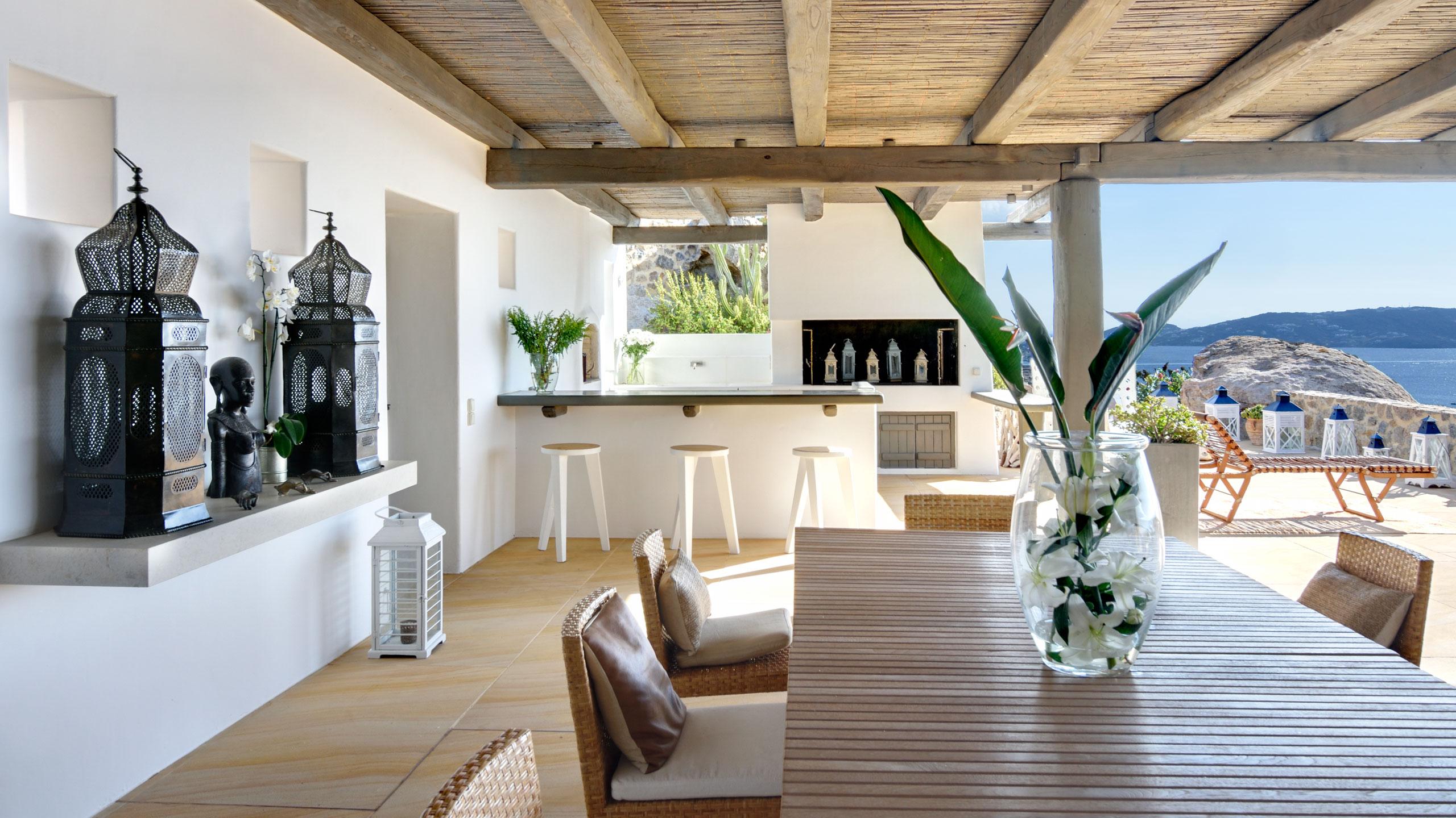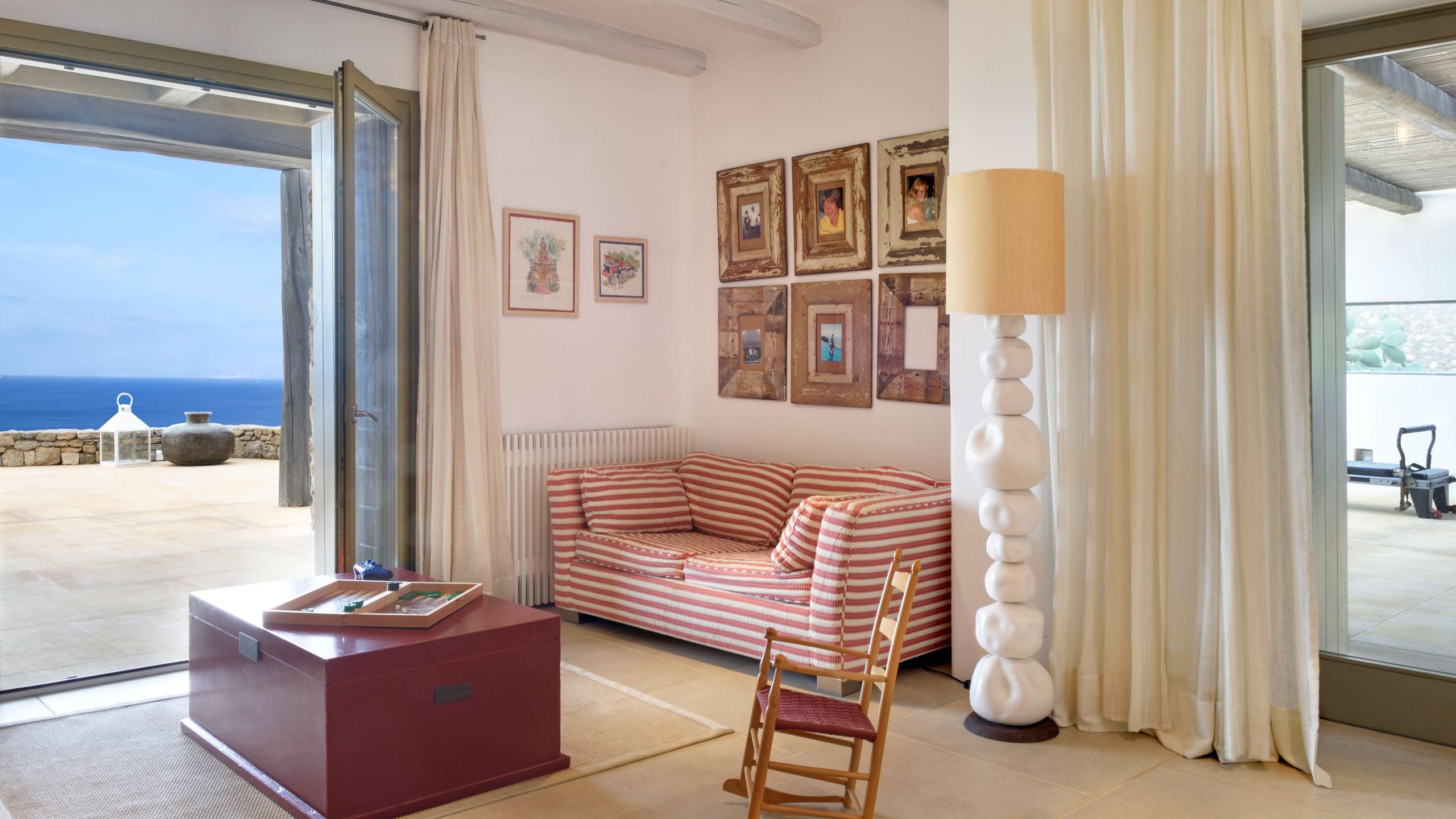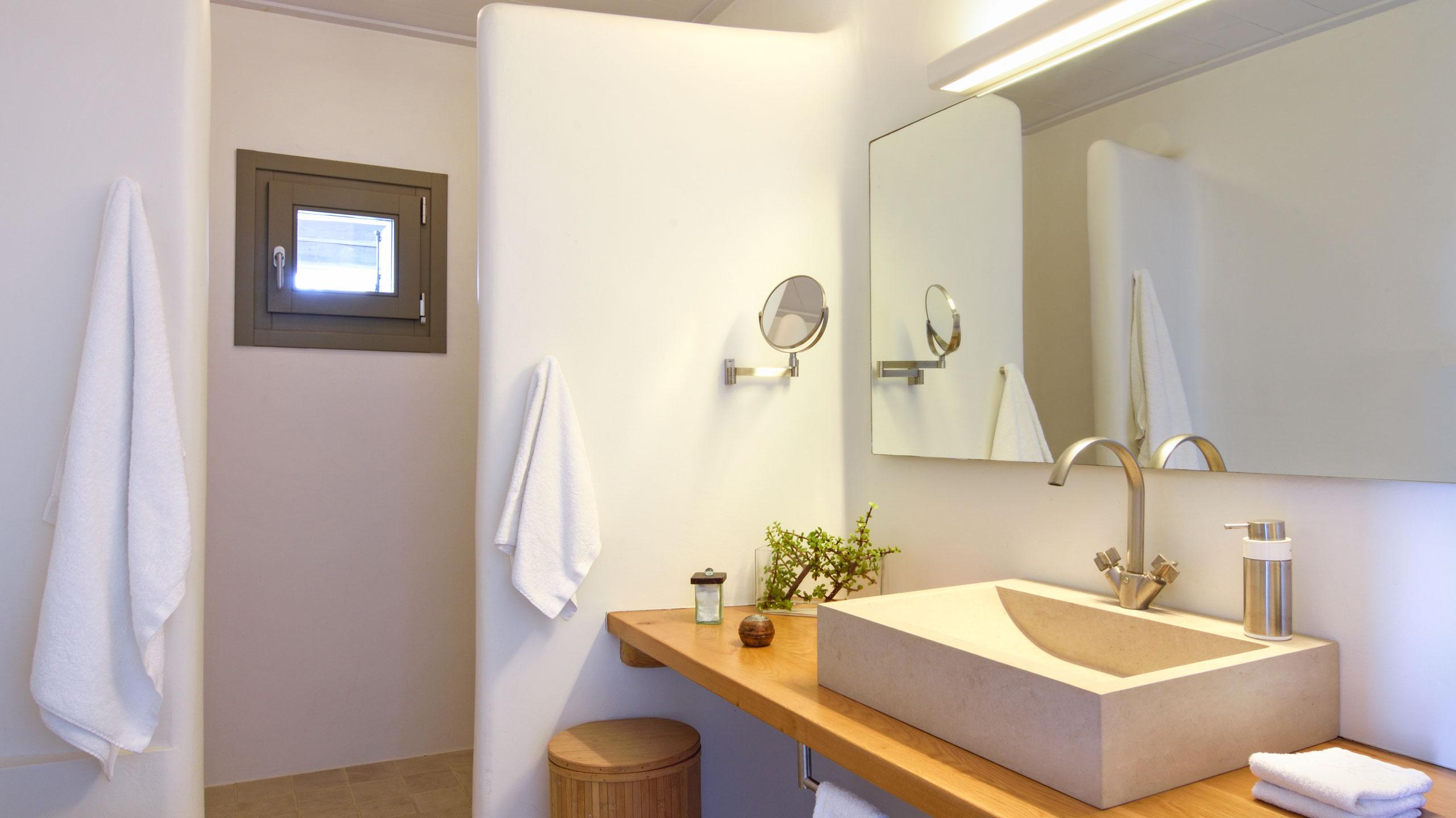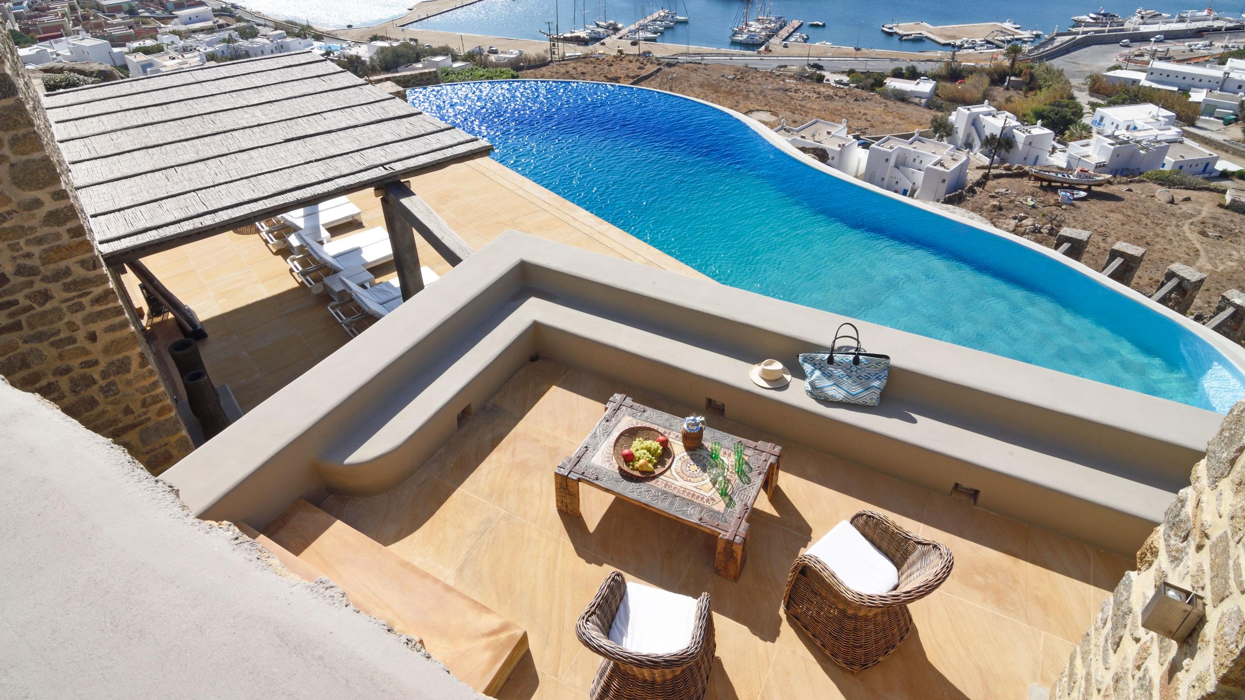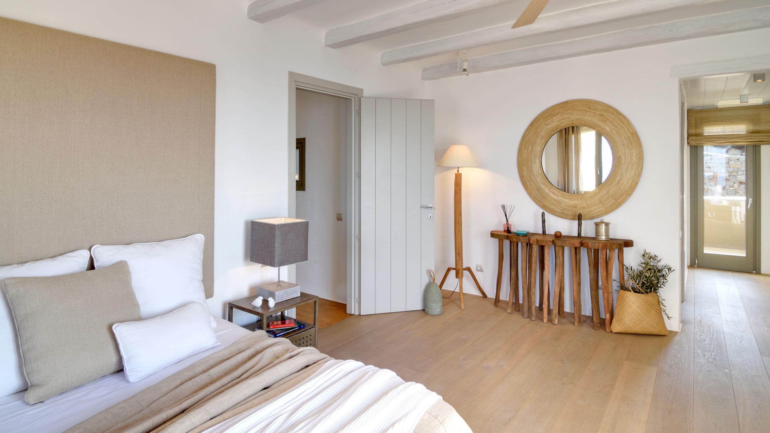 The overall decor is a classic tribute to Myconian style, with a dominance of white surfaces, stone inserts, and white-washed wooden beam ceilings. This concept is perfectly balanced with a refined taste for signature design furniture and for artefacts or ideas (see the fountain on the lower level) deriving from the owners’ love for travel. The end result is a unique blend of style and tradition that gives a chic vibe to all the indoor spaces.