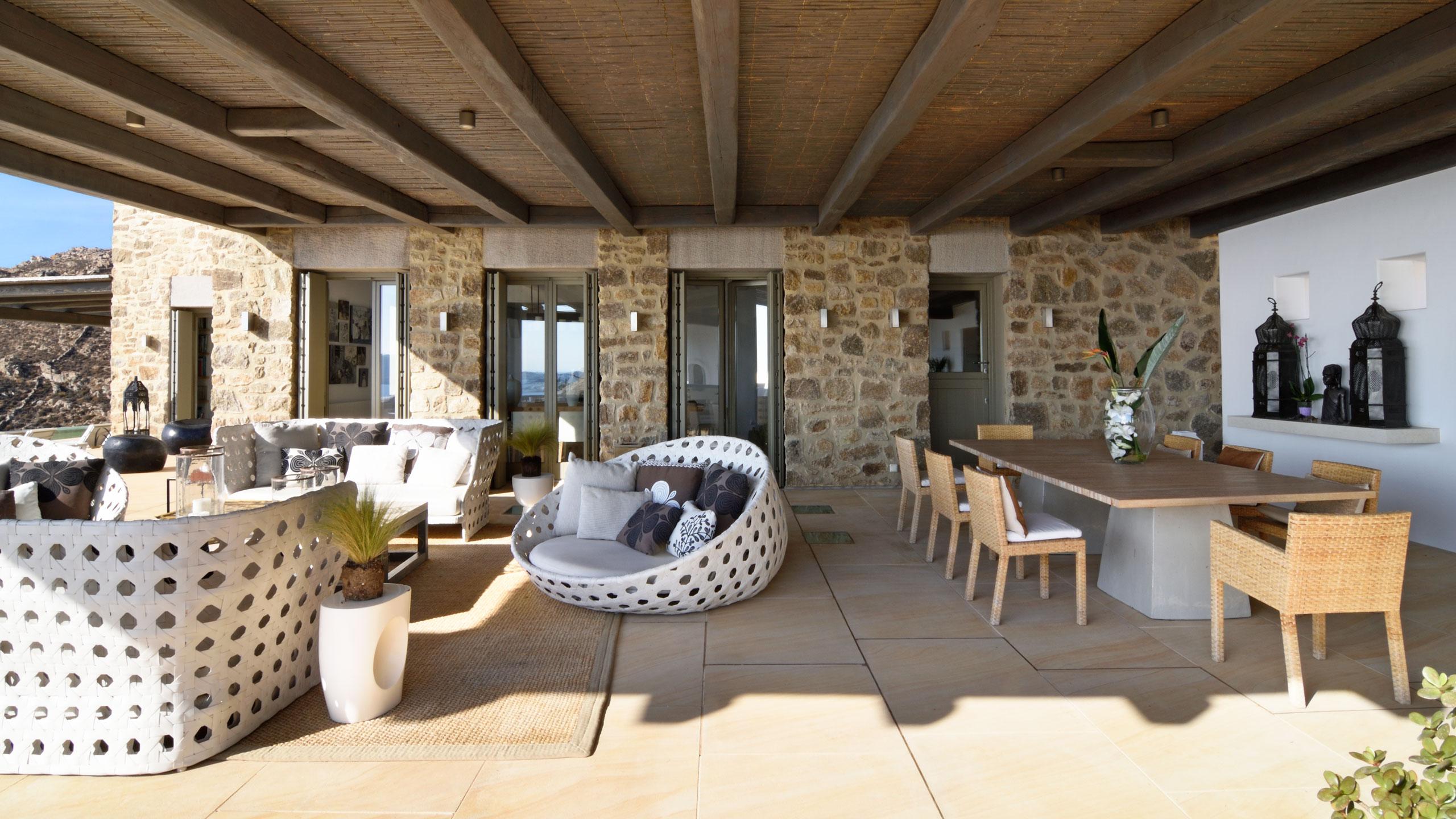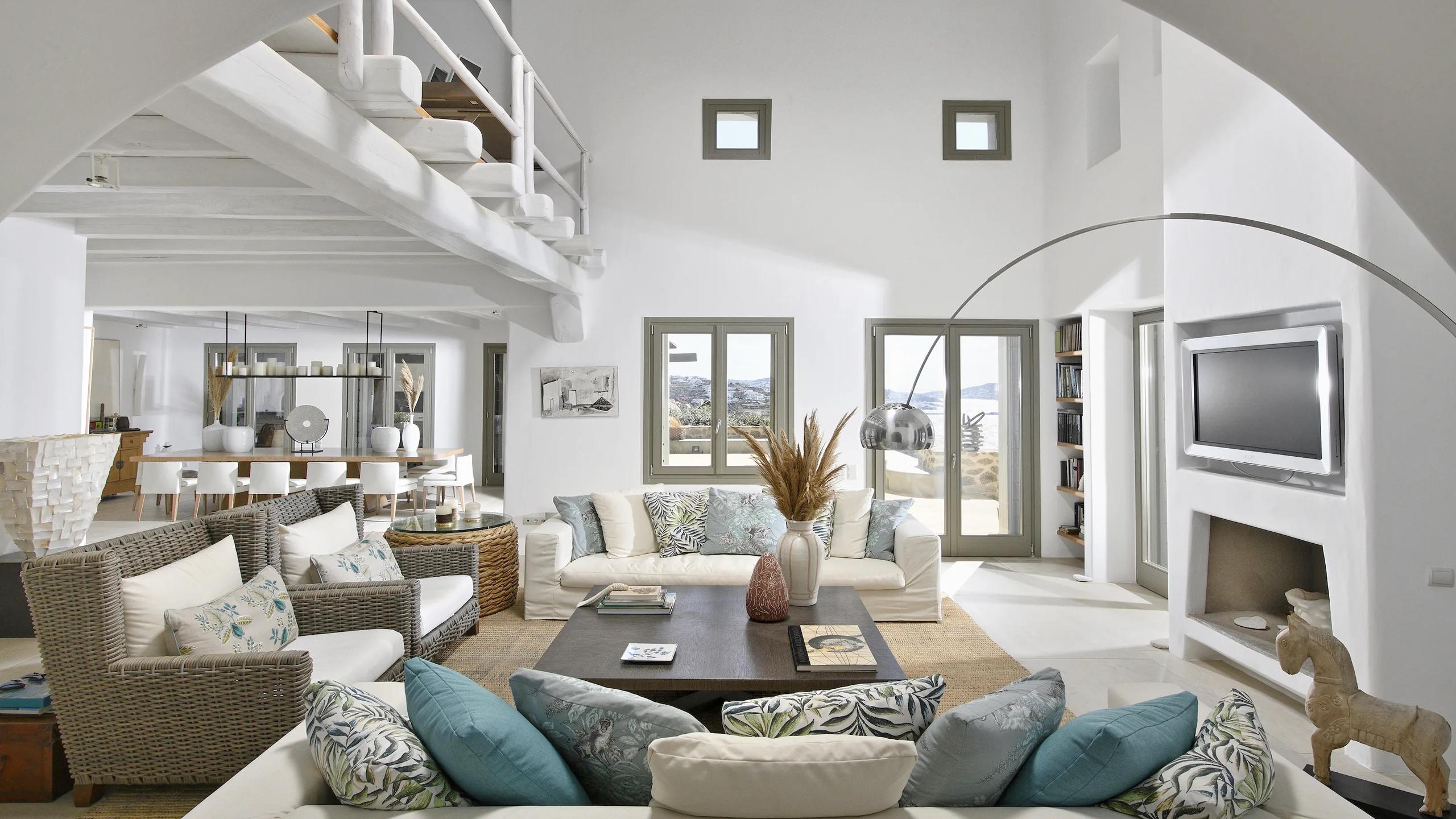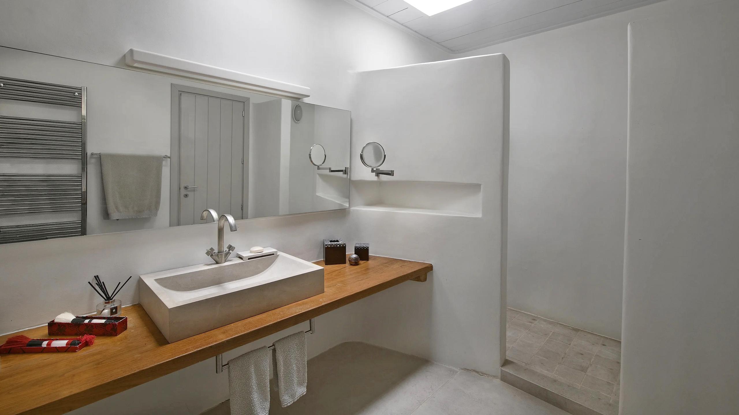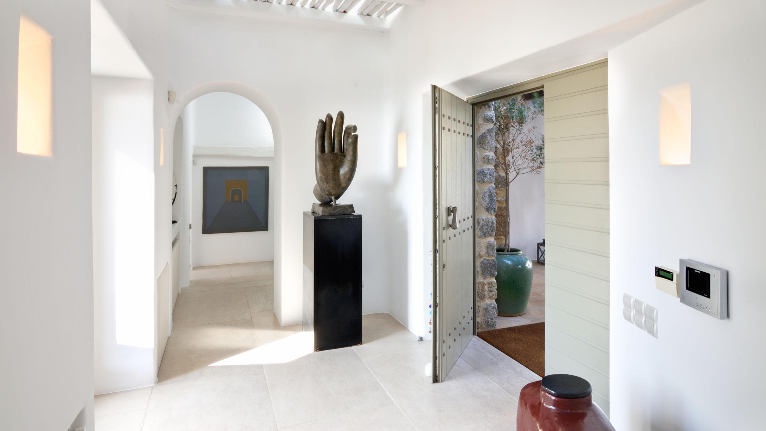 The overall decor is a classic tribute to Myconian style, with a dominance of white surfaces, stone inserts, and white-washed wooden beam ceilings. This concept is perfectly balanced with a refined taste for signature design furniture and for artefacts or ideas (see the fountain on the lower level) deriving from the owners’ love for travel. The end result is a unique blend of style and tradition that gives a chic vibe to all the indoor spaces.
