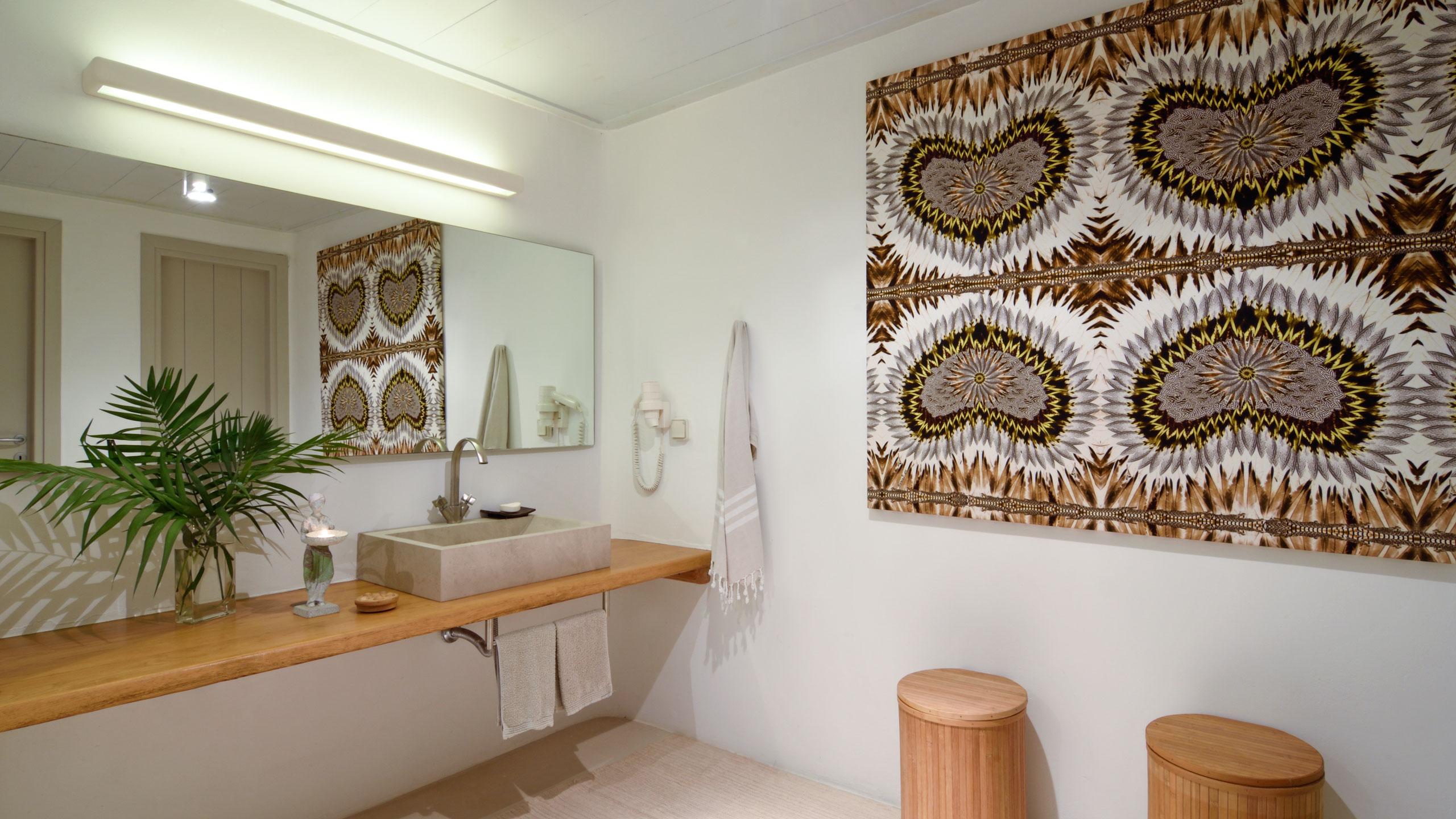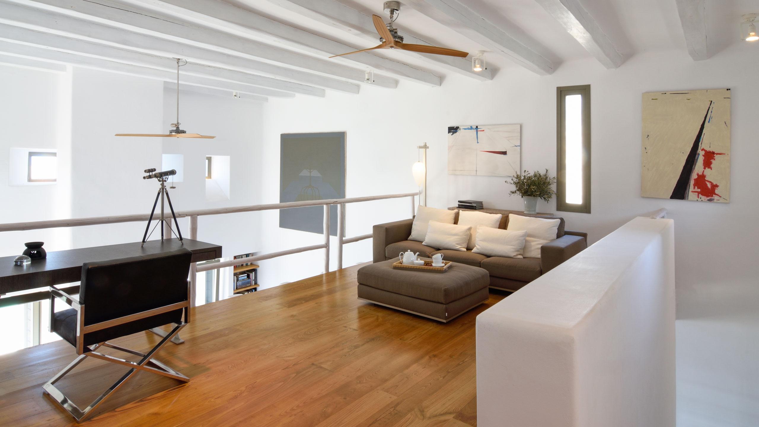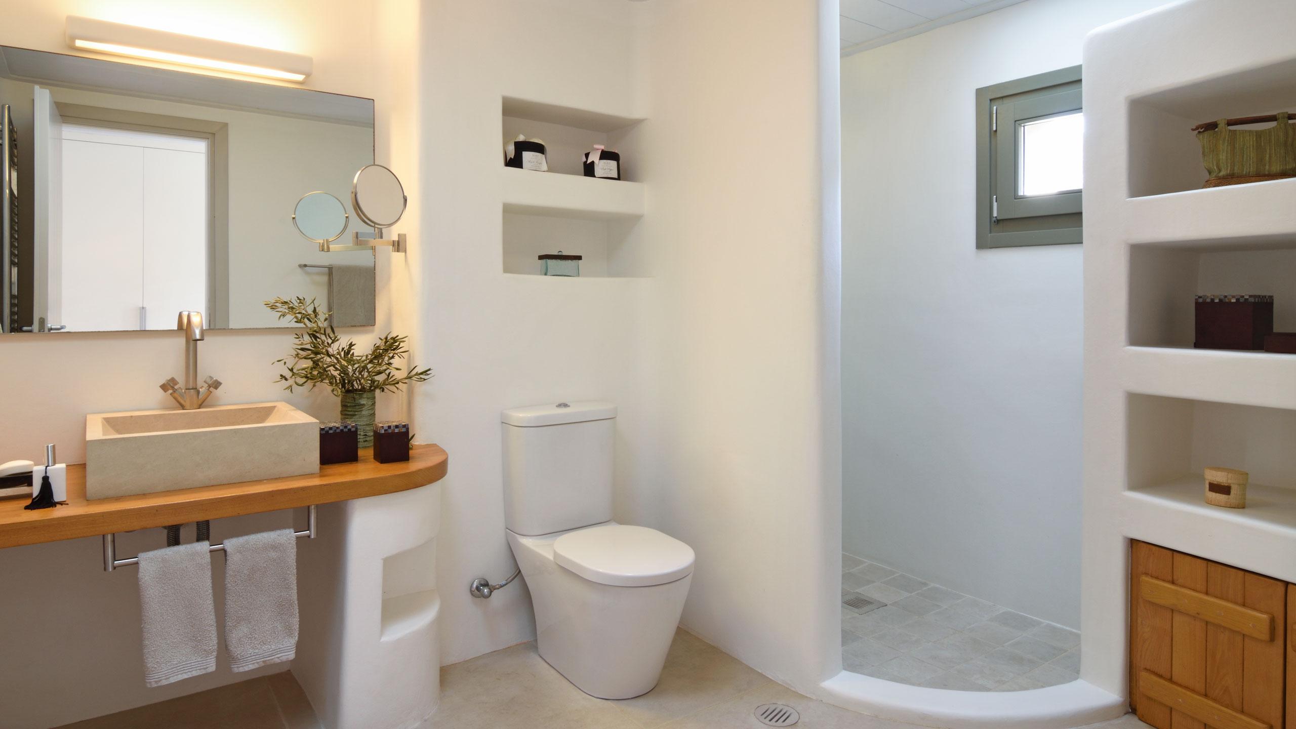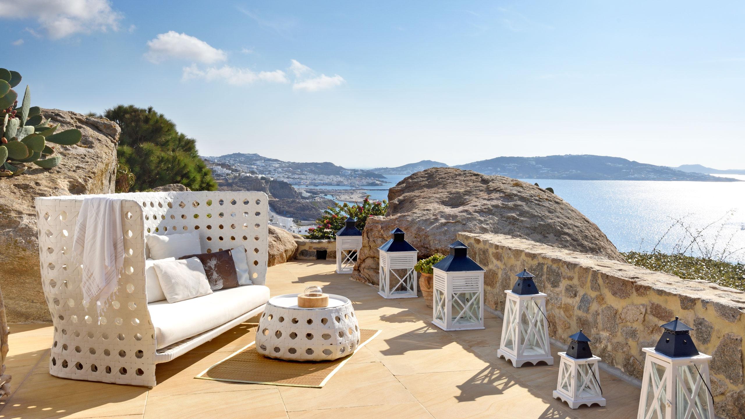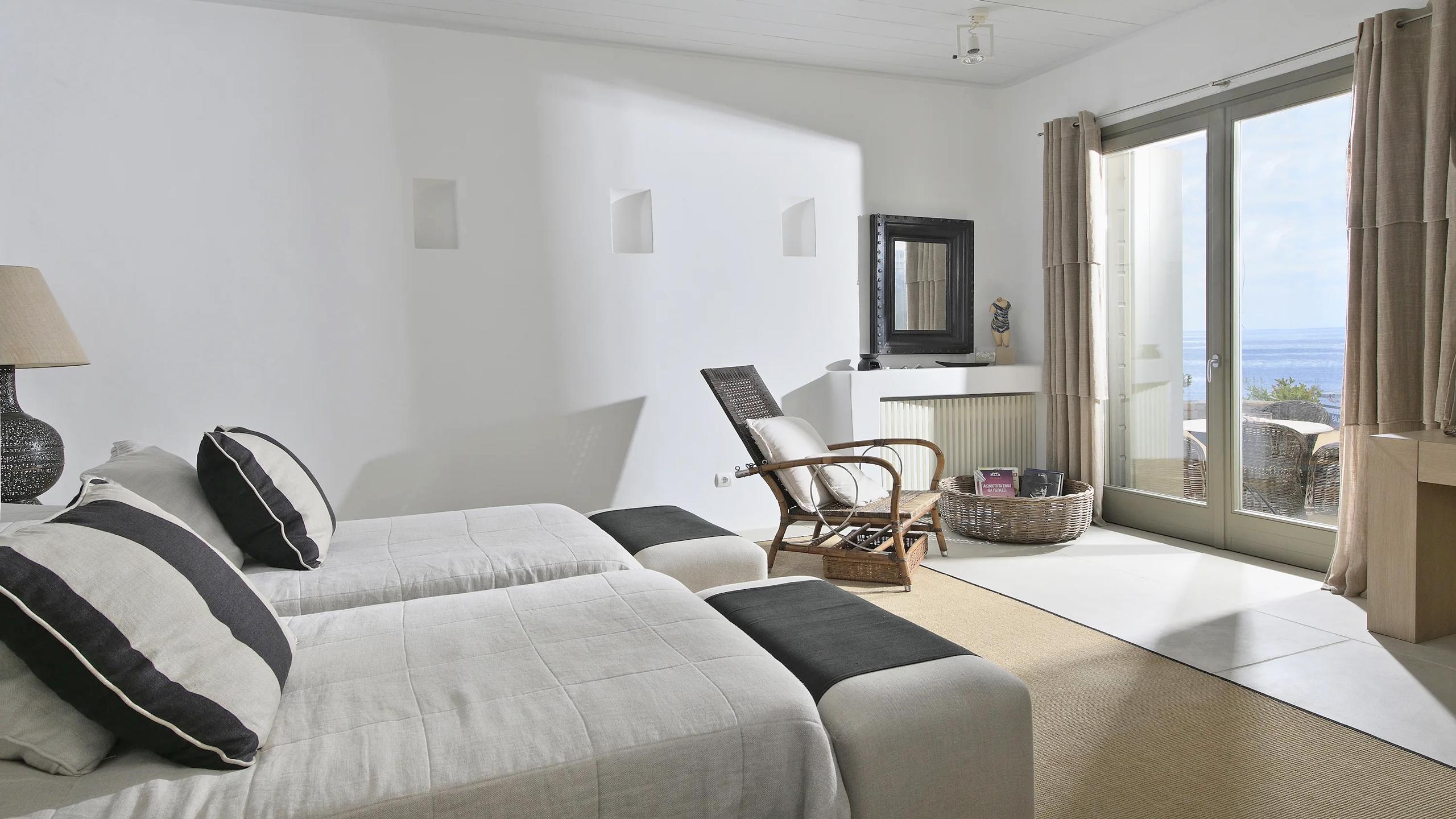 The overall decor is a classic tribute to Myconian style, with a dominance of white surfaces, stone inserts, and white-washed wooden beam ceilings. This concept is perfectly balanced with a refined taste for signature design furniture and for artefacts or ideas (see the fountain on the lower level) deriving from the owners’ love for travel. The end result is a unique blend of style and tradition that gives a chic vibe to all the indoor spaces.
