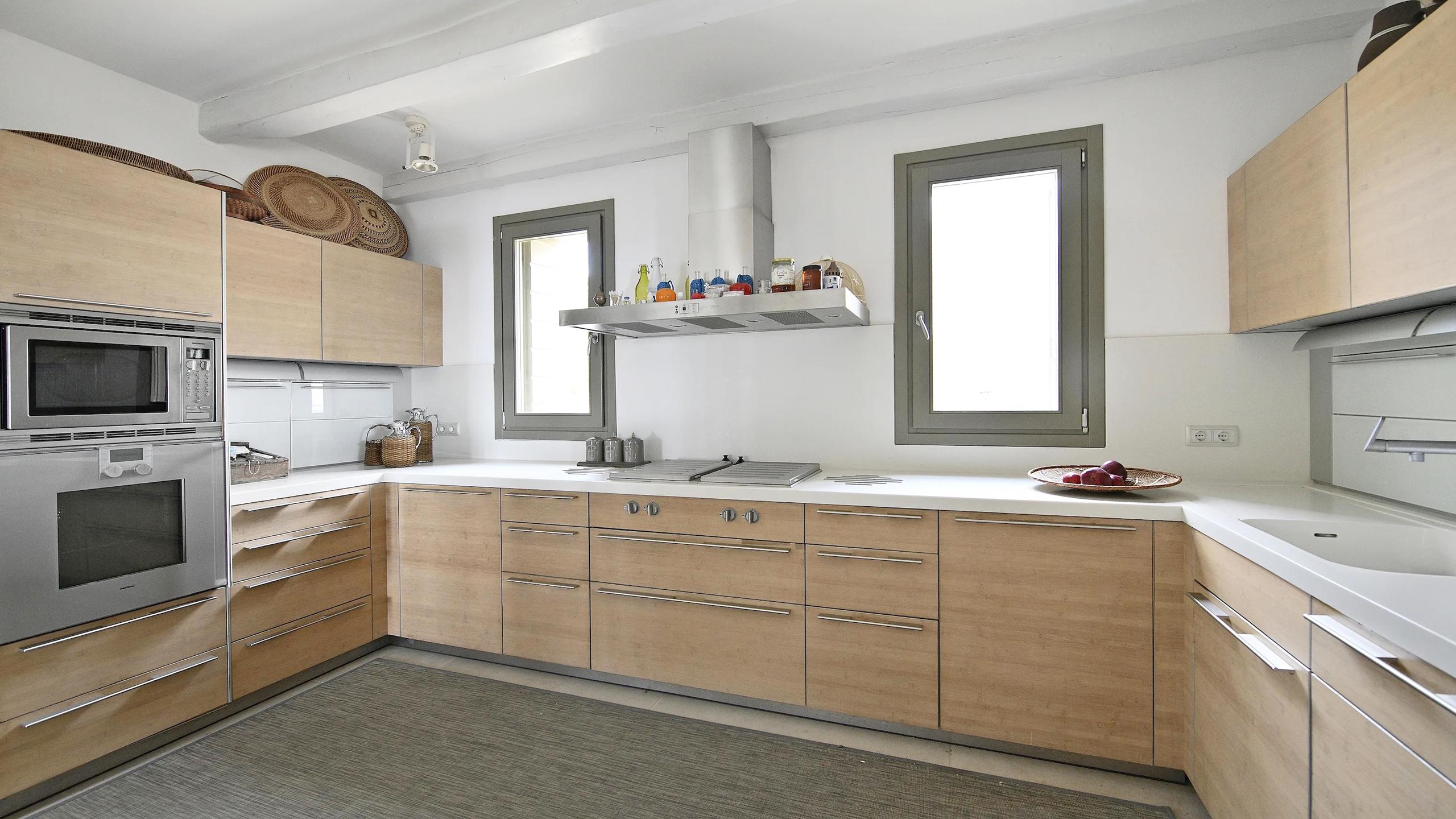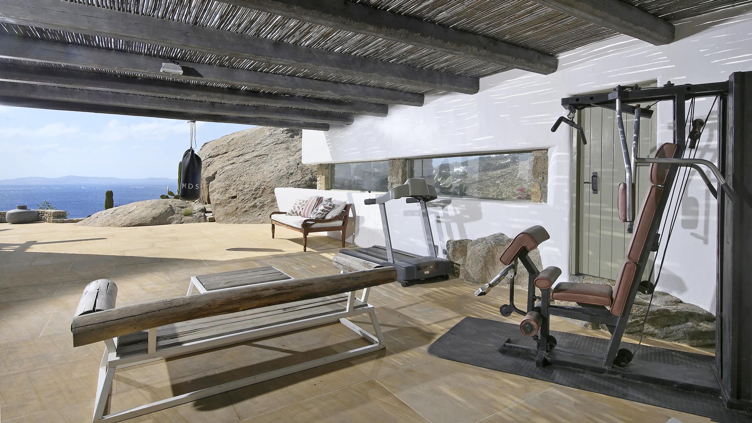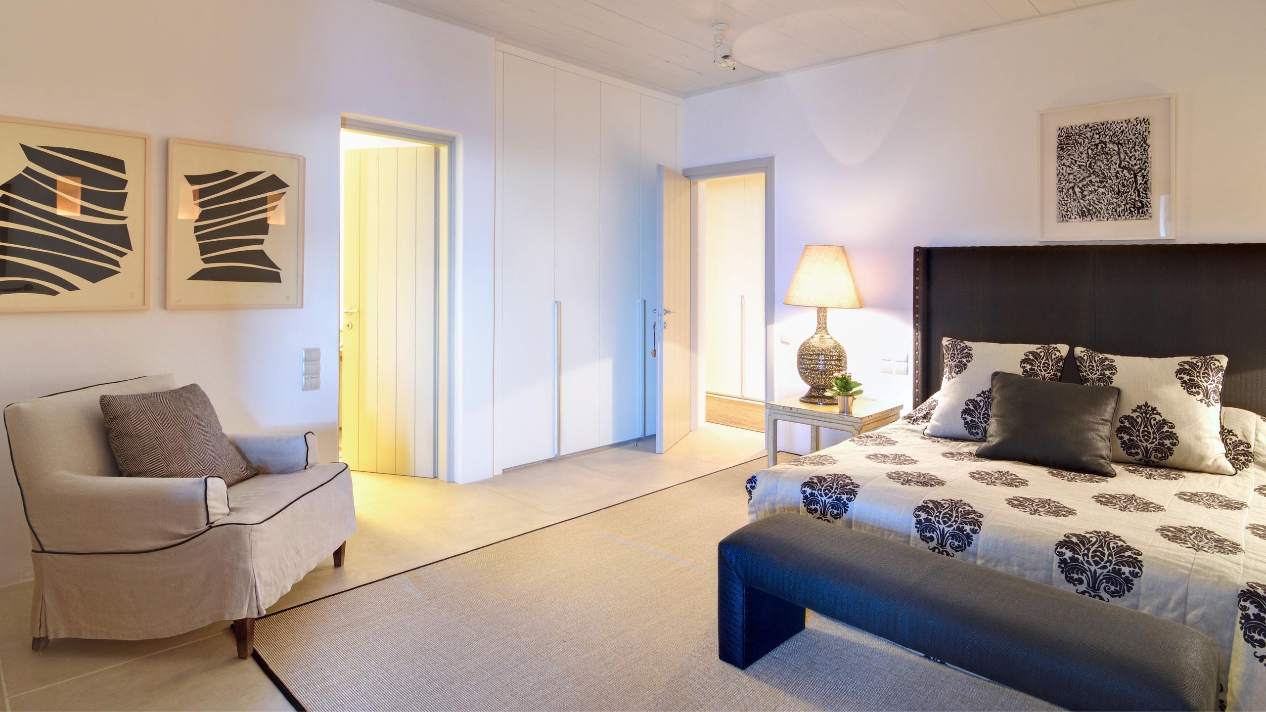 The same variety is present indoors, where beyond the common areas and bedrooms, guests have access to a home cinema, private gym, steam room, and massage room – all reprising the recurring theme of a property apt to cater to any mood. The three levels of the property each host bedrooms, with the main master taking up most of the upper level. The common spaces are located on the entrance floor with the living room, indoor dining room, and one of the two fully equipped kitchens flowing into each other in a large open space that faces out towards the sea.