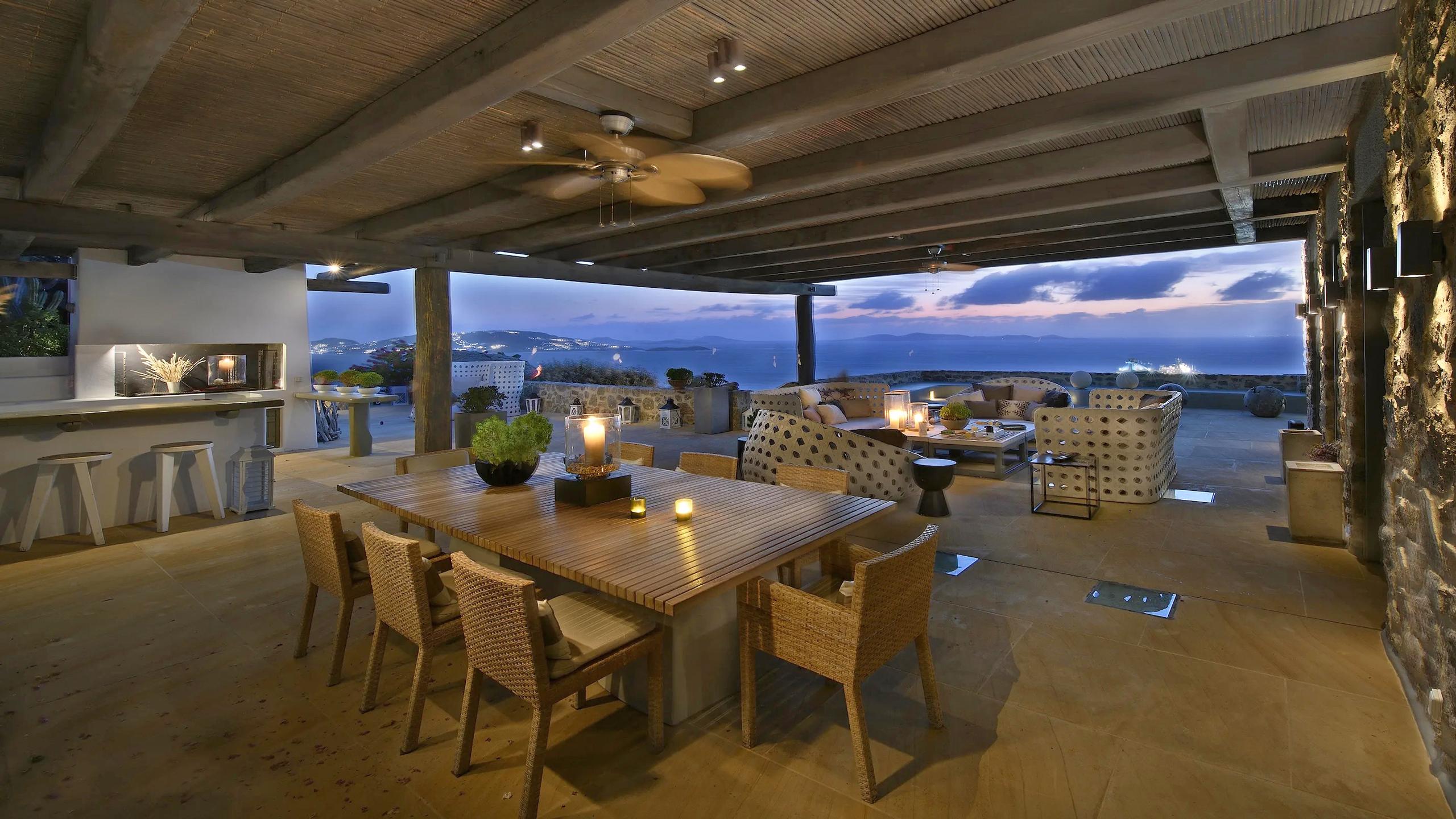 The outdoor spaces offer an array of options to match any state of mind. Guests can swim in the large private infinity pool looking out towards the magnificent panorama or work up the perfect tan on the sun loungers surrounding it. Entertainment and fine dining are both a must under the pergola just a few steps away from the pool, where a summer living room, elegant dining table, and bar area with barbecue each find space. Meditation can be achieved on an inspiring wooden deck stretching out in a private position just down a path from the main areas, while privacy can be enjoyed from the various exits of the bedrooms, be it private balconies or patios.