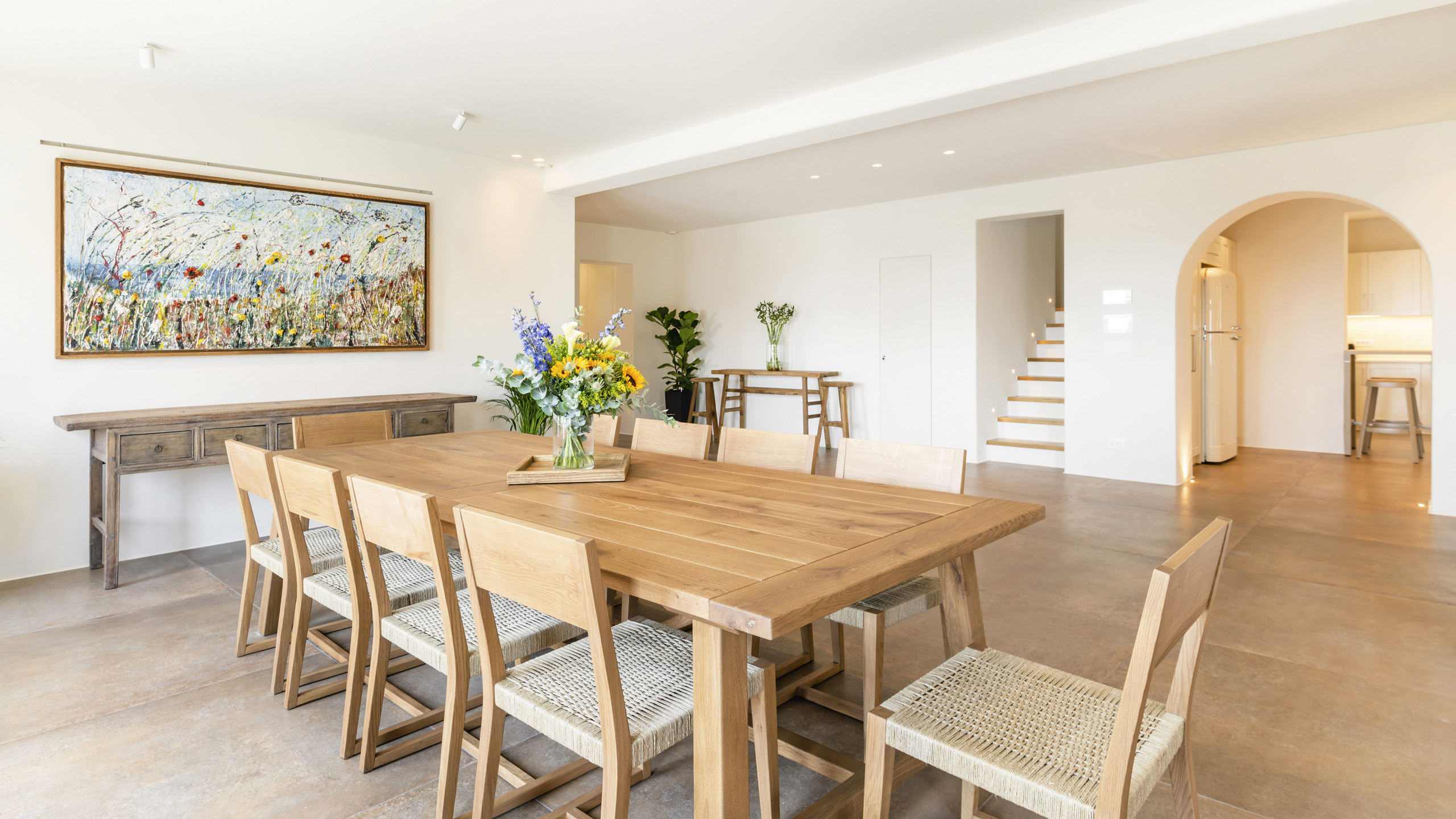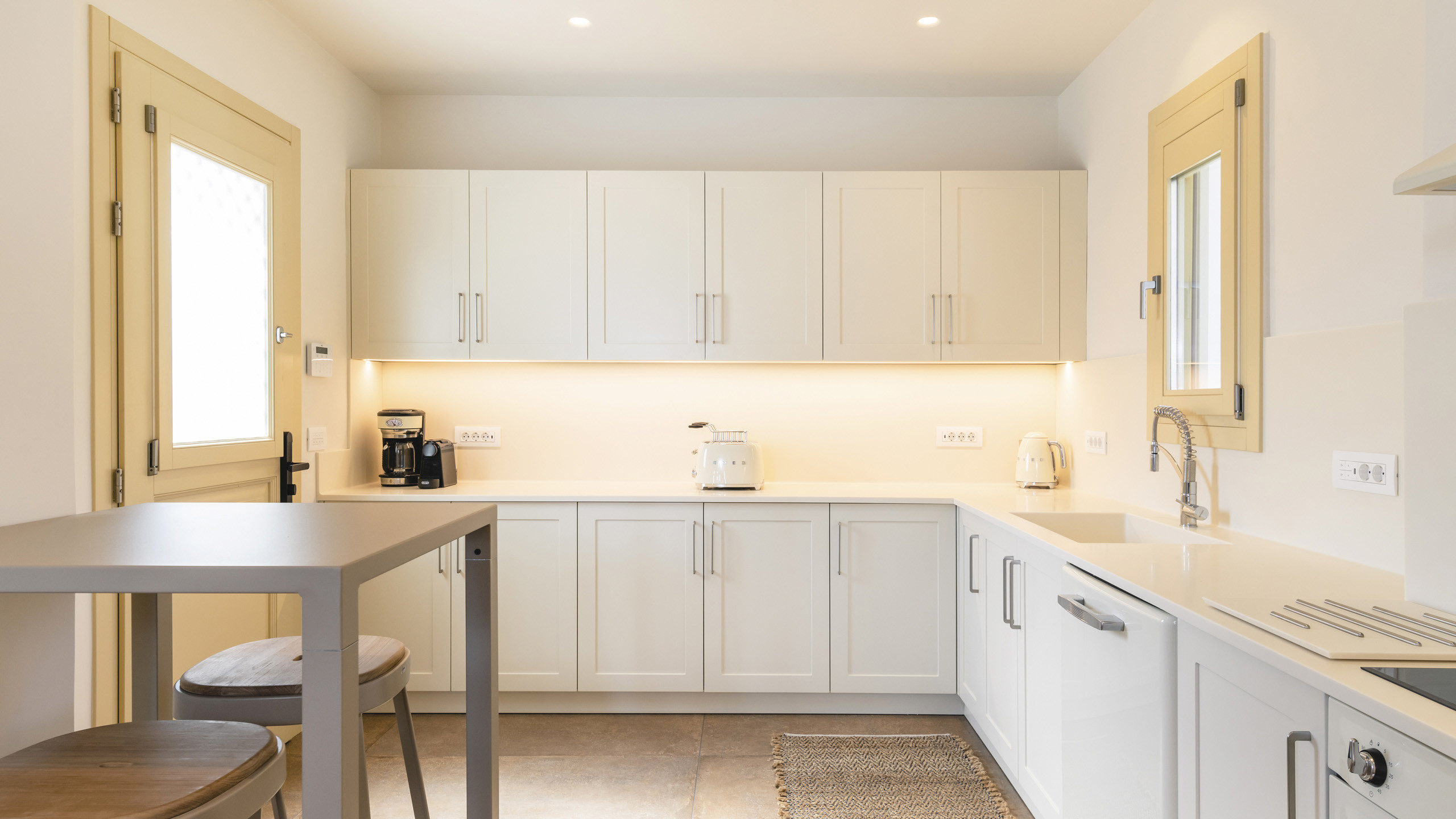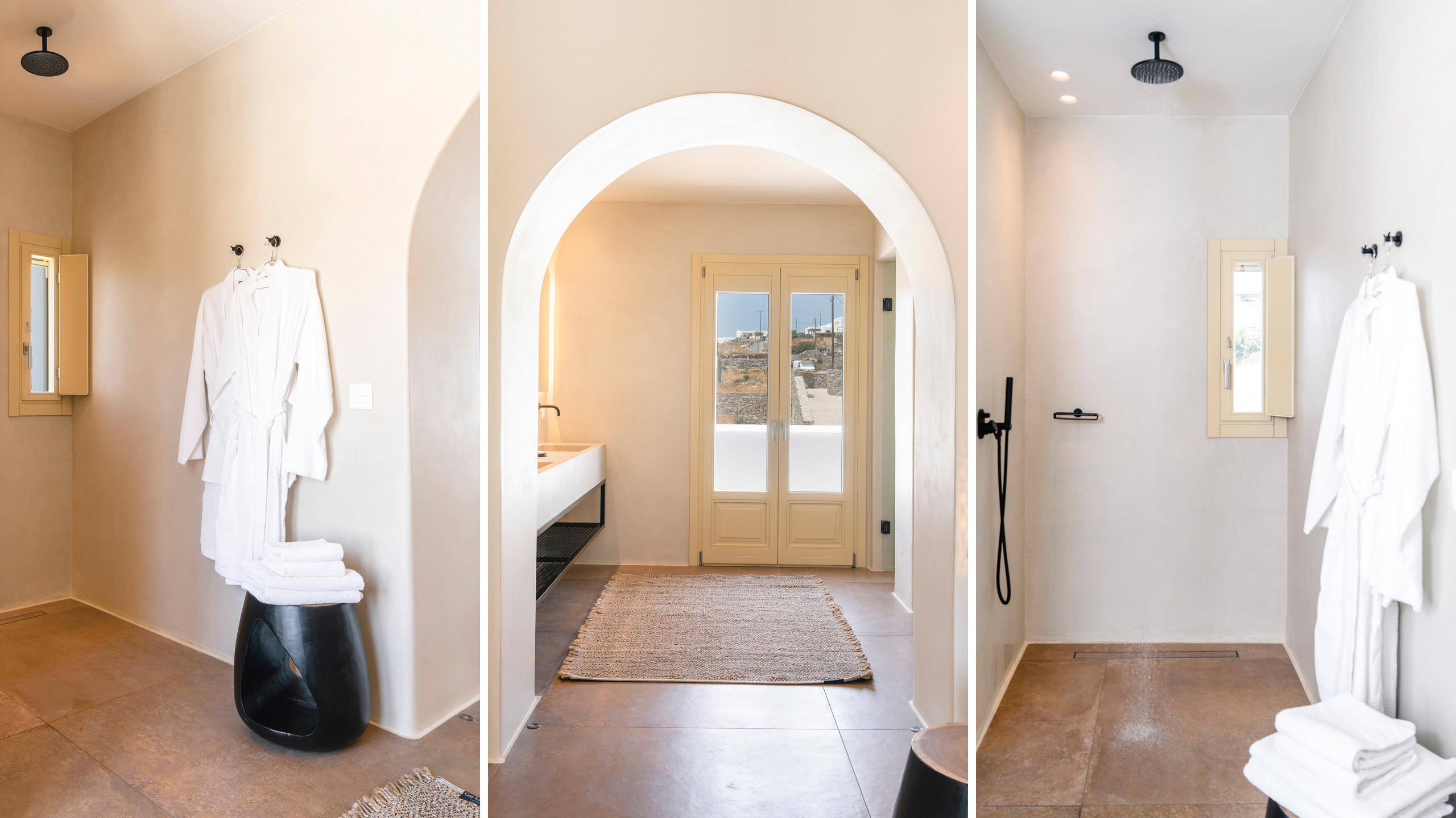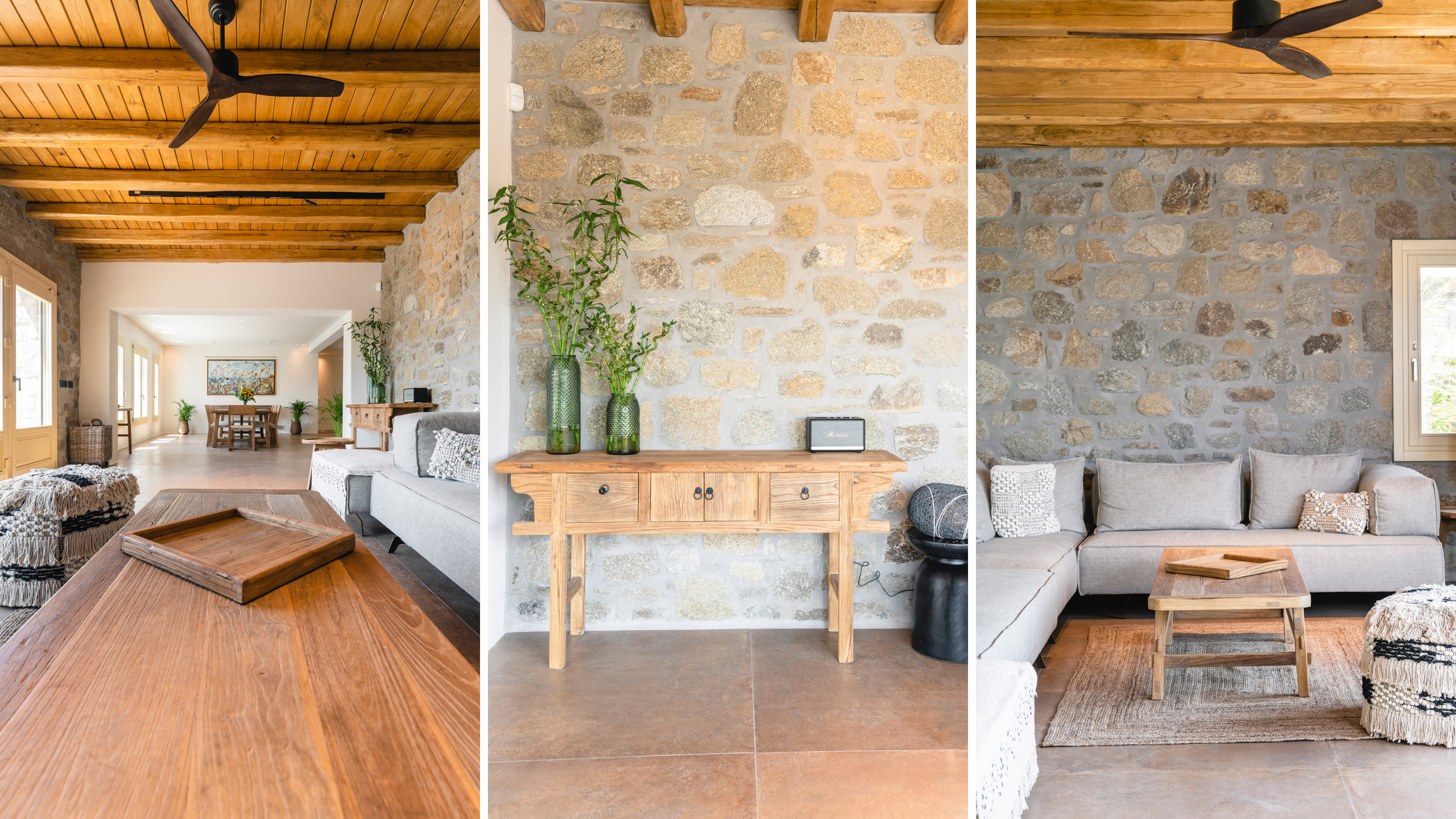 Inside, Mimosa truly shines with warm and welcoming décor where nothing is left to chance. The color scheme revolves around white and cream, with elements of wood and exposed stone that add a special touch to the ambiance. We particularly appreciate the decision to create only three generously sized bedrooms, each equipped with top-quality amenities.
