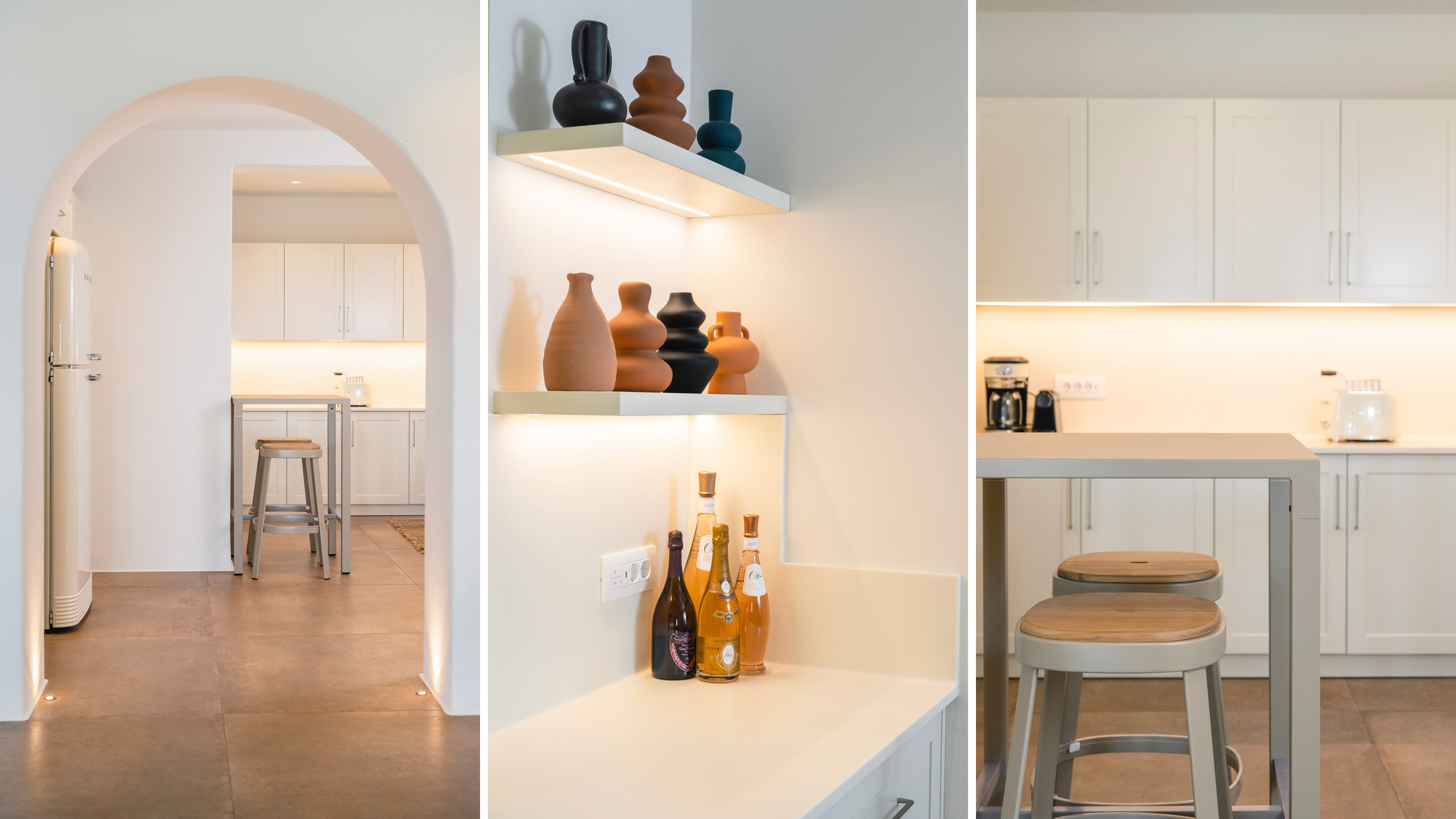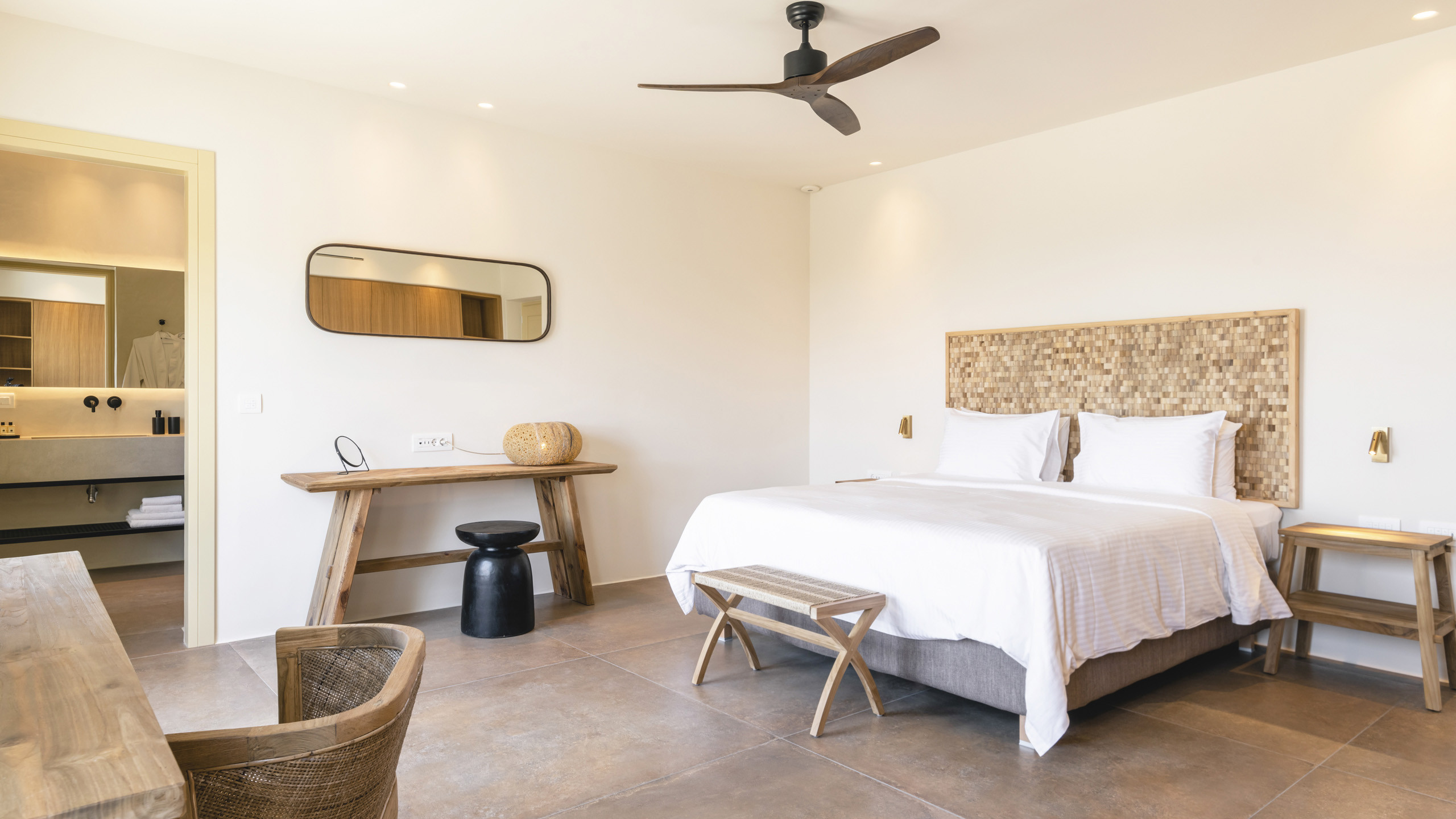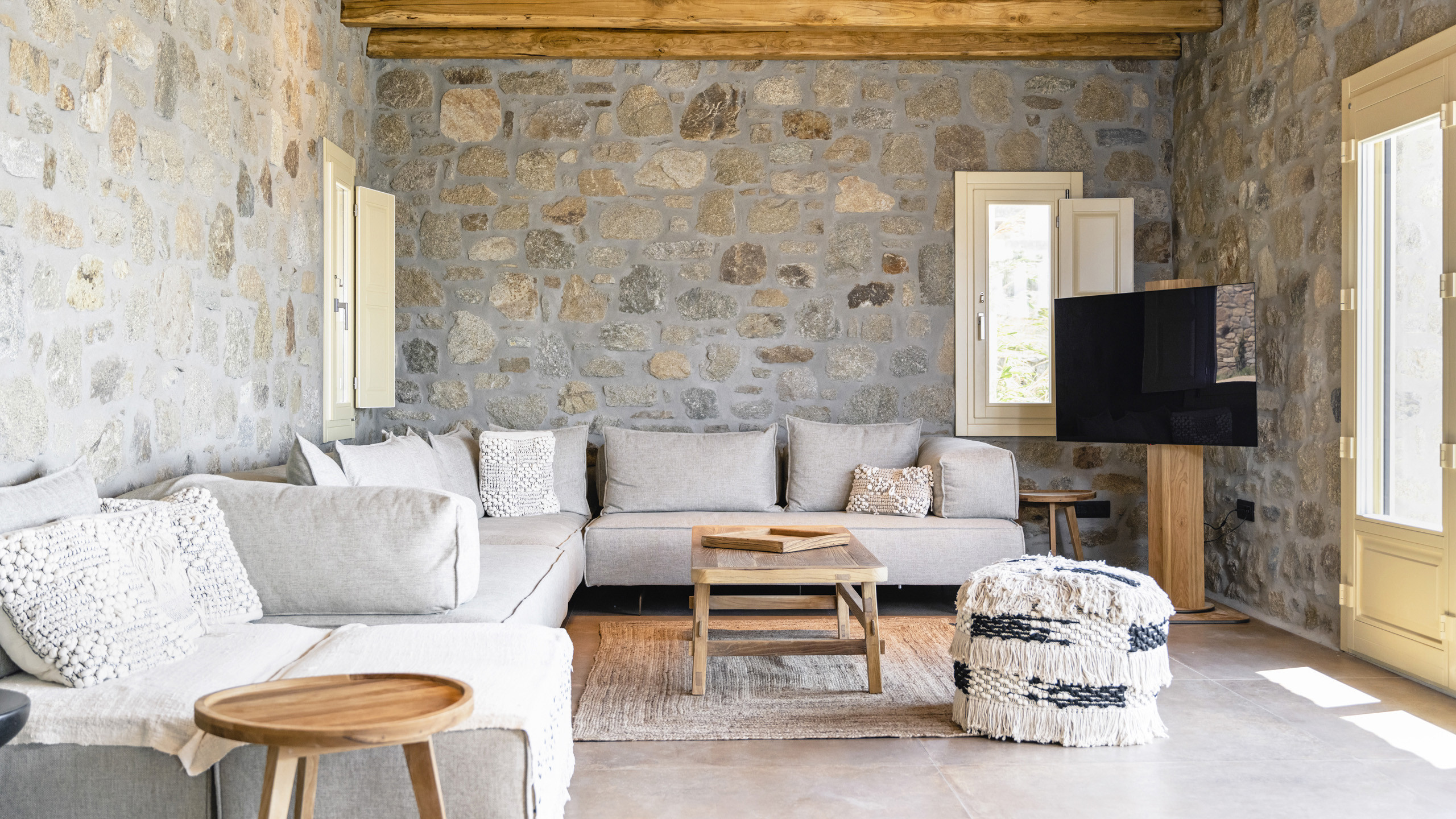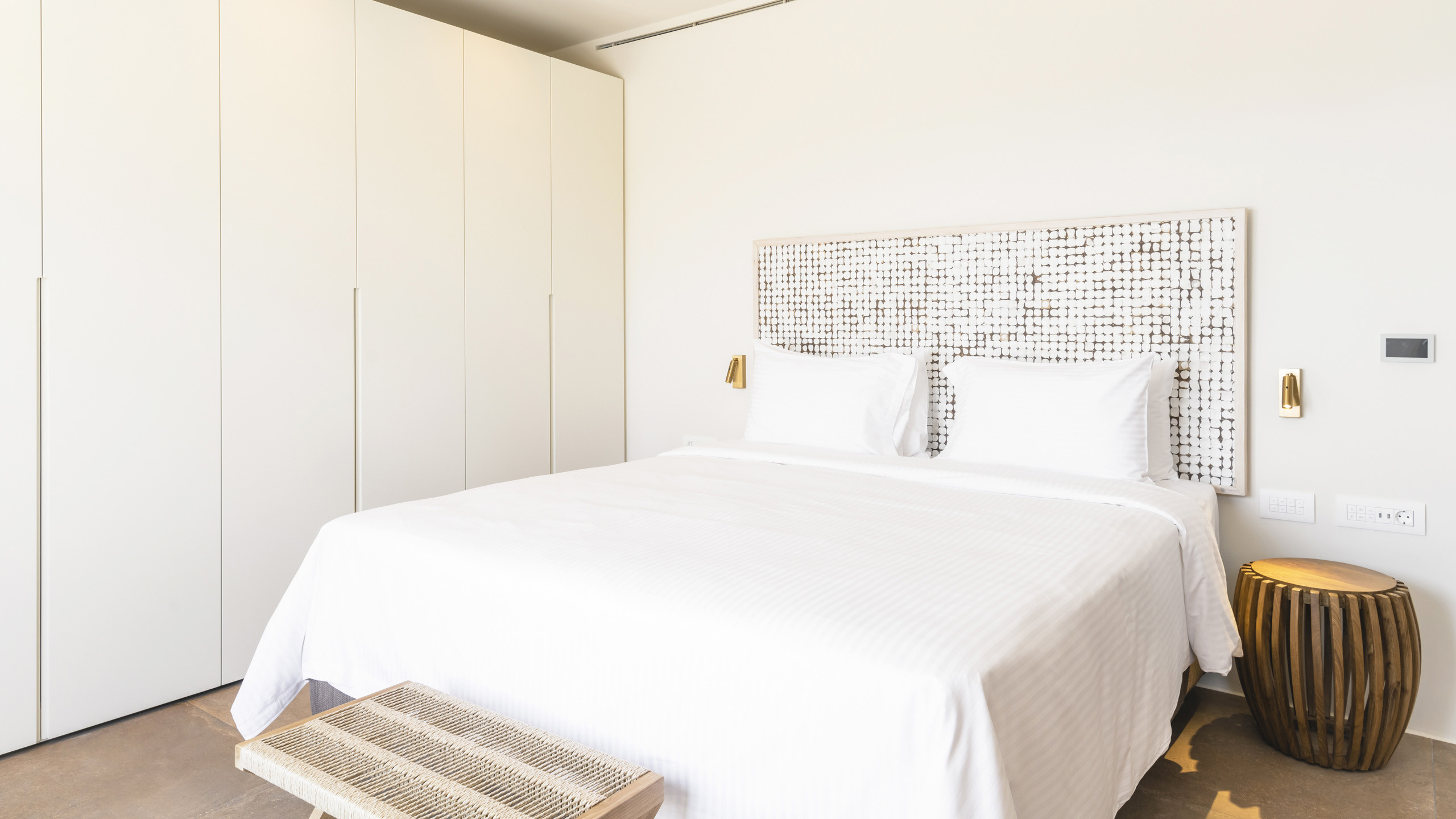 Inside, Mimosa truly shines with warm and welcoming décor where nothing is left to chance. The color scheme revolves around white and cream, with elements of wood and exposed stone that add a special touch to the ambiance. We particularly appreciate the decision to create only three generously sized bedrooms, each equipped with top-quality amenities.