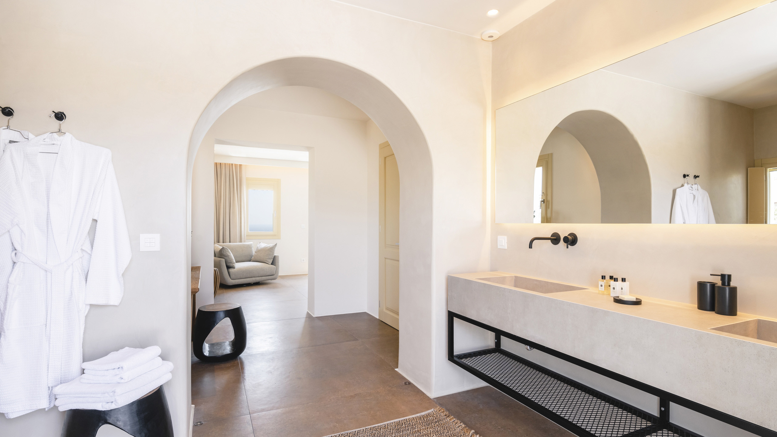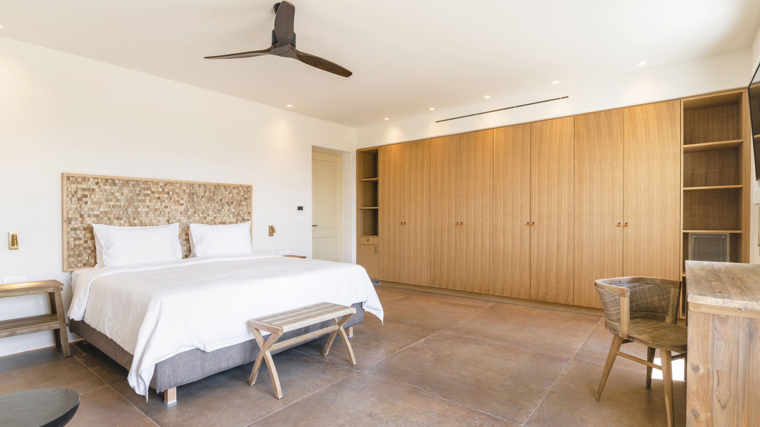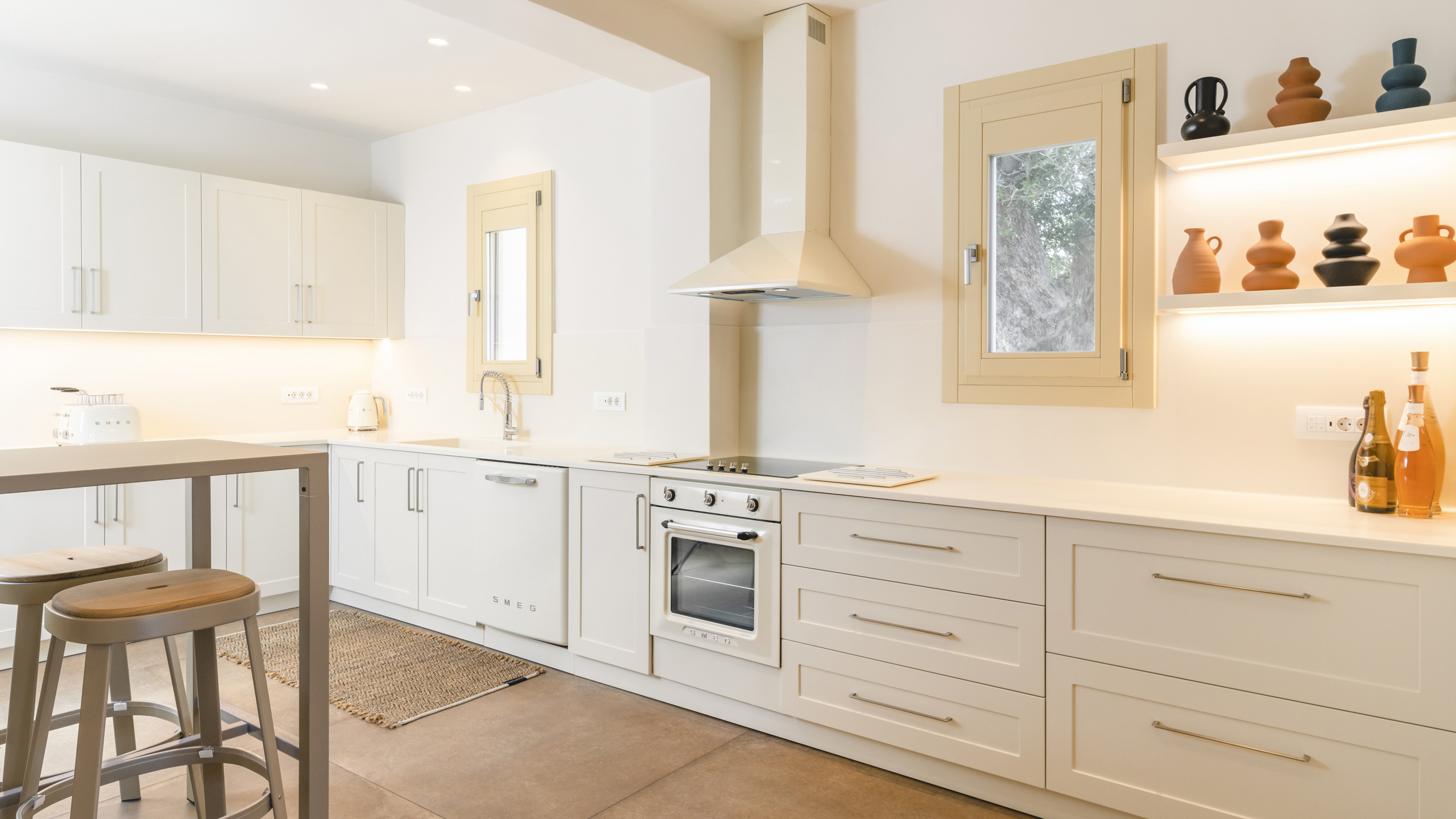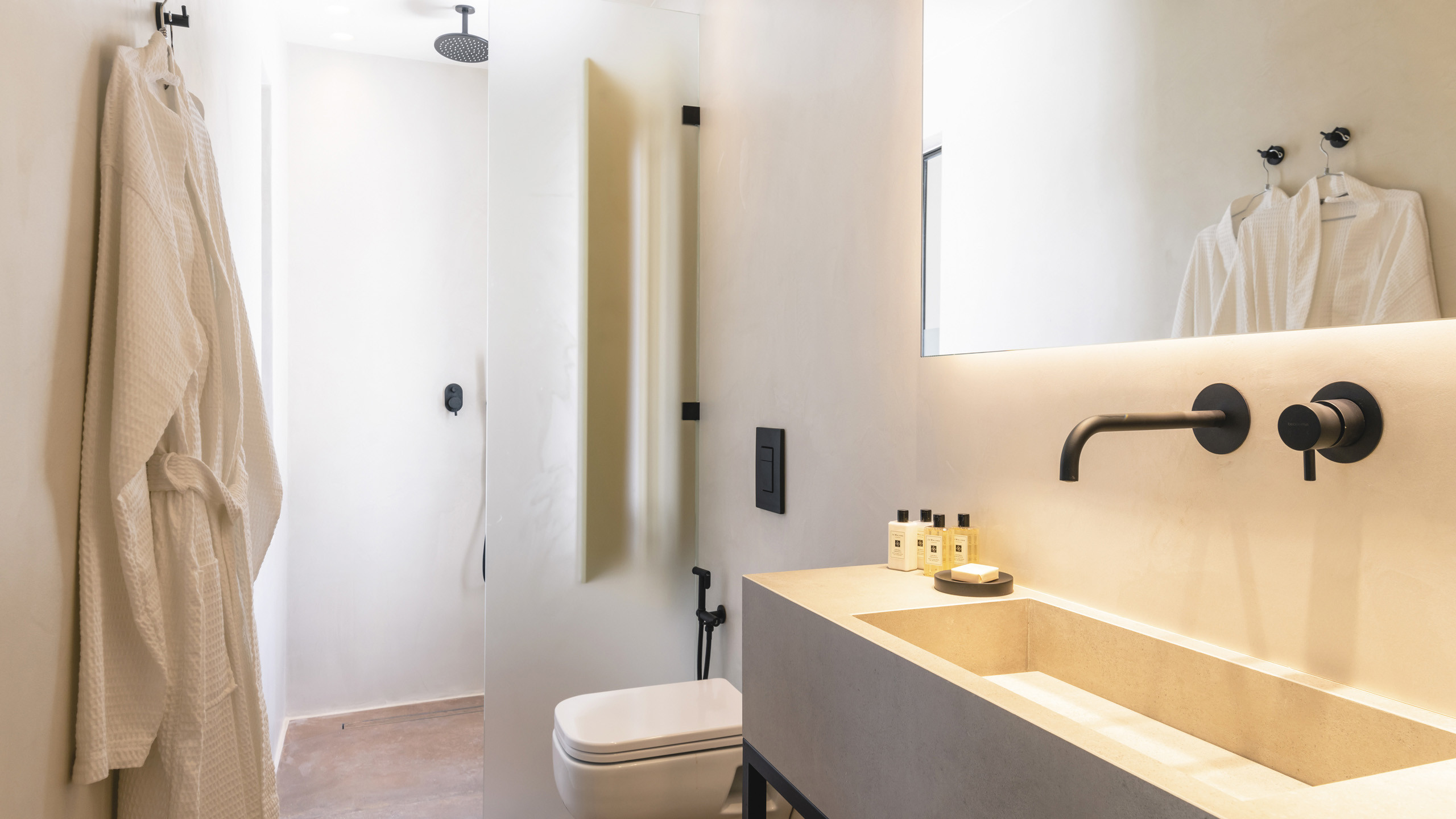 Inside, Mimosa truly shines with warm and welcoming décor where nothing is left to chance. The color scheme revolves around white and cream, with elements of wood and exposed stone that add a special touch to the ambiance. We particularly appreciate the decision to create only three generously sized bedrooms, each equipped with top-quality amenities.