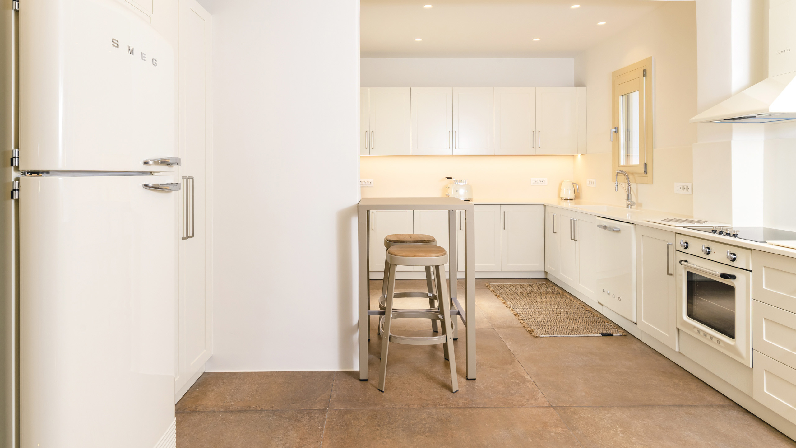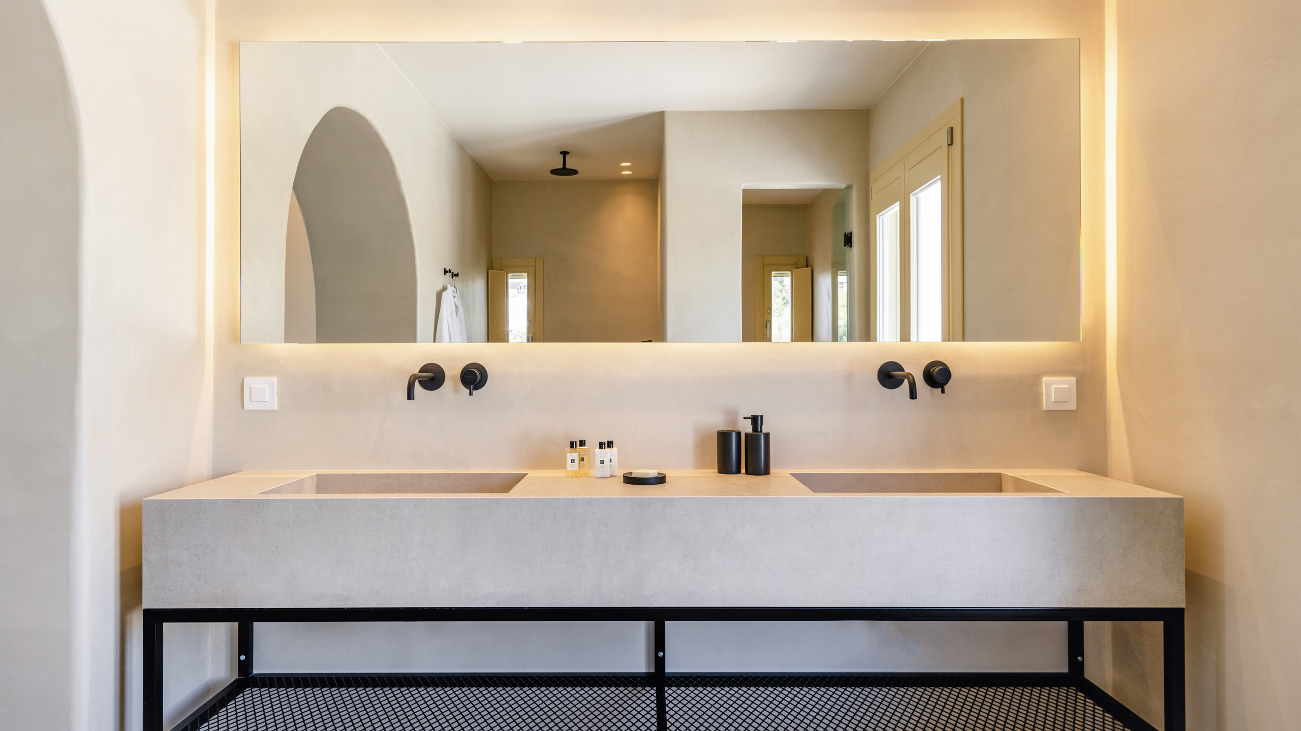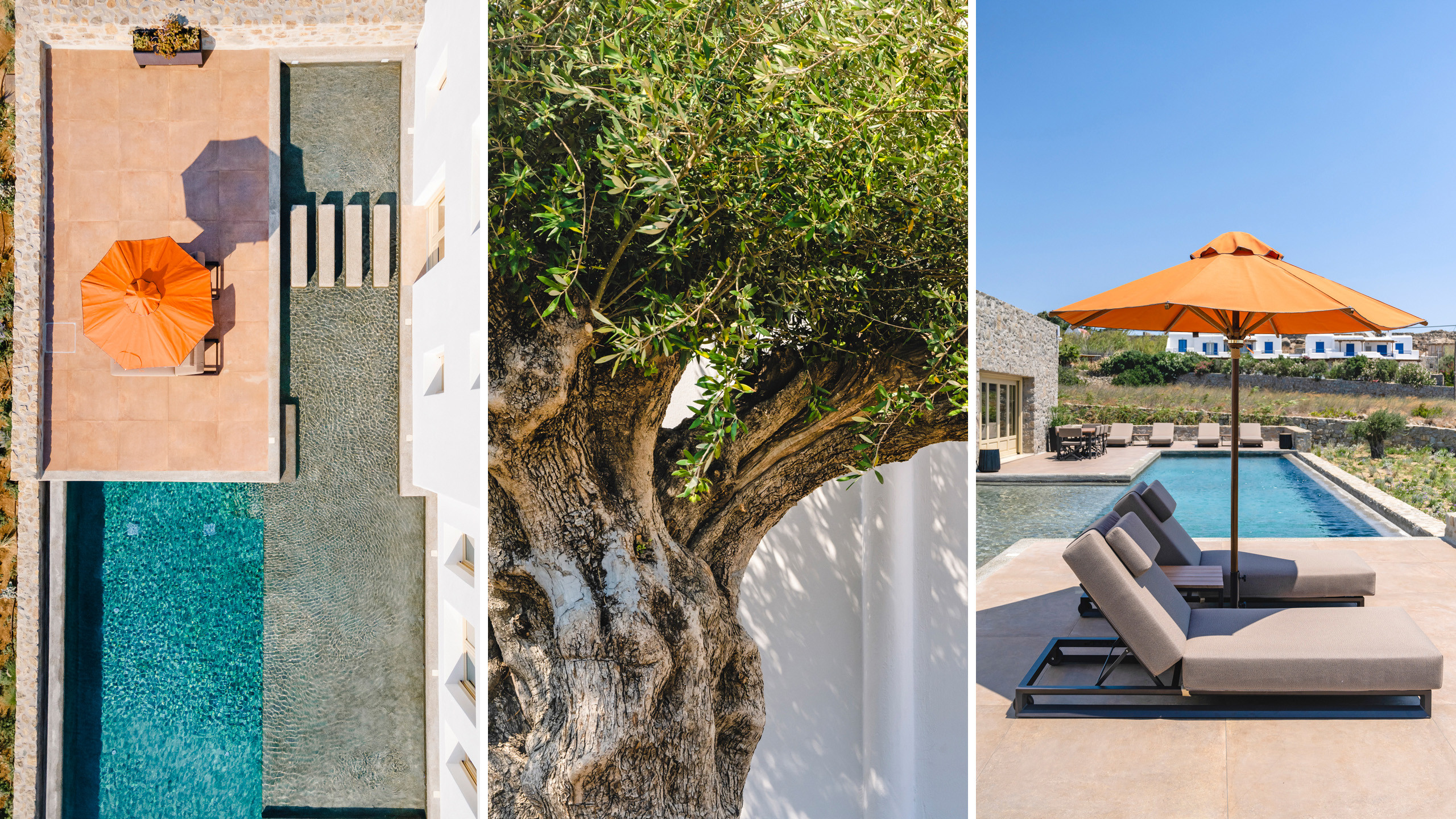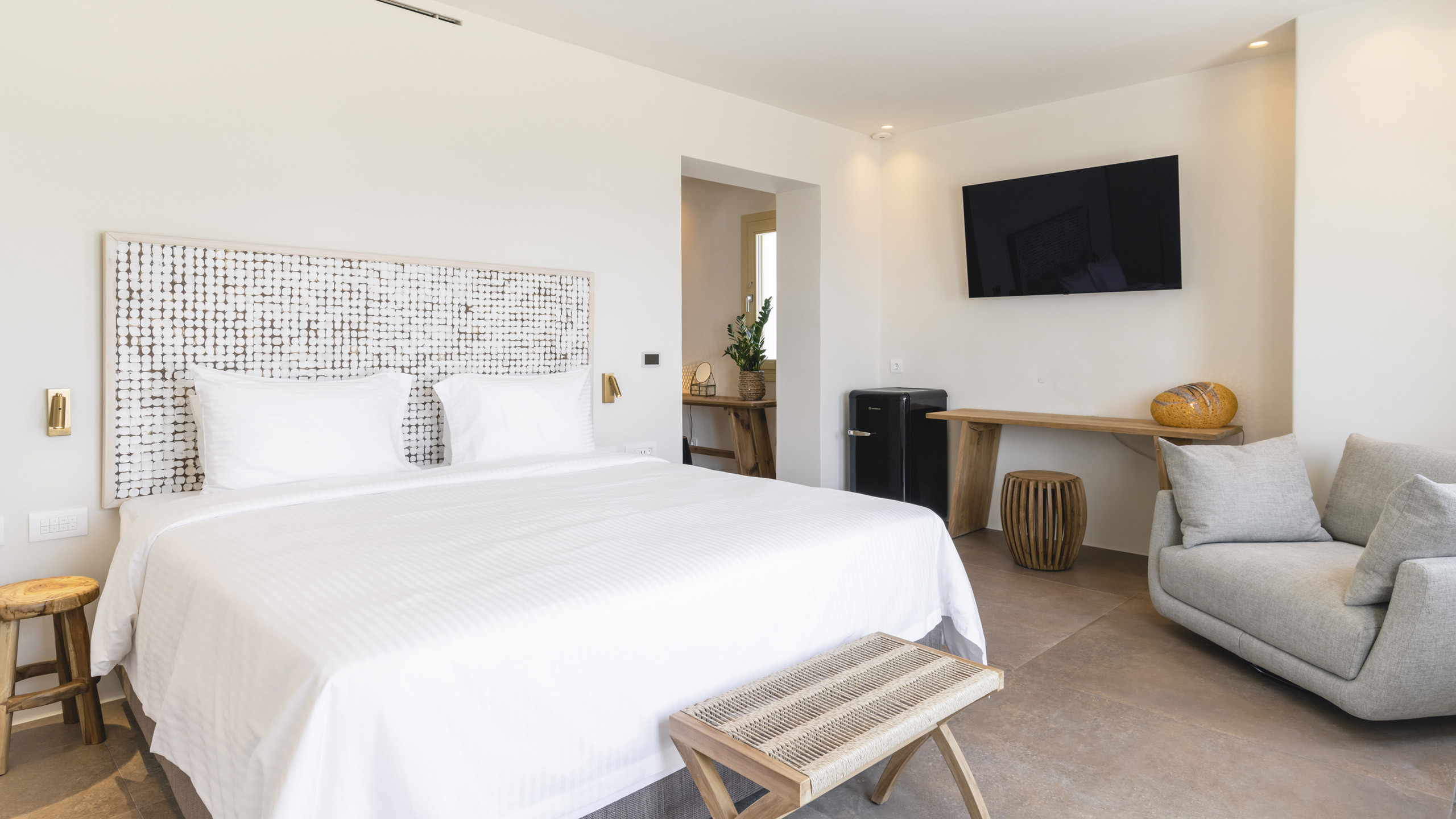 Inside, Mimosa truly shines with warm and welcoming décor where nothing is left to chance. The color scheme revolves around white and cream, with elements of wood and exposed stone that add a special touch to the ambiance. We particularly appreciate the decision to create only three generously sized bedrooms, each equipped with top-quality amenities.