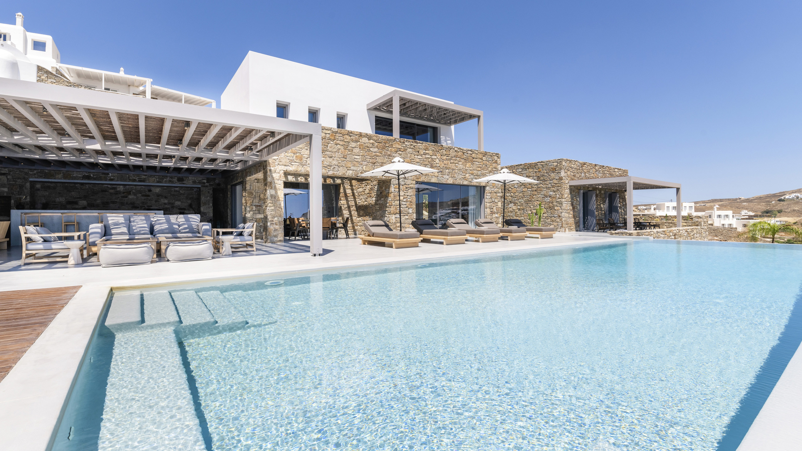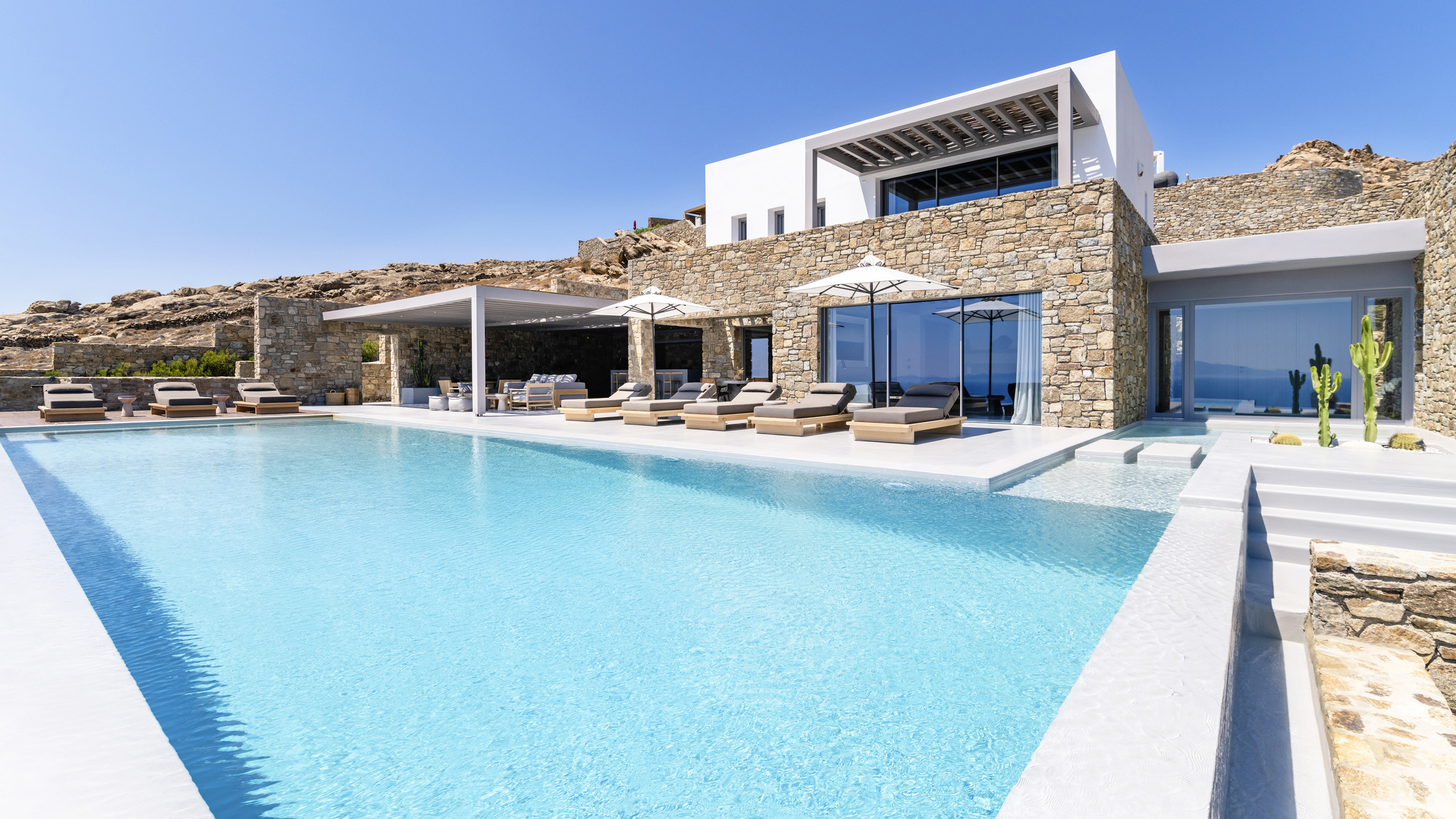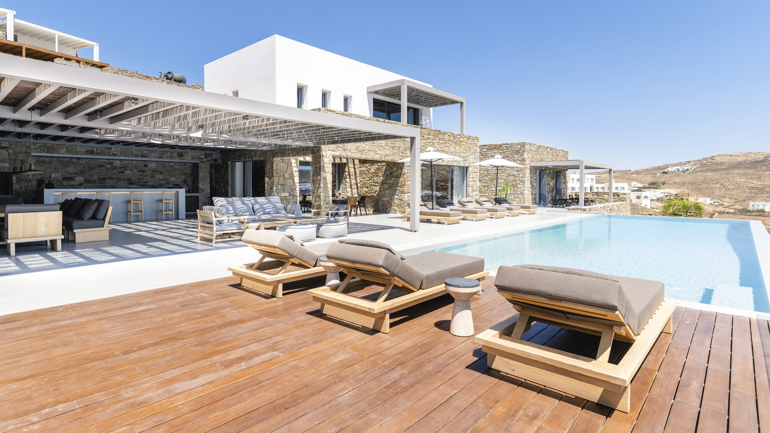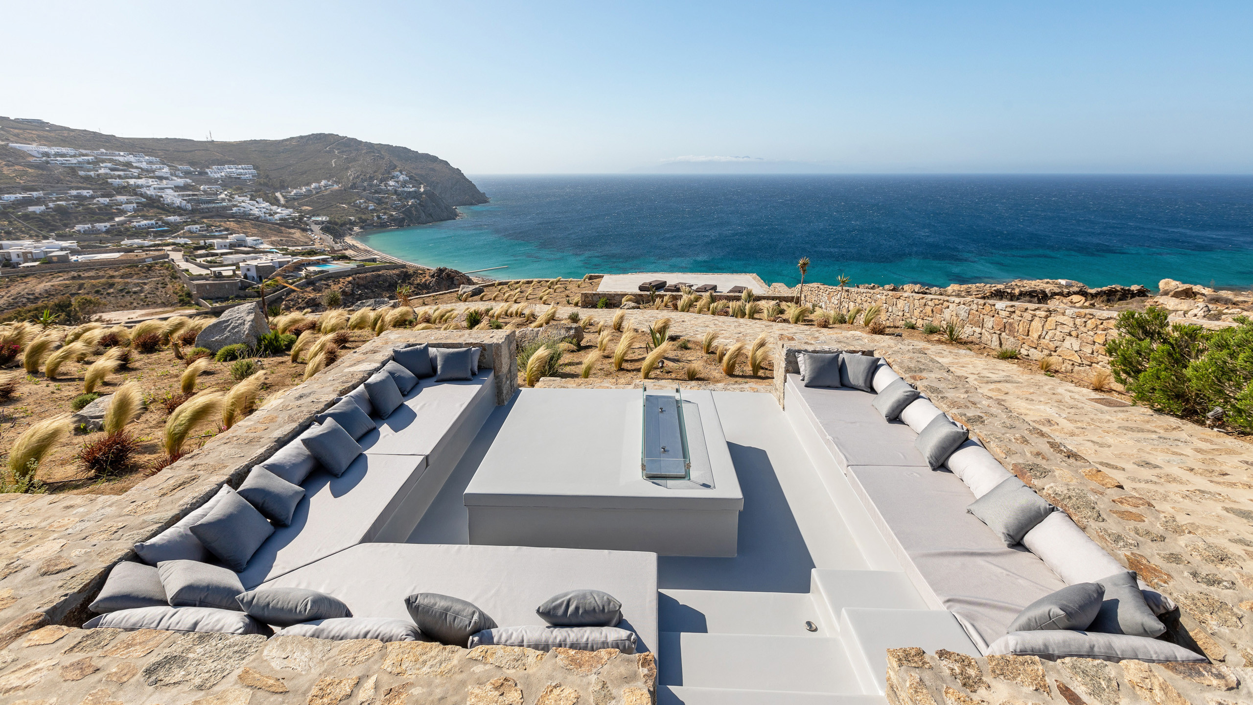 Unravel the charm of Mito, a luxurious villa built in 2022 in the serene area of Elia, Mykonos. Set on a 4,100 m² plot just 250 meters from the beach, Mito offers uninterrupted 180° views of the Aegean, with Paros and Naxos on the horizon. This refined retreat combines Cycladic elegance with modern comfort—featuring an 82 m² infinity pool, stylish sunbathing lounges, and an open-air fireplace perfect for sunset cocktails.