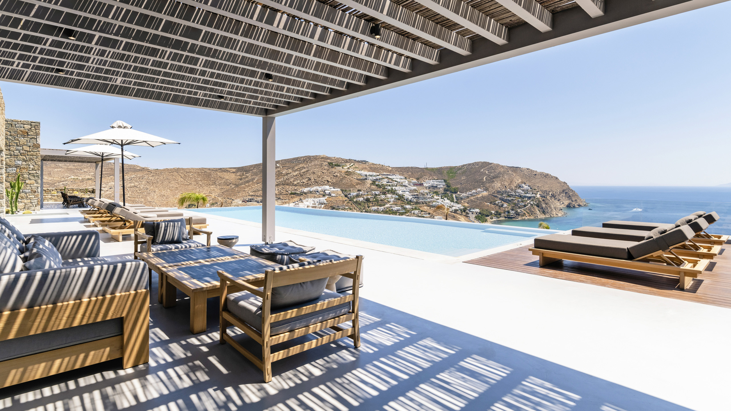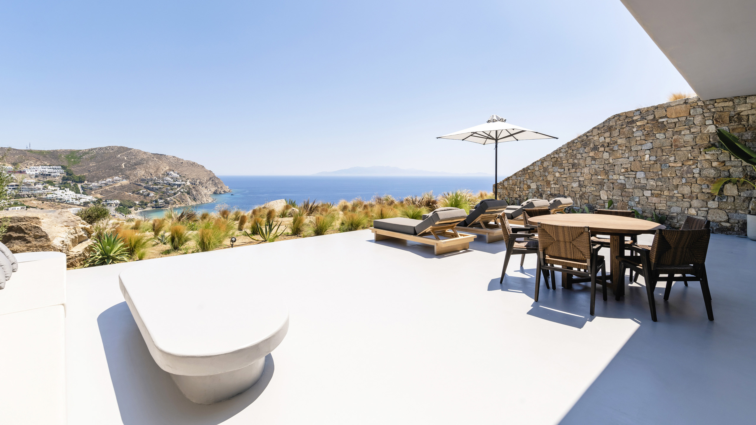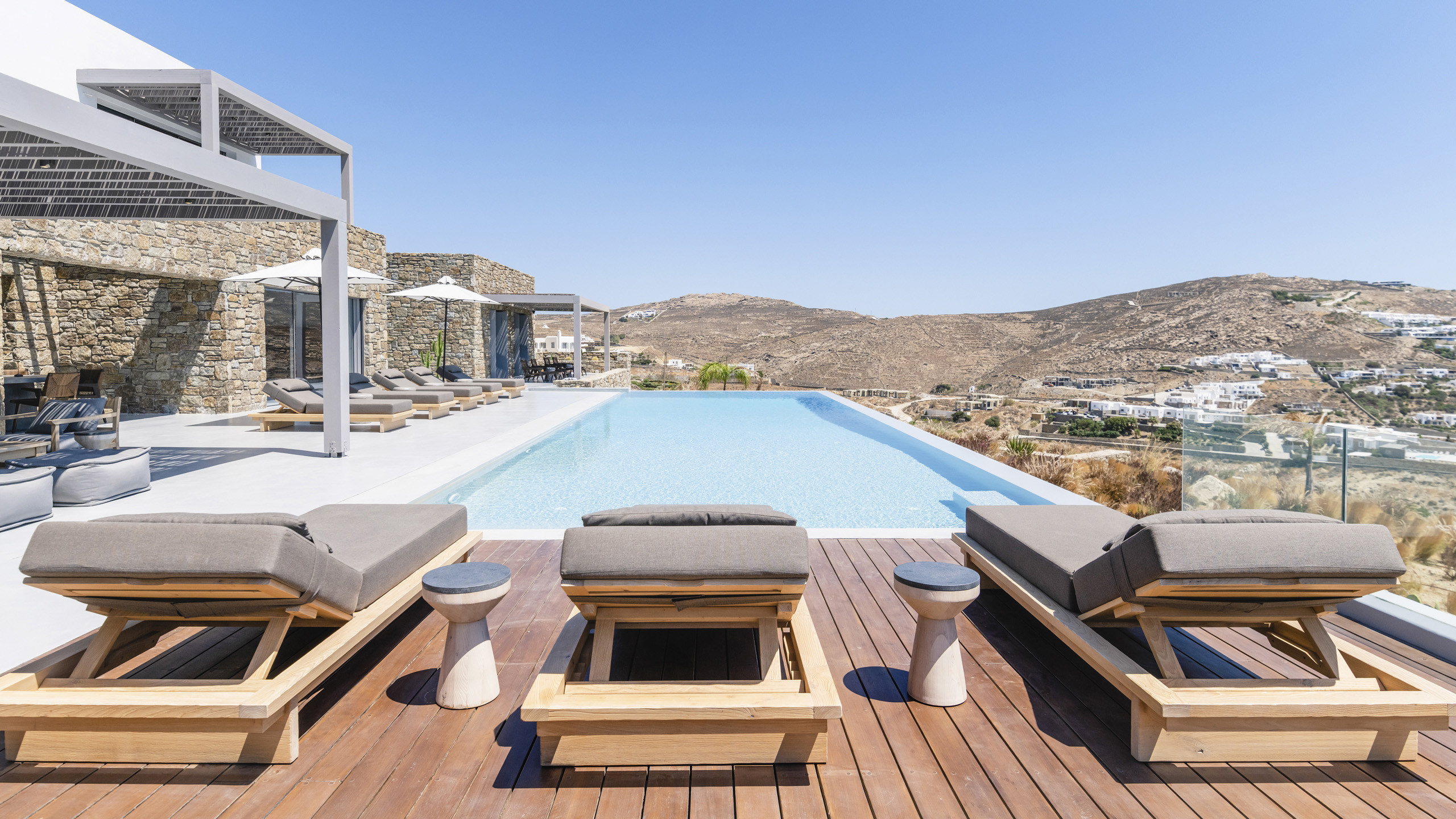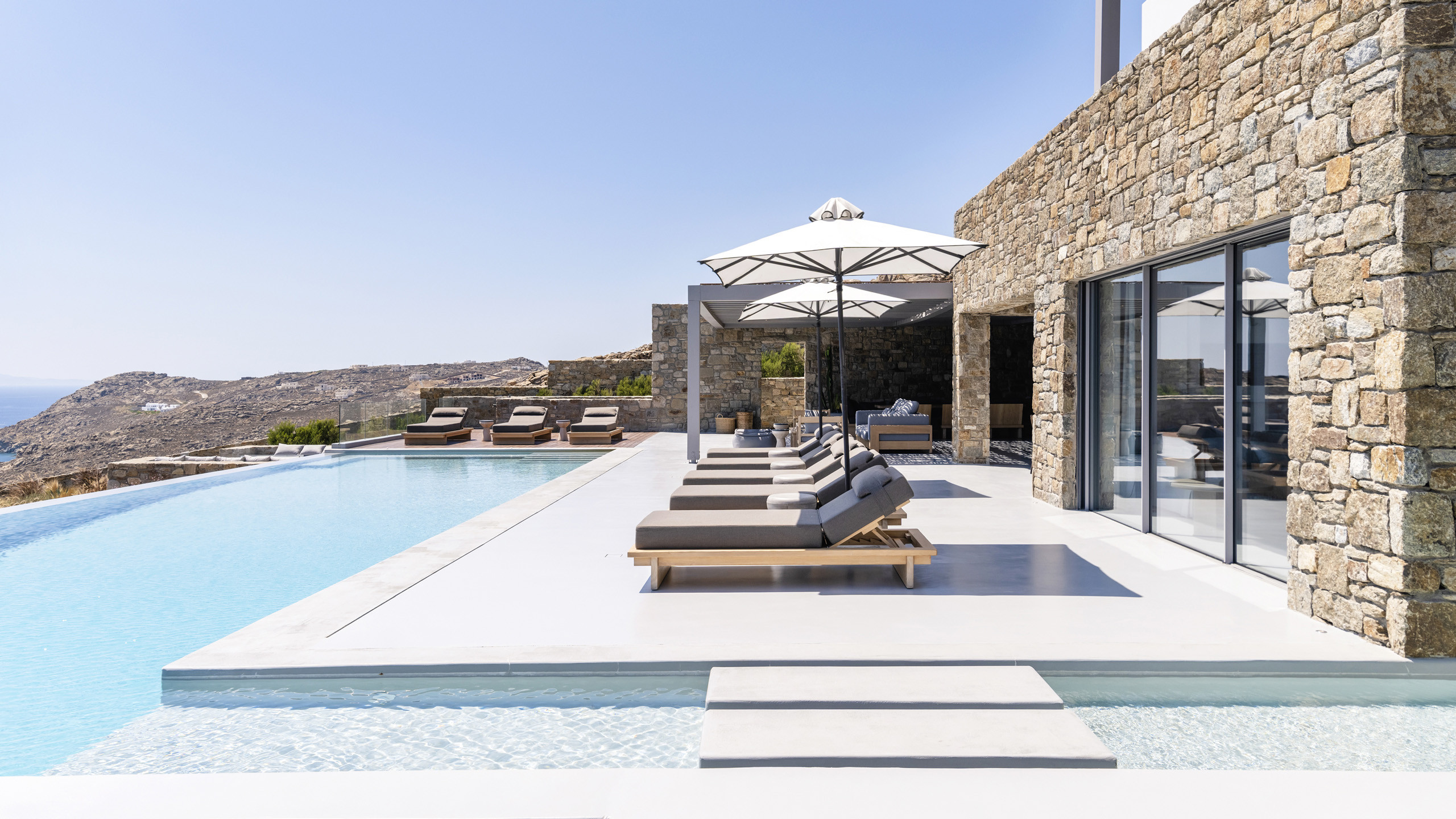 Unravel the charm of Mito, a luxurious villa built in 2022 in the serene area of Elia, Mykonos. Set on a 4,100 m² plot just 250 meters from the beach, Mito offers uninterrupted 180° views of the Aegean, with Paros and Naxos on the horizon. This refined retreat combines Cycladic elegance with modern comfort—featuring an 82 m² infinity pool, stylish sunbathing lounges, and an open-air fireplace perfect for sunset cocktails.
