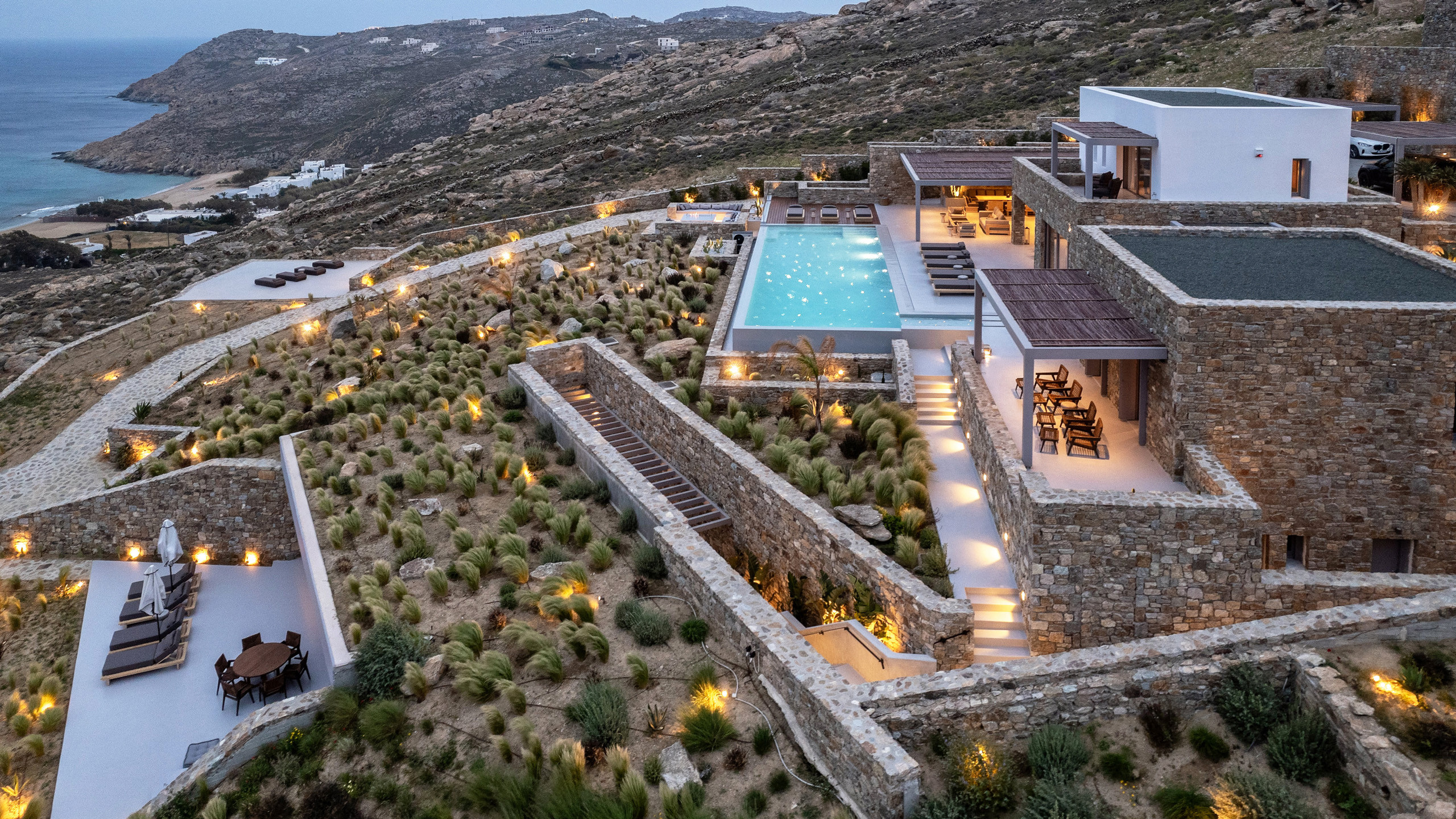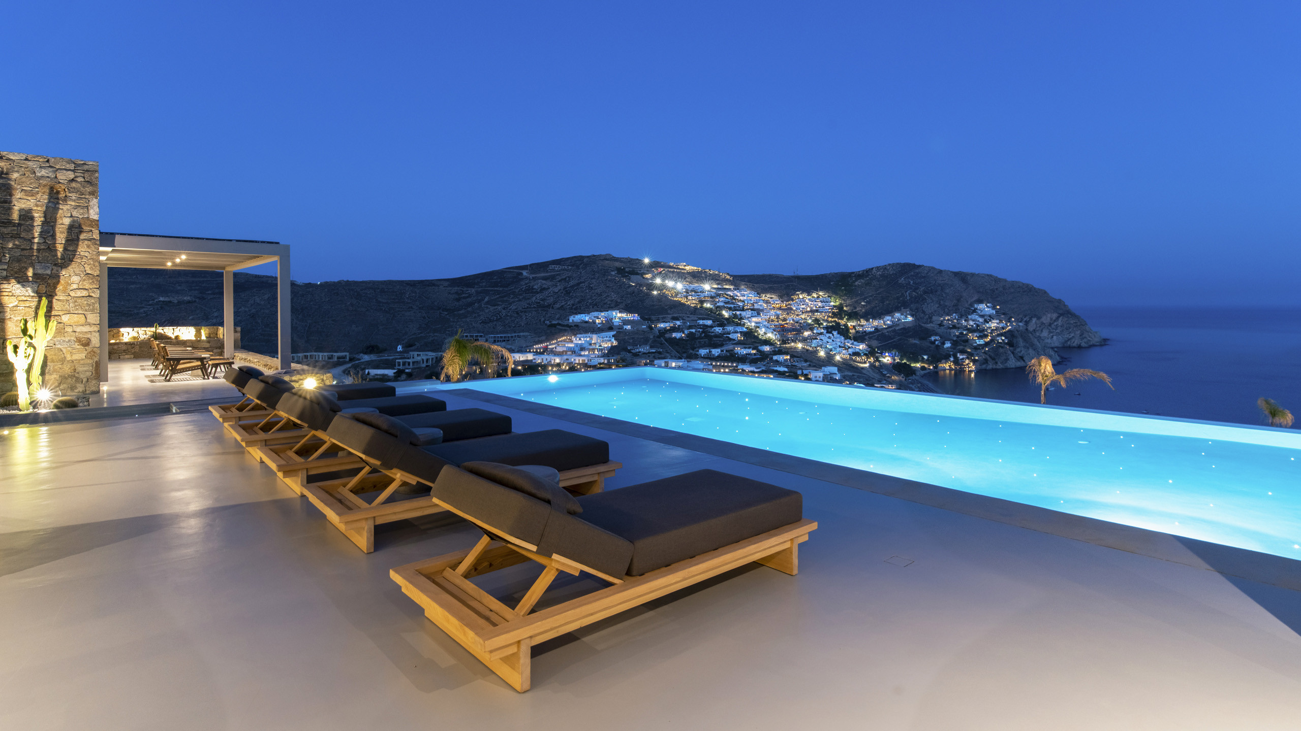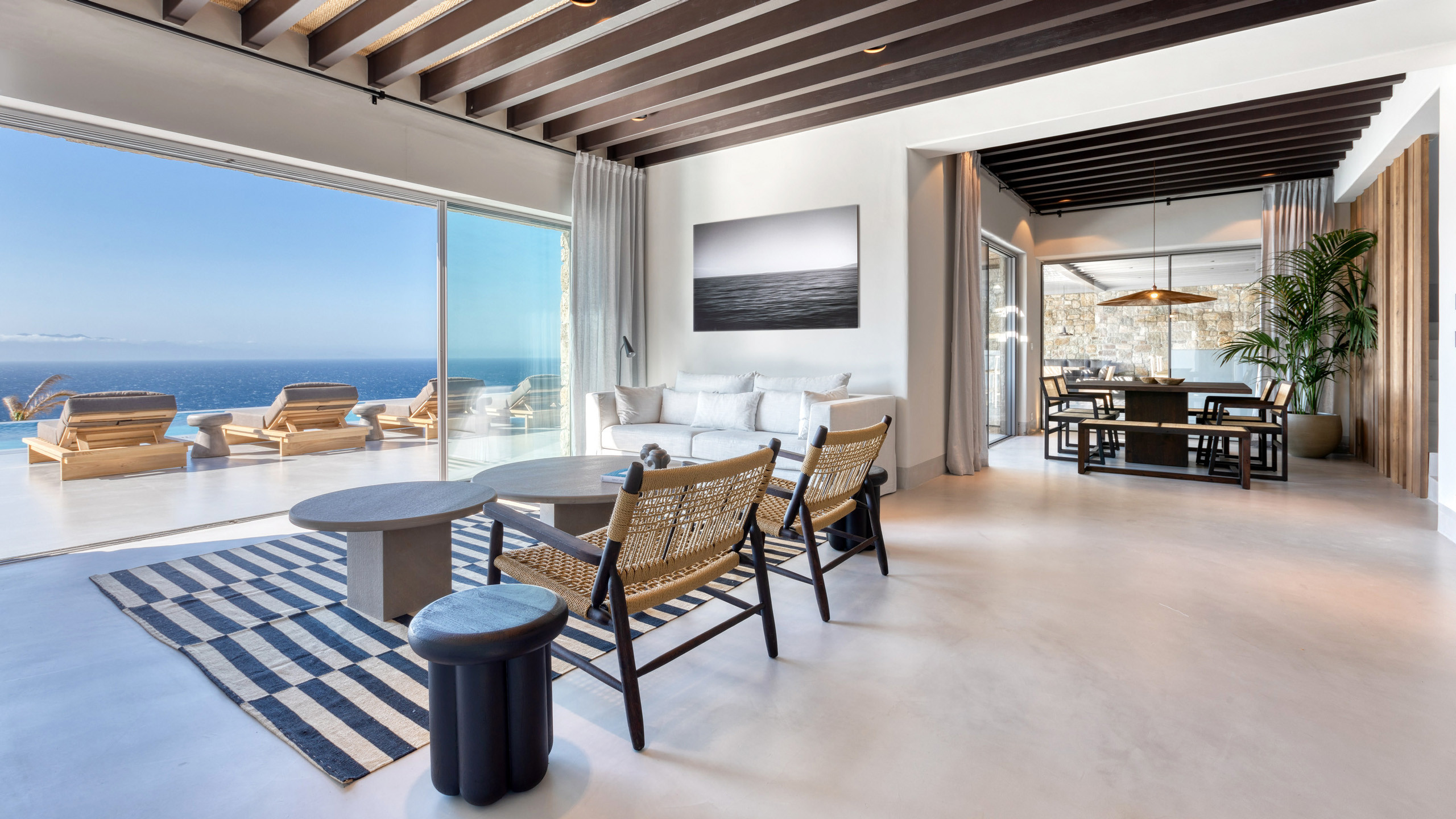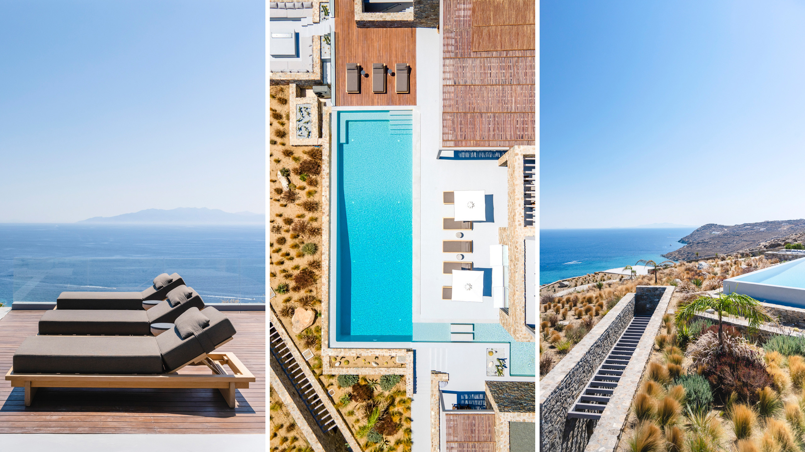 Unravel the charm of Mito, a luxurious villa built in 2022 in the serene area of Elia, Mykonos. Set on a 4,100 m² plot just 250 meters from the beach, Mito offers uninterrupted 180° views of the Aegean, with Paros and Naxos on the horizon. This refined retreat combines Cycladic elegance with modern comfort—featuring an 82 m² infinity pool, stylish sunbathing lounges, and an open-air fireplace perfect for sunset cocktails.