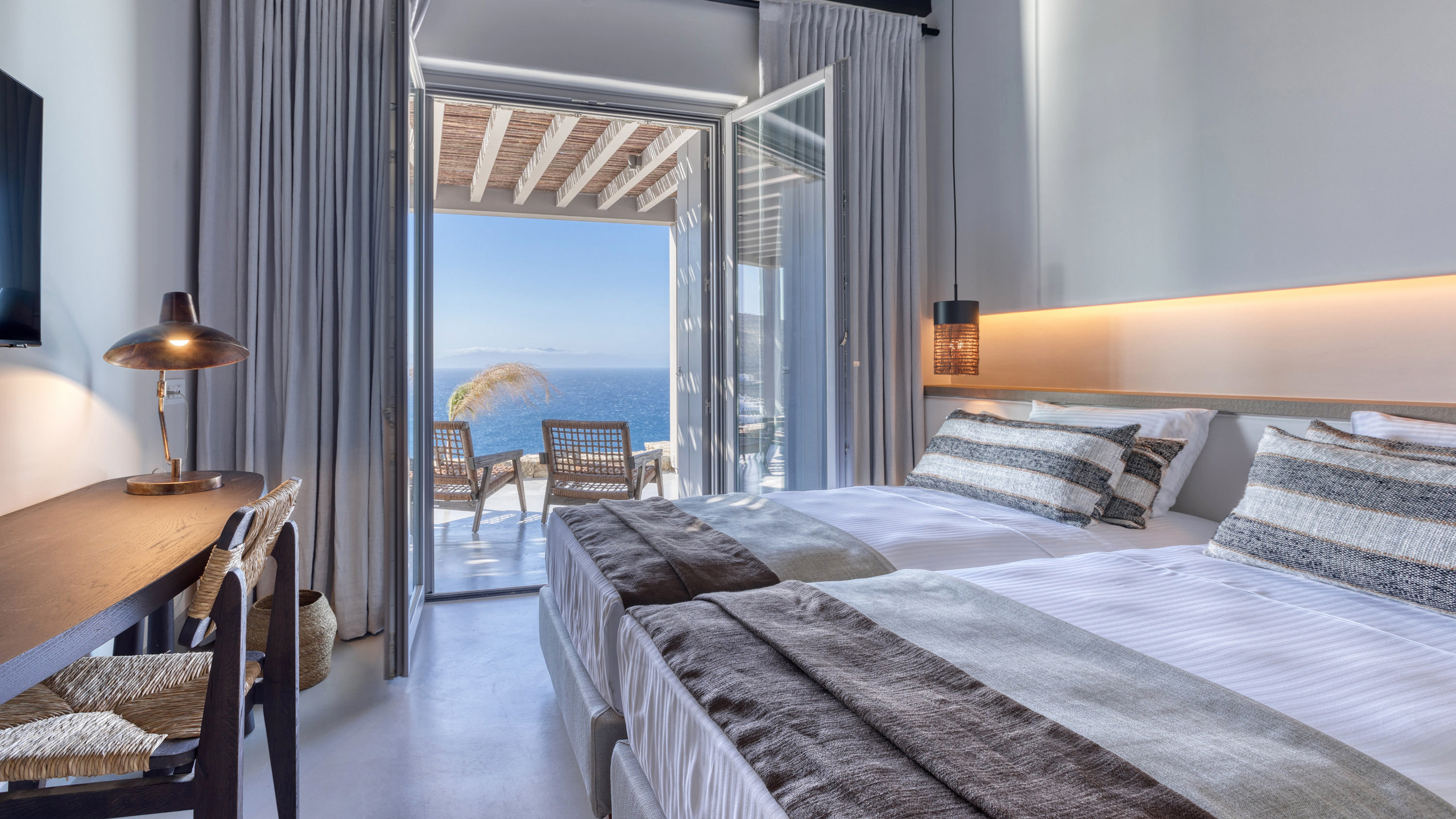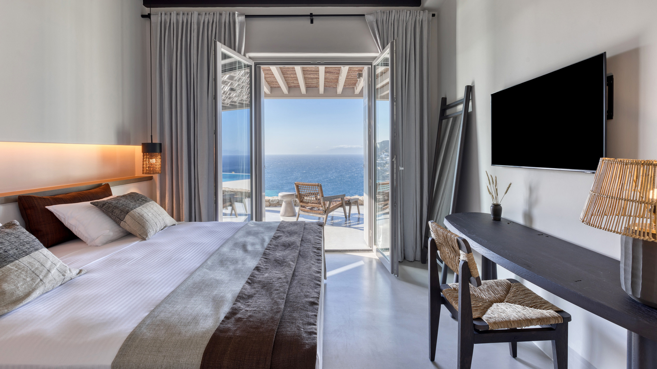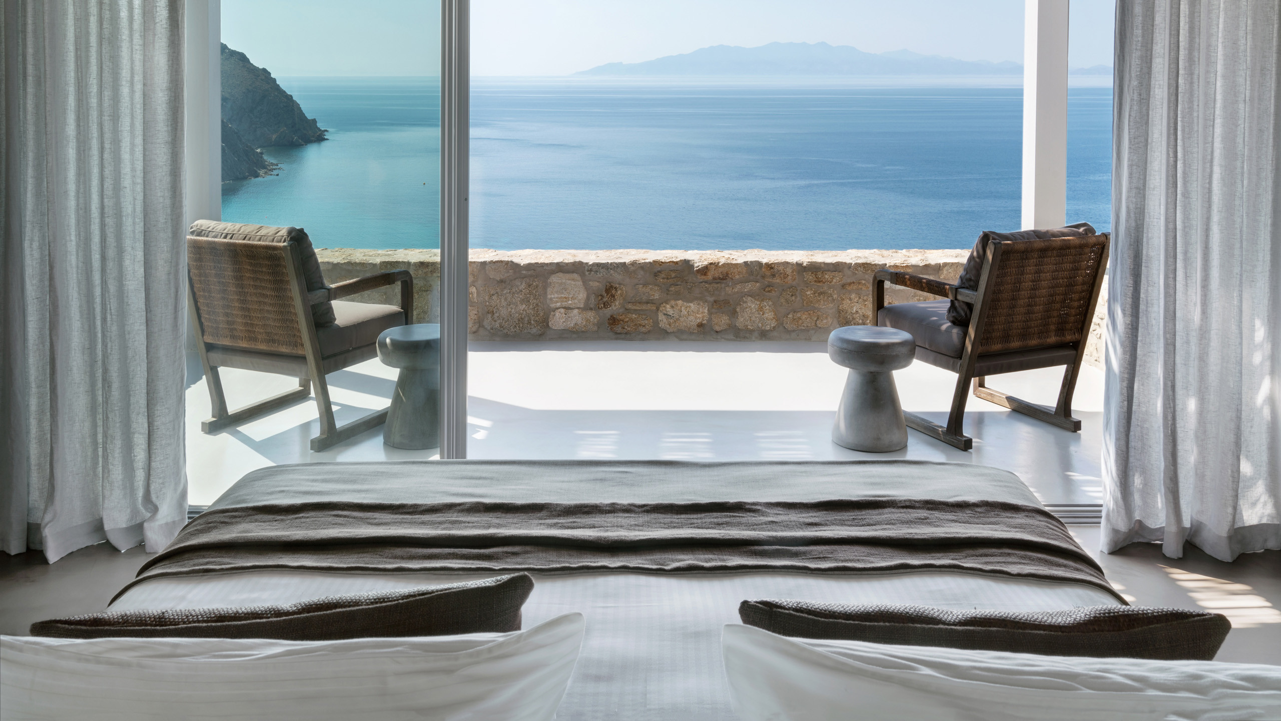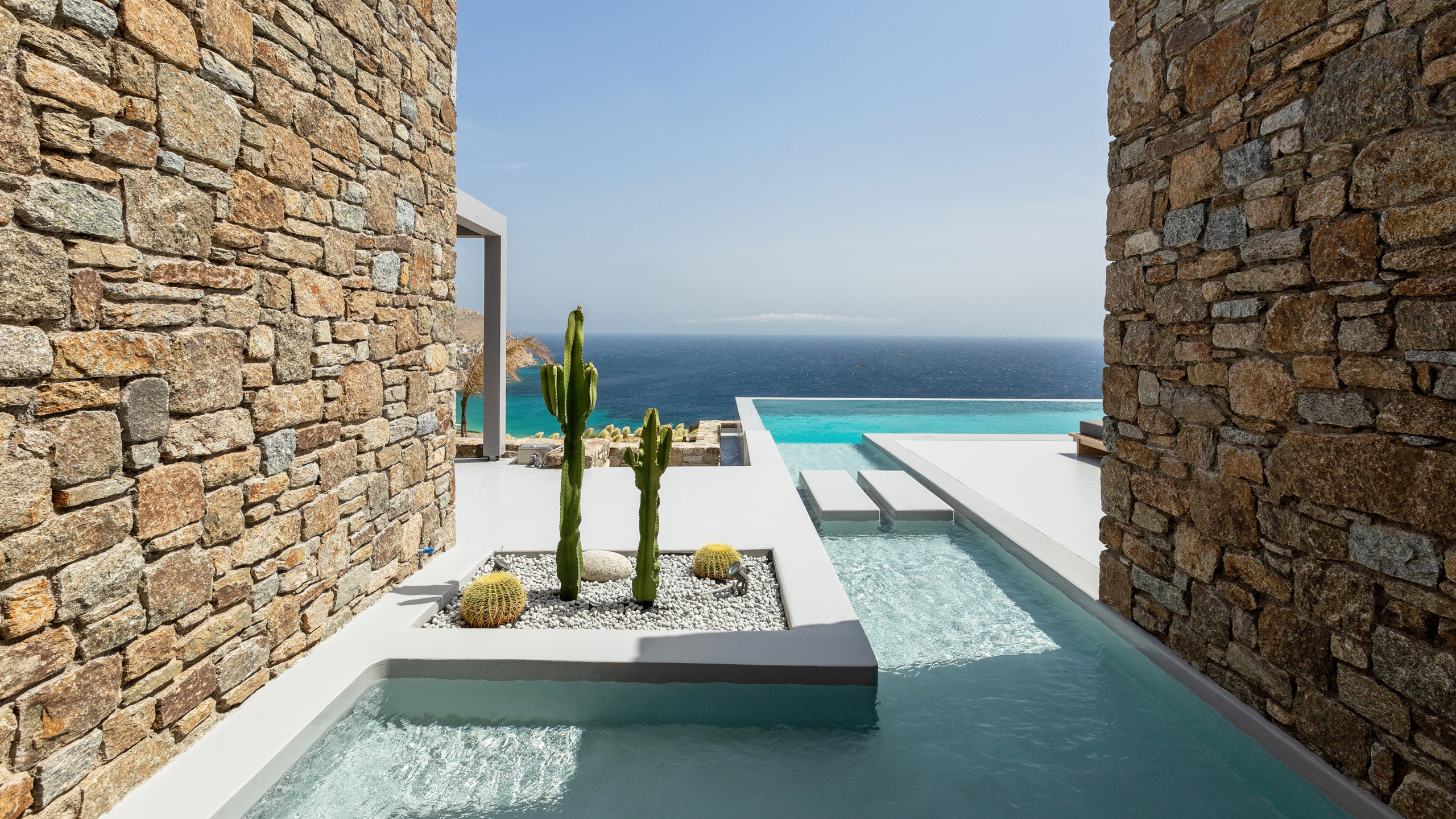 Unravel the charm of Mito, a luxurious villa built in 2022 in the serene area of Elia, Mykonos. Set on a 4,100 m² plot just 250 meters from the beach, Mito offers uninterrupted 180° views of the Aegean, with Paros and Naxos on the horizon. This refined retreat combines Cycladic elegance with modern comfort—featuring an 82 m² infinity pool, stylish sunbathing lounges, and an open-air fireplace perfect for sunset cocktails.