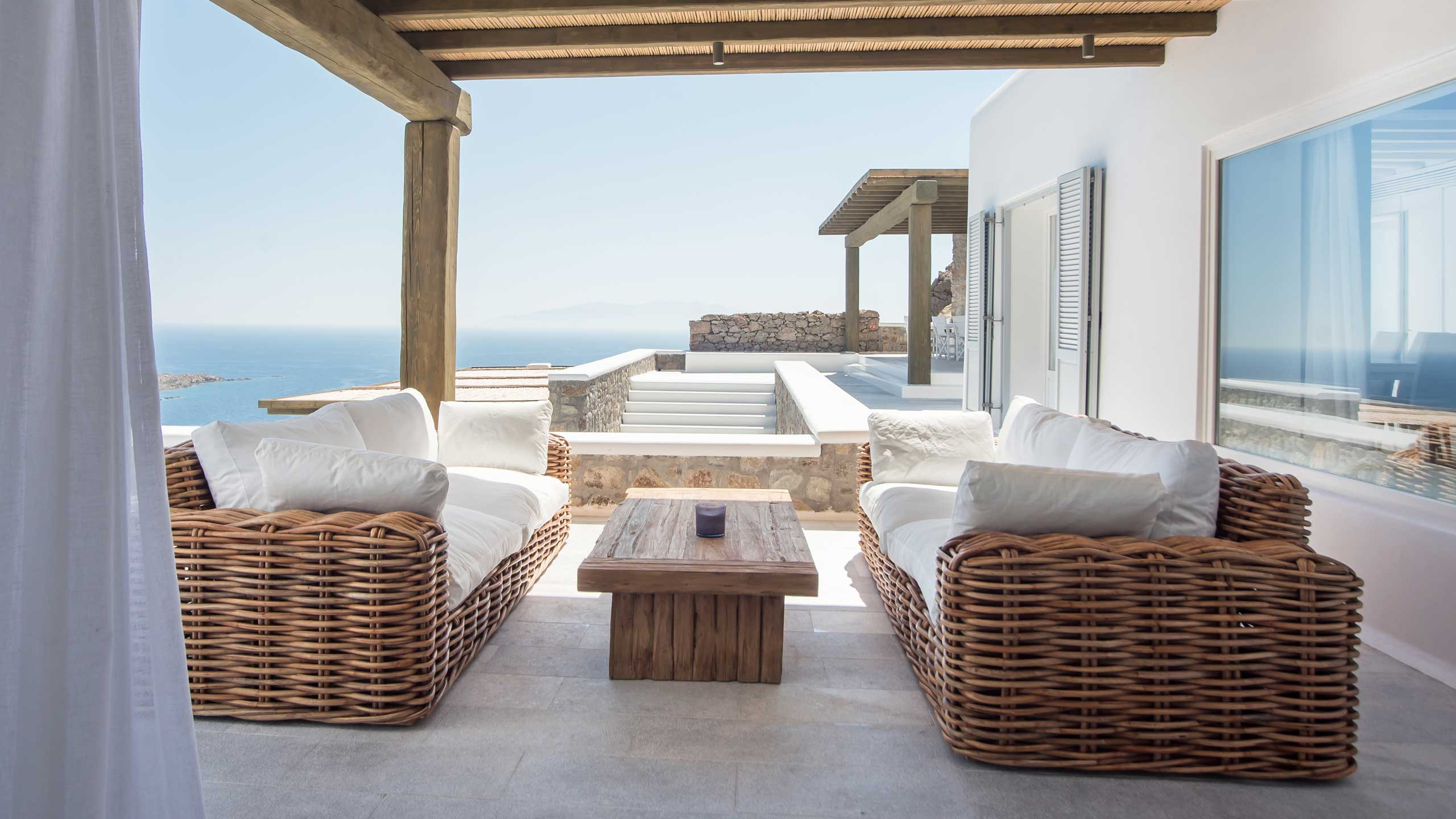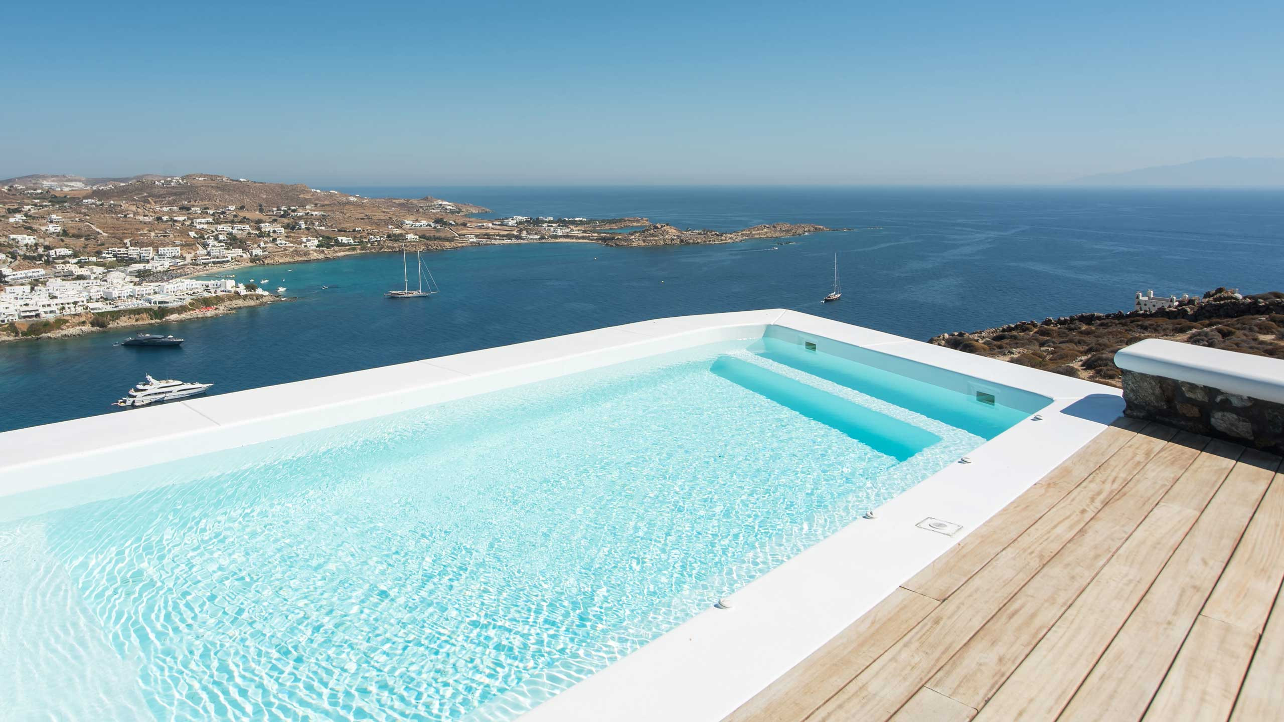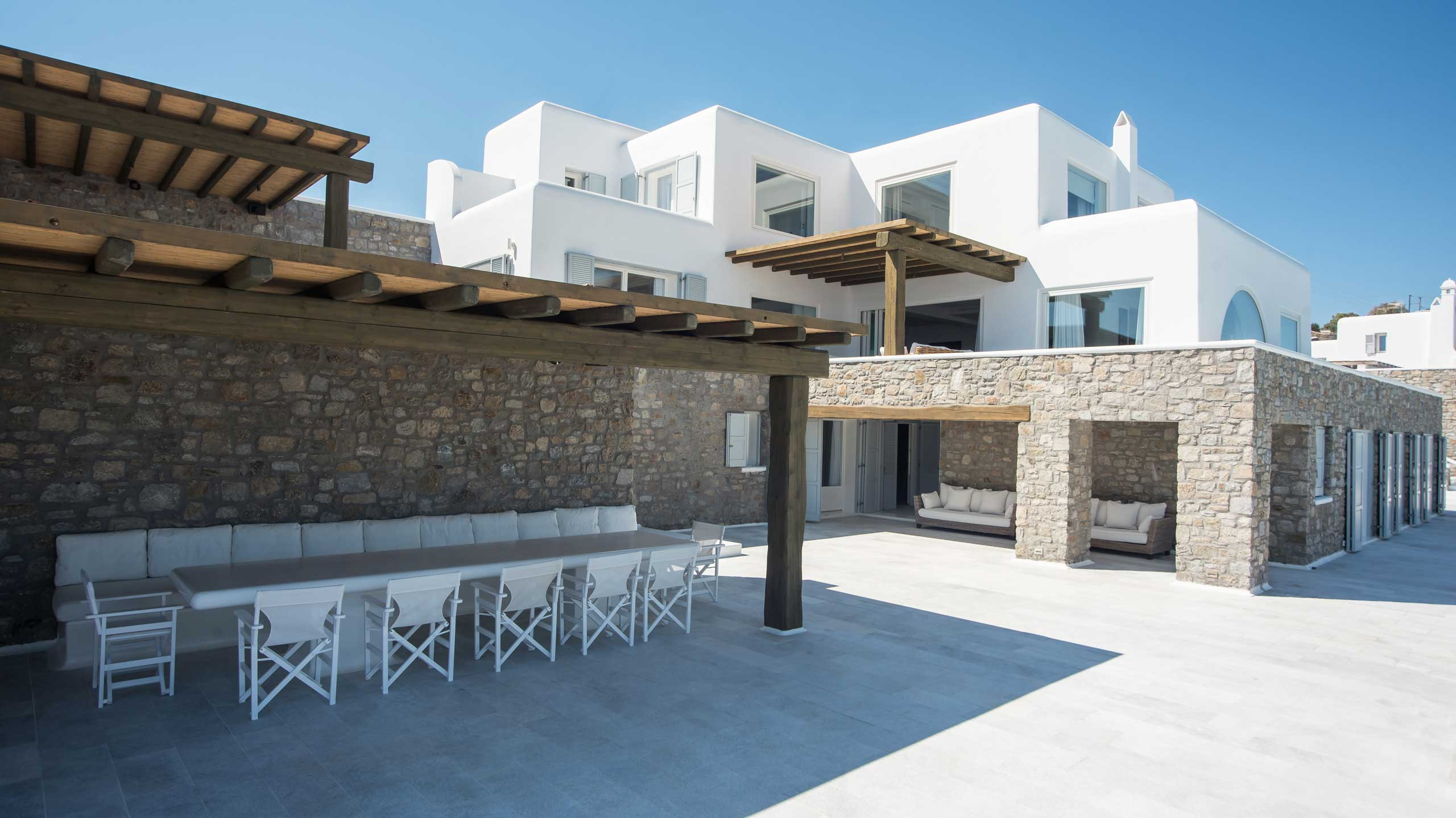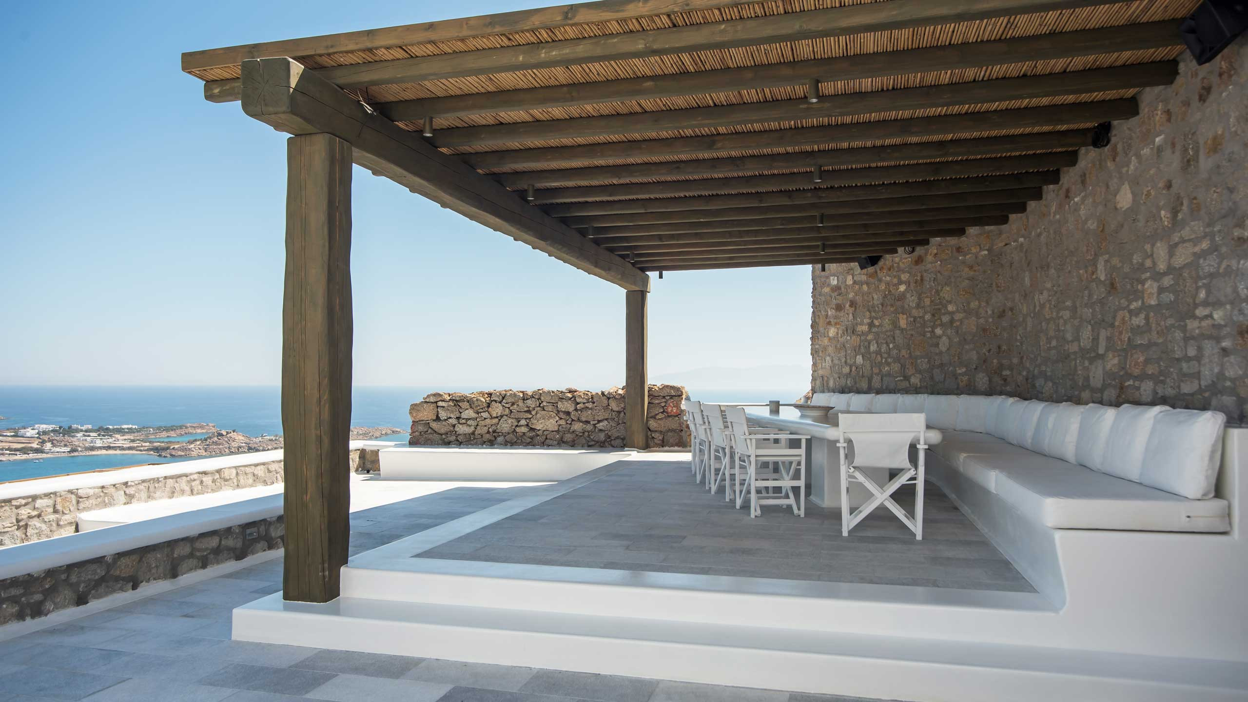 The villa boasts extensive outdoor spaces, including large terraces furnished with sun loungers and inviting sofas, where the centerpiece is the sublime pool, complemented by a heated Jacuzzi, a shaded bar area, and two dining tables under pergolas. Whether you want to relax, party, or simply enjoy the stunning surroundings, Nafsica provides the perfect summer retreat.