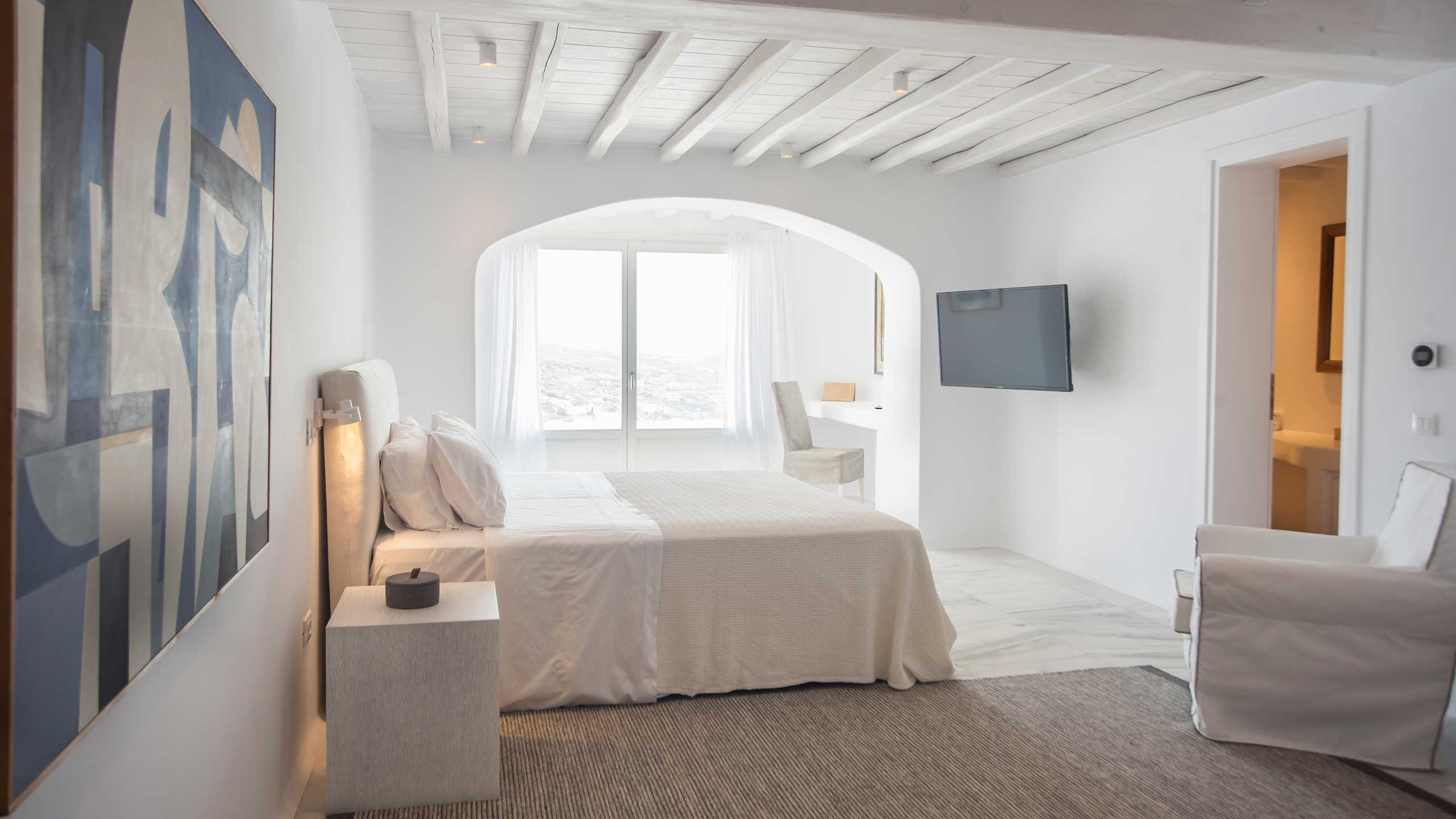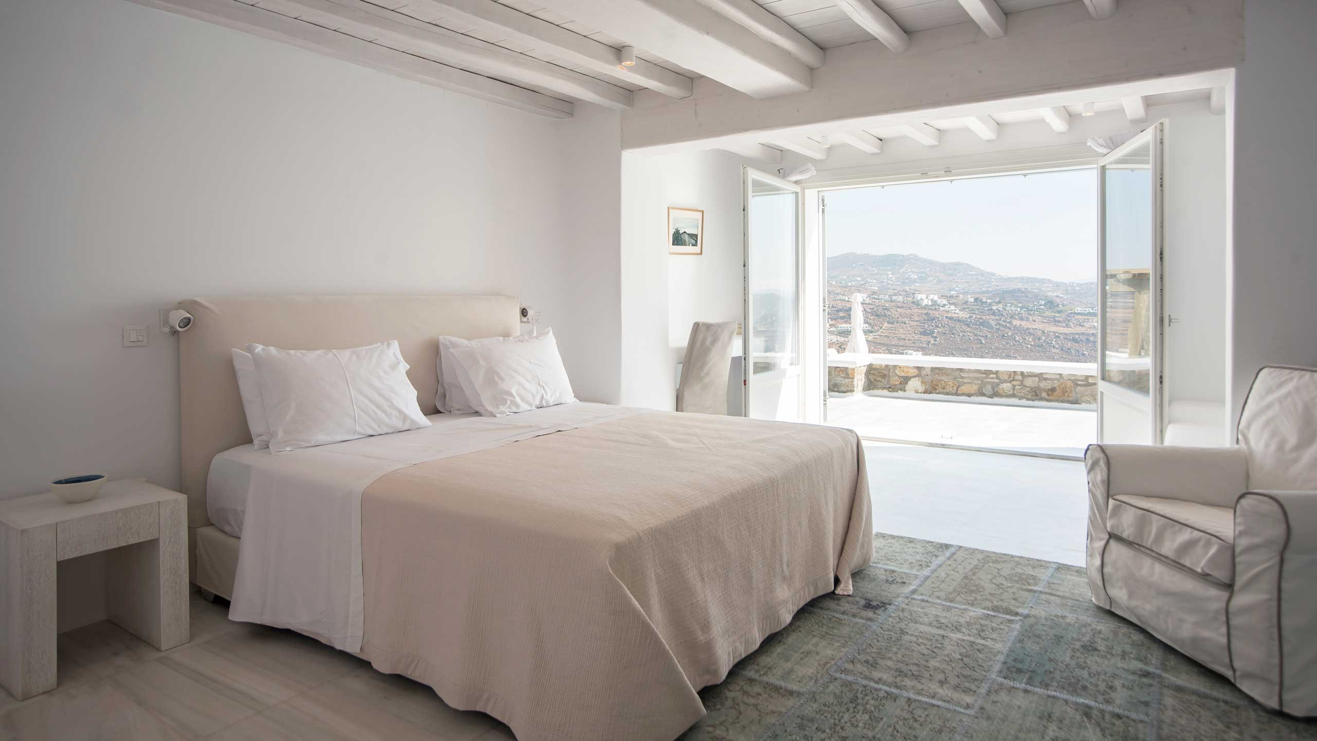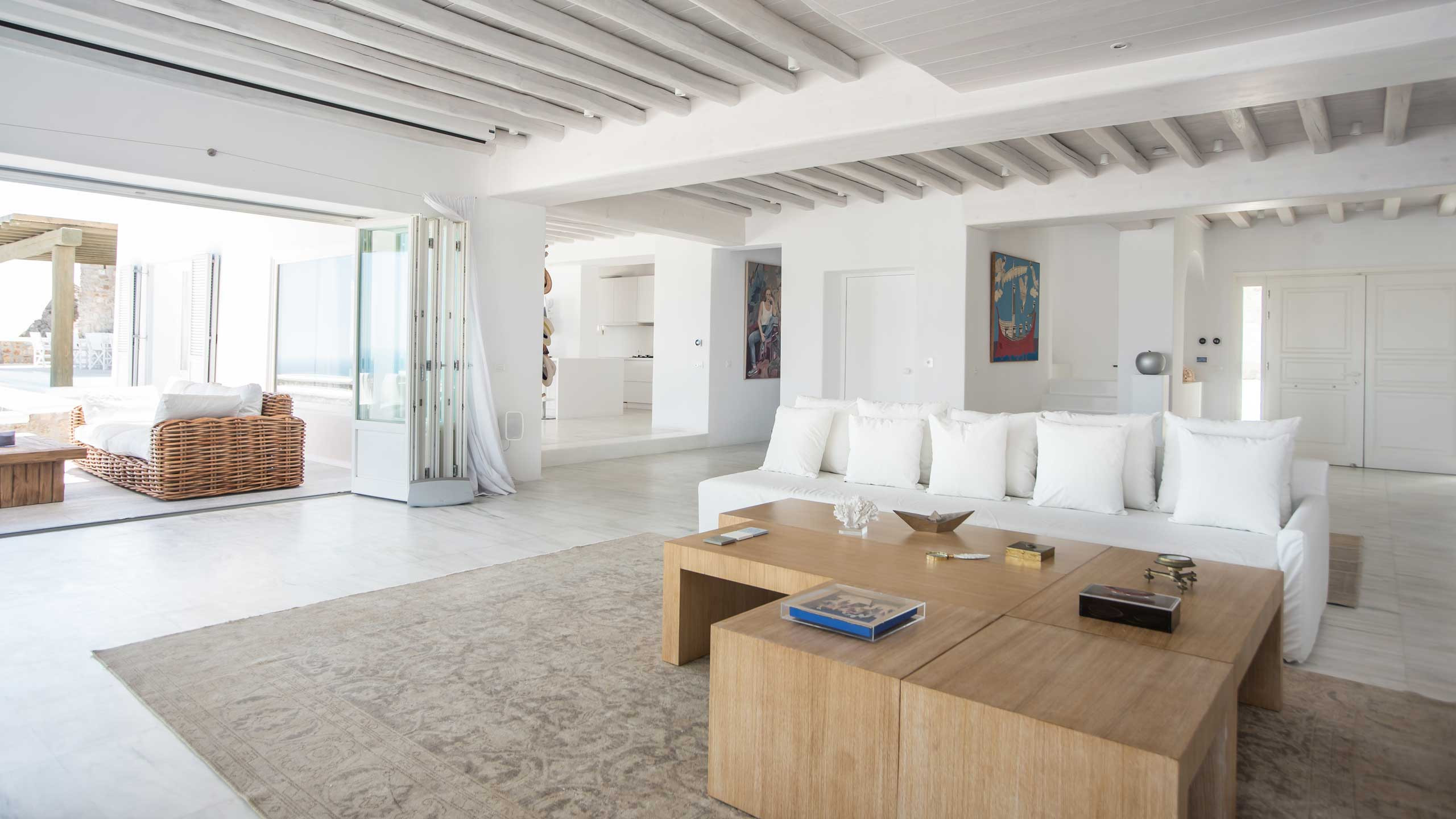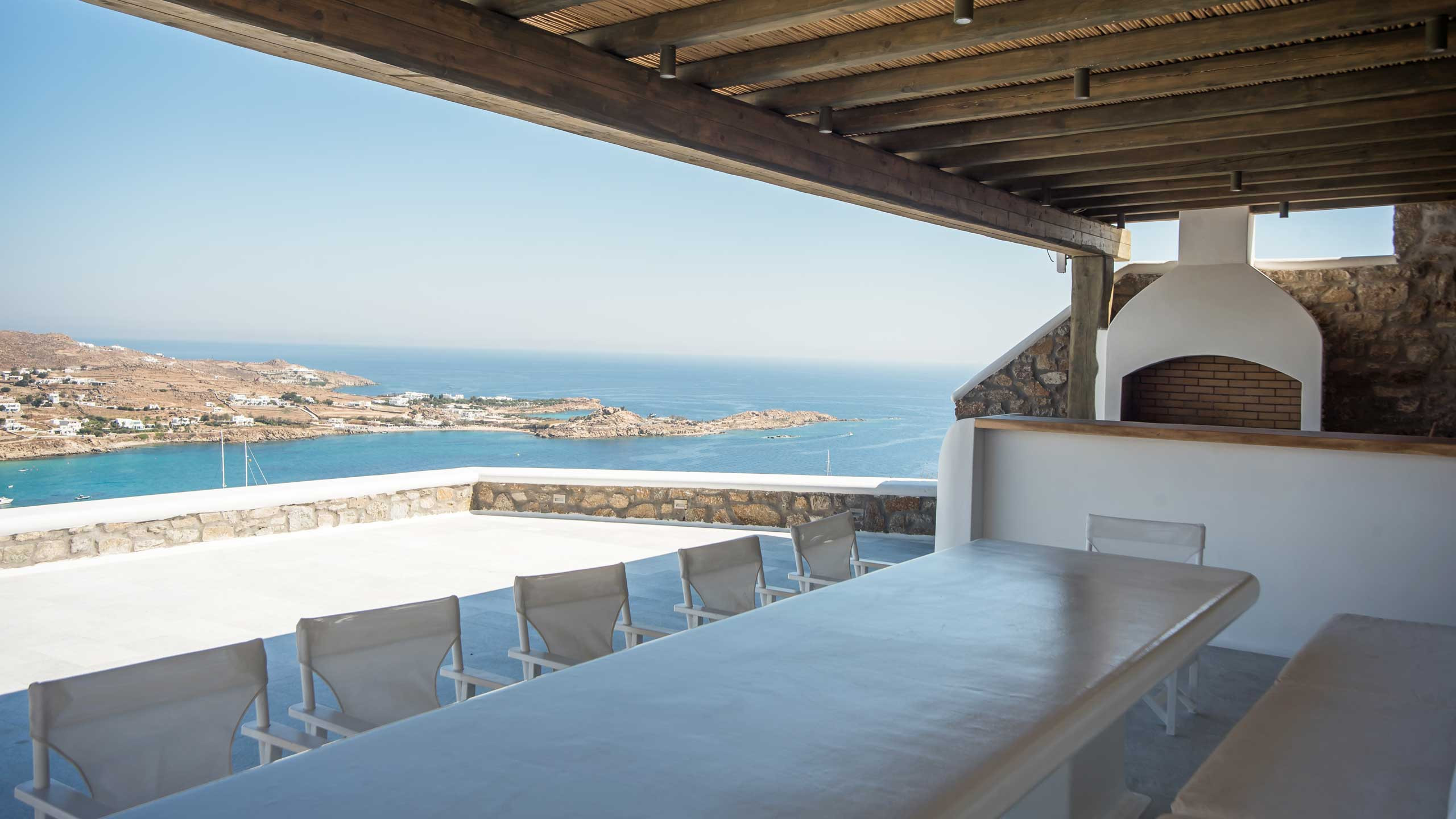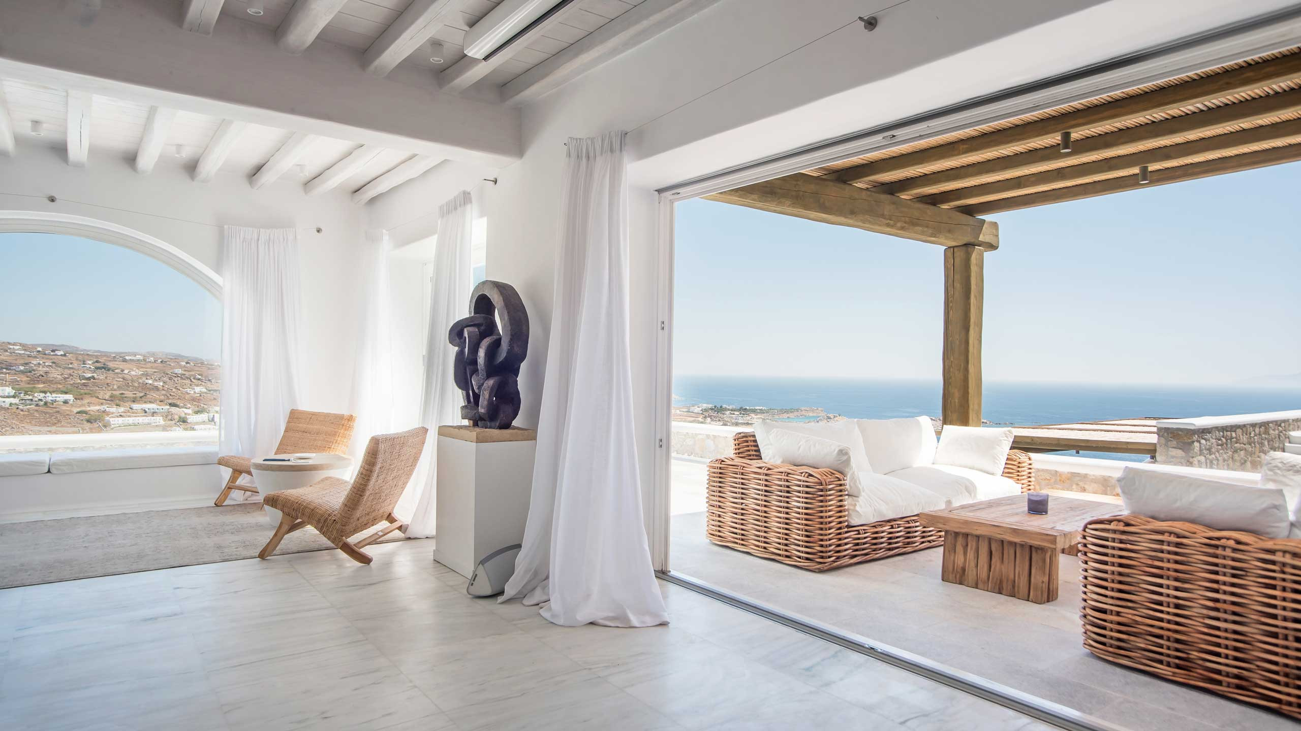 The villa boasts extensive outdoor spaces, including large terraces furnished with sun loungers and inviting sofas, where the centerpiece is the sublime pool, complemented by a heated Jacuzzi, a shaded bar area, and two dining tables under pergolas. Whether you want to relax, party, or simply enjoy the stunning surroundings, Nafsica provides the perfect summer retreat.