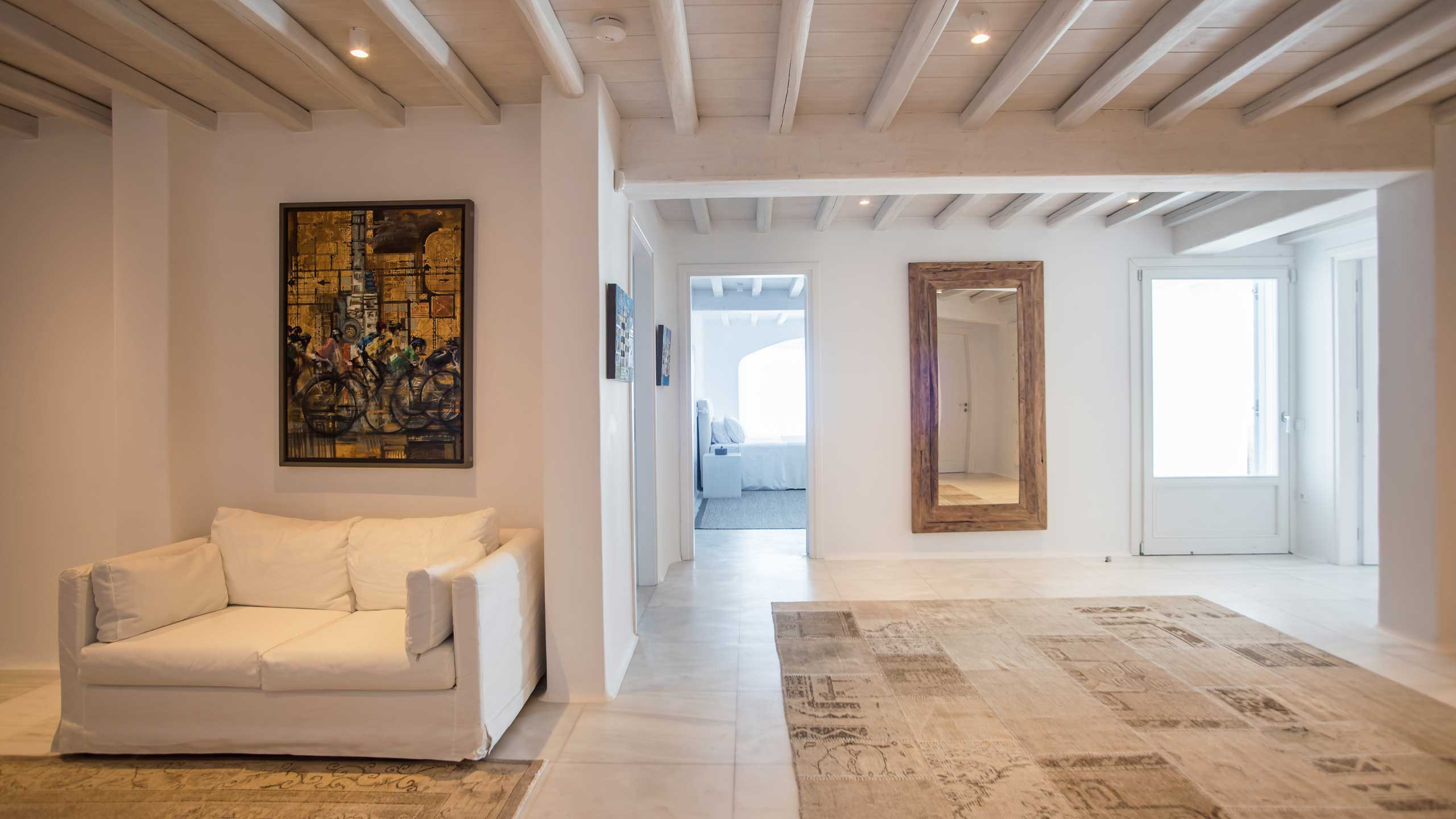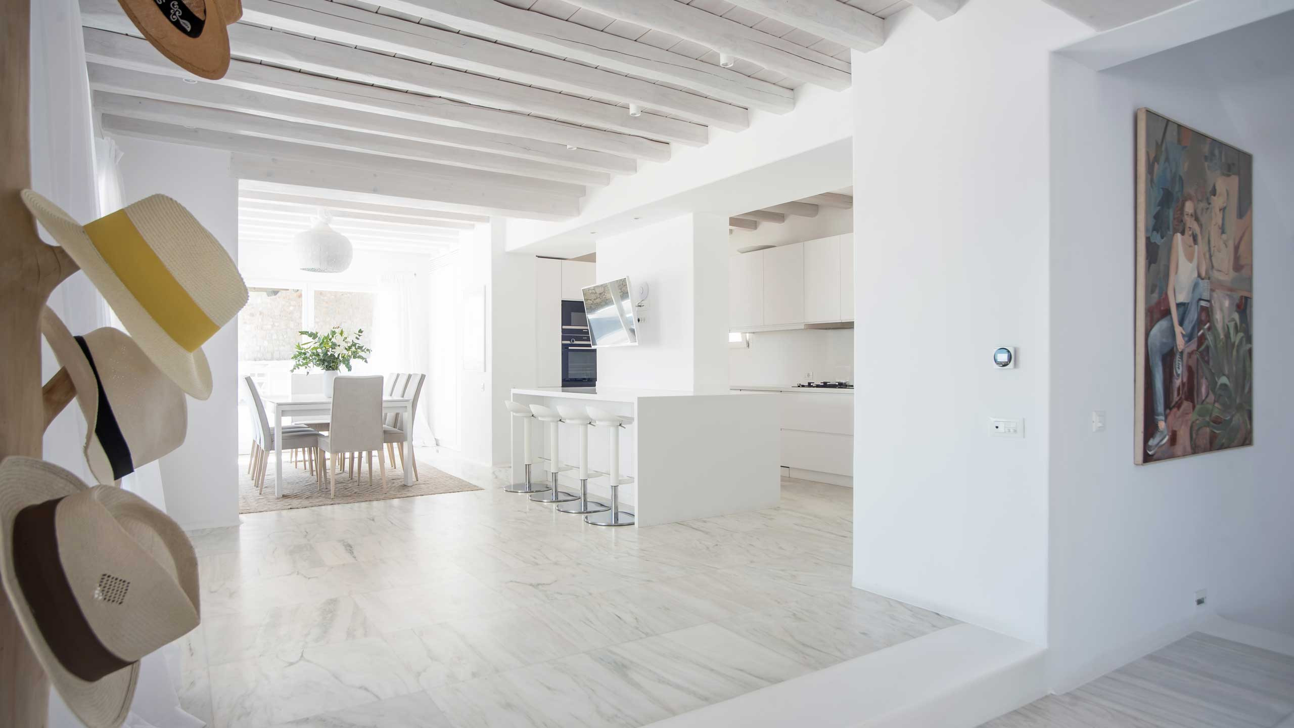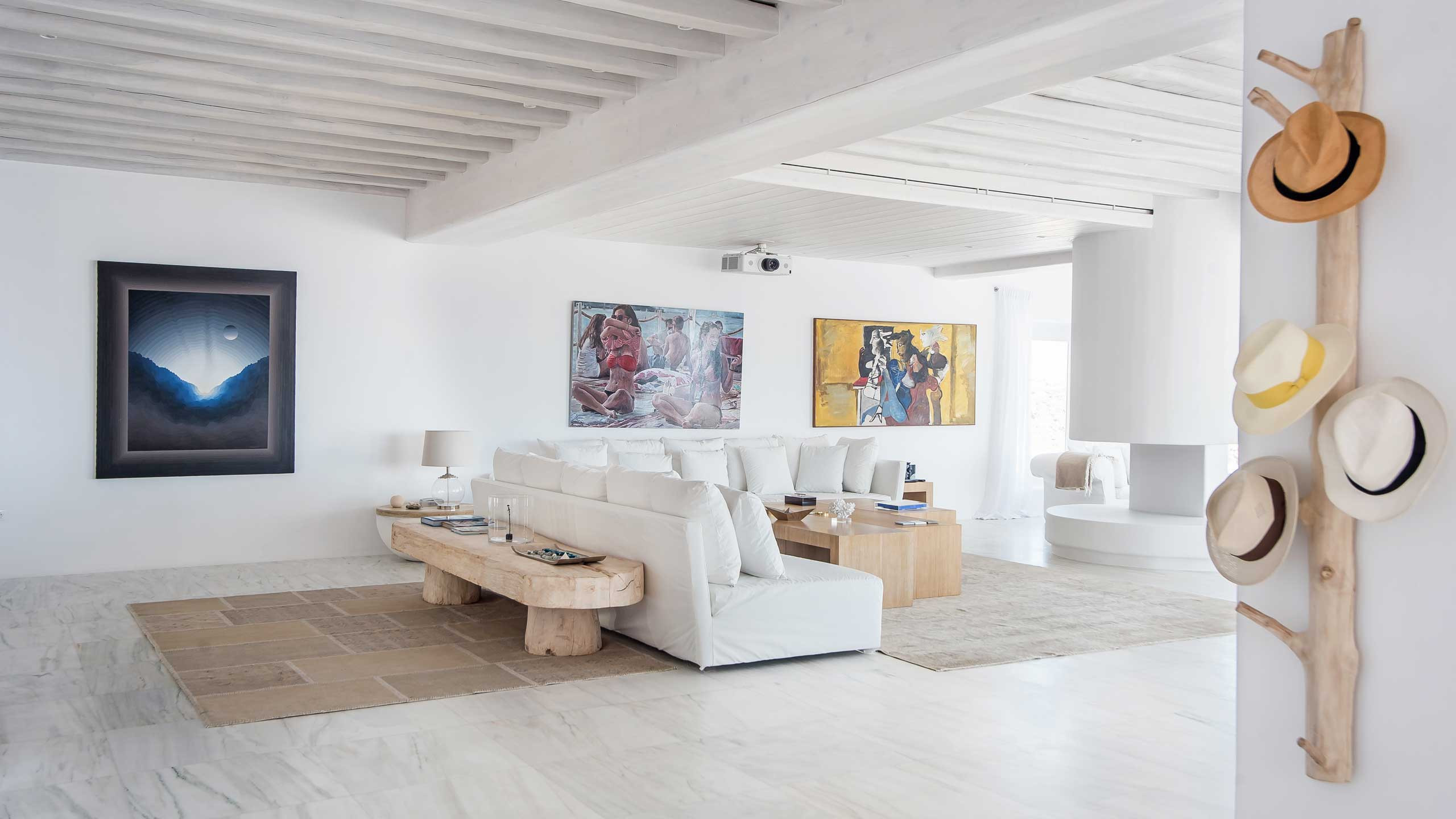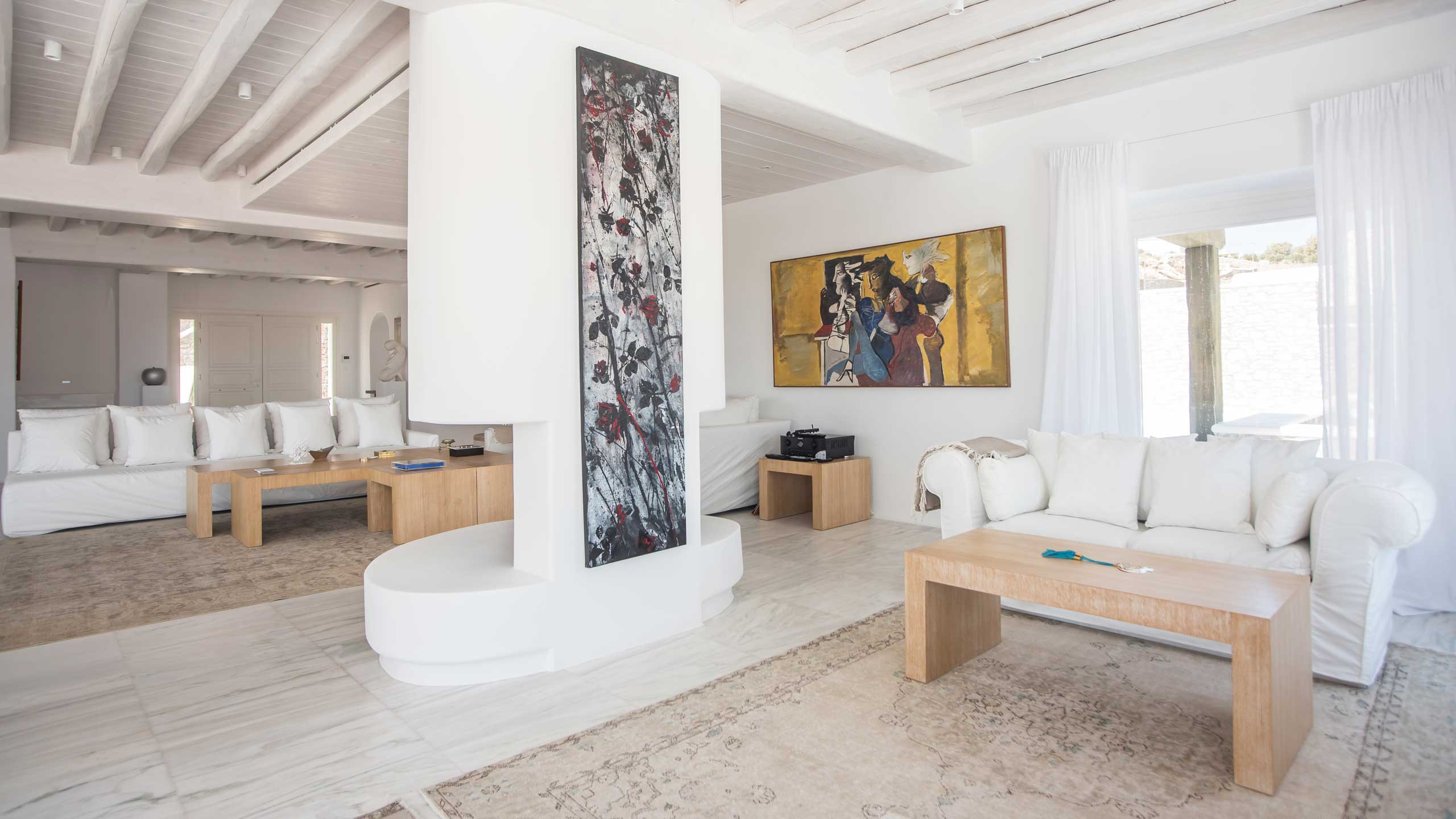 The villa boasts extensive outdoor spaces, including large terraces furnished with sun loungers and inviting sofas, where the centerpiece is the sublime pool, complemented by a heated Jacuzzi, a shaded bar area, and two dining tables under pergolas. Whether you want to relax, party, or simply enjoy the stunning surroundings, Nafsica provides the perfect summer retreat.