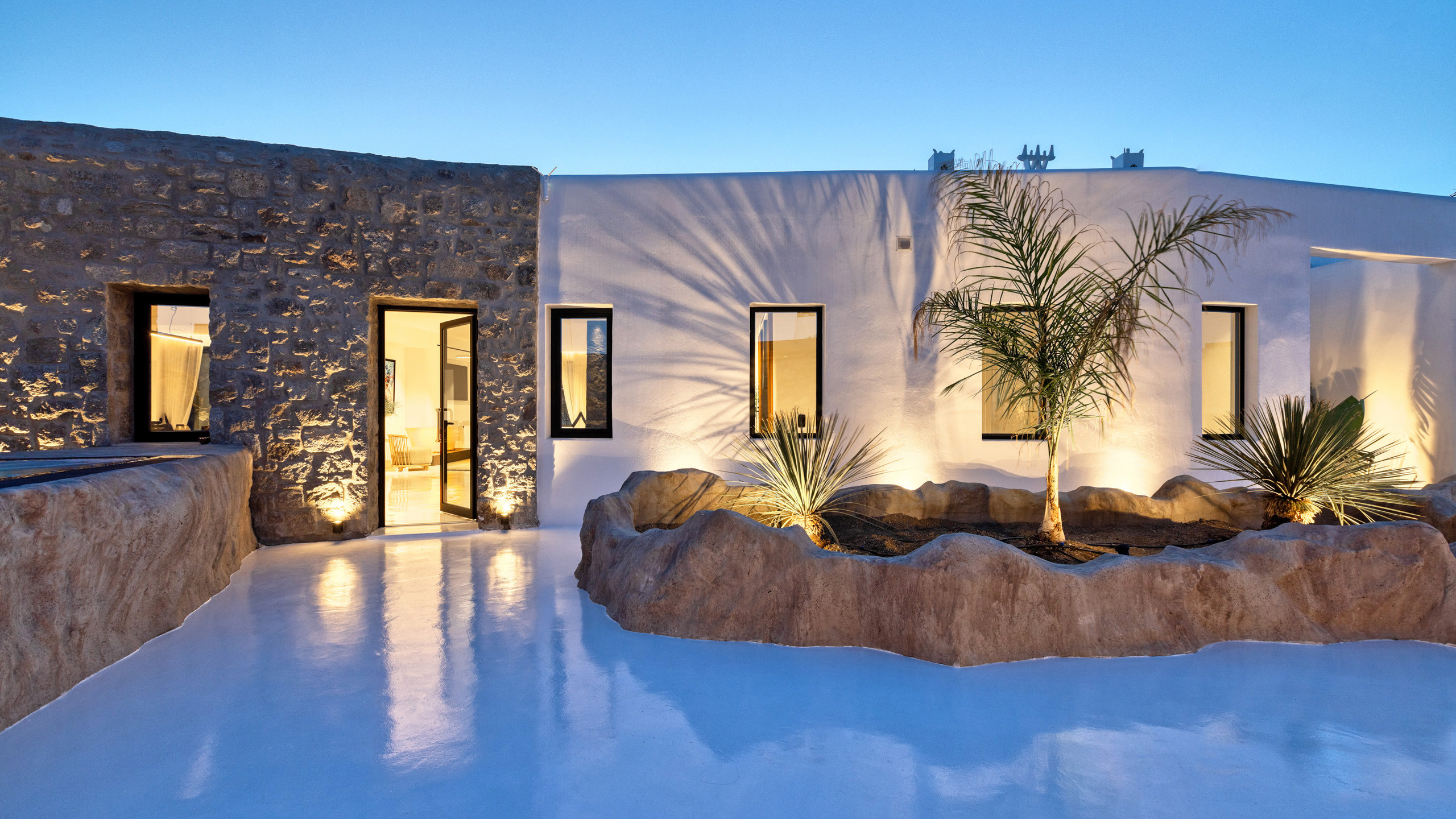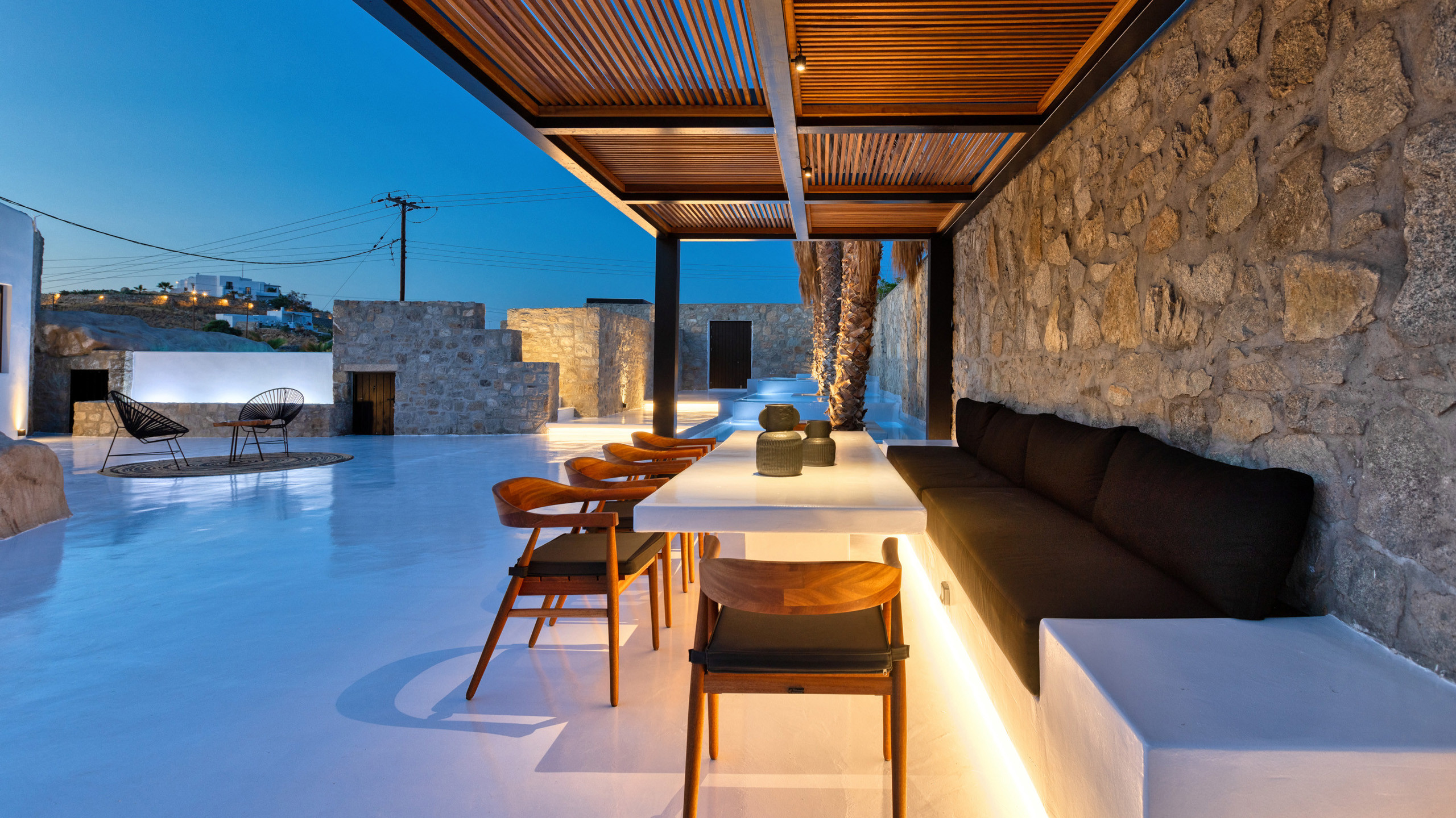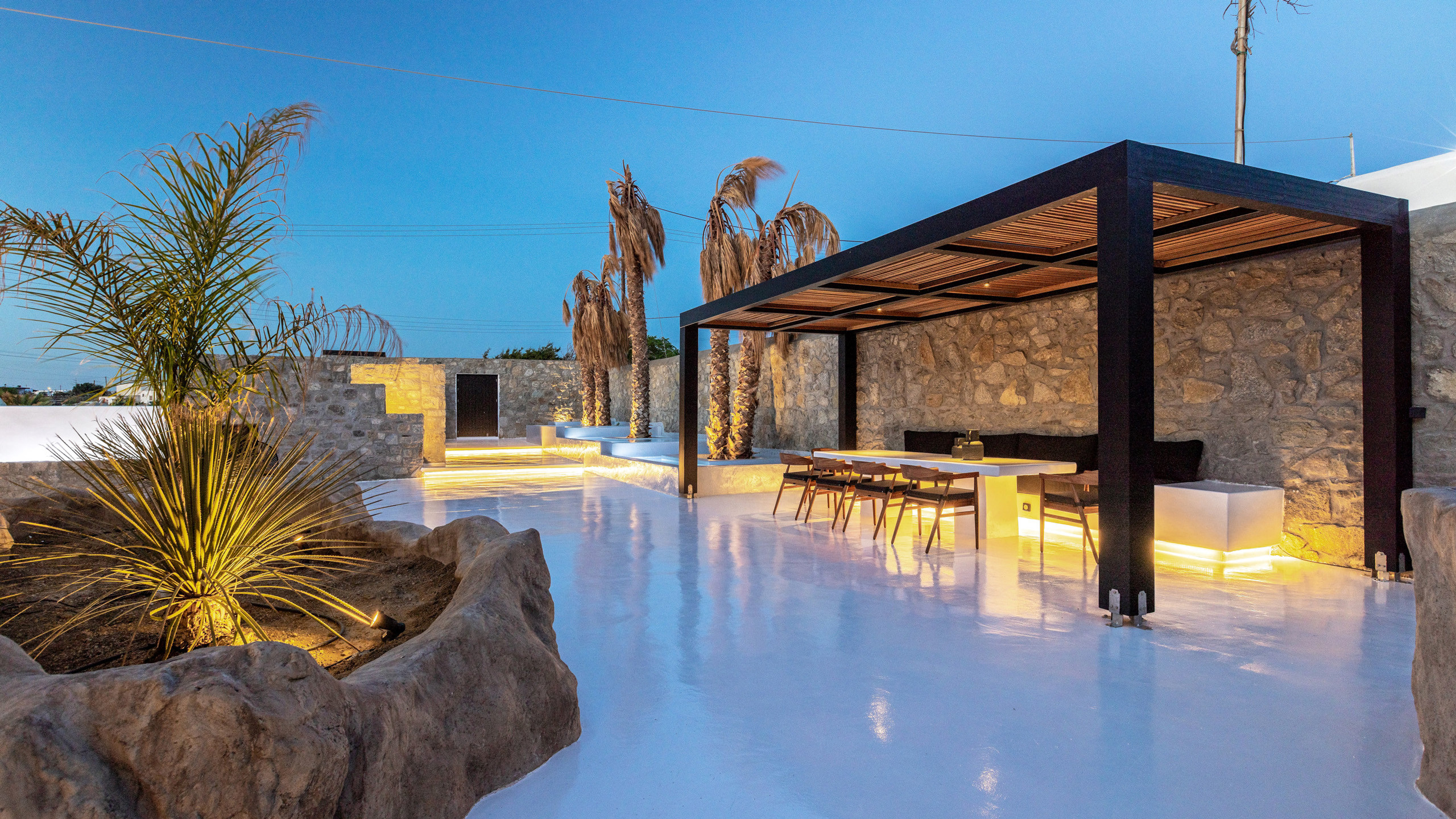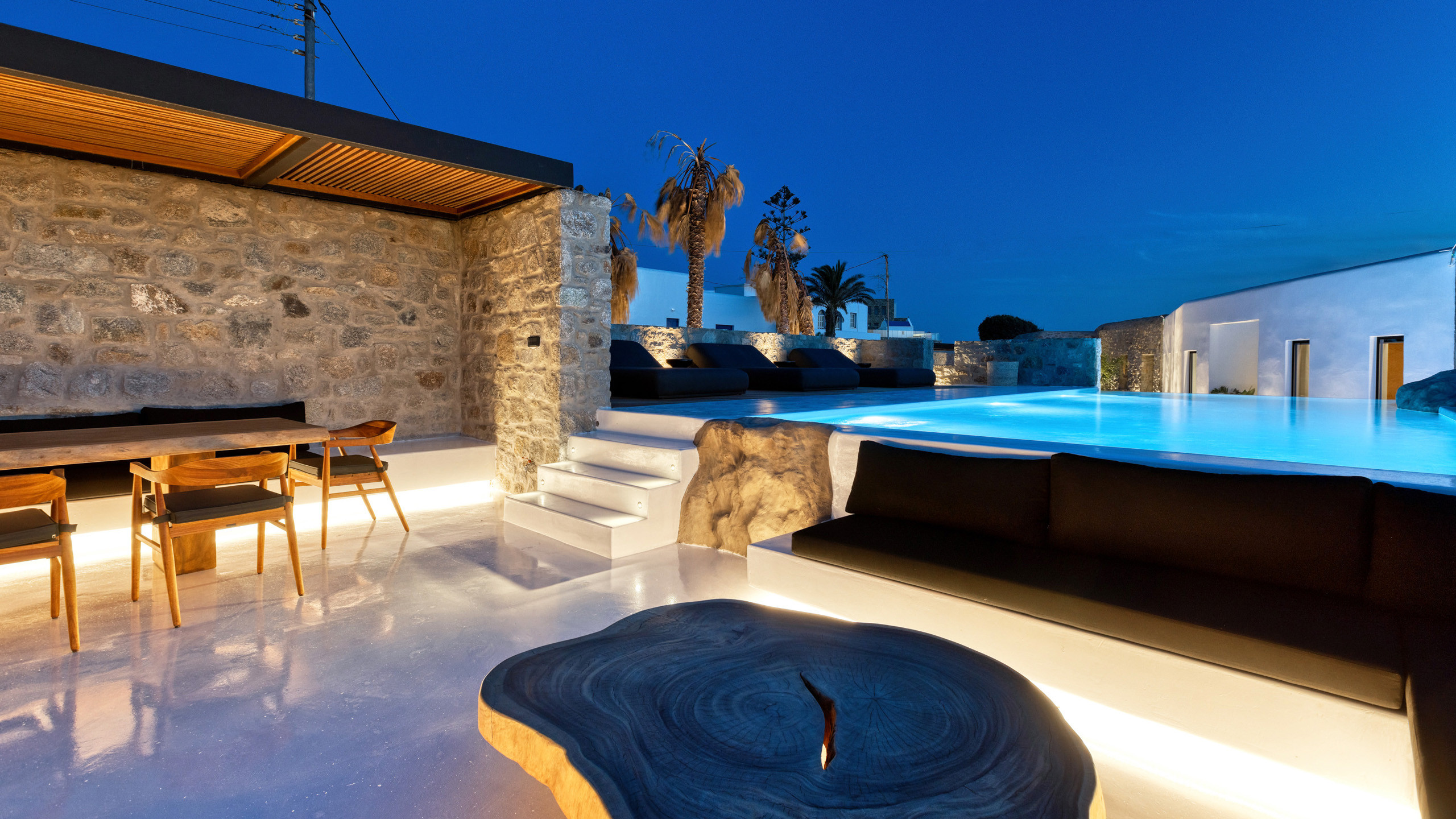 The outdoor spaces are used rationally, with various relaxation areas for guests, a dining area shaded by a pergola, and the inevitable private pool. The furnishings and evening lighting display a clear contemporary style with a well-defined aesthetic, particularly appreciated in this Cycladic region.