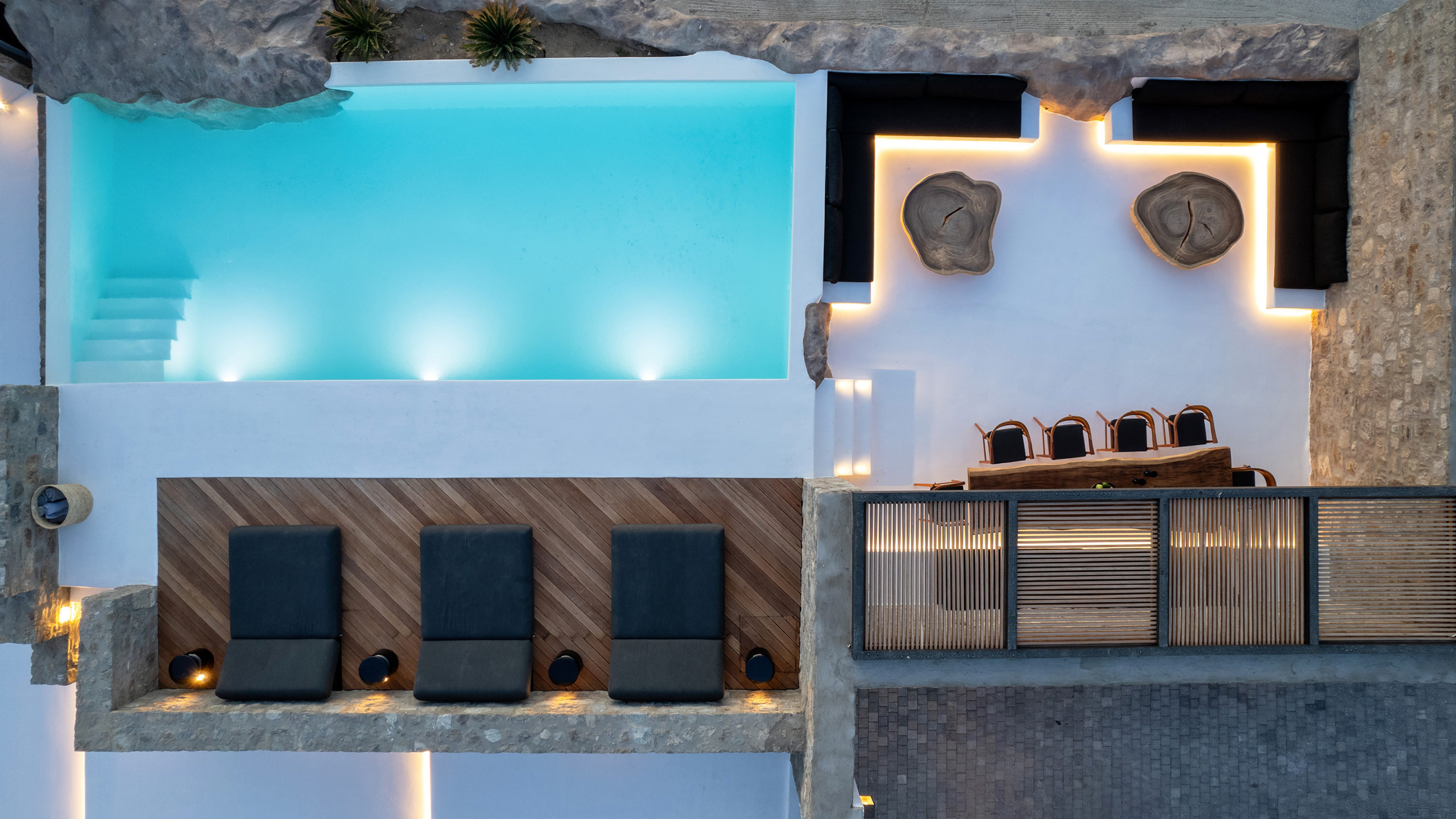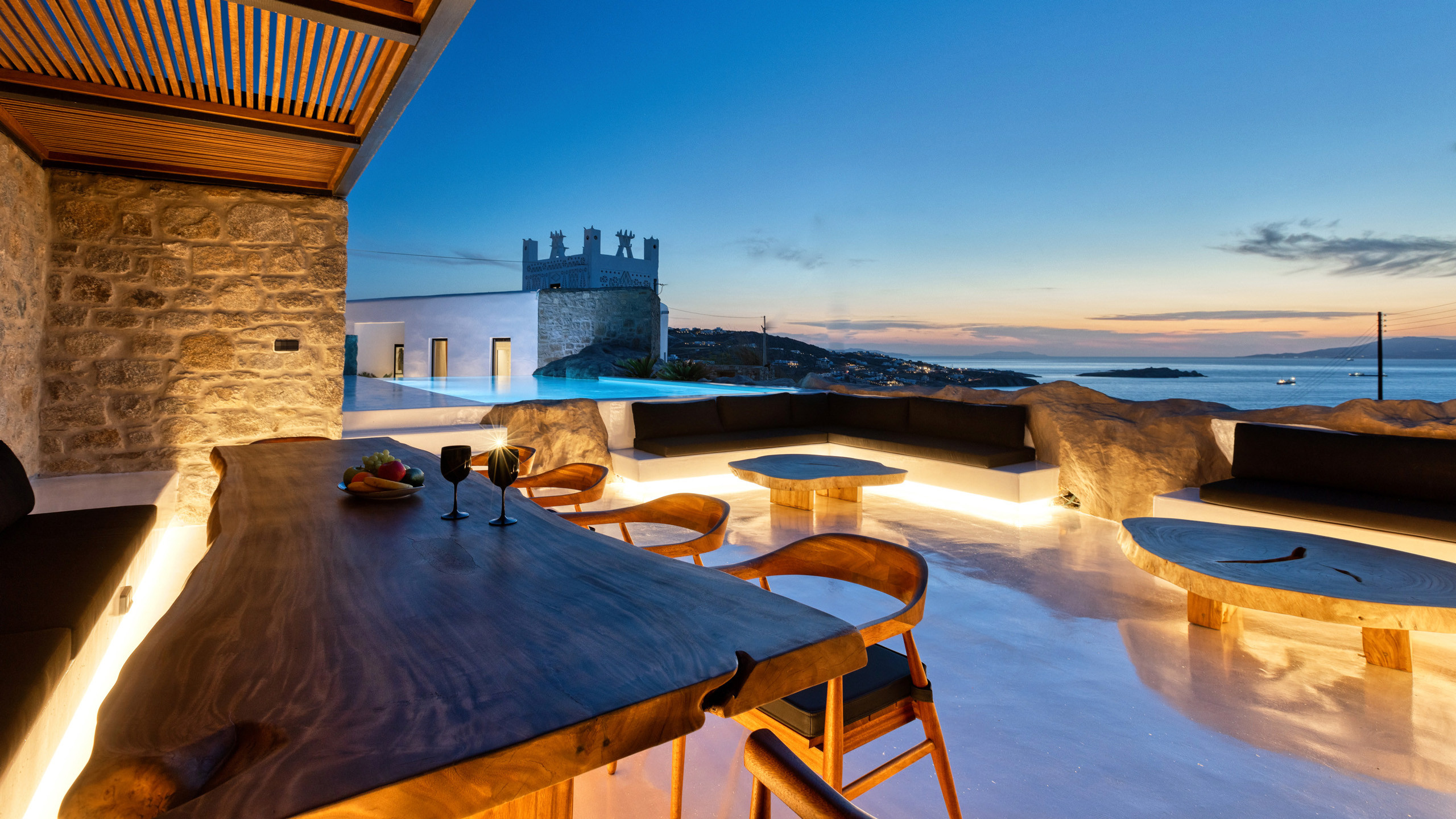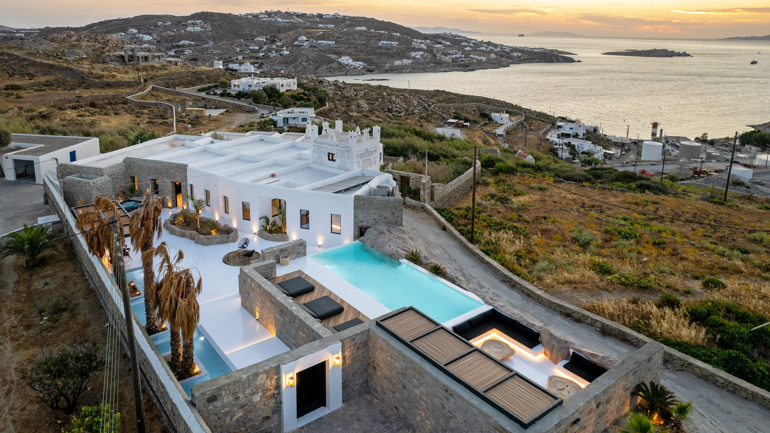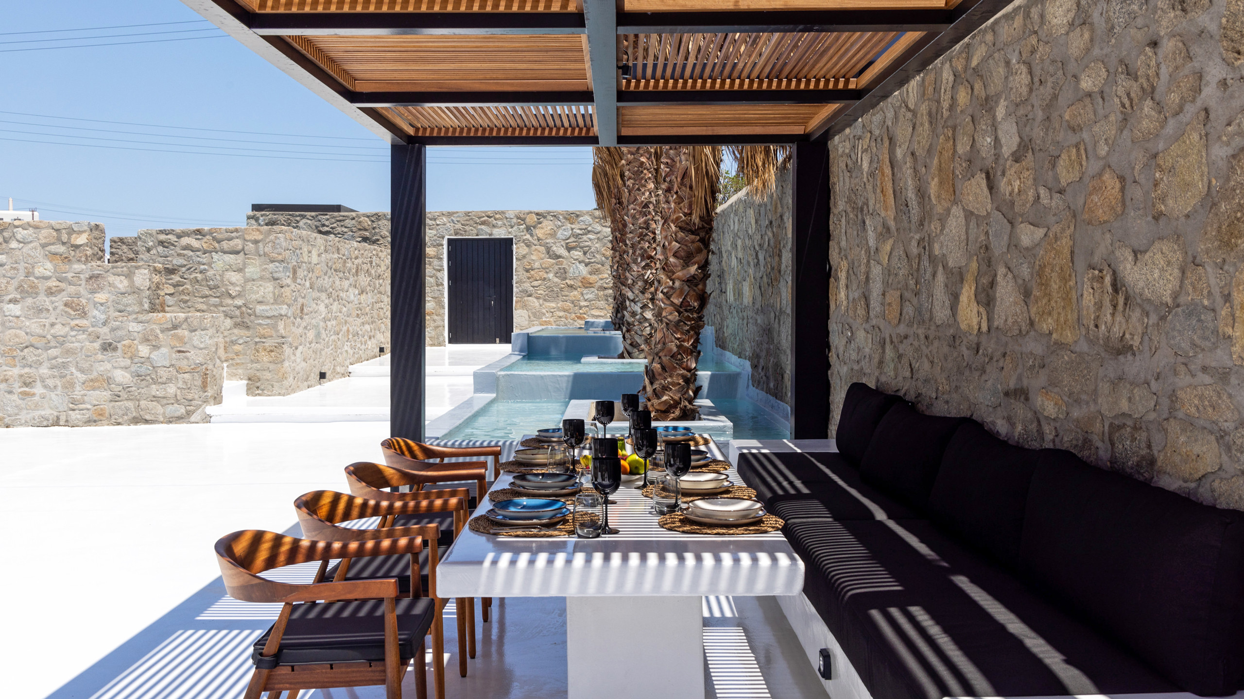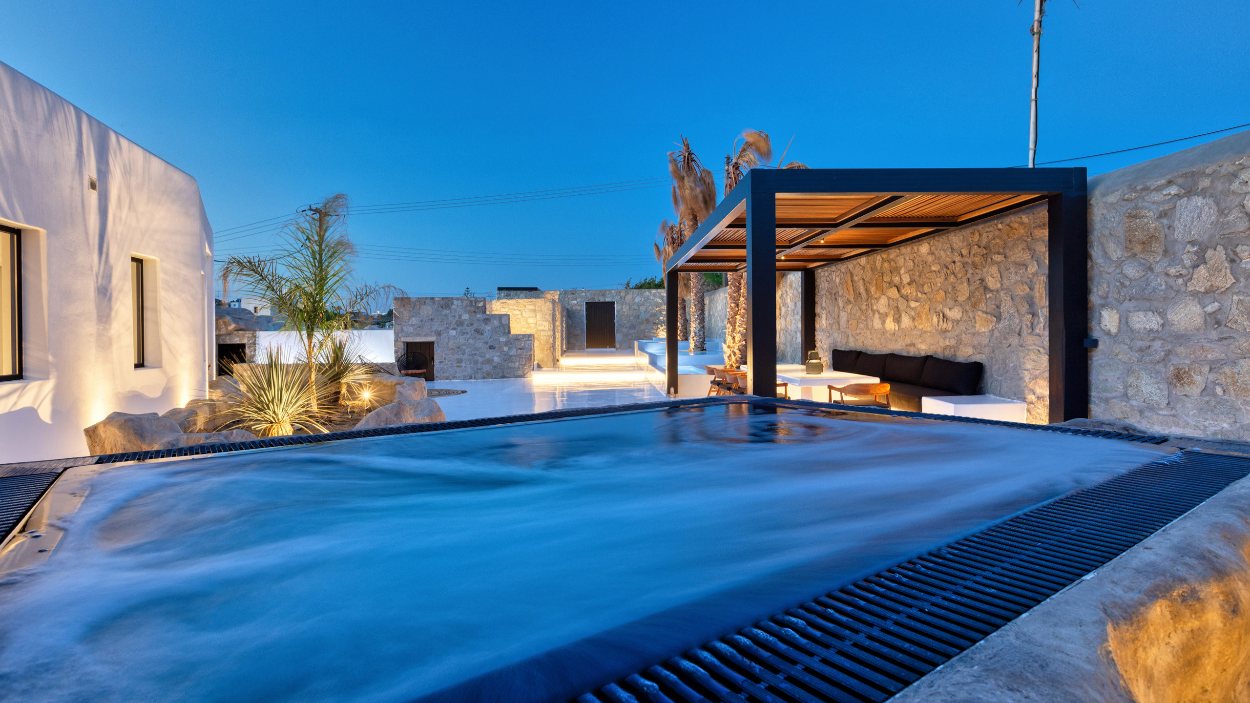 The outdoor spaces are used rationally, with various relaxation areas for guests, a dining area shaded by a pergola, and the inevitable private pool. The furnishings and evening lighting display a clear contemporary style with a well-defined aesthetic, particularly appreciated in this Cycladic region.
