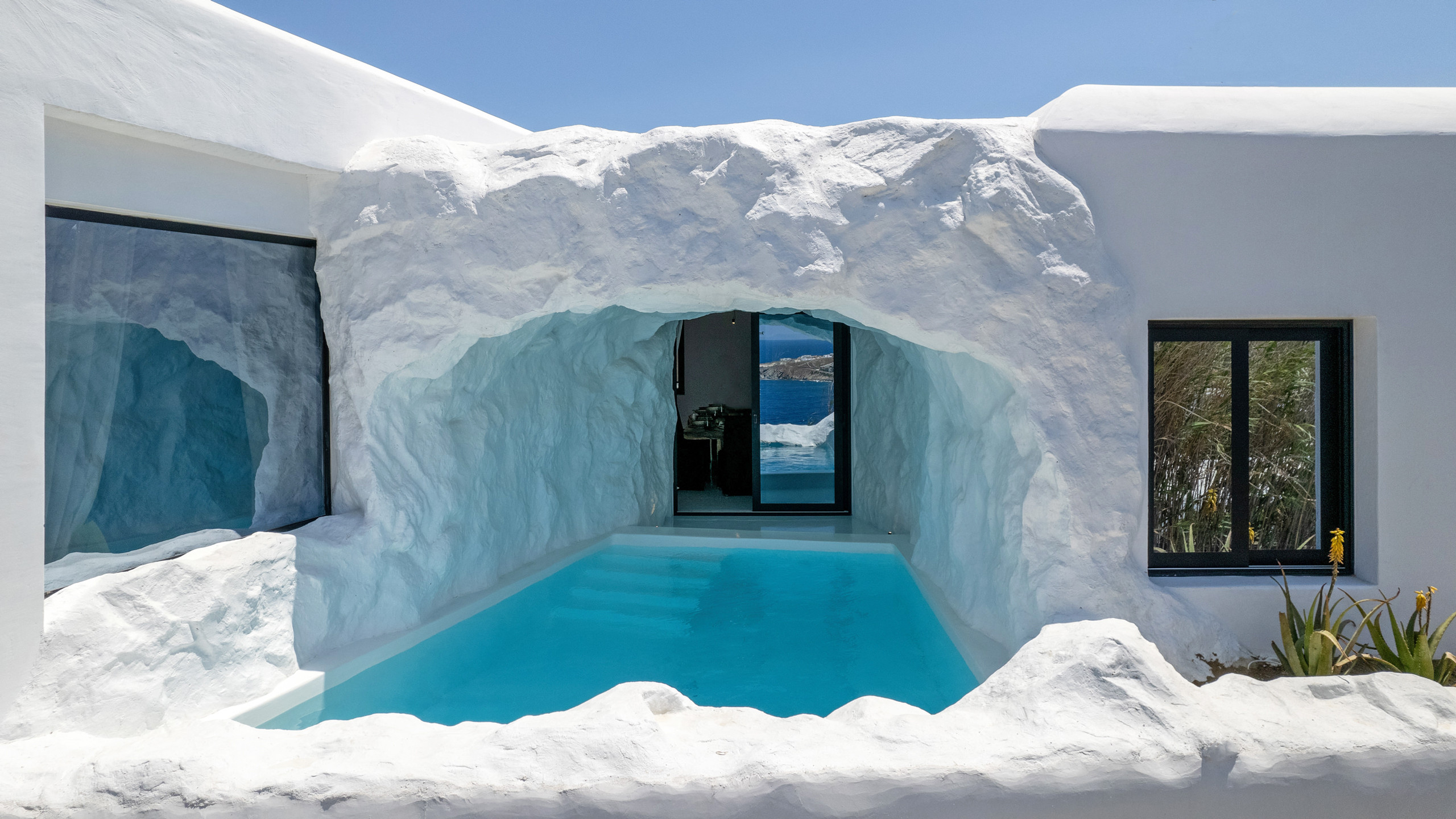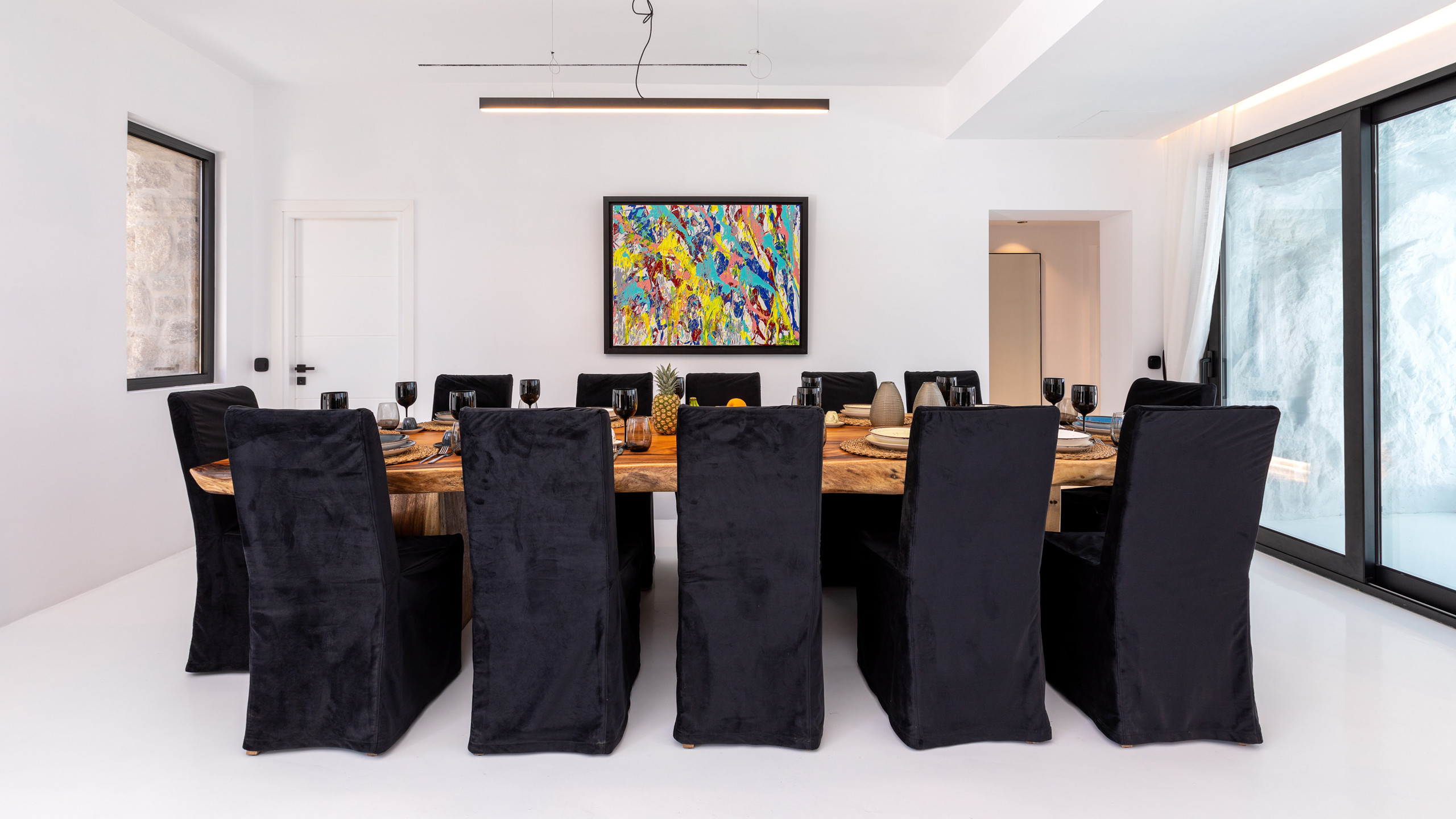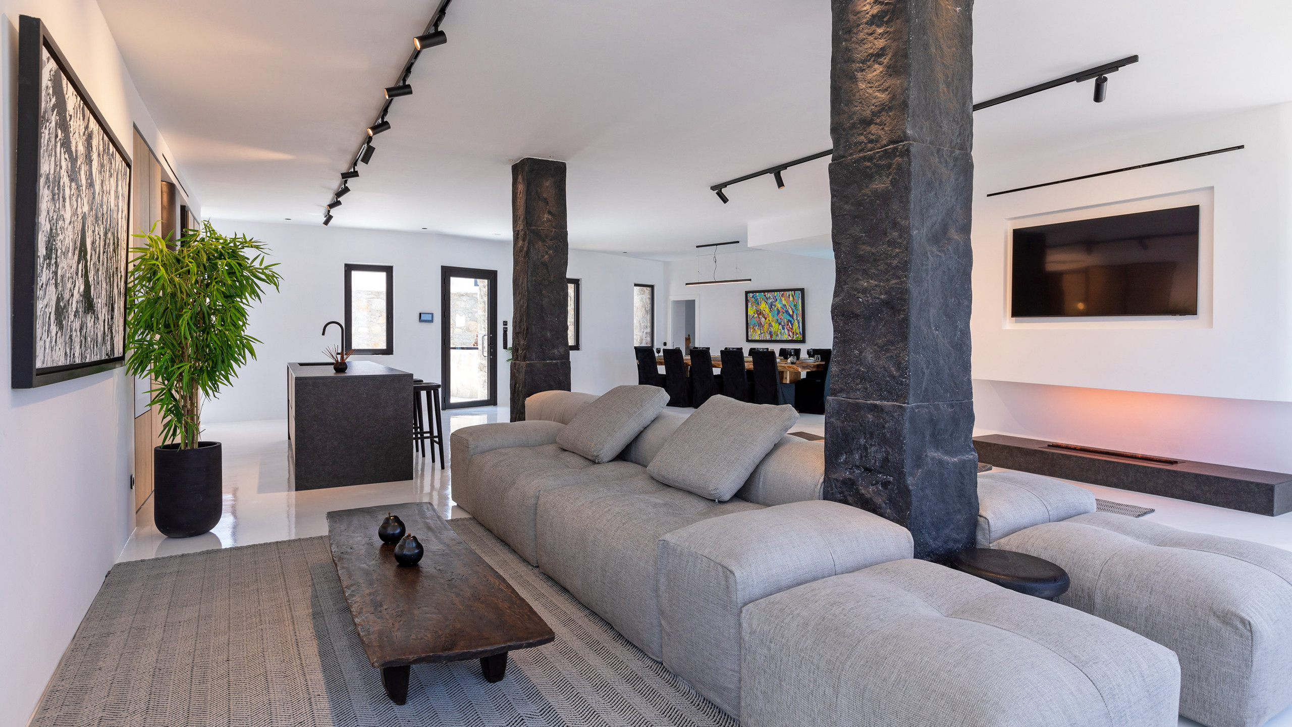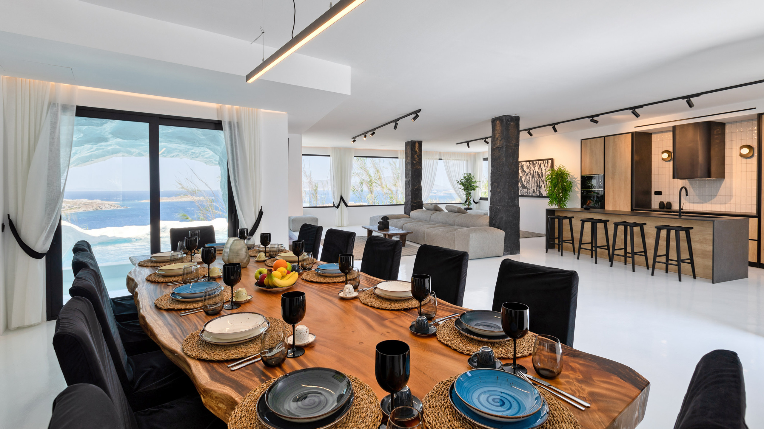 The outdoor spaces are used rationally, with various relaxation areas for guests, a dining area shaded by a pergola, and the inevitable private pool. The furnishings and evening lighting display a clear contemporary style with a well-defined aesthetic, particularly appreciated in this Cycladic region.