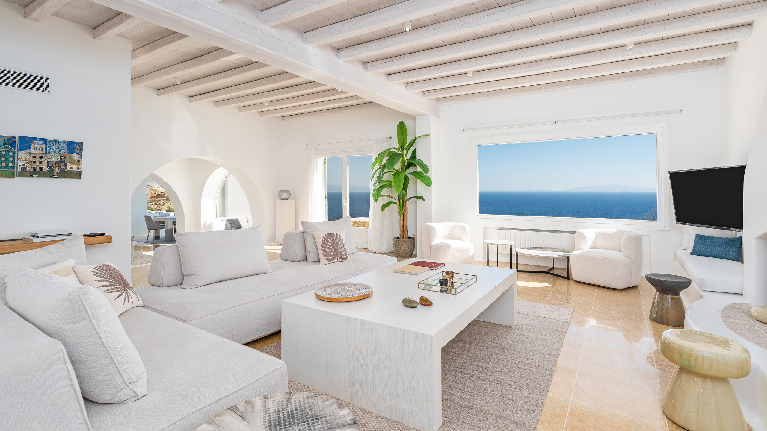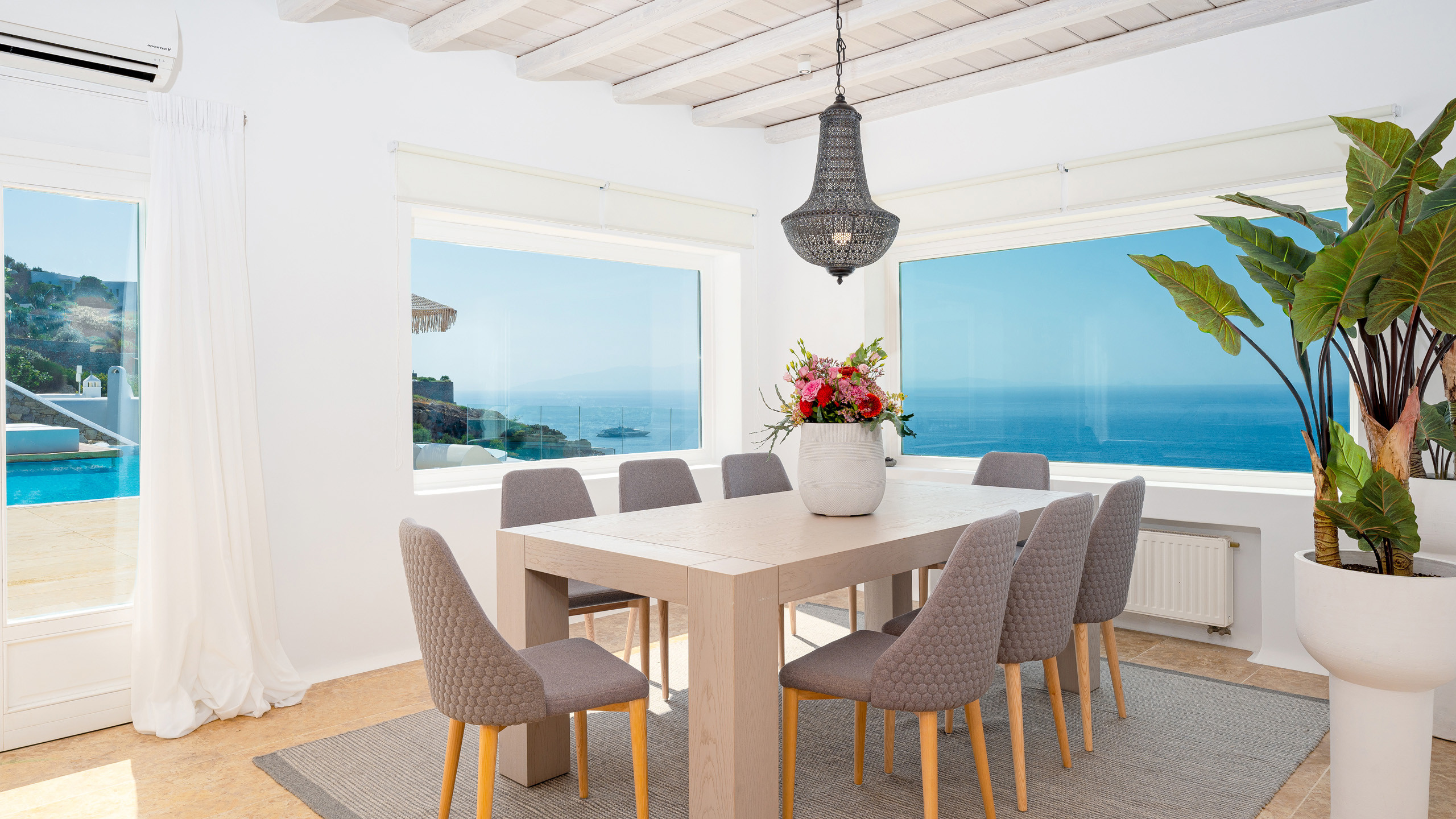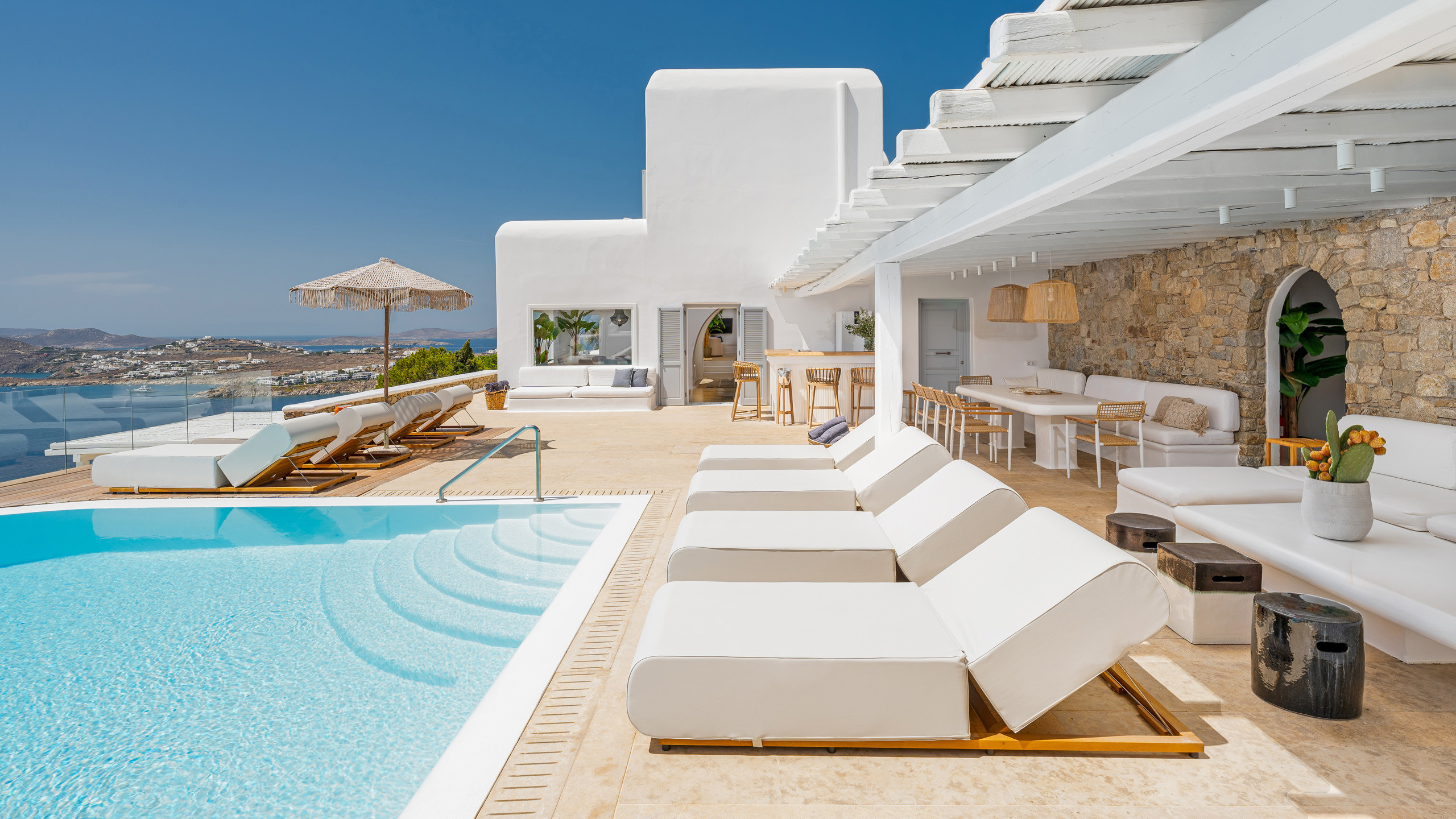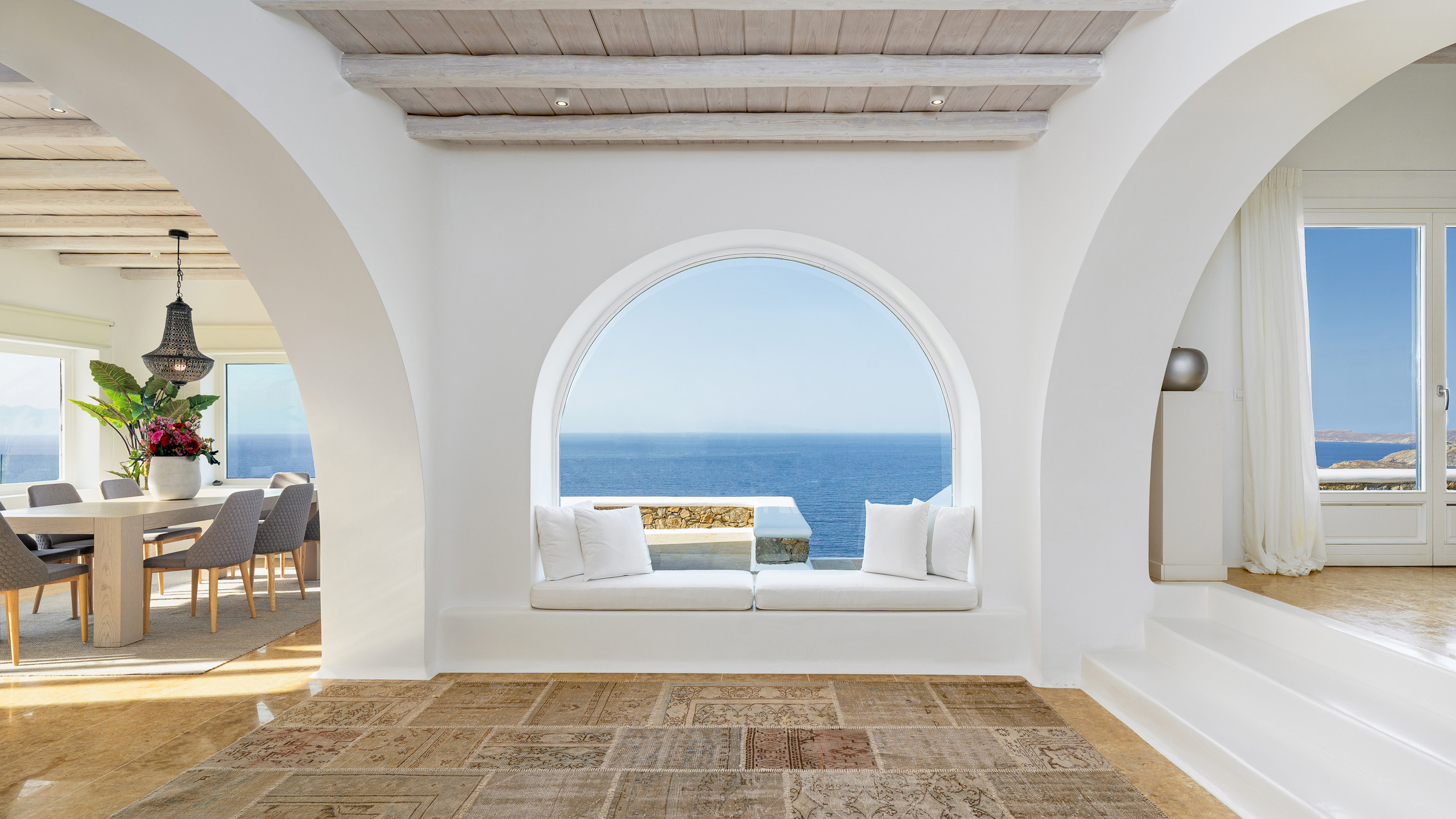 The interiors feature discreet luxury, with white-washed walls, lavish decorations, and contemporary design elements, while the eight bedrooms, all with en-suite bathrooms, offer magnificent sea views.
