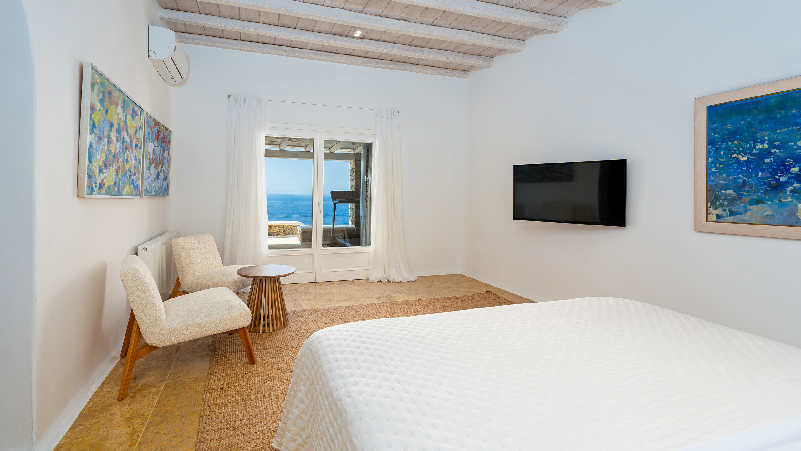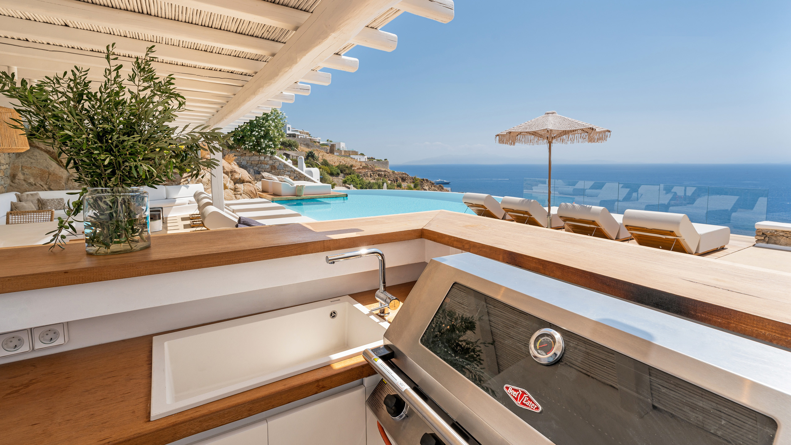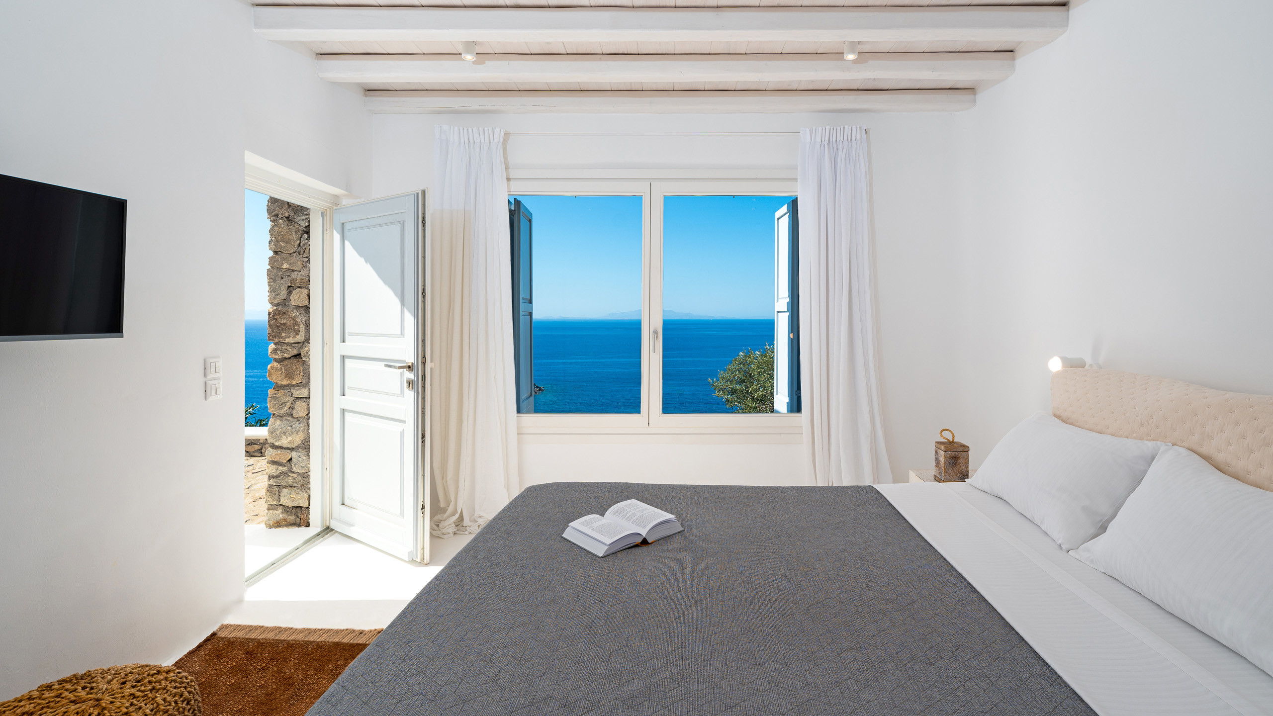 The interiors feature discreet luxury, with white-washed walls, lavish decorations, and contemporary design elements, while the eight bedrooms, all with en-suite bathrooms, offer magnificent sea views.