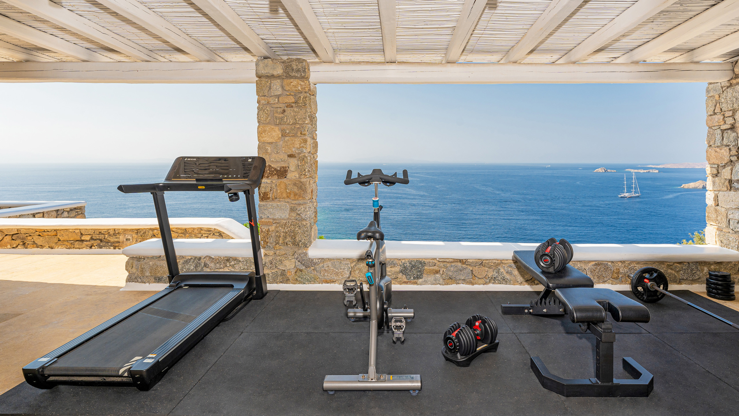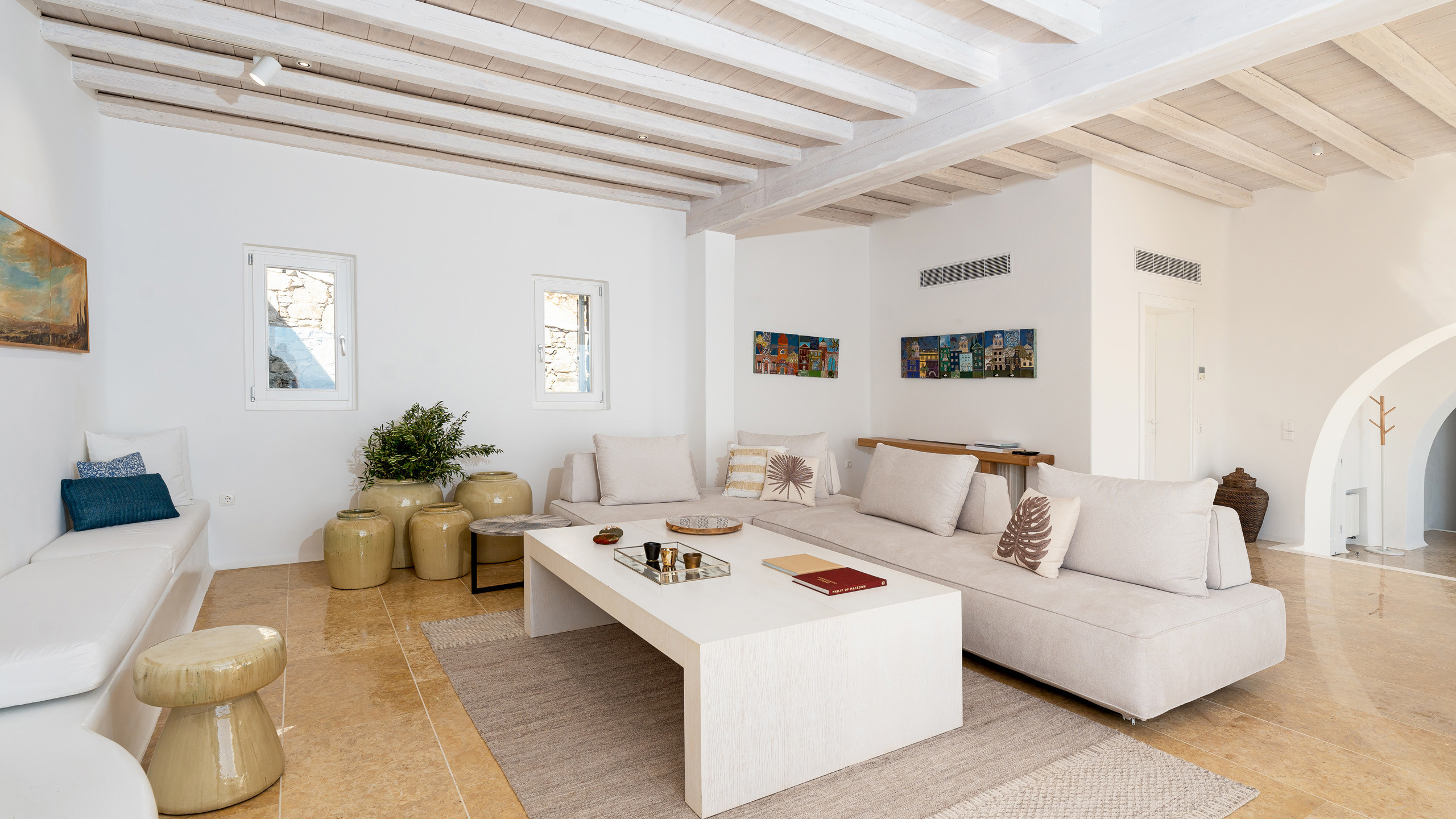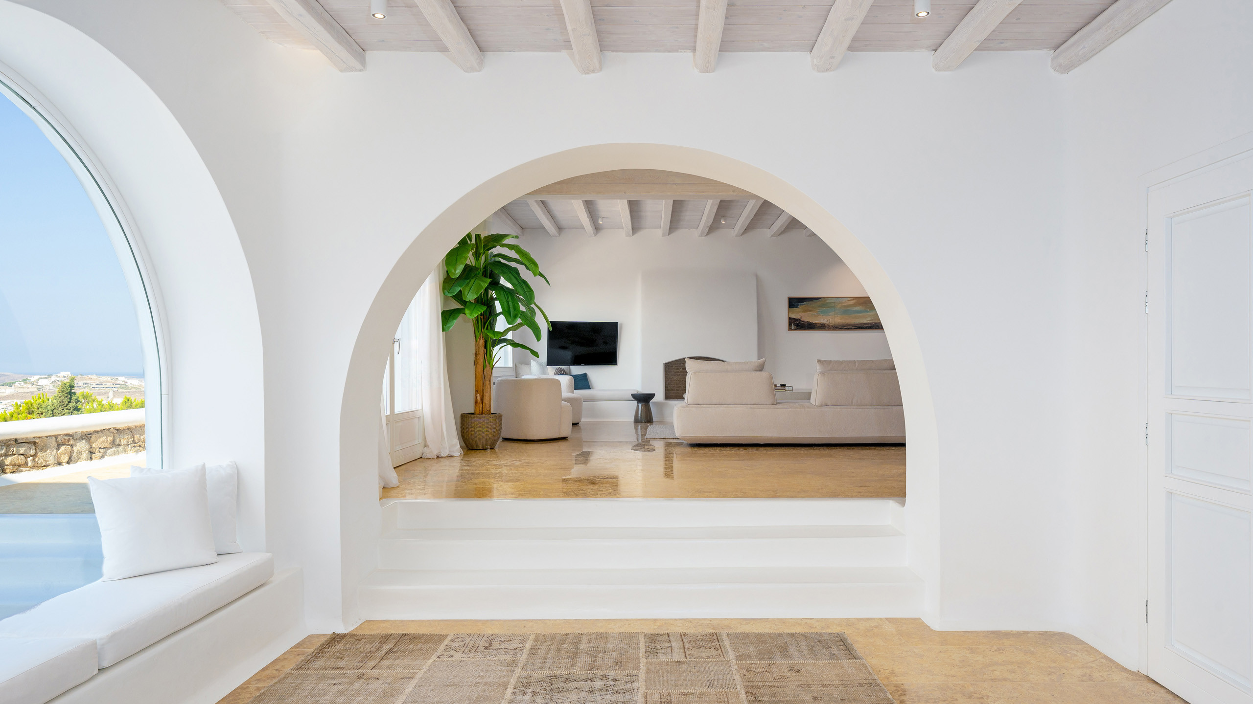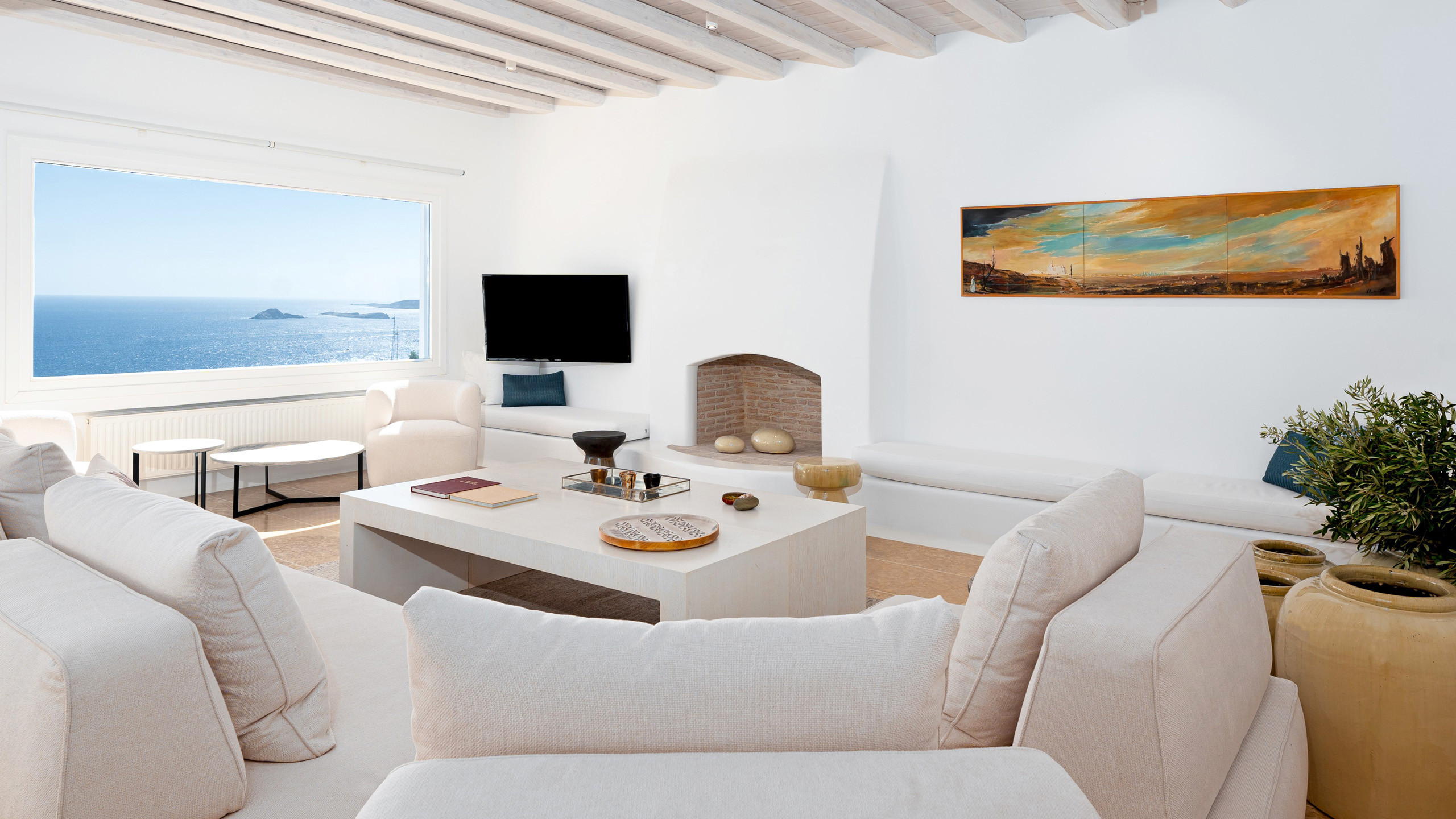 The interiors feature discreet luxury, with white-washed walls, lavish decorations, and contemporary design elements, while the eight bedrooms, all with en-suite bathrooms, offer magnificent sea views.