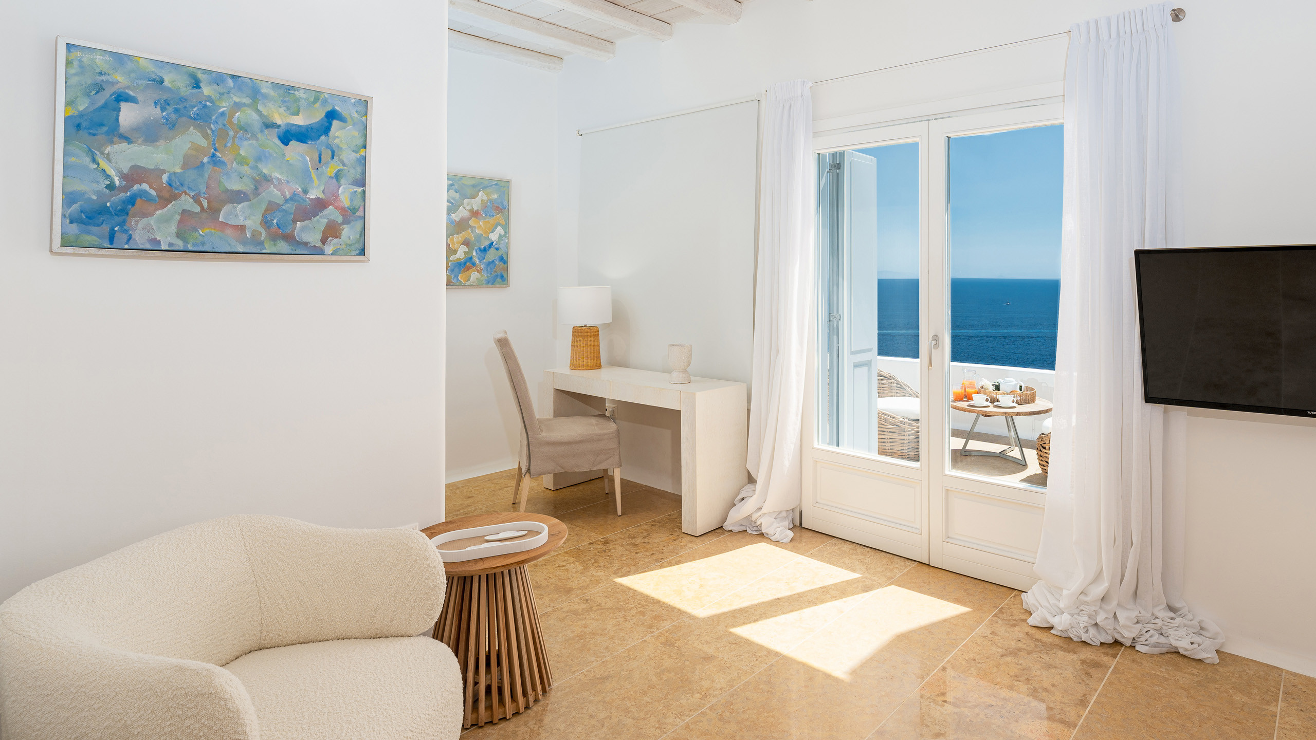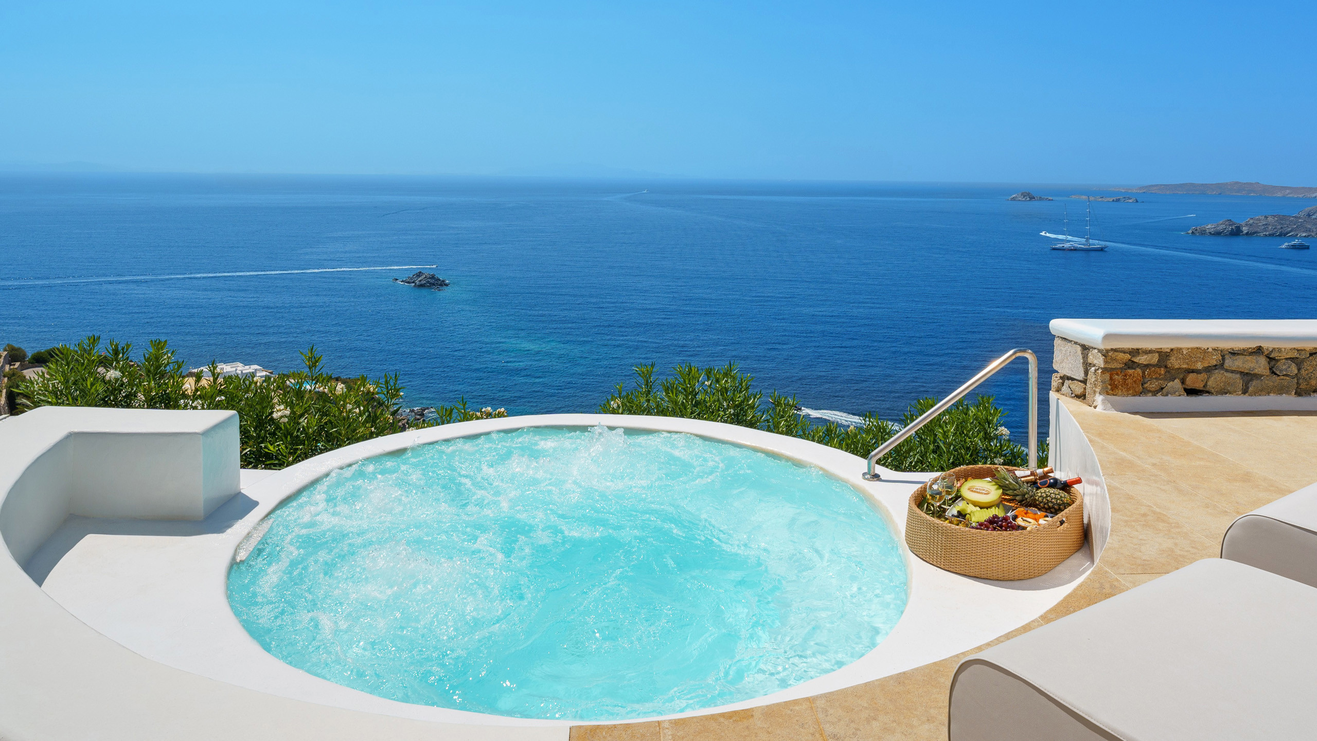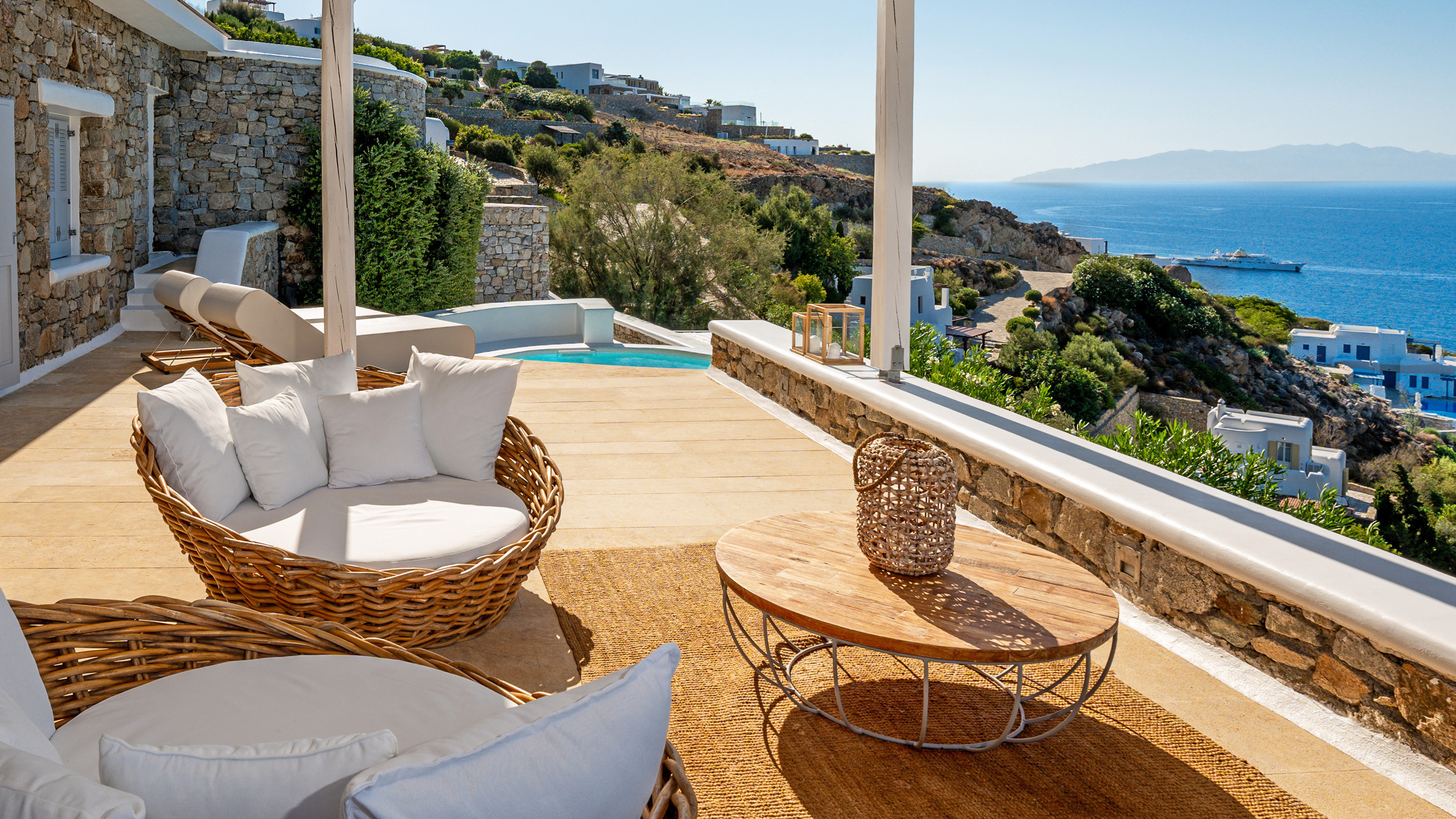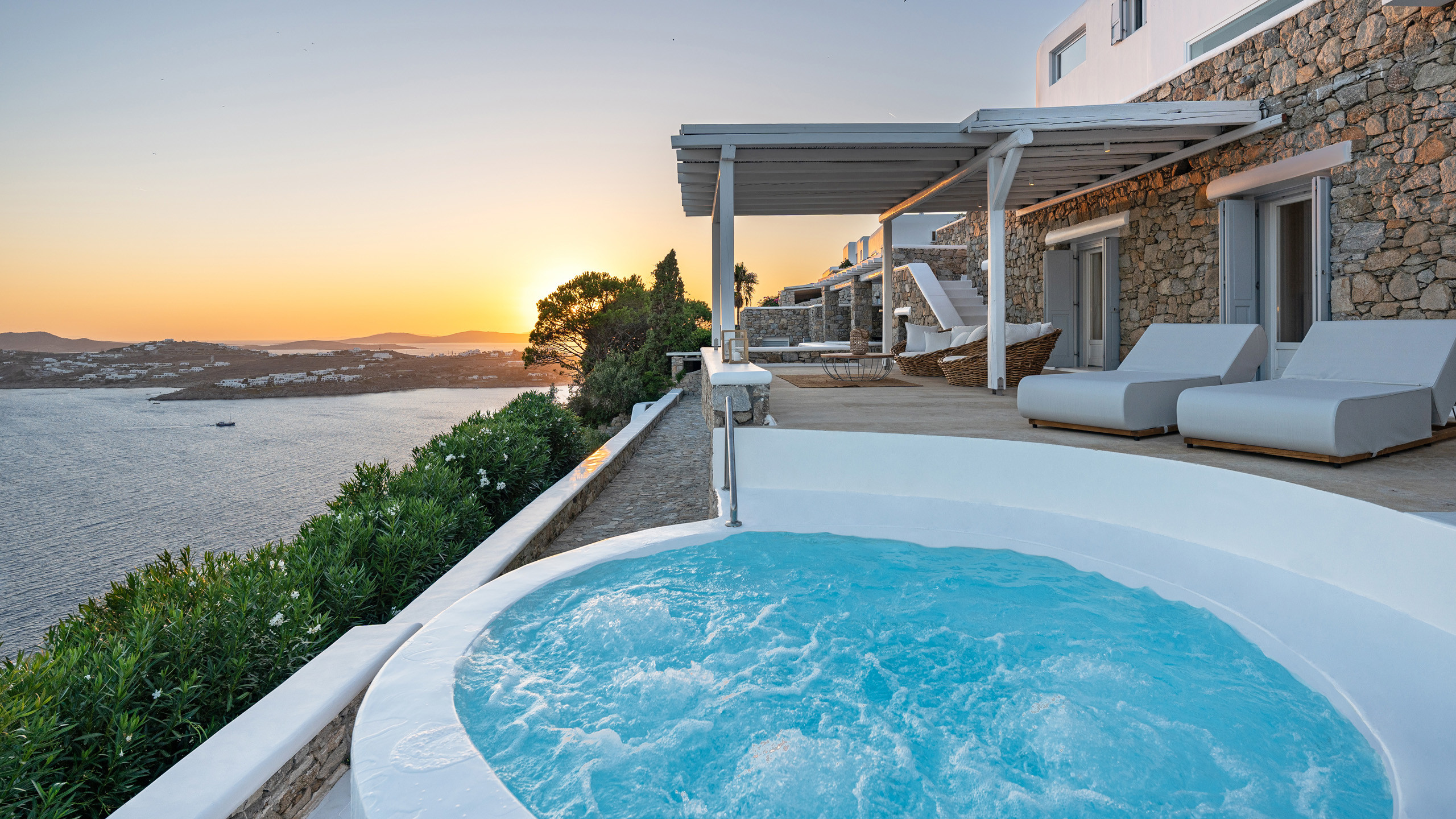 The building seamlessly blends local architecture with premium refinement, creating a classy and elegant atmosphere. The spacious living areas and terraces of Sage provide privacy and individuality for guests. Outdoor amenities include cozy corners with cushioned sofas and tables, as well as an infinity pool that blends into the horizon. A jacuzzi with room for eight offers a relaxing experience with a view of the island of Delos.