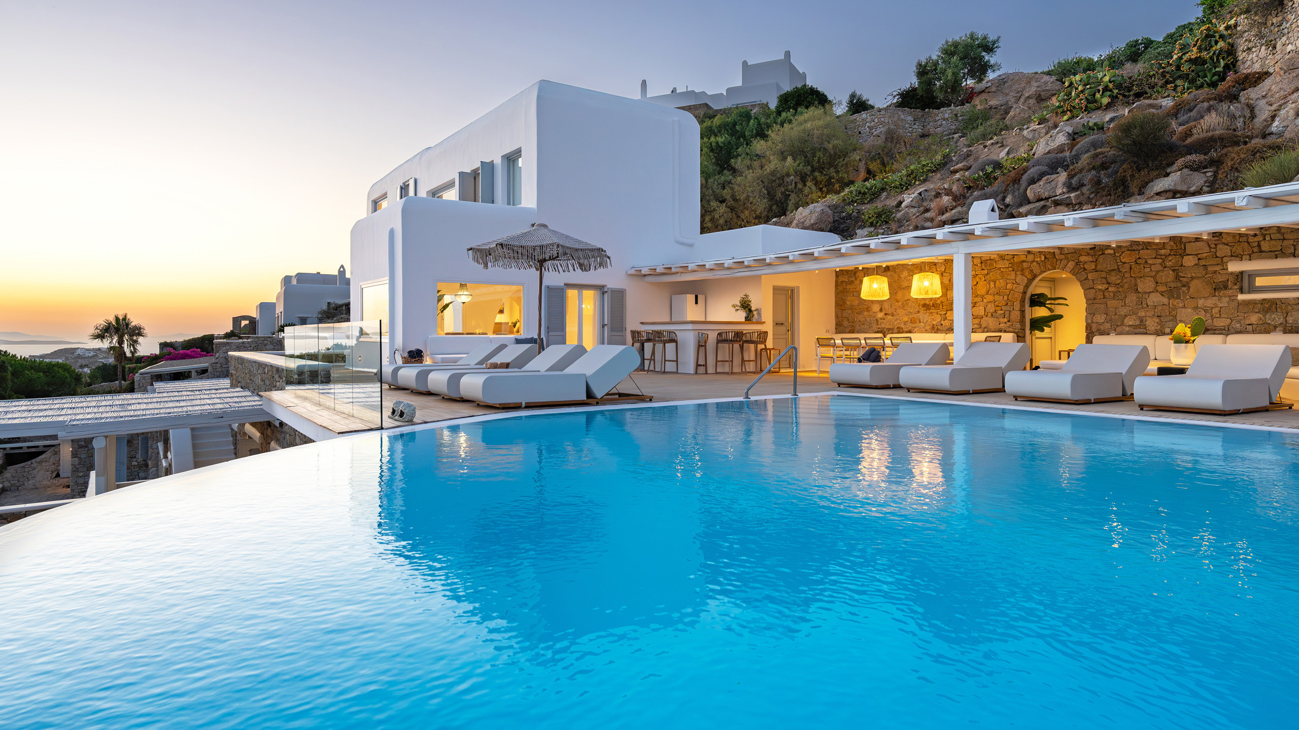Perched on a cliff in Agios Lazaros, one of the most prestigious areas in Mykonos, this exclusive property offers stunning views of the neighbouring islands and the Aegean Sea.