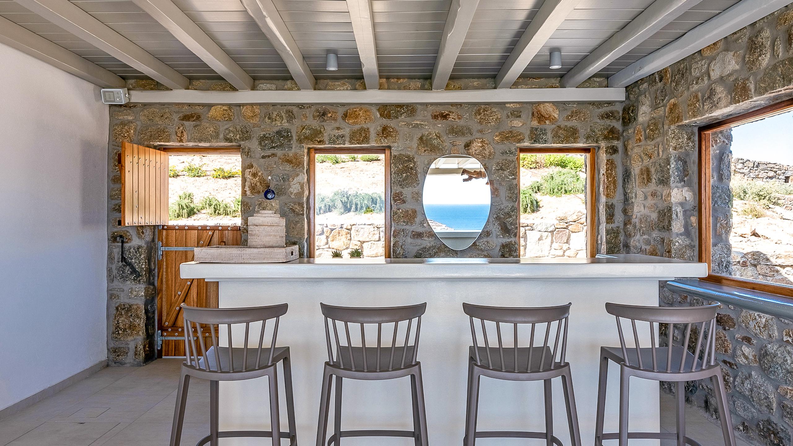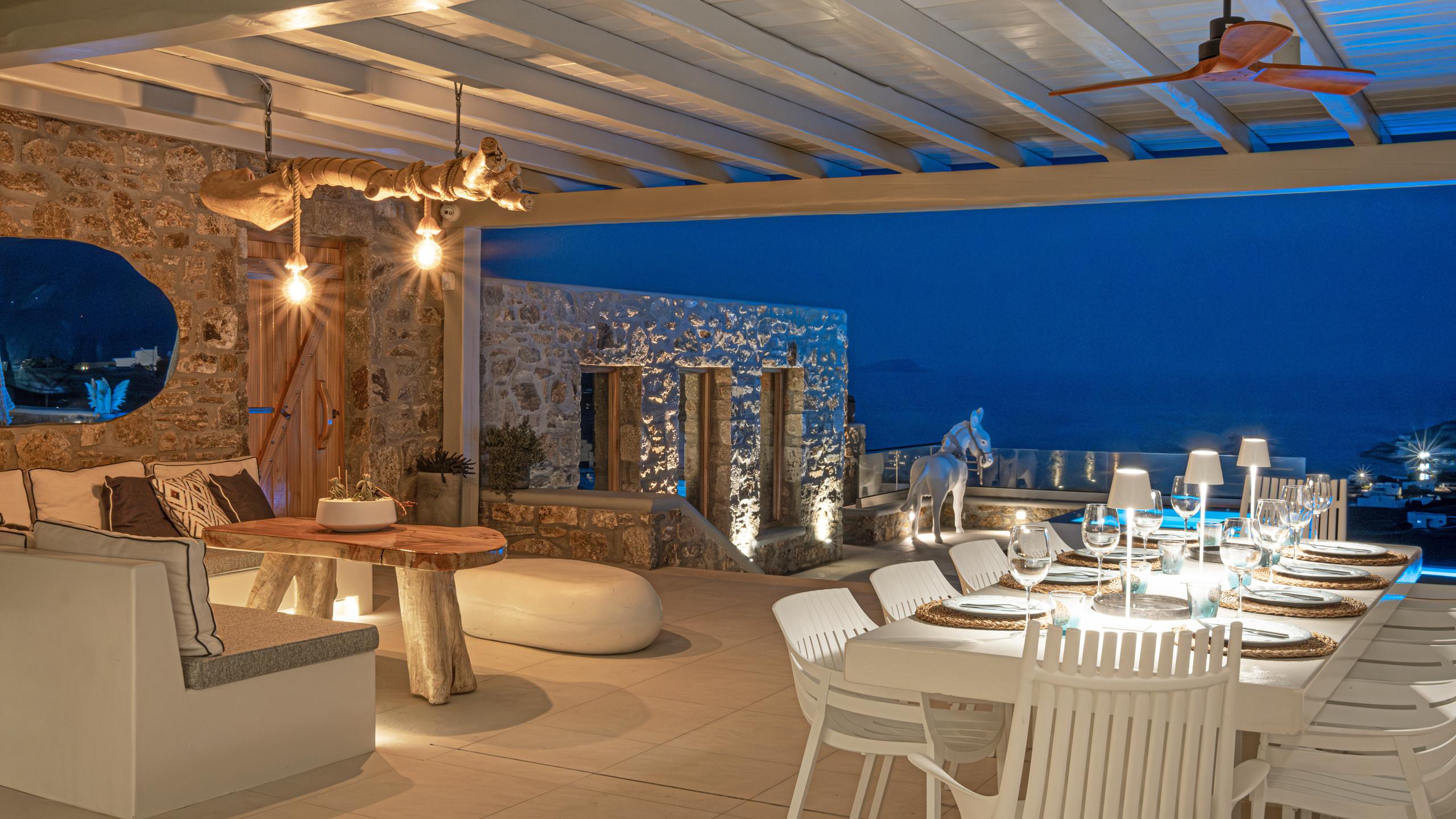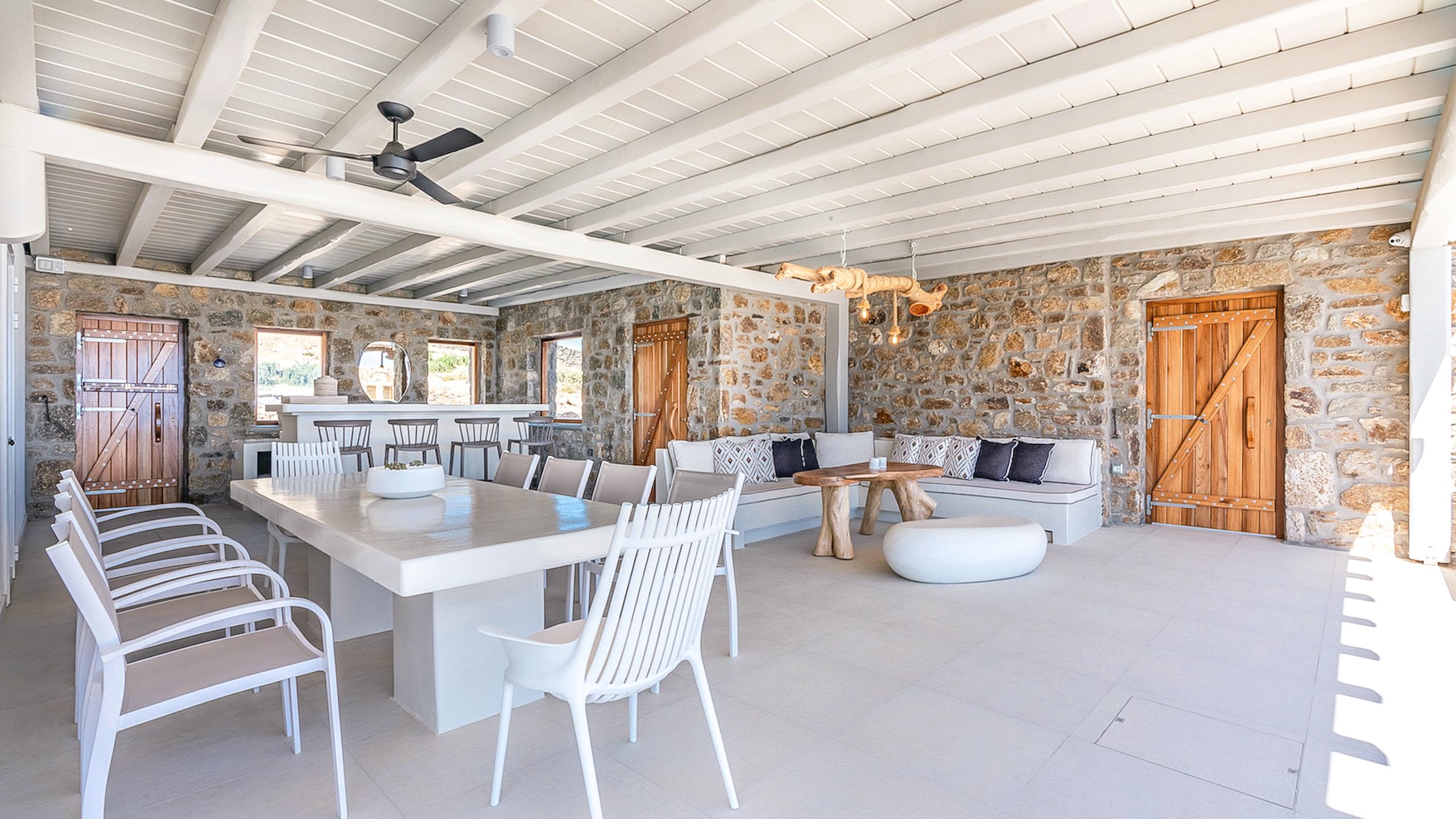 True to the island’s architectural essence, the main terrace centers around a stunning infinity pool lined with plush sunbeds, perfect for long, sun-soaked afternoons. Just behind it, a shaded pergola shelters the outdoor dining area, thoughtfully designed for relaxed gatherings at any time of day — from leisurely breakfasts to evening dinners under the stars.