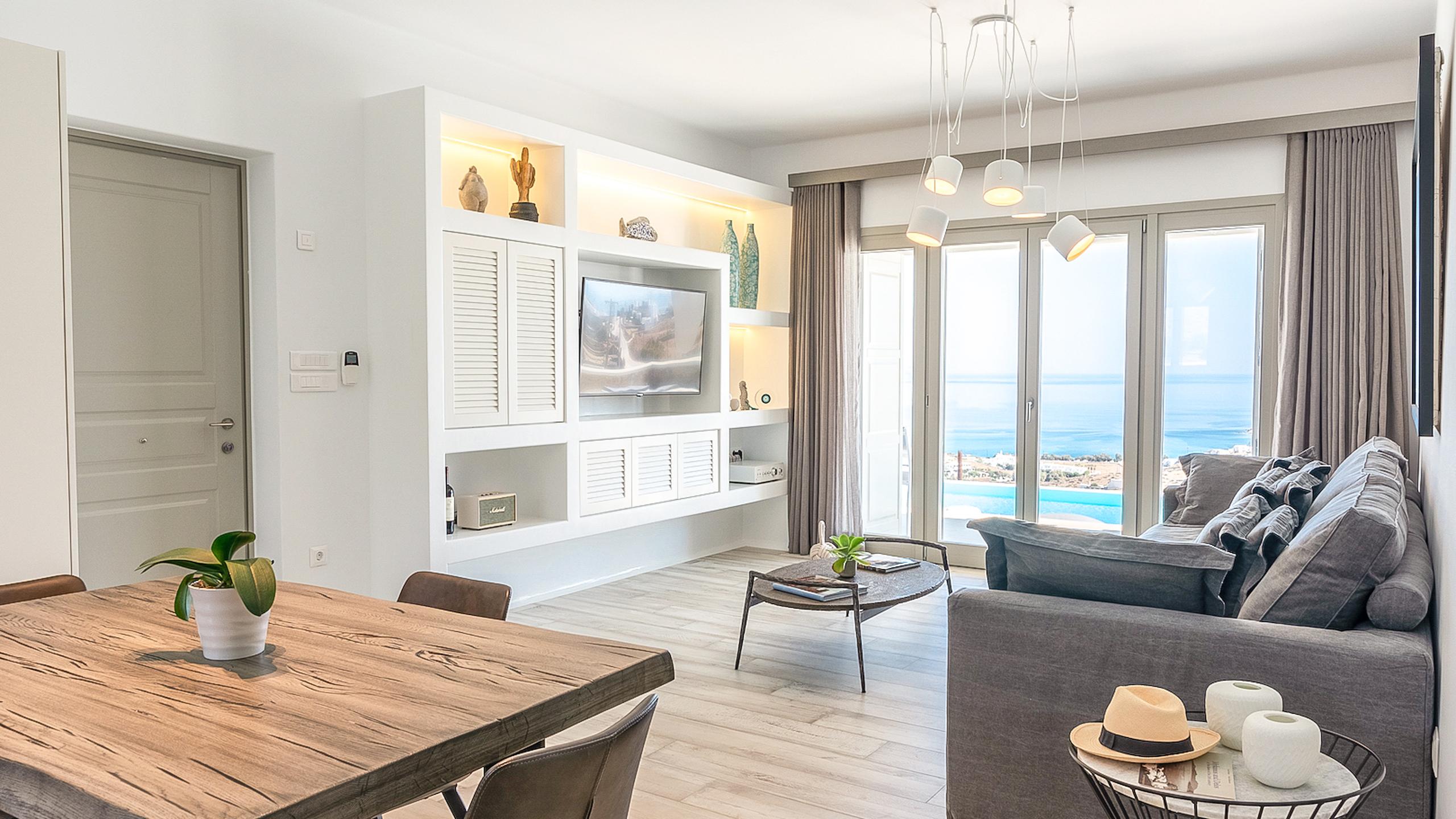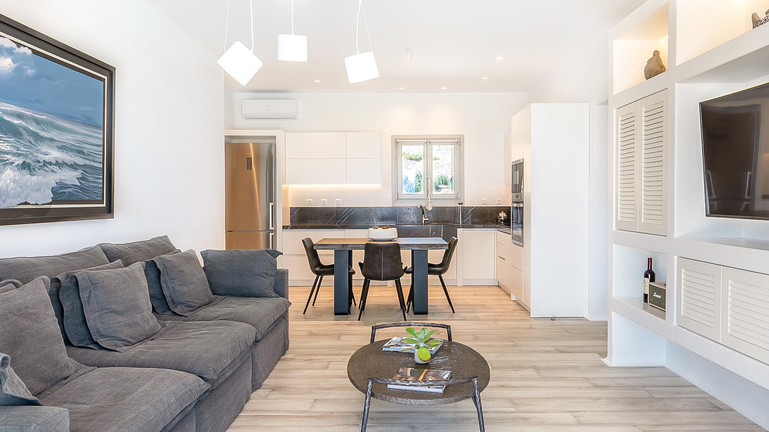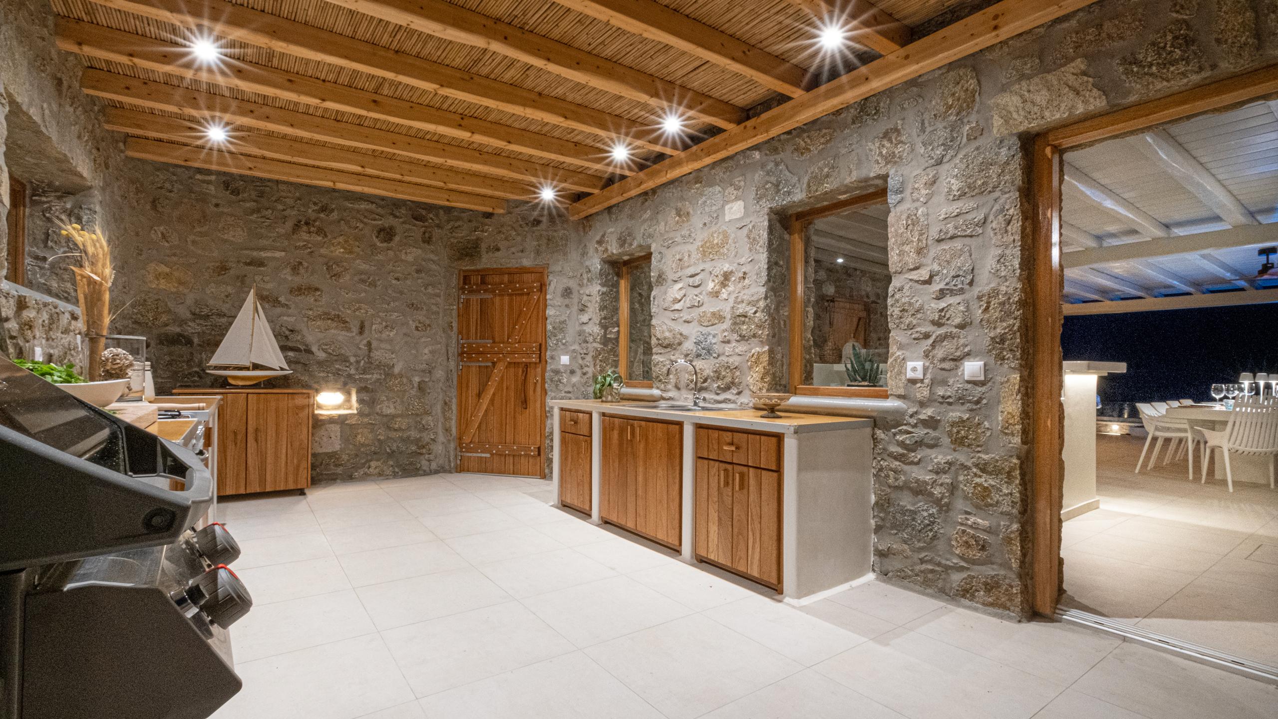 True to the island’s architectural essence, the main terrace centers around a stunning infinity pool lined with plush sunbeds, perfect for long, sun-soaked afternoons. Just behind it, a shaded pergola shelters the outdoor dining area, thoughtfully designed for relaxed gatherings at any time of day — from leisurely breakfasts to evening dinners under the stars.