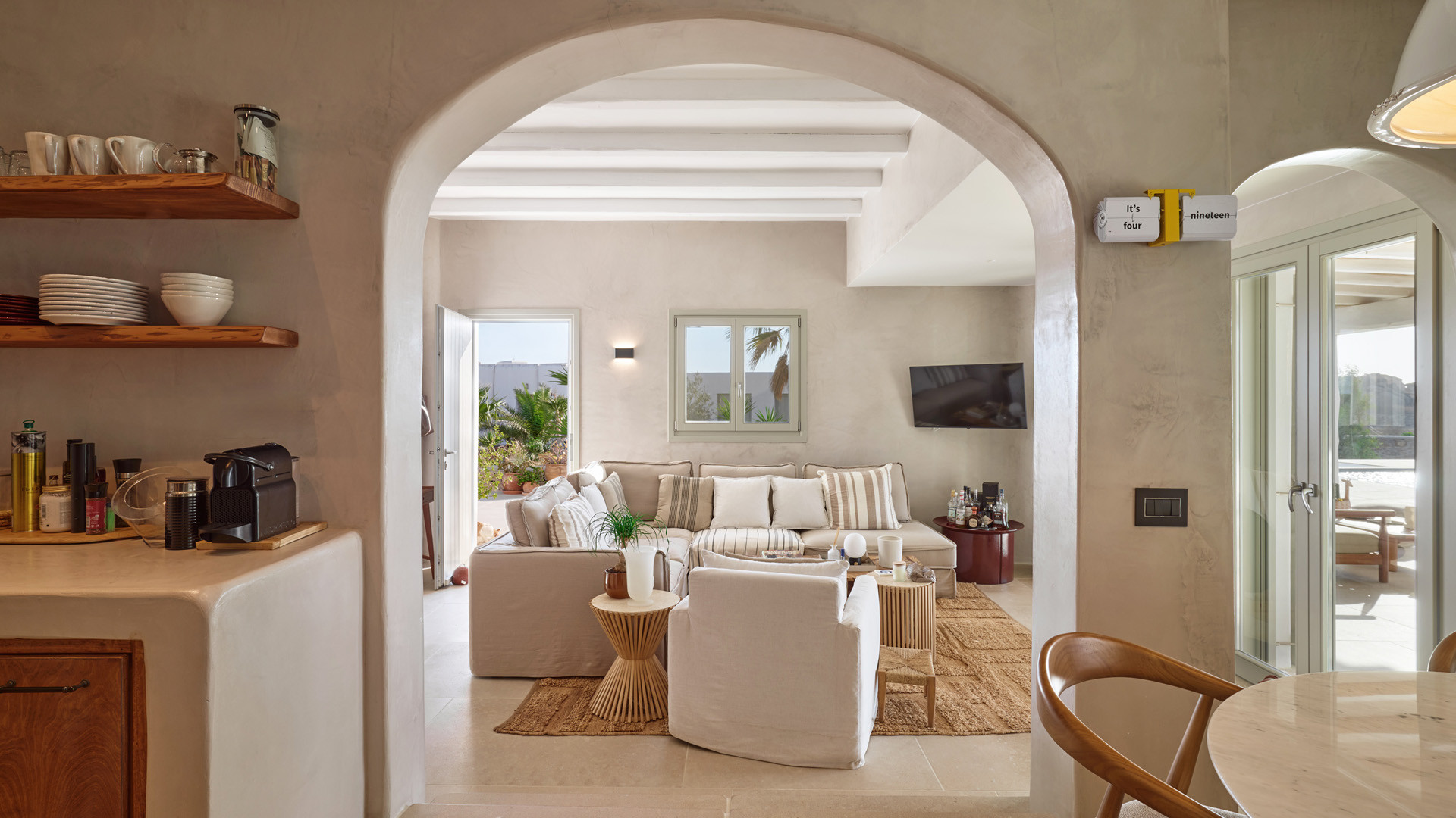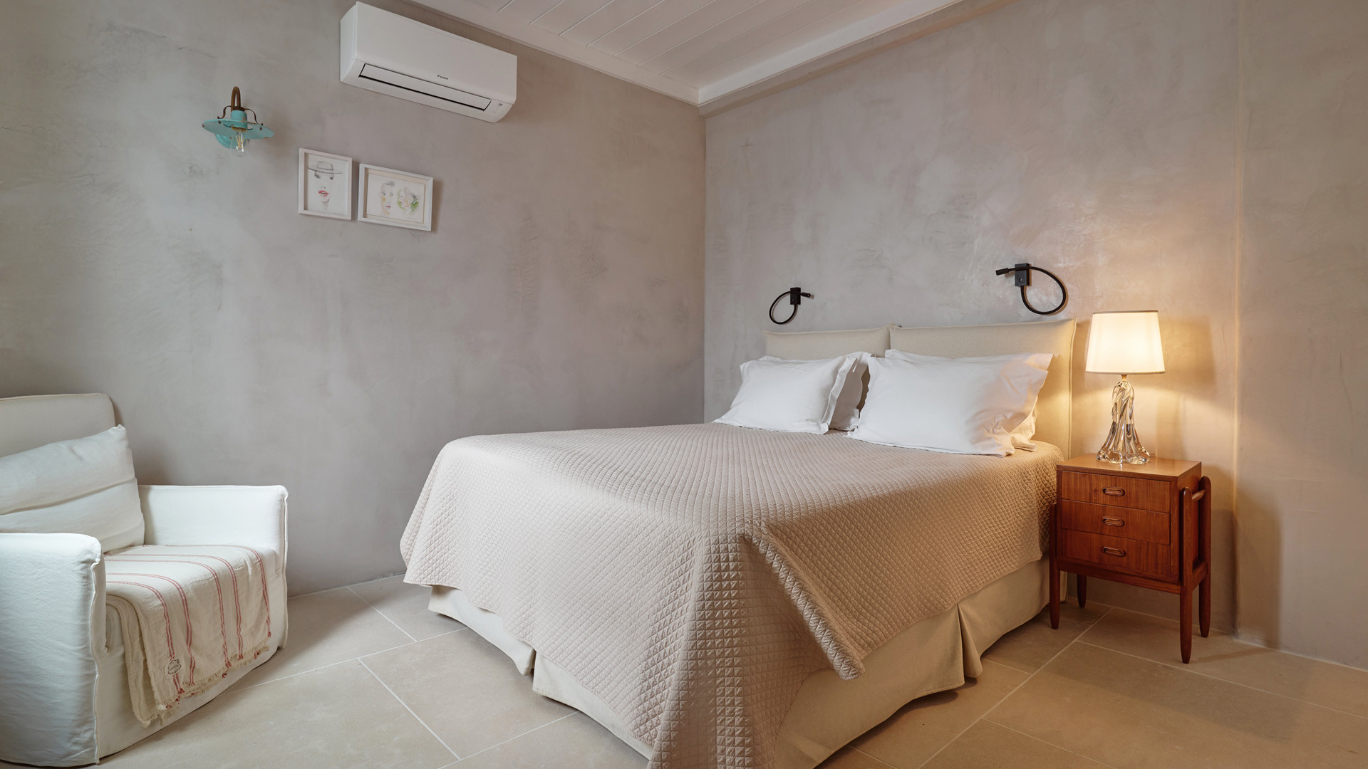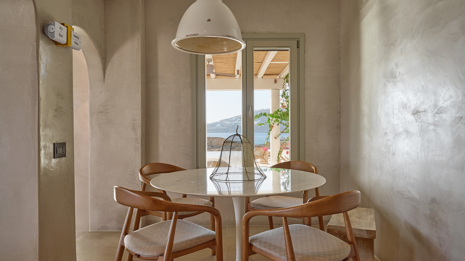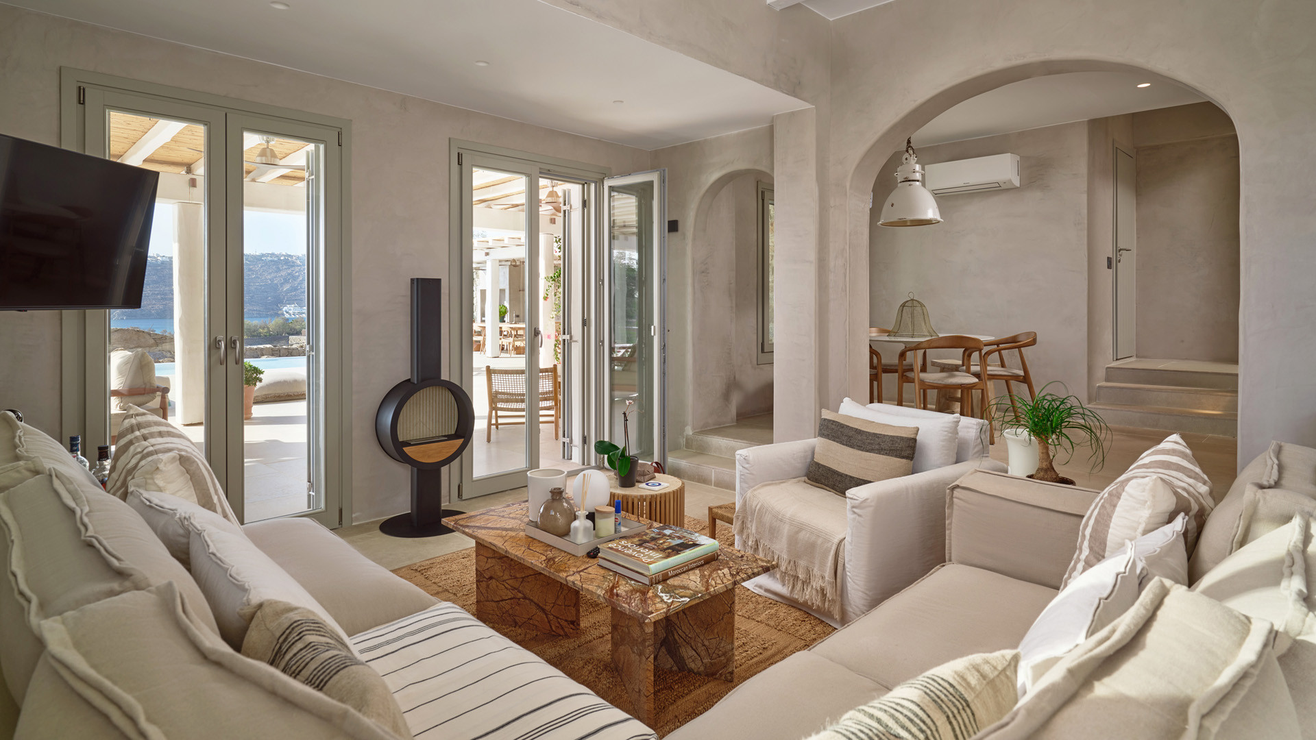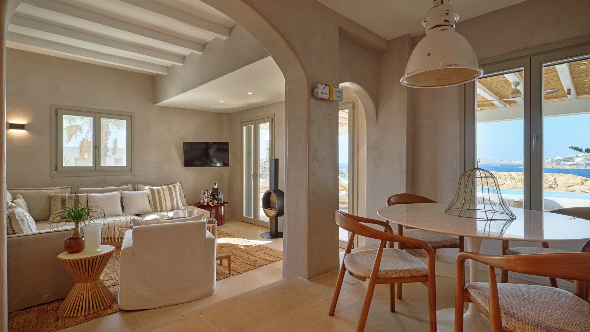 Inside Junonia, the same refined aesthetic continues, with well-appointed common areas that exude a warm and welcoming atmosphere despite the contemporary design and abundance of modern amenities. The bedrooms are evenly distributed across the two levels of the house, with a fifth independent room available for those seeking extra privacy. All rooms maintain the same high-quality standards, while those on the upper floor enjoy lovely sea views from their private balconies.